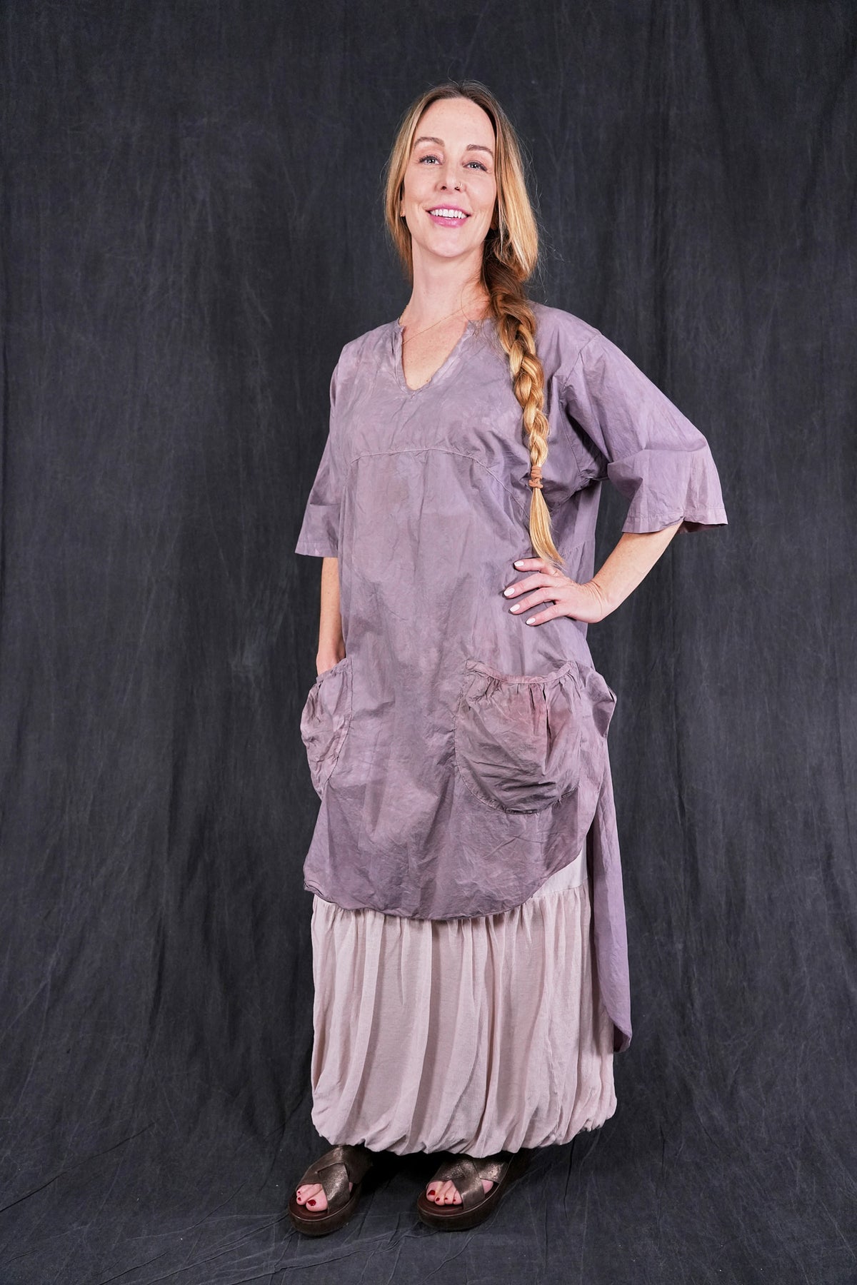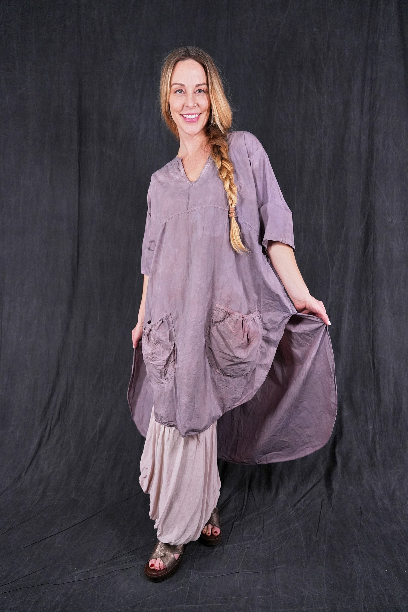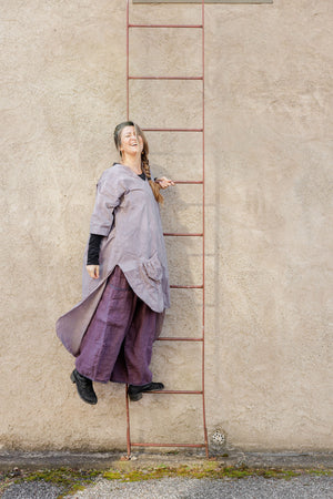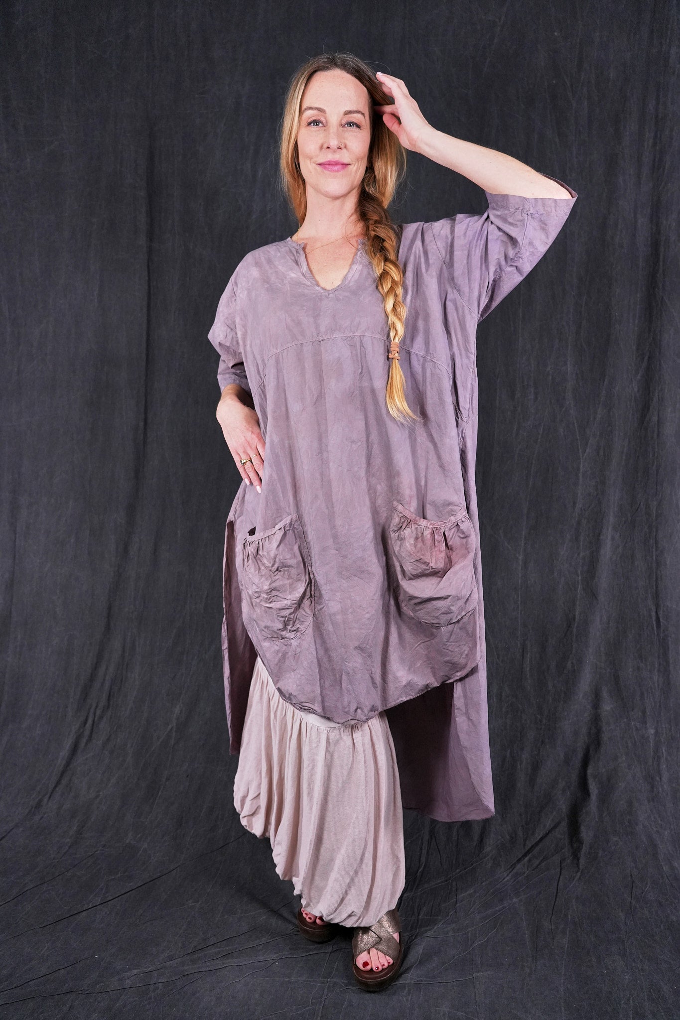A hand dyed & beautiful style for those who like a little drama. Complex, interesting color and-dyed smoothly woven cotton sets the stage. The back of this tunic drops low in the back and so, this top layers well over wide pants or a skirt in a floaty cotton lawn quite nicely. Perfect for a warm weather event.