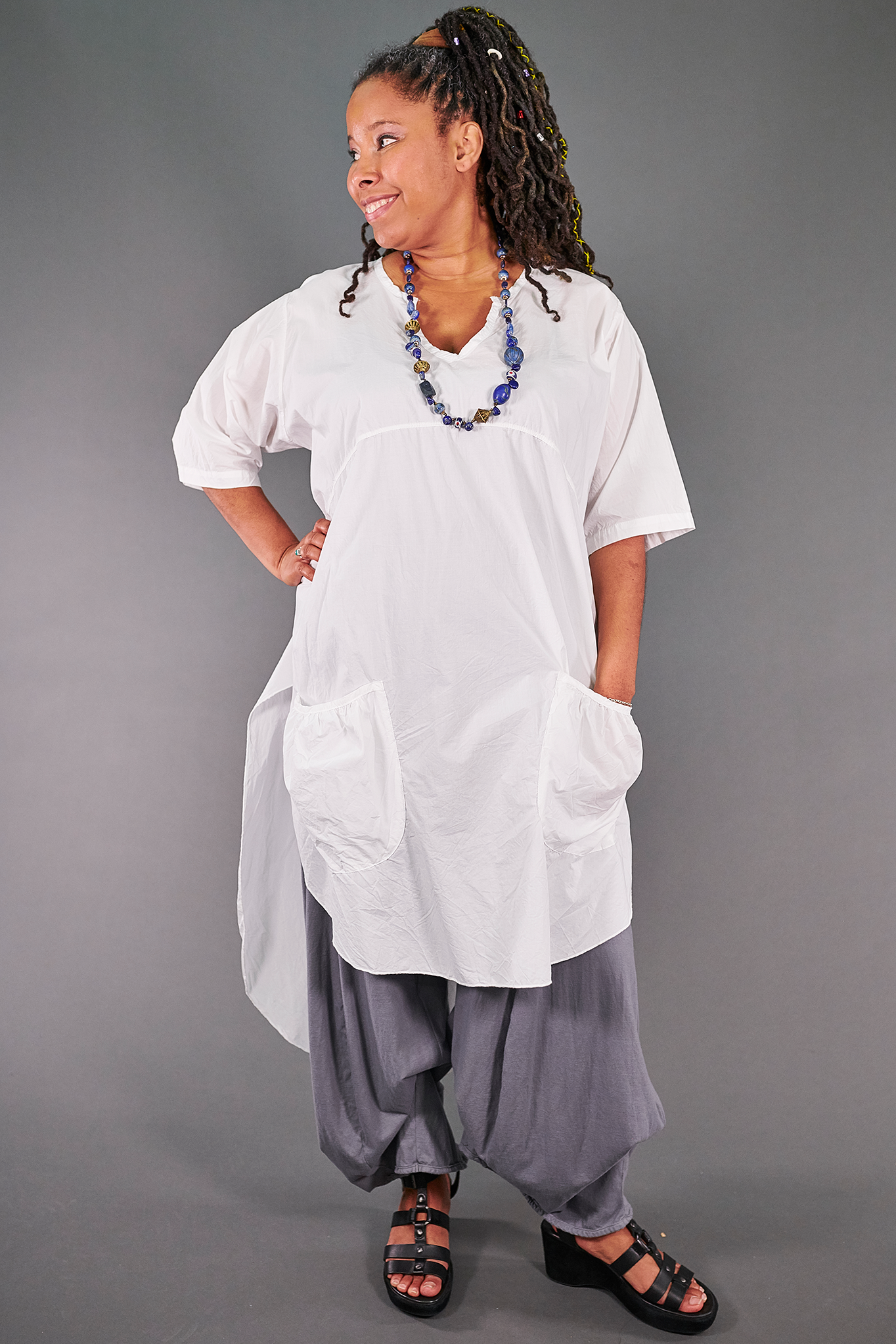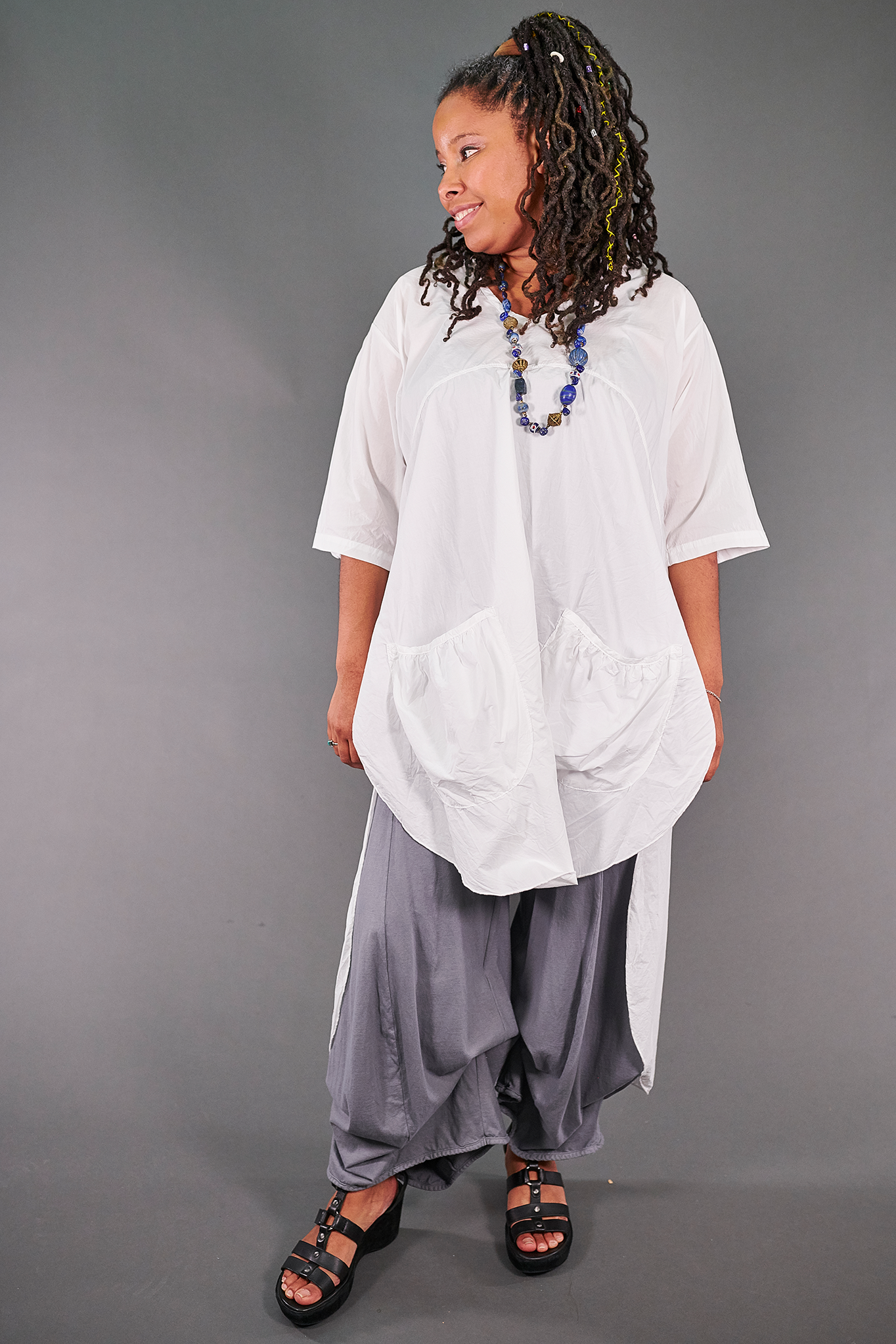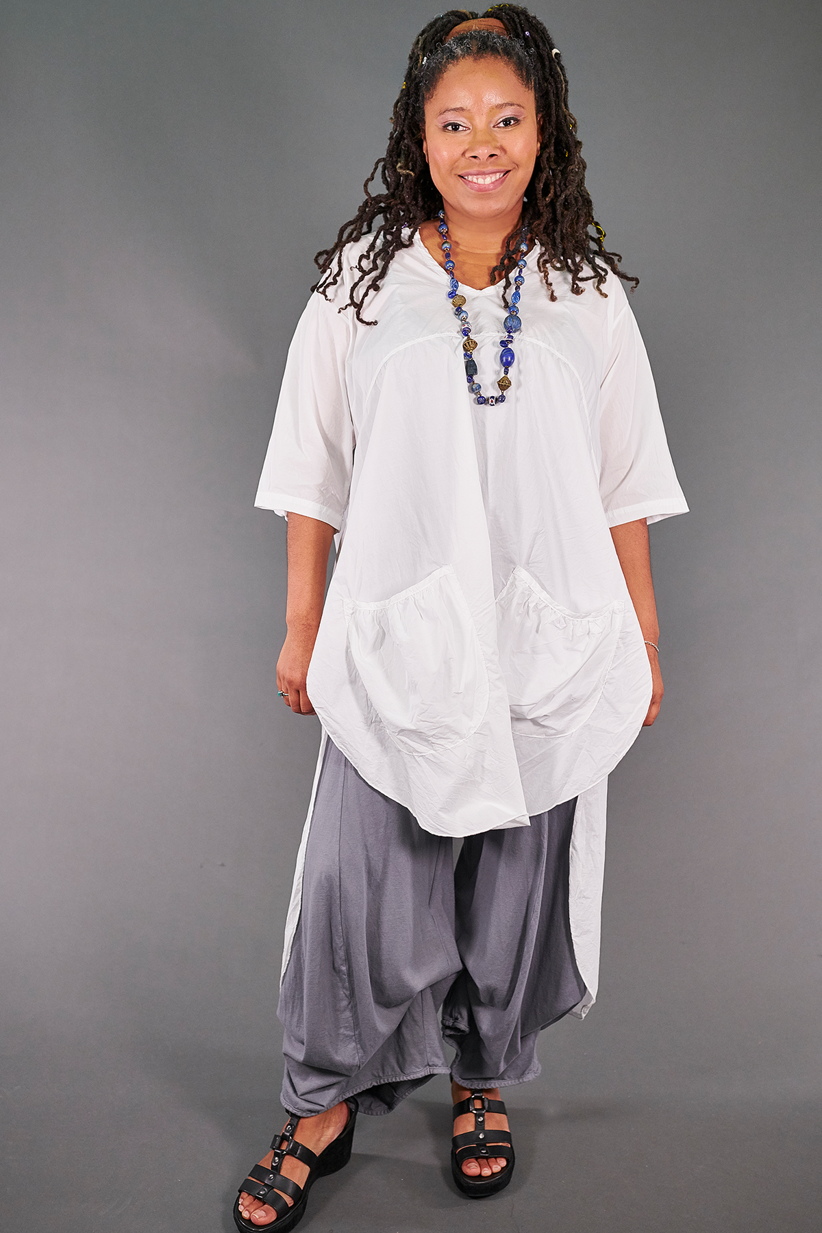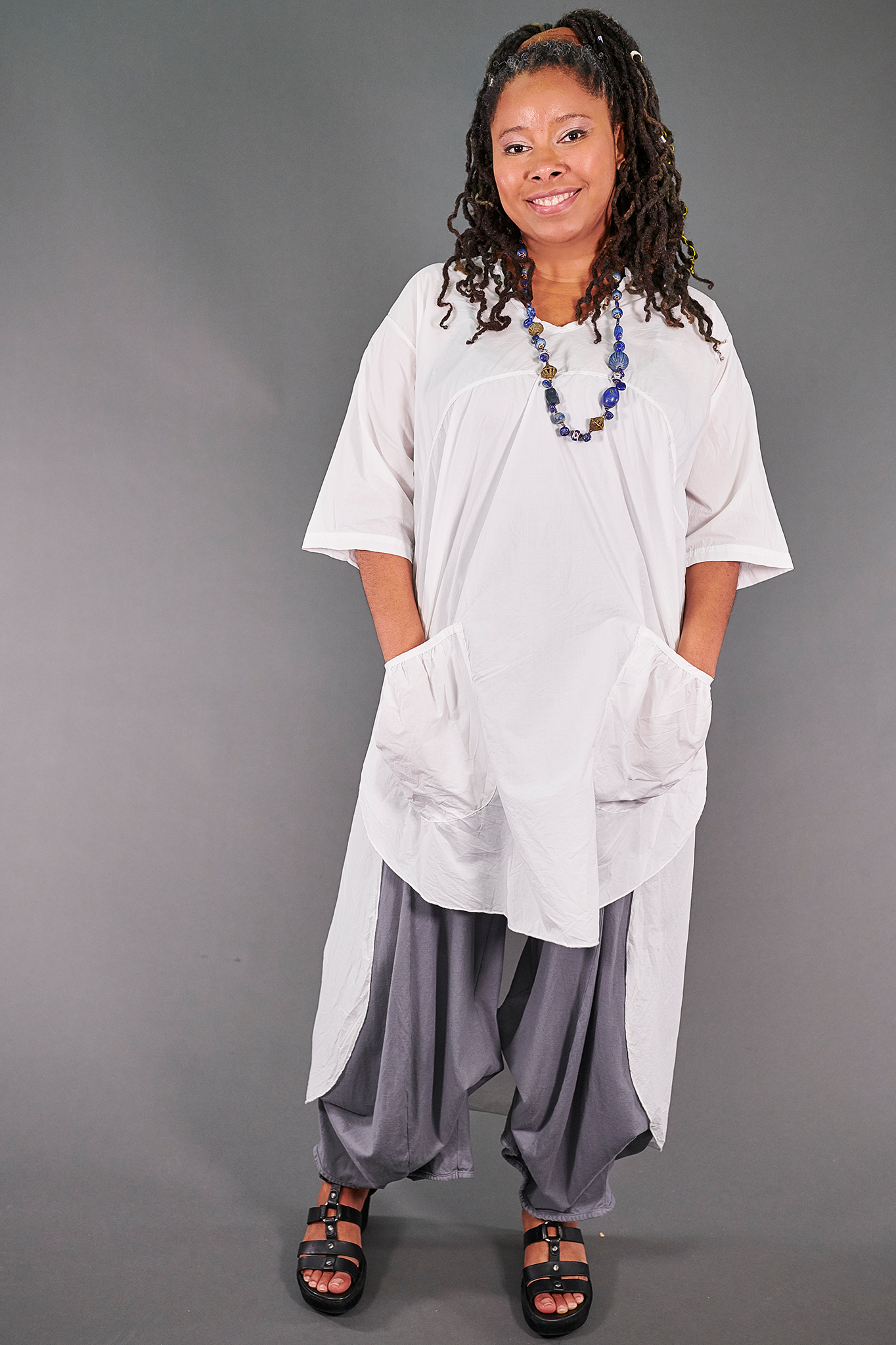 This one has pockets and curved seams. High-low hem is perfect with leggings or pants. Guaranteed to garner many compliments!
