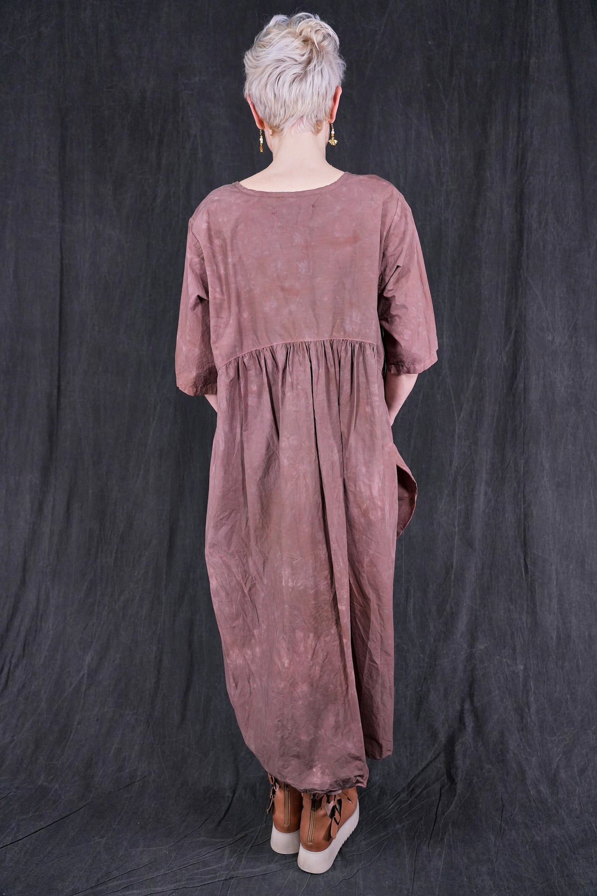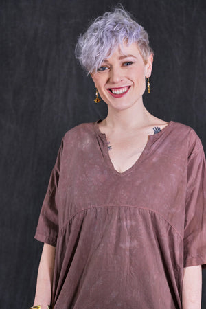 A hand dyed & beautiful style for those who like a little drama. Complex, interesting color and-dyed smoothly woven cotton sets the stage. The back of this tunic drops low in the back and so, this top layers well over wide pants or a skirt in a floaty cotton lawn quite nicely. Perfect for a warm weather event.