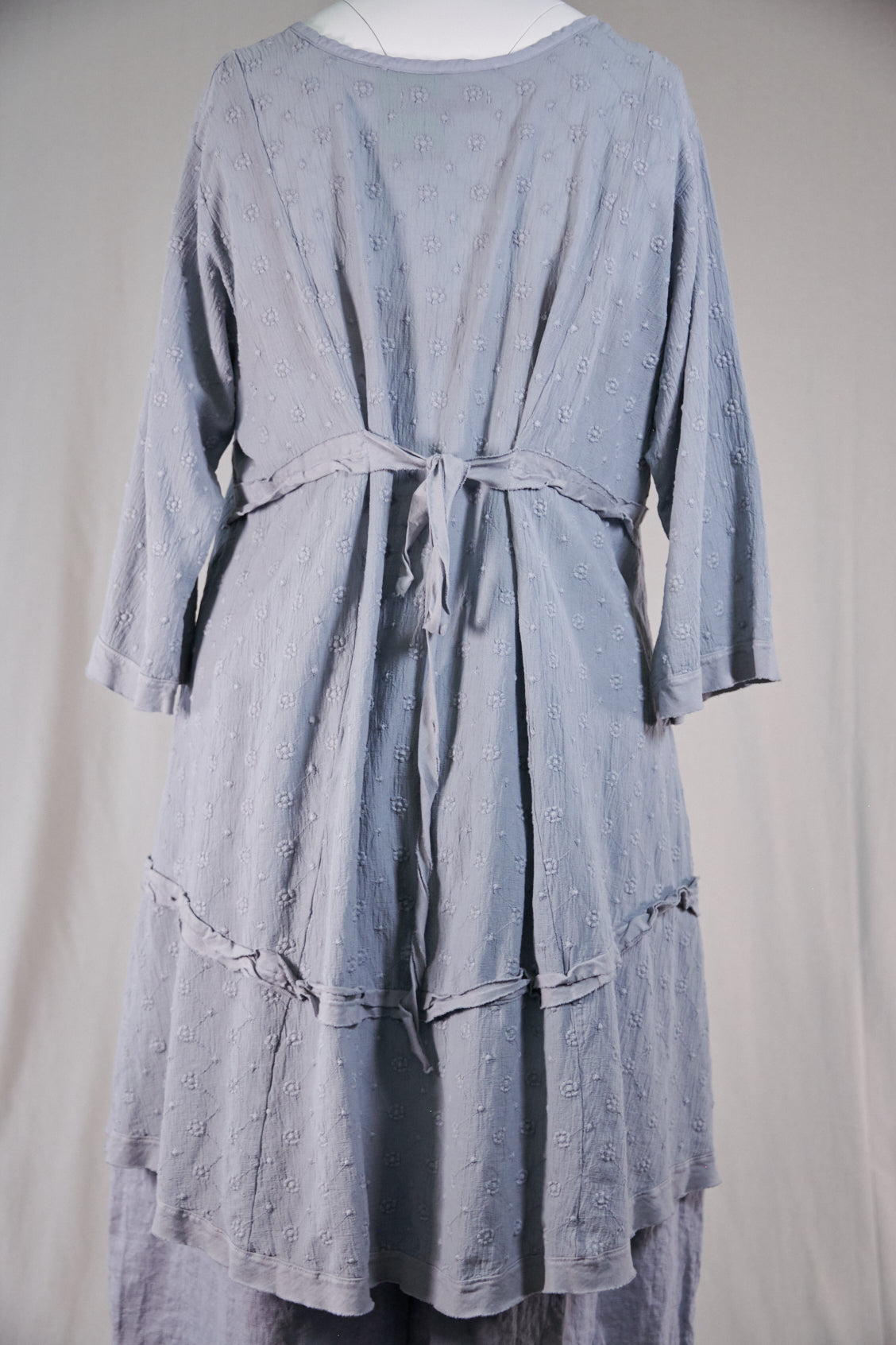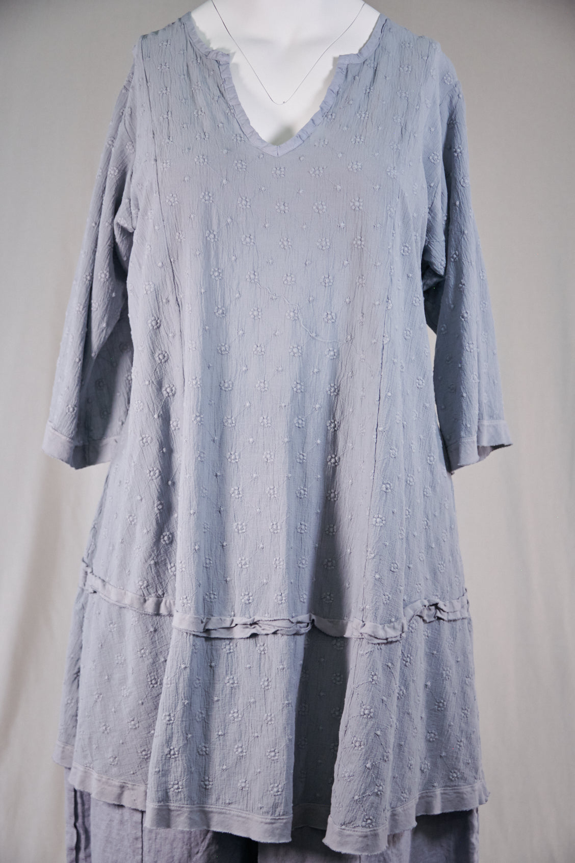 Zoom in to the photos and check out the beautiful embroidery texture of this medium weight cotton gauze. This is a very pretty piece- these photos do not do it justice- sorry -we are during our best here without our models lately! This piece is a longer tunic that has ties in the back to pull it in and dress it up. Nice neckline, like our Bliss Top. Tiered look in the skirt- wear over leggings, a skirt or as a dress or coverup.