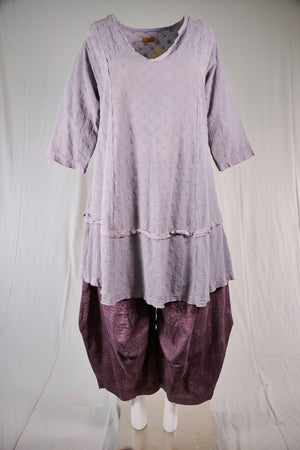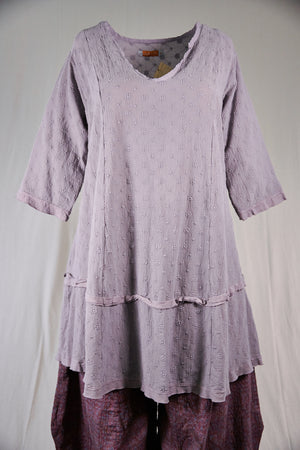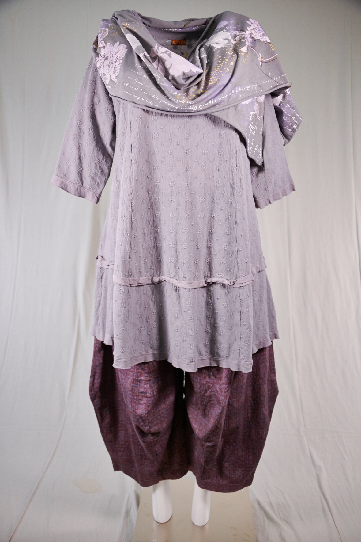 Pretty embroidery texture on medium weight cotton gauze. This is a very nice piece- these photos do not do it justice- zoom in to see the texture -This piece is a longer tunic that has ties in the back to pull it in and dress it up. Nice neckline, like our Bliss Top. Tiered look in the skirt- wear over leggings, a skirt or as a dress or coverup. Shown here in the main photo with coordinating printed scarf draped to create a pretty cowl look.