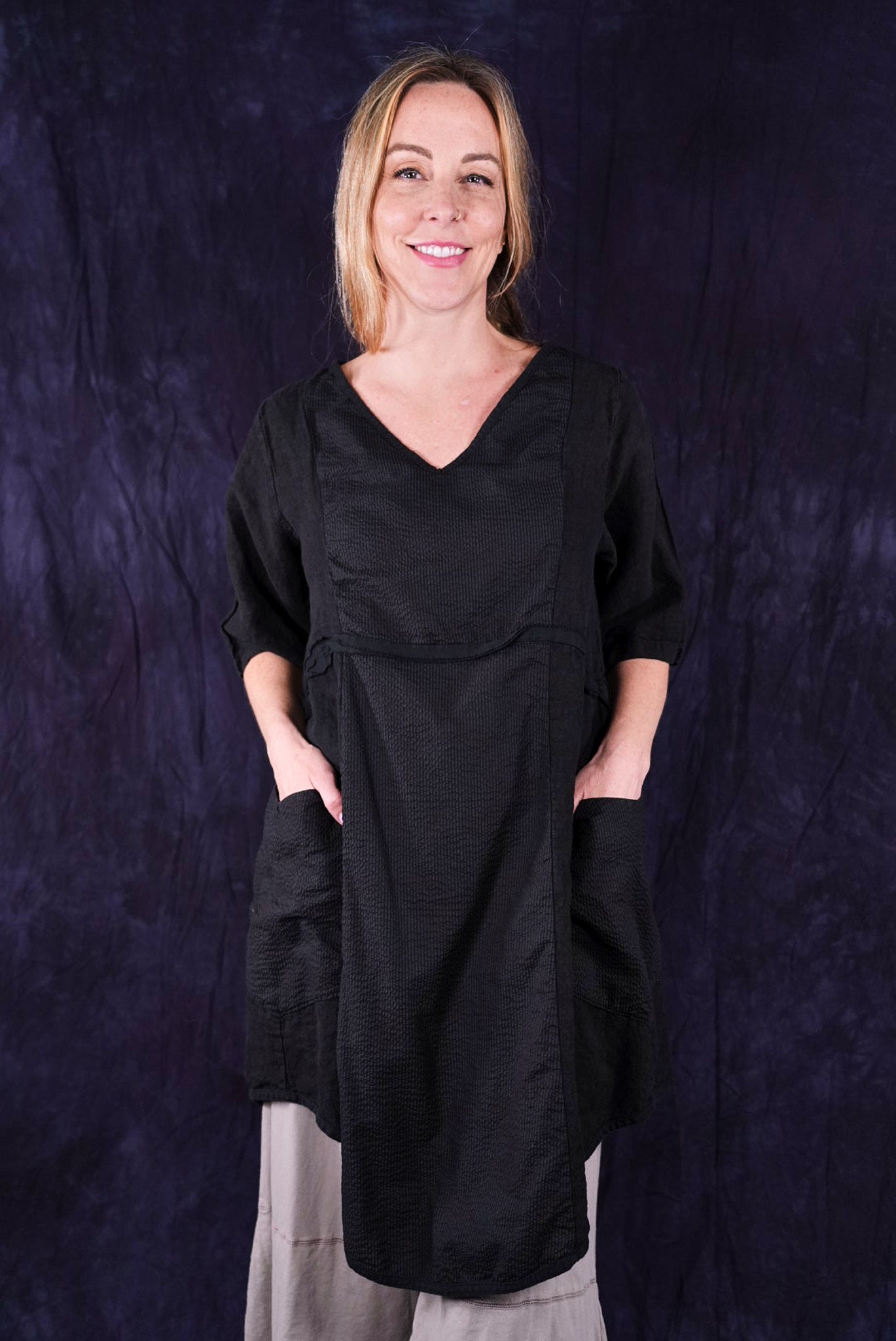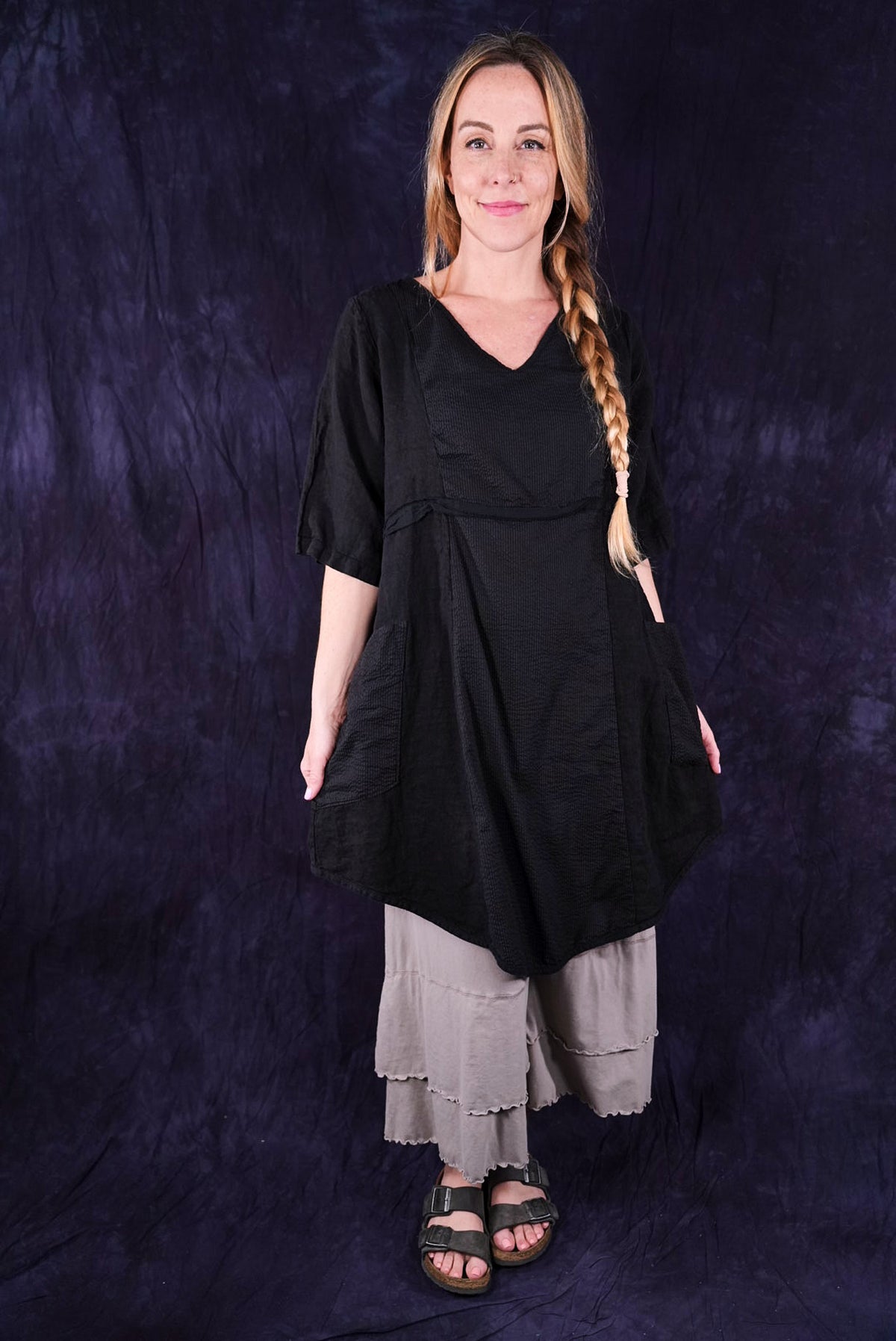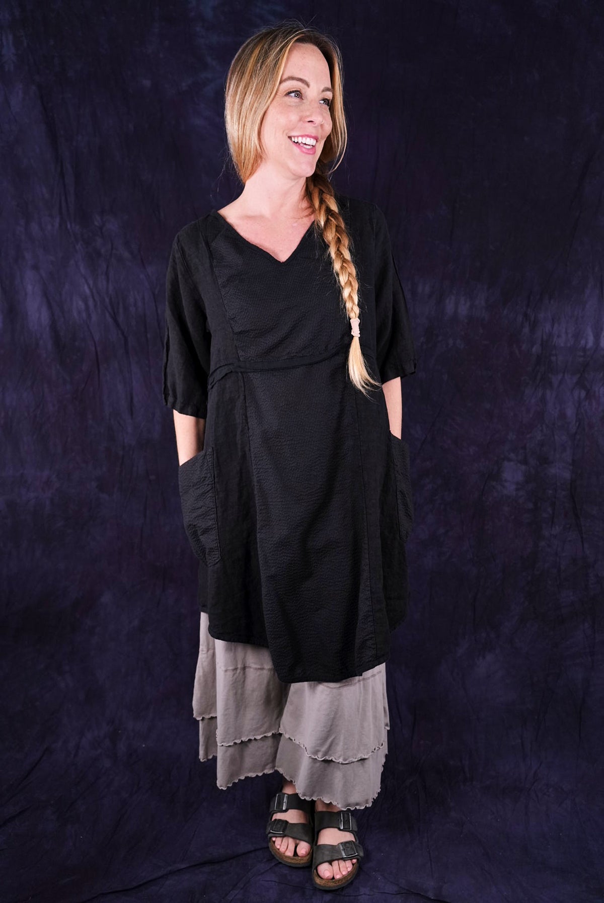 This lightweight summer tunic is short-sleeved, and has 2 large patch pockets placed on the sides.