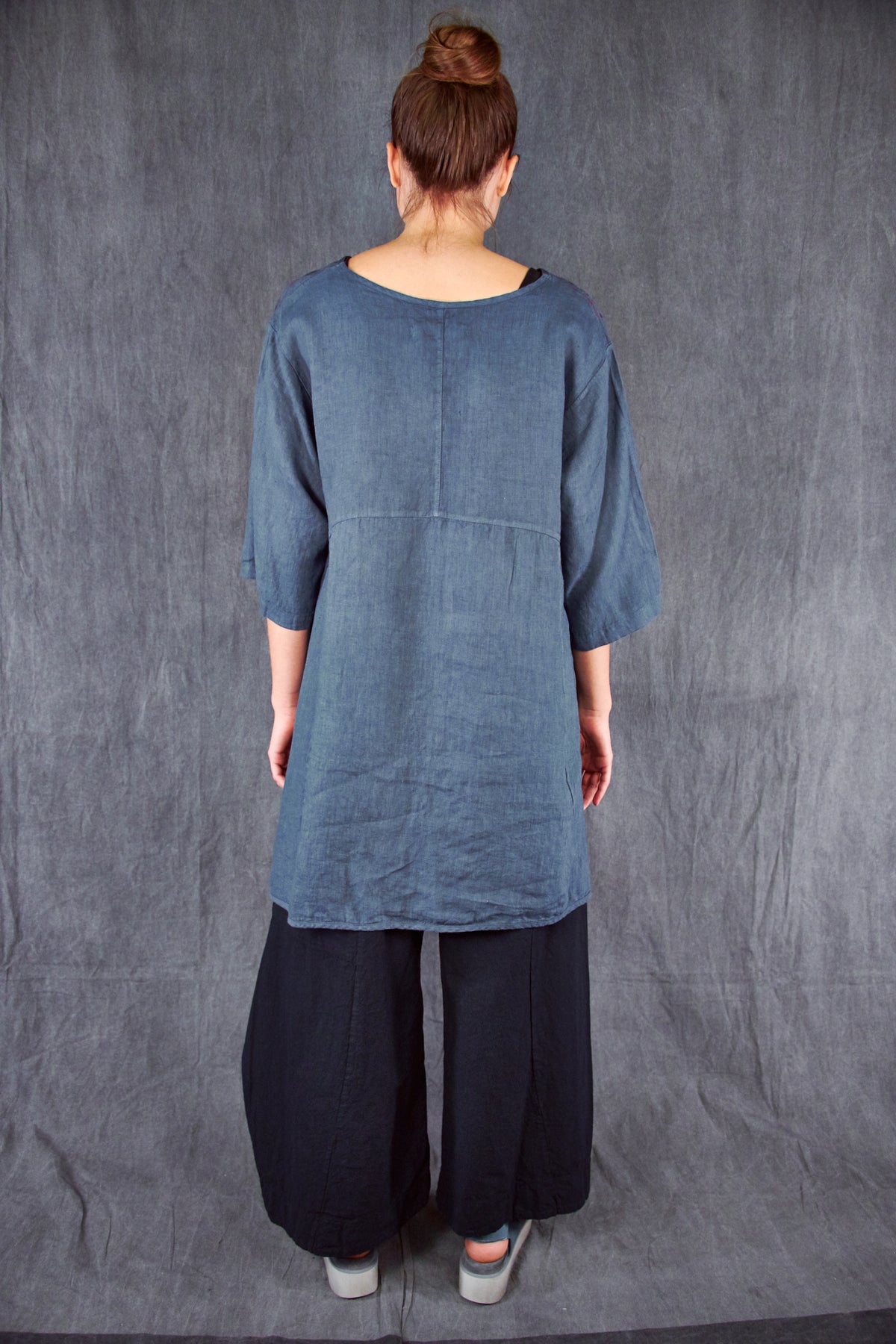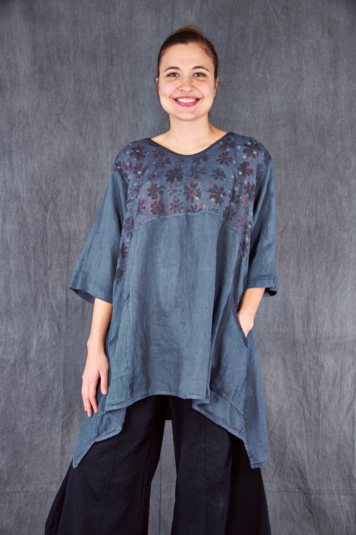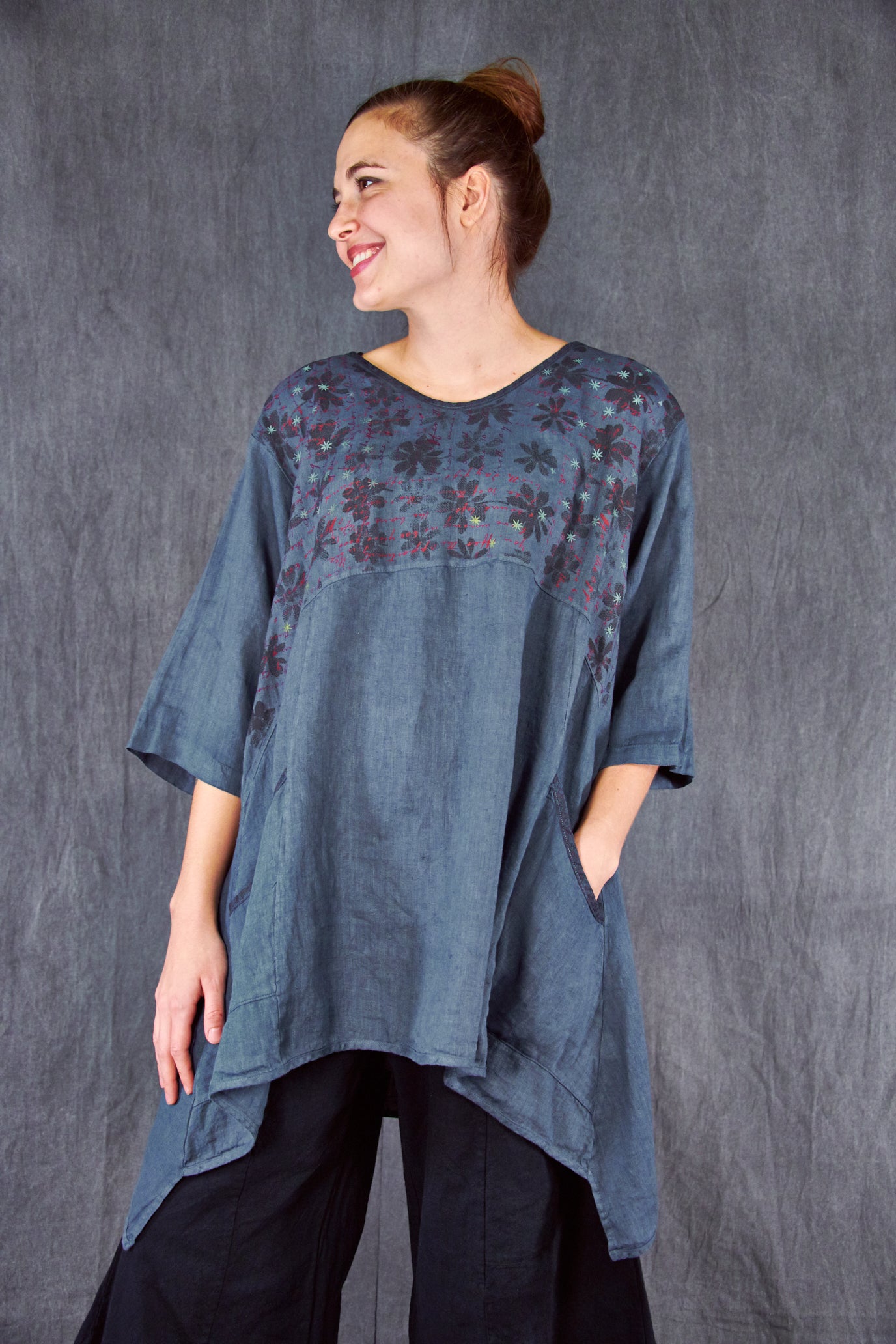 LOOK CLOSELY AT THIS PRINT. PHOTOS DON'T SHOW THE DETAIL :) Wear this practical linen tunic all year long. This is a modern, angular take on our classic Zen tunic, shorter in the front & longer in the back to create an easy comfortable look. The rich color is perfect for every season.