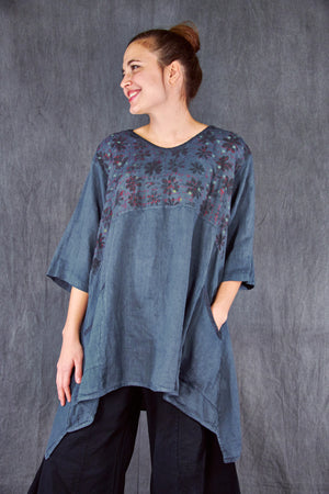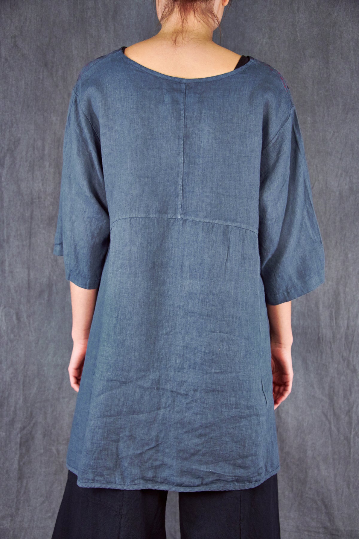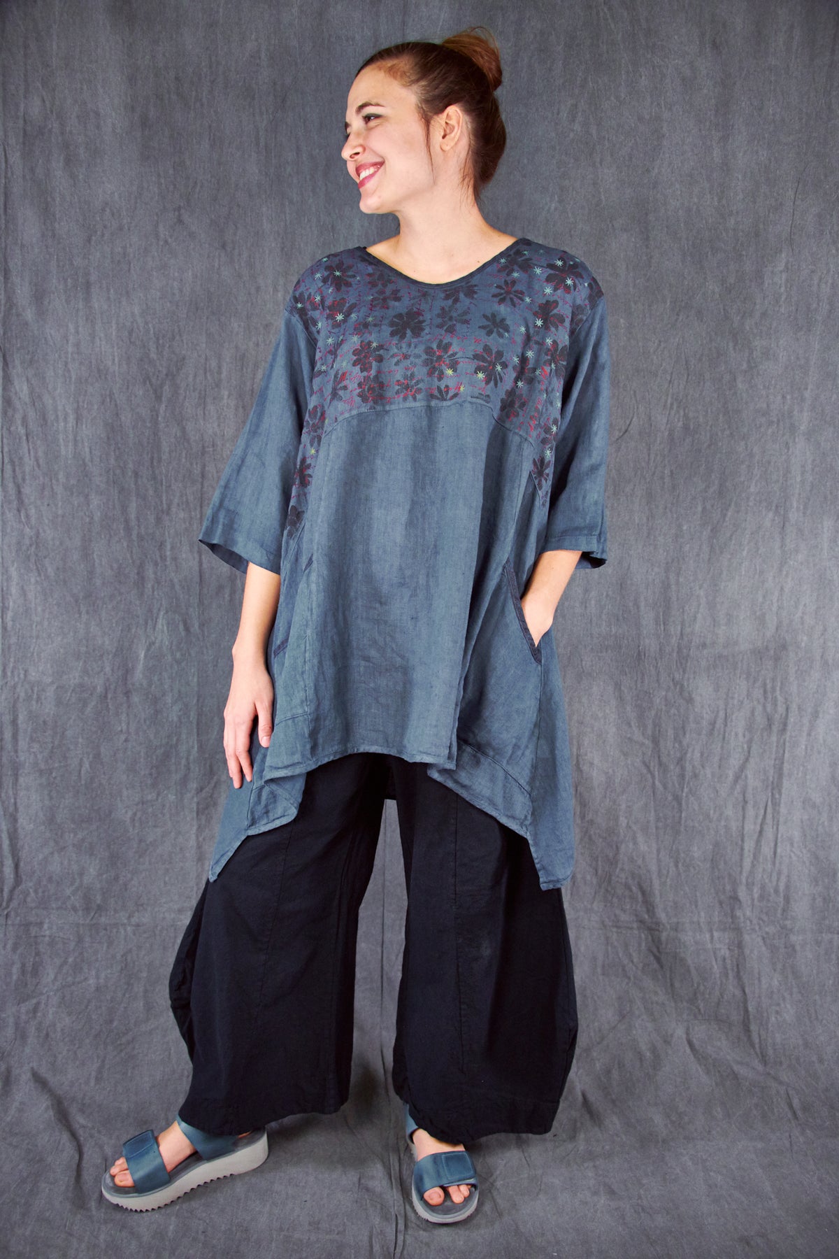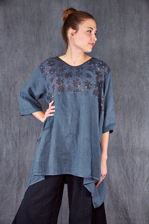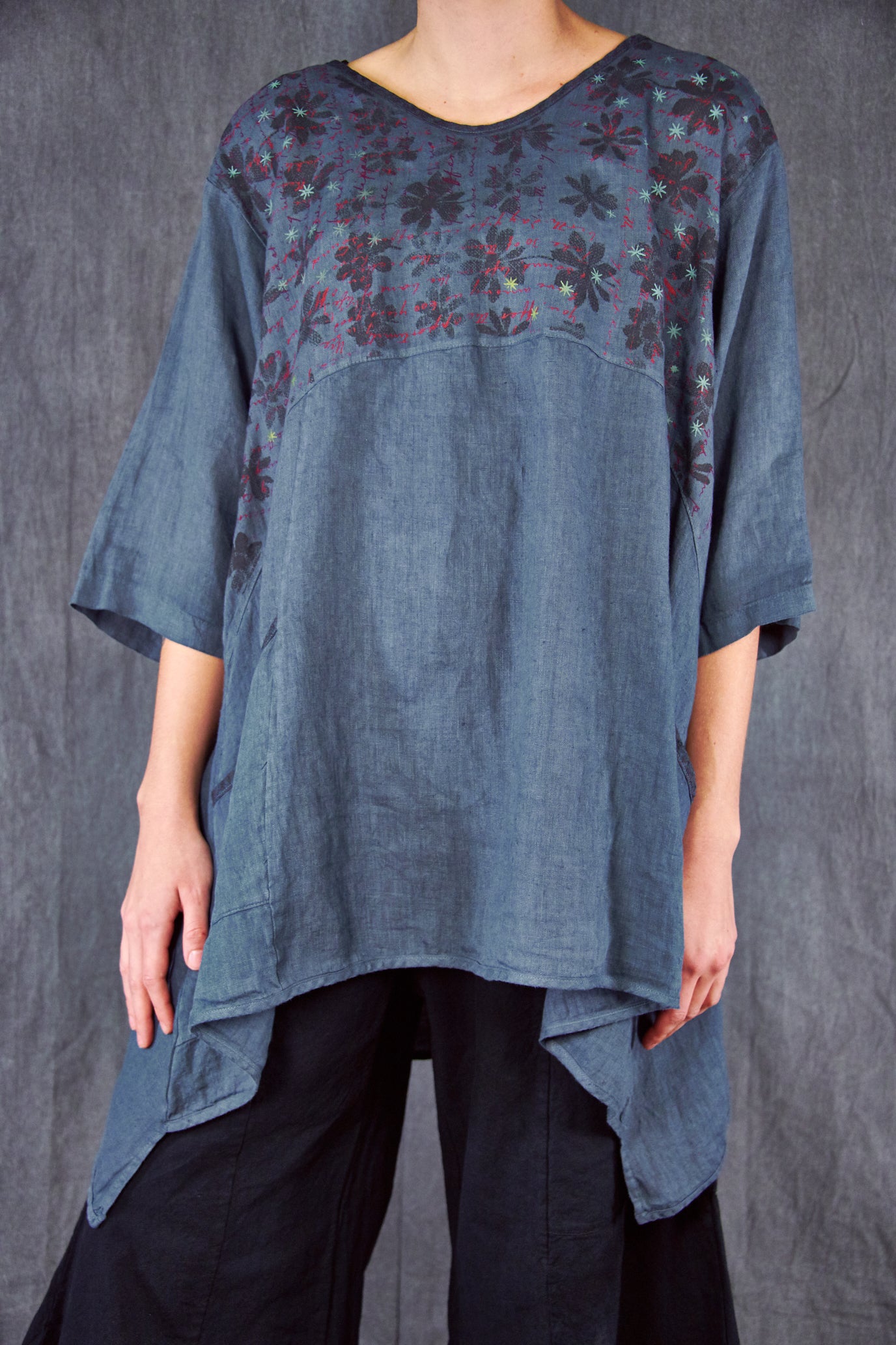 LOOK CLOSELY AT THIS PRINT. PHOTOS DON'T SHOW THE DETAIL :) Wear this practical linen tunic all year long. This is a modern, angular take on our classic Zen tunic, shorter in the front & longer in the back to create an easy comfortable look. The rich color is perfect for every season.