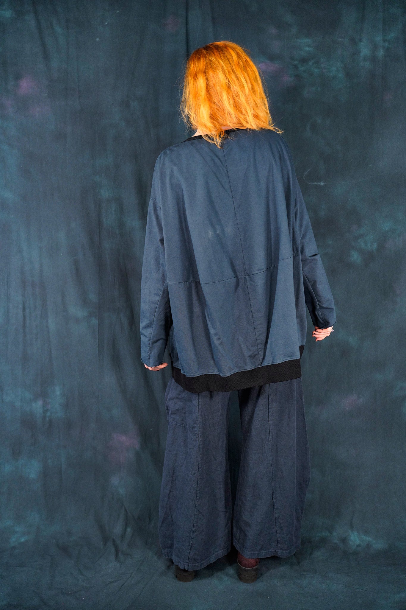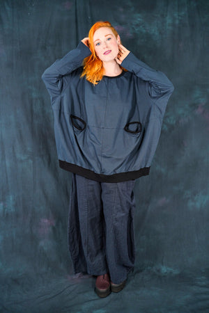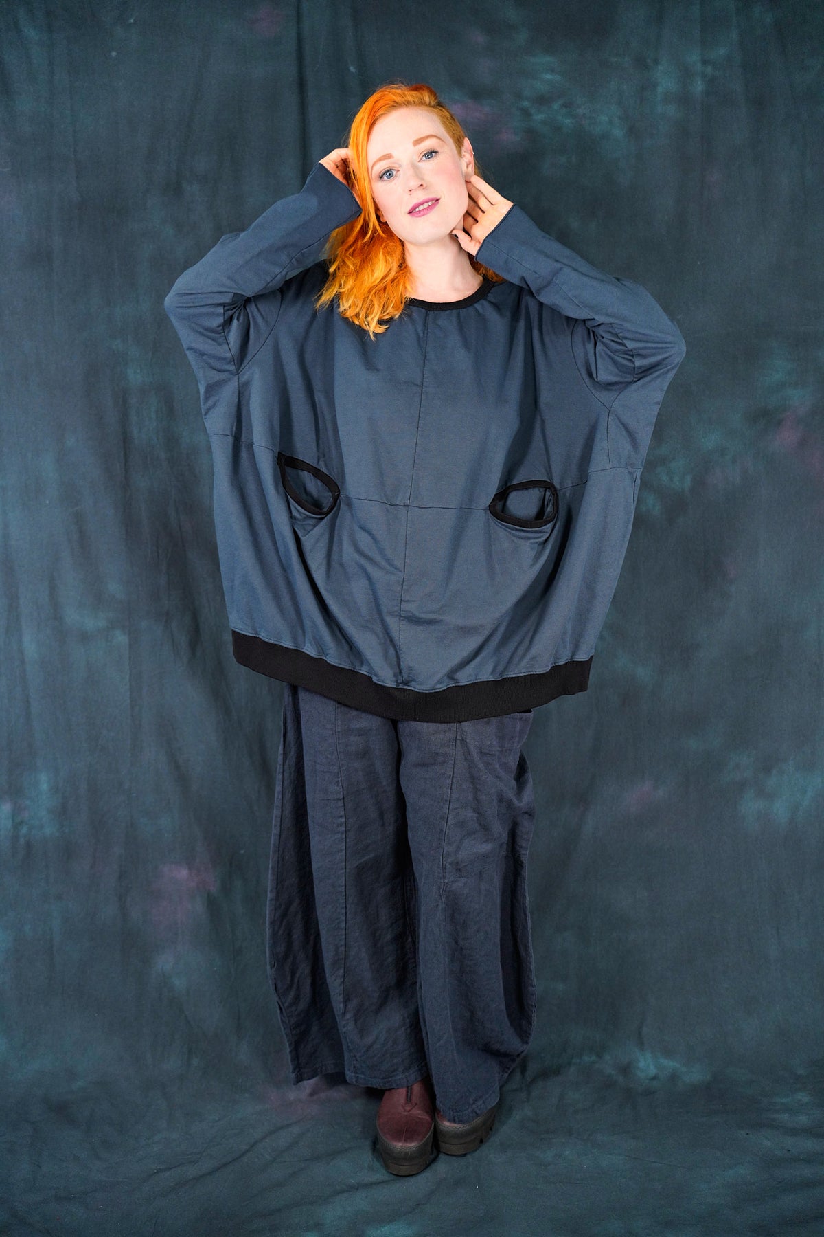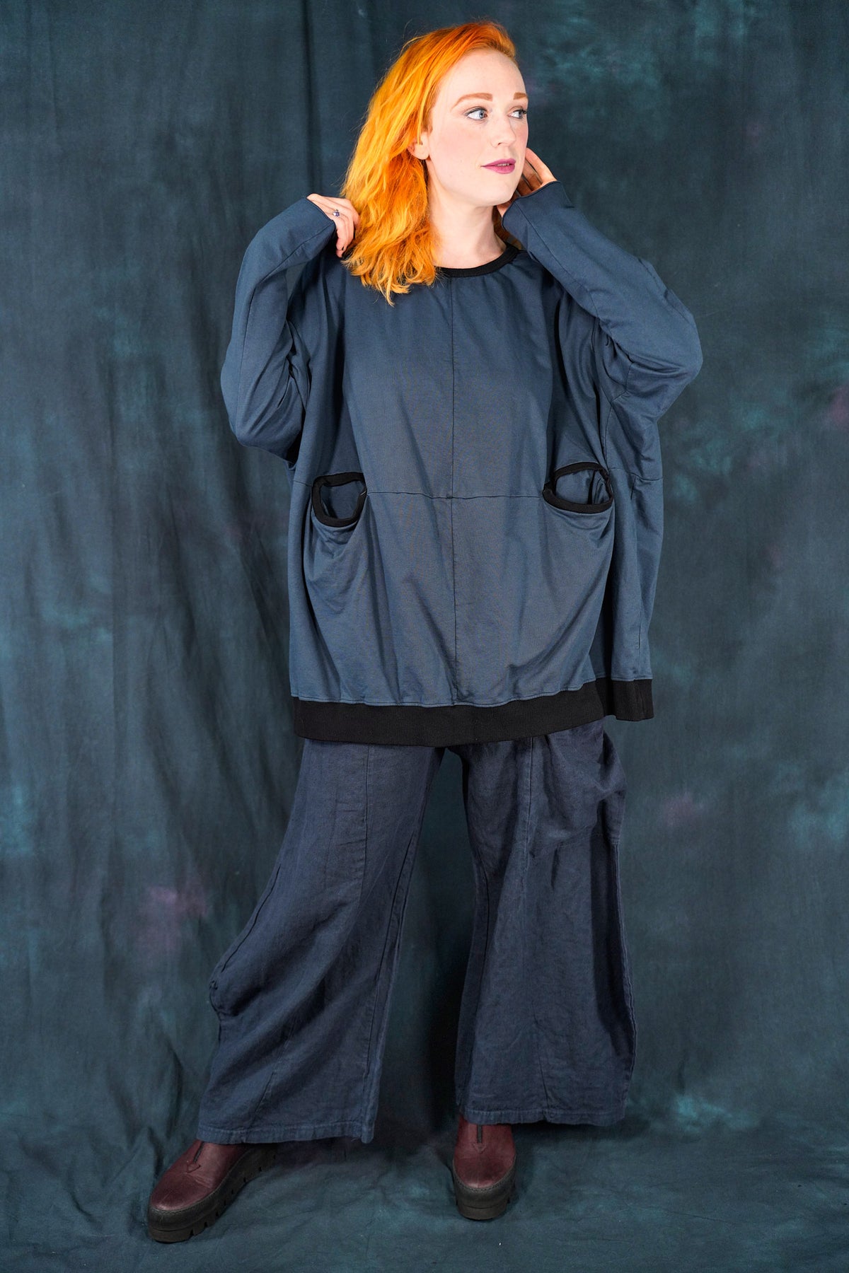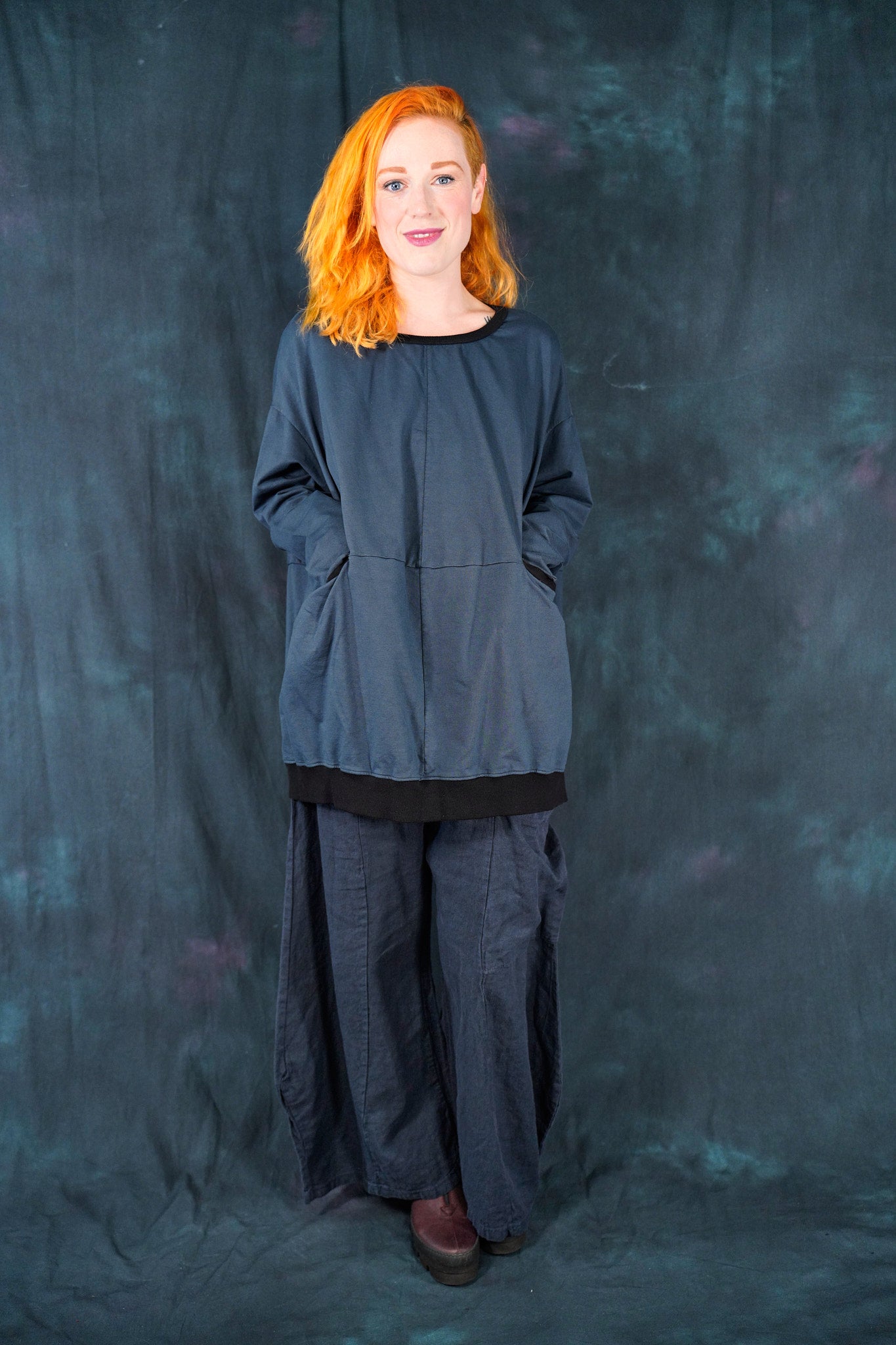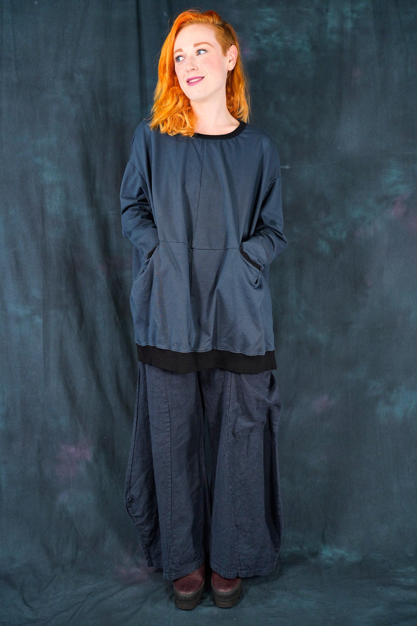 This pullover is a based on the shape of our classic four square pant angles, and creates a wide, yet interestingly angled shape that feels voluminously cozy. It has contrasting black trim outlining the neck, 2 pouch pockets and also on the hem band.