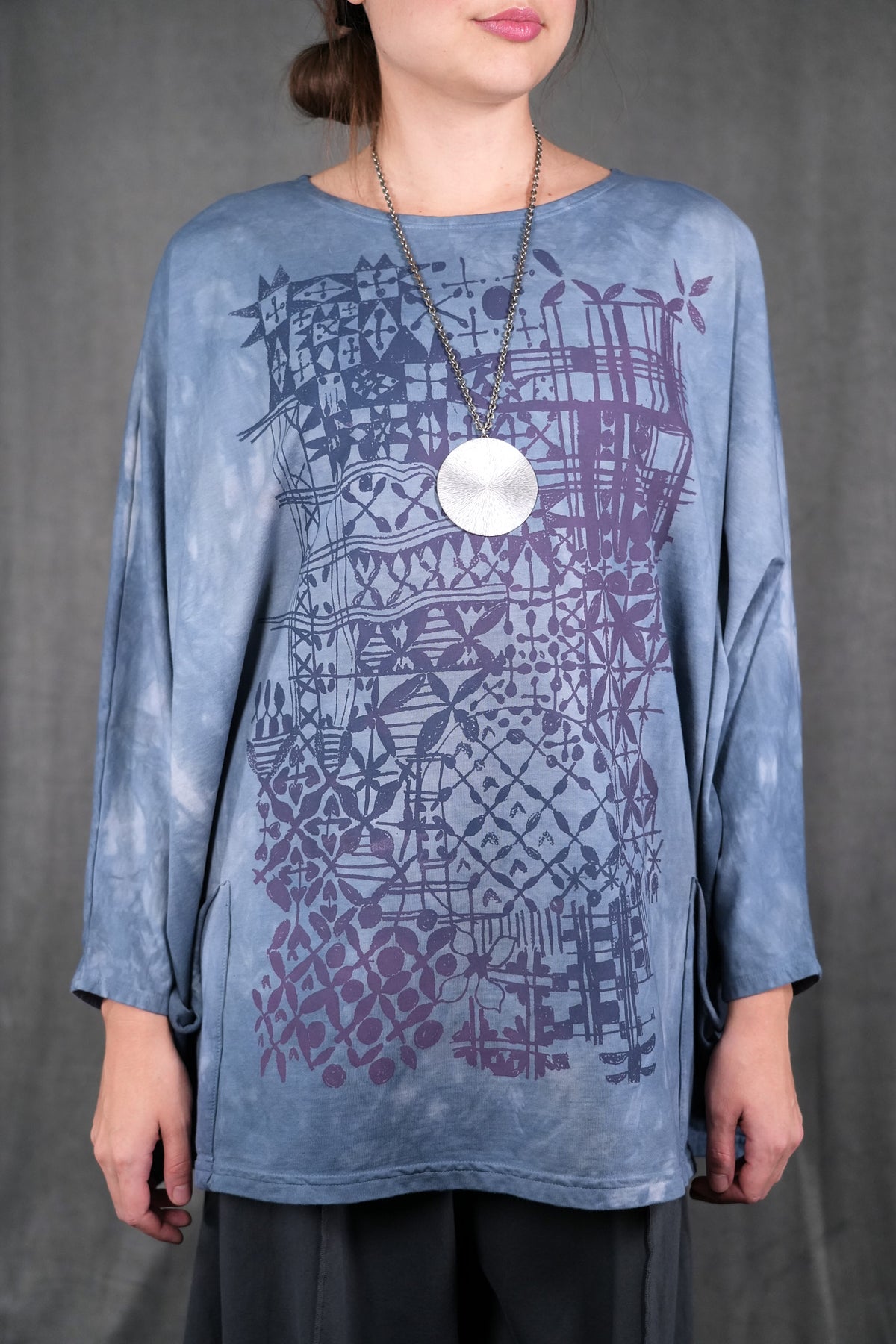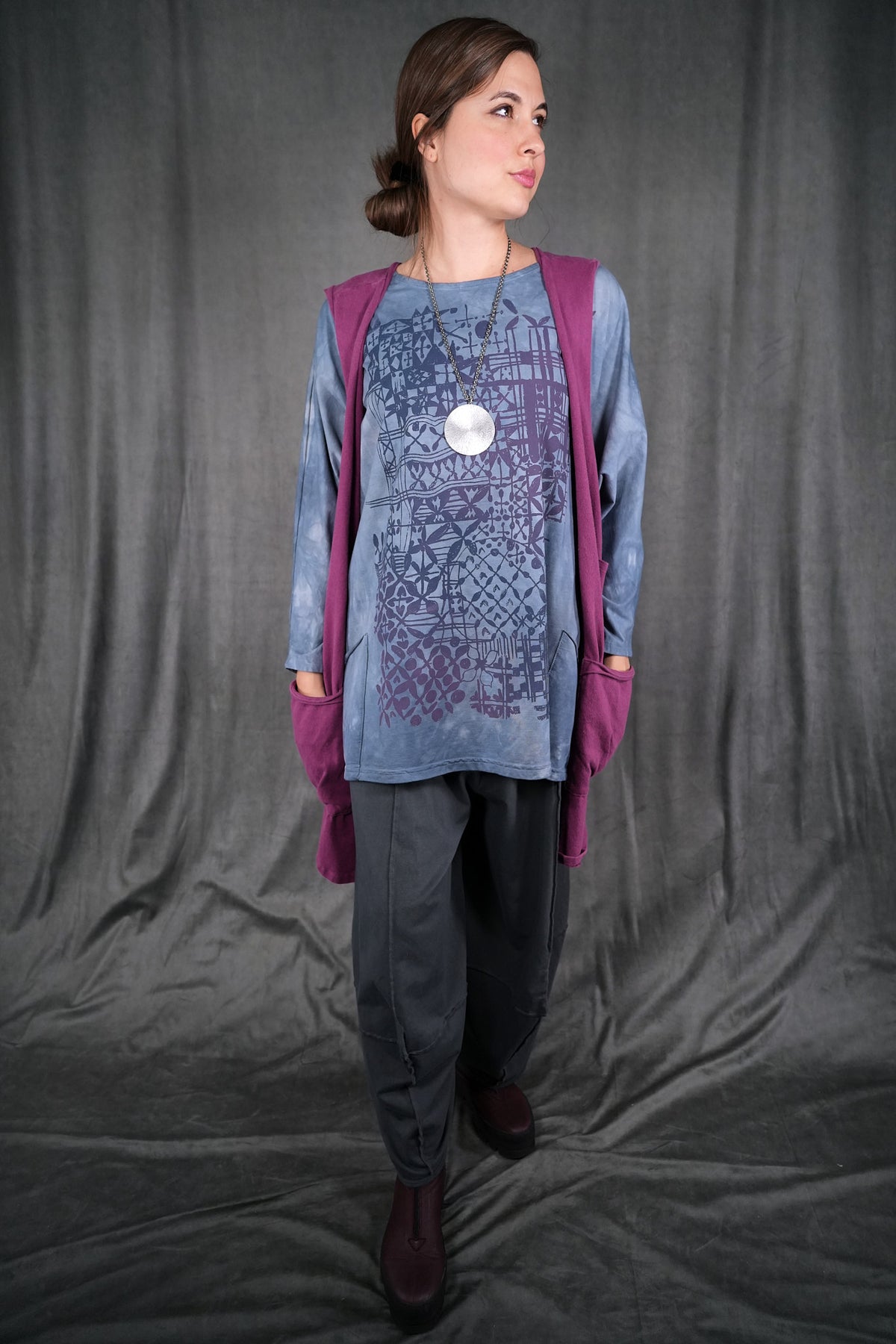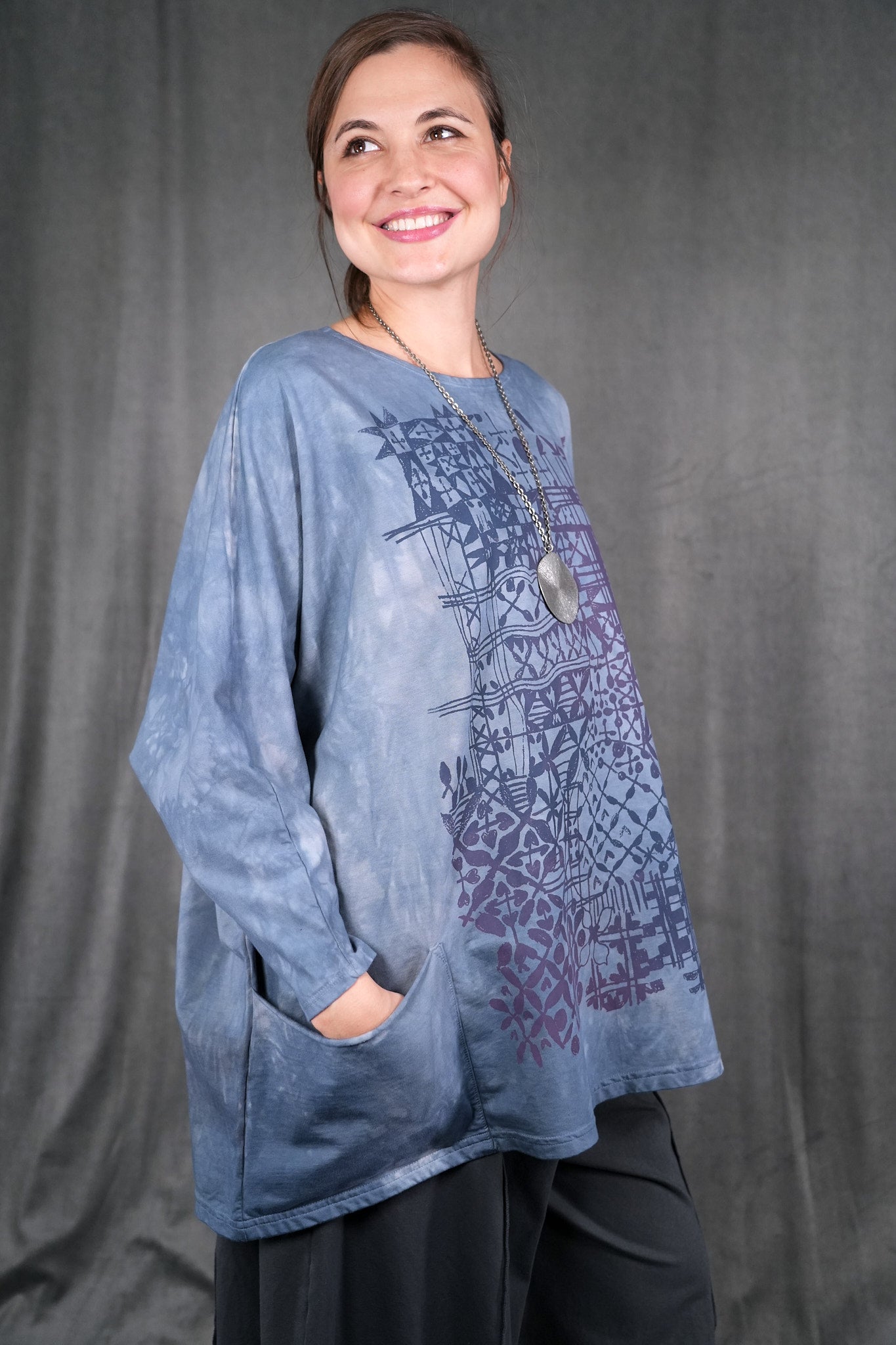 Made of organic cotton with just a bit of spandex stretch to give it shape. So, so versatile! Dress it up with a skirt or down with your favorite jeans... the possibilities are endless. Hand-dyed artwork gives a pop of unique design that is sure to turn heads.