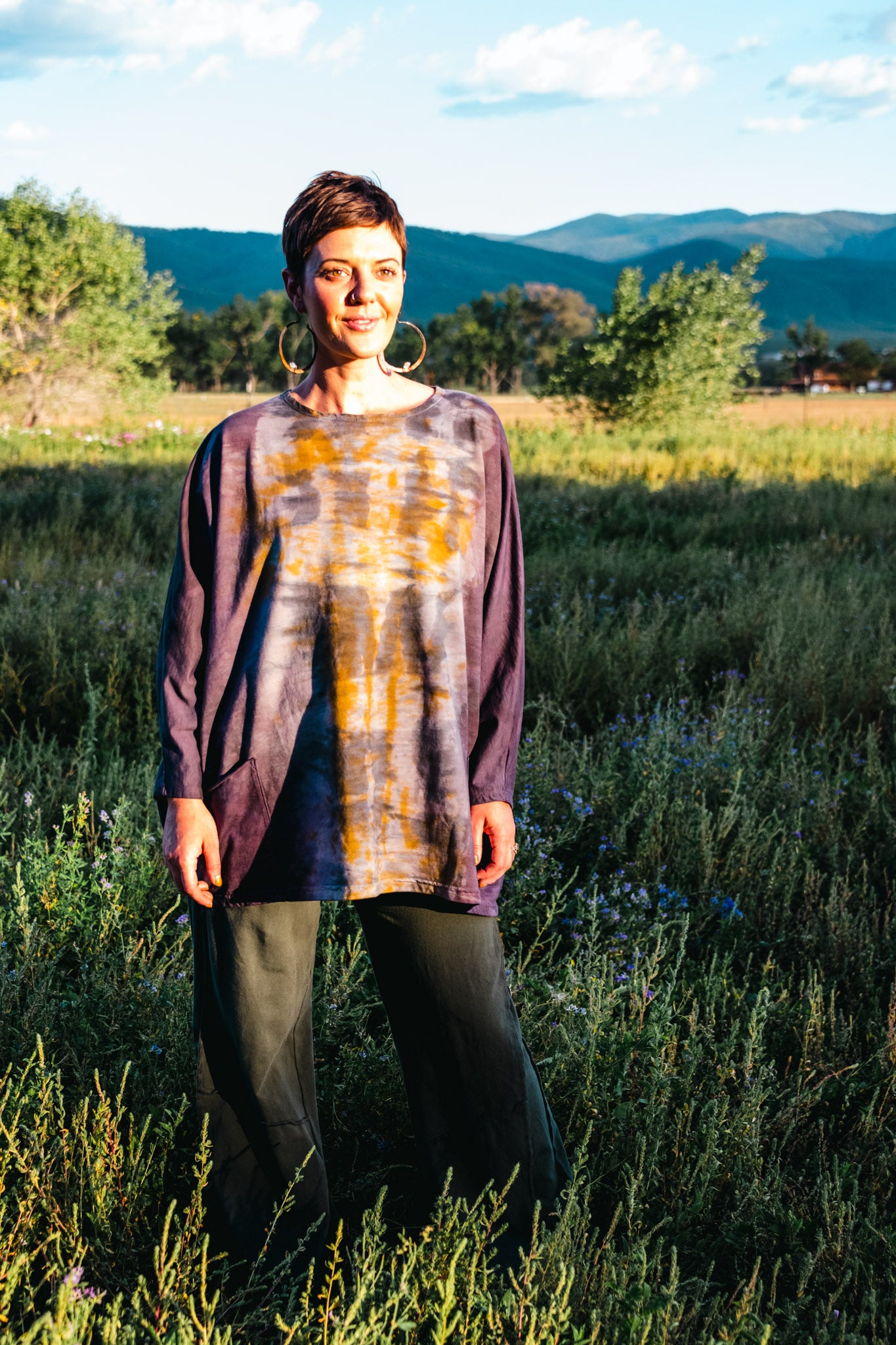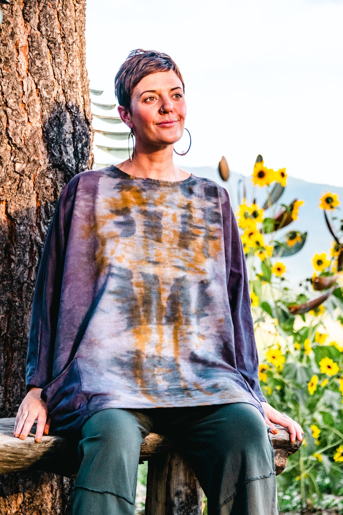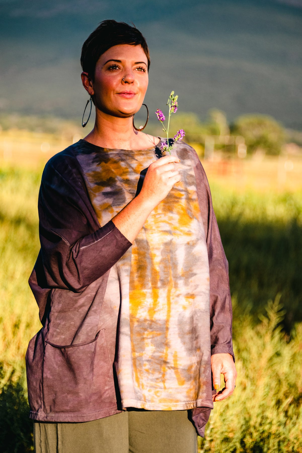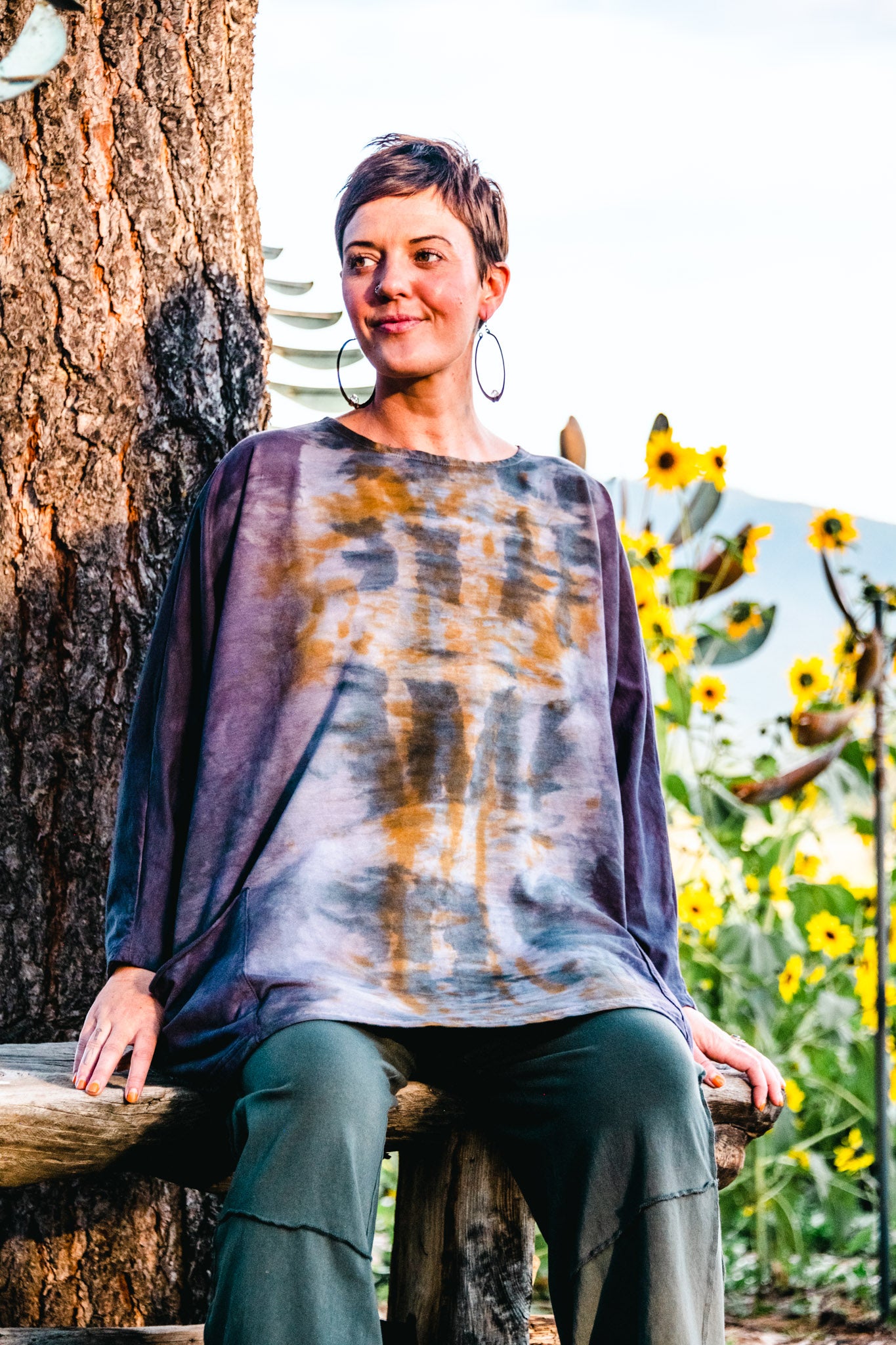 Made of organic cotton with just a bit of spandex stretch to give it shape. So, so versatile! Dress it up with a skirt or down with your favorite jeans... the possibilities are endless. Hand-dyed artwork gives a pop of unique design that is sure to turn heads.