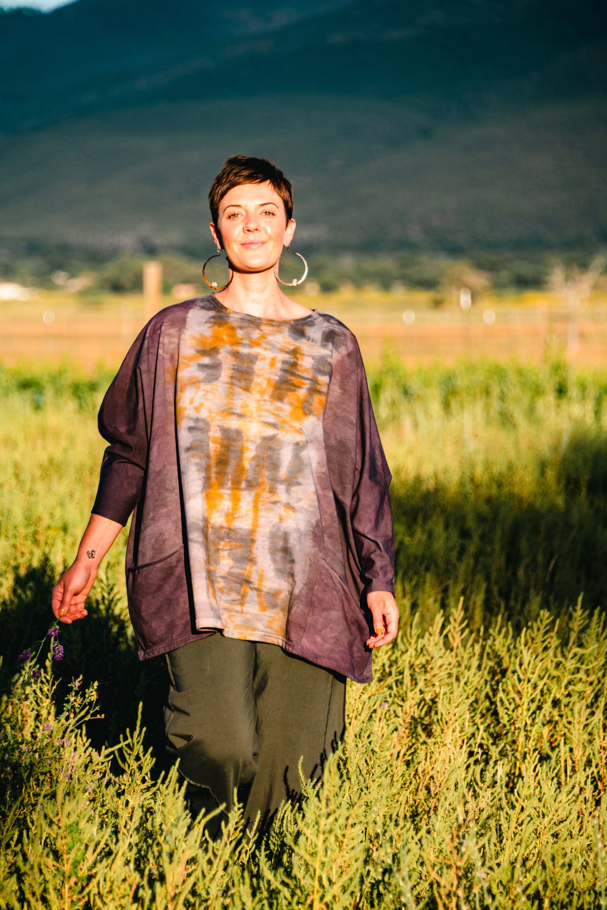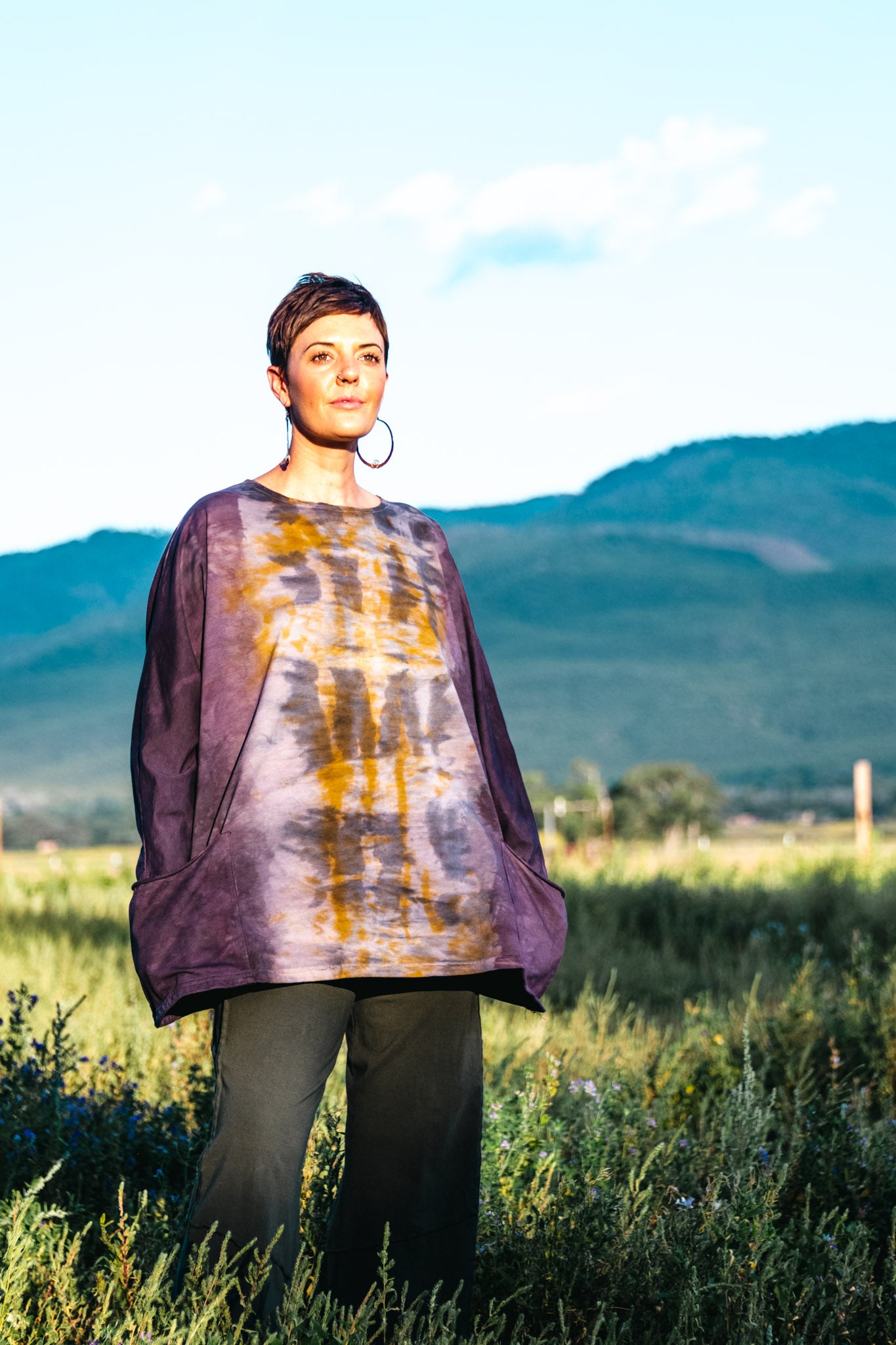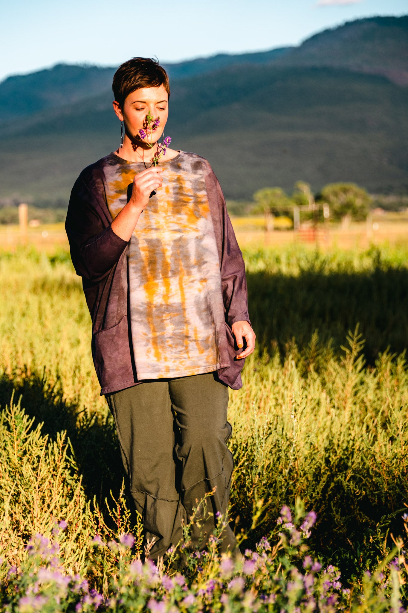 Made of organic cotton with just a bit of spandex stretch to give it shape. So, so versatile! Dress it up with a skirt or down with your favorite jeans... the possibilities are endless. Hand-dyed artwork gives a pop of unique design that is sure to turn heads.