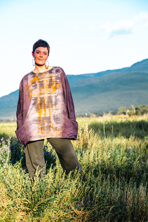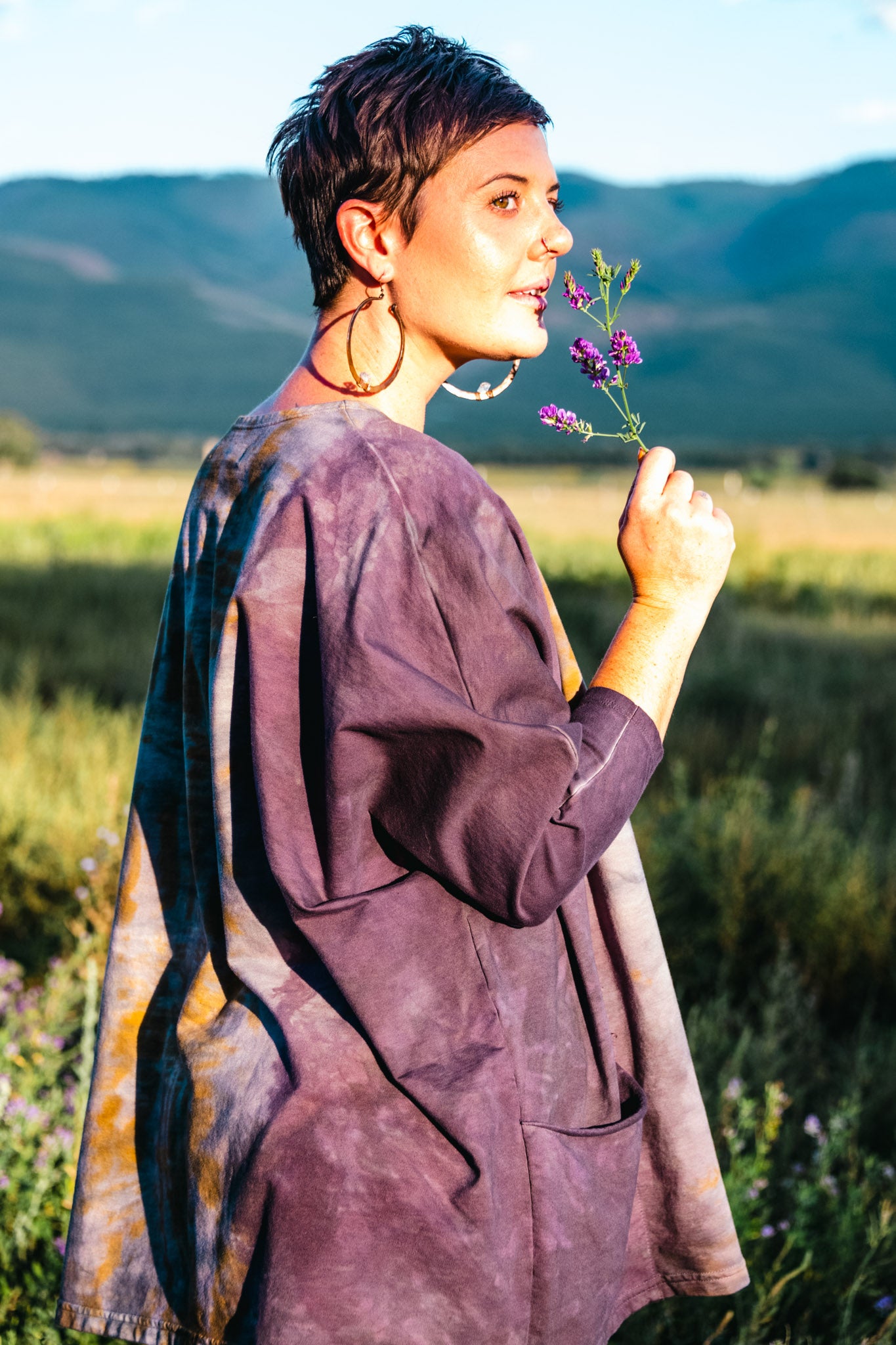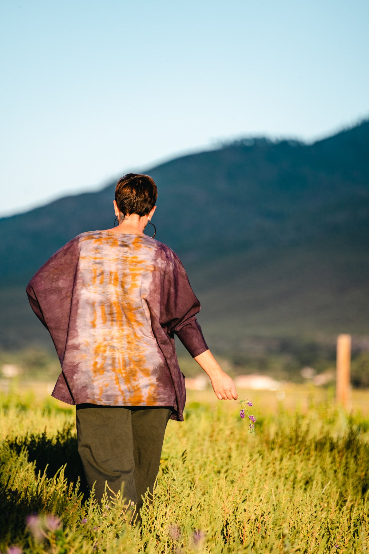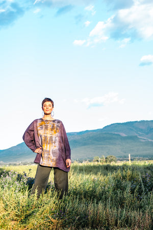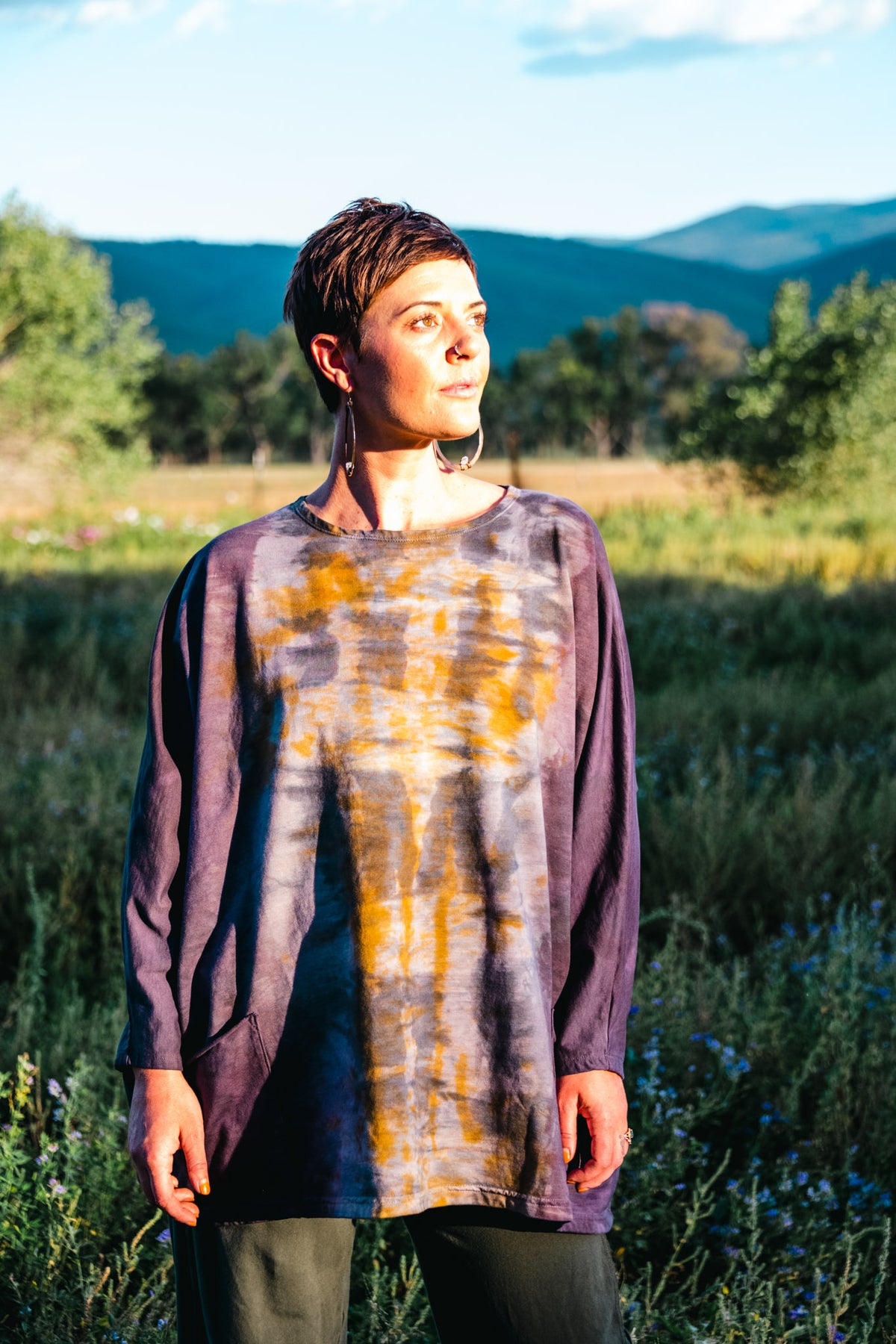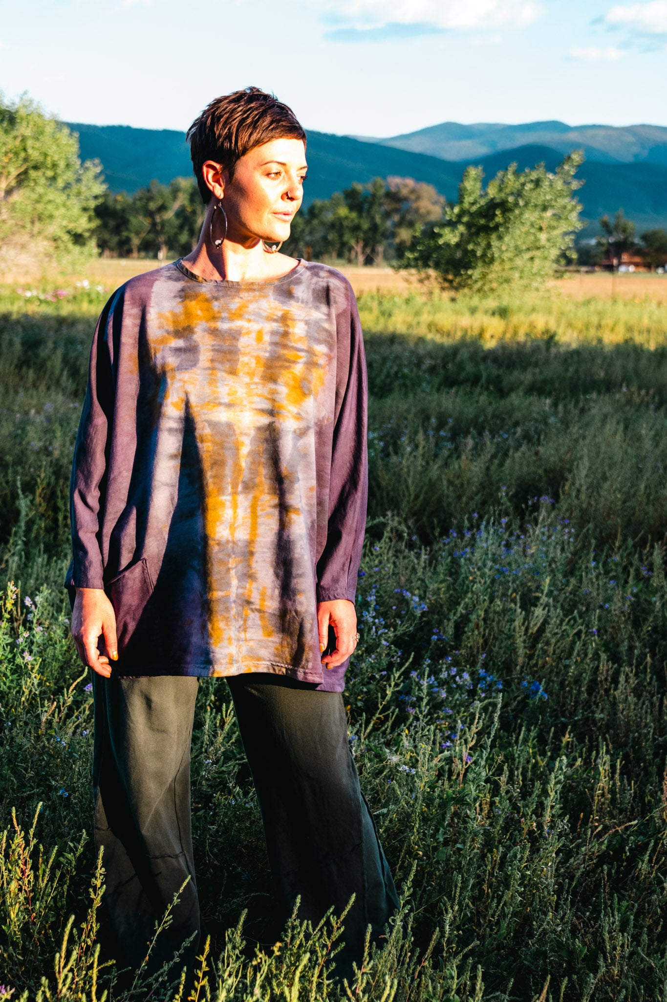 Made of organic cotton with just a bit of spandex stretch to give it shape. So, so versatile! Dress it up with a skirt or down with your favorite jeans... the possibilities are endless. Hand-dyed artwork gives a pop of unique design that is sure to turn heads.
