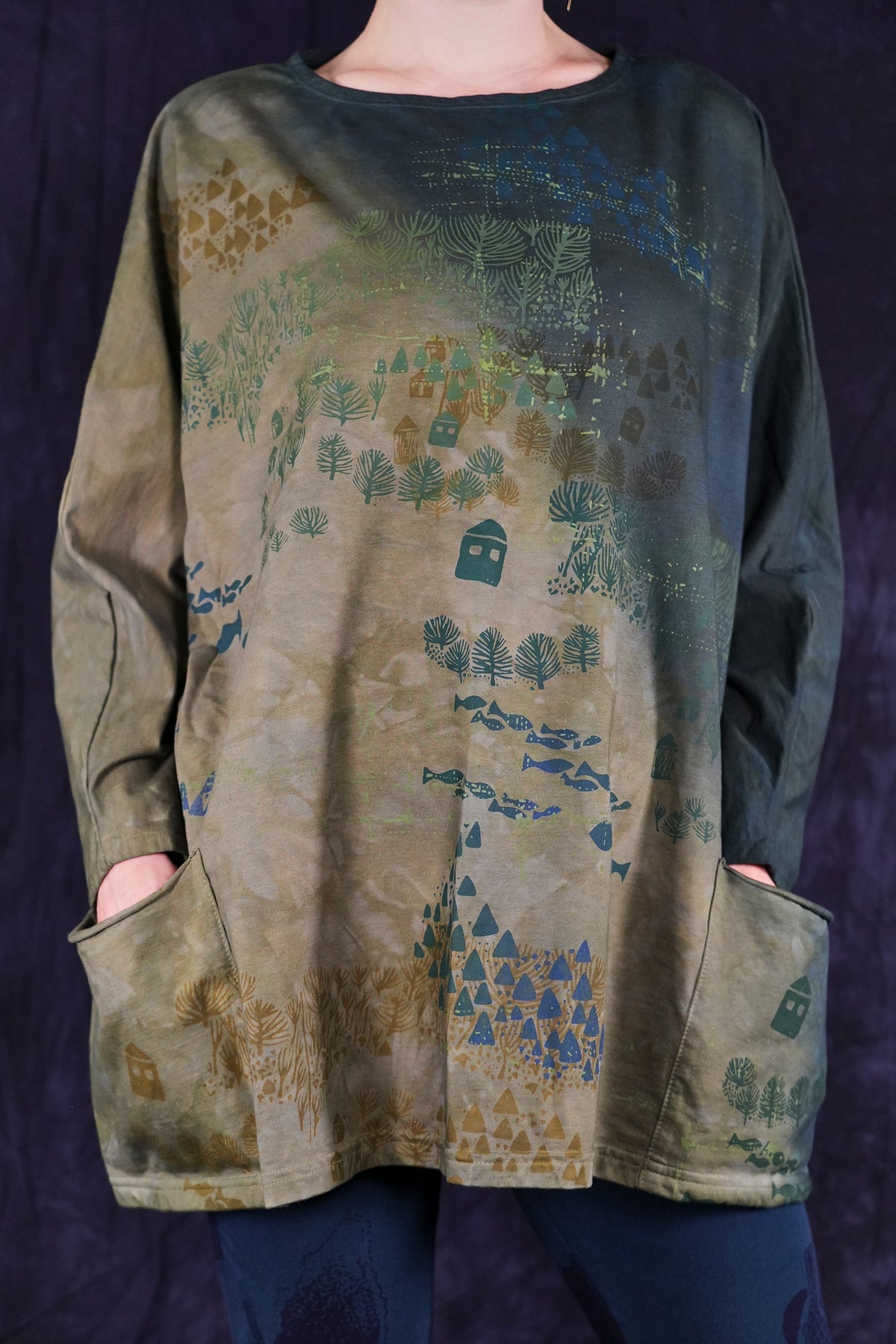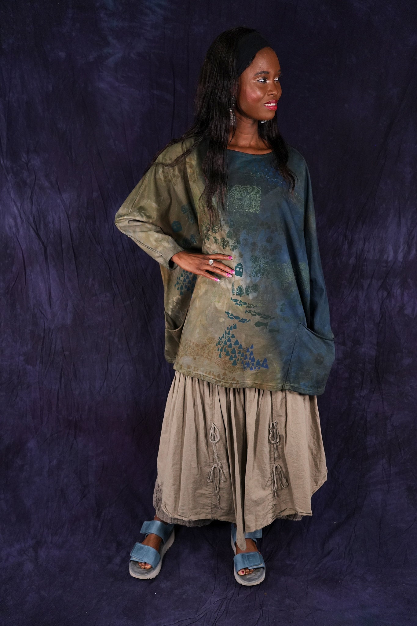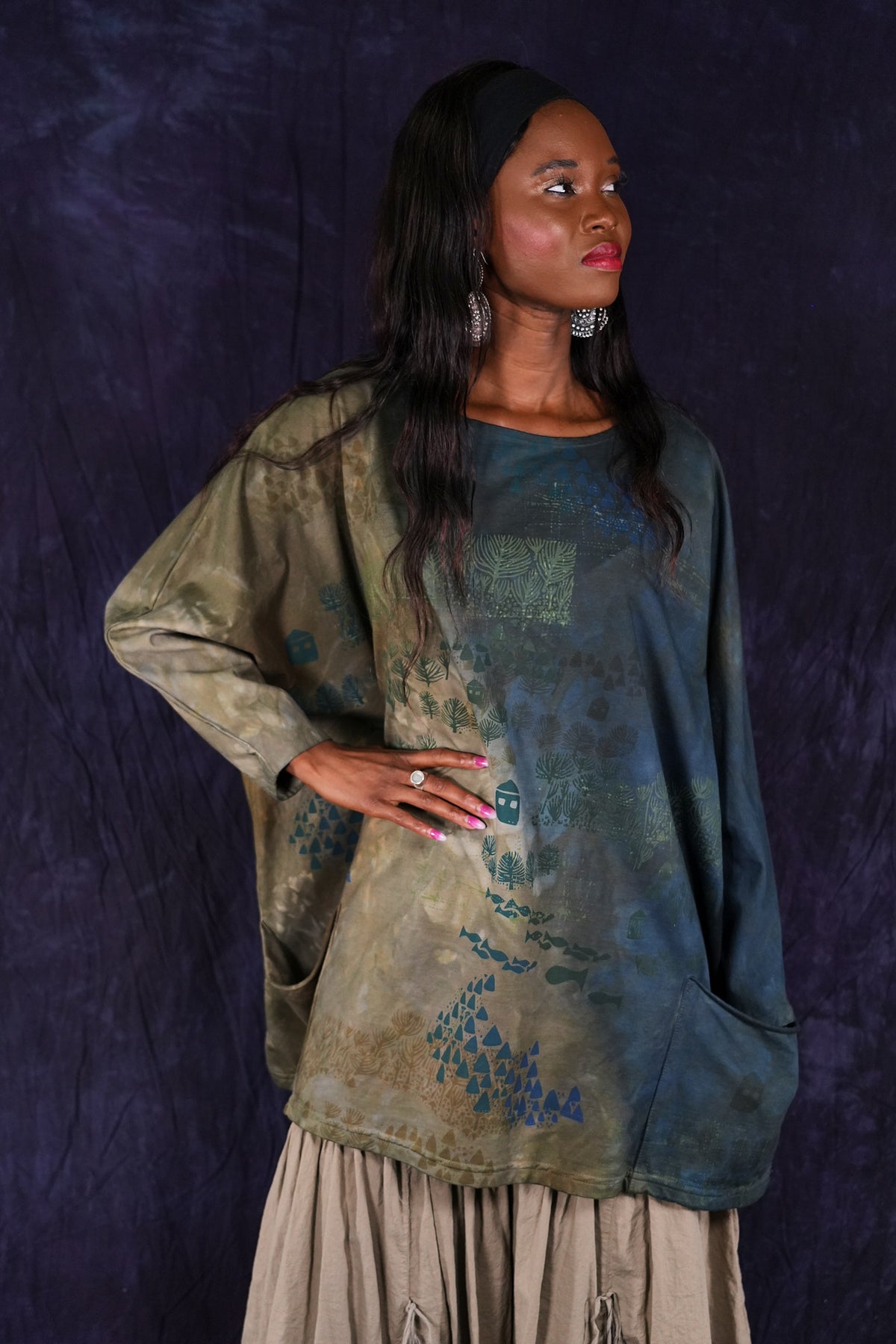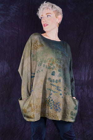 Made of organic cotton french terry with just a bit of spandex stretch to give it shape. So, so versatile! Dress it up with a skirt or down with your favorite jeans... the possibilities are endless. Hand-dyed & hand printed artwork gives a pop of unique design.
