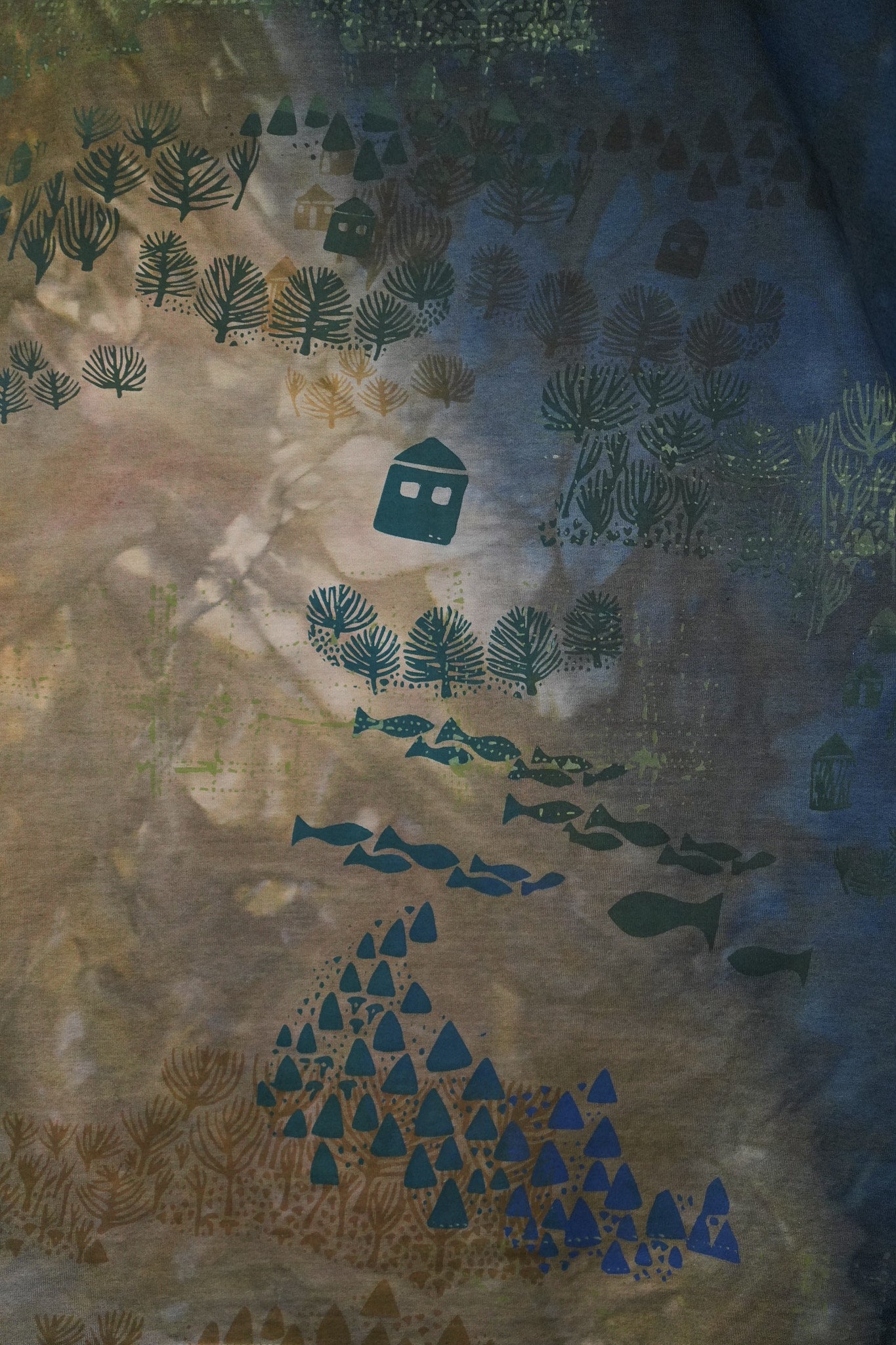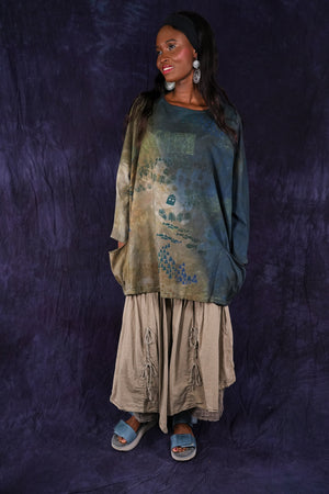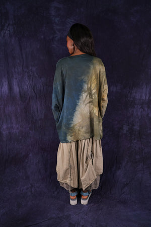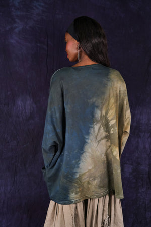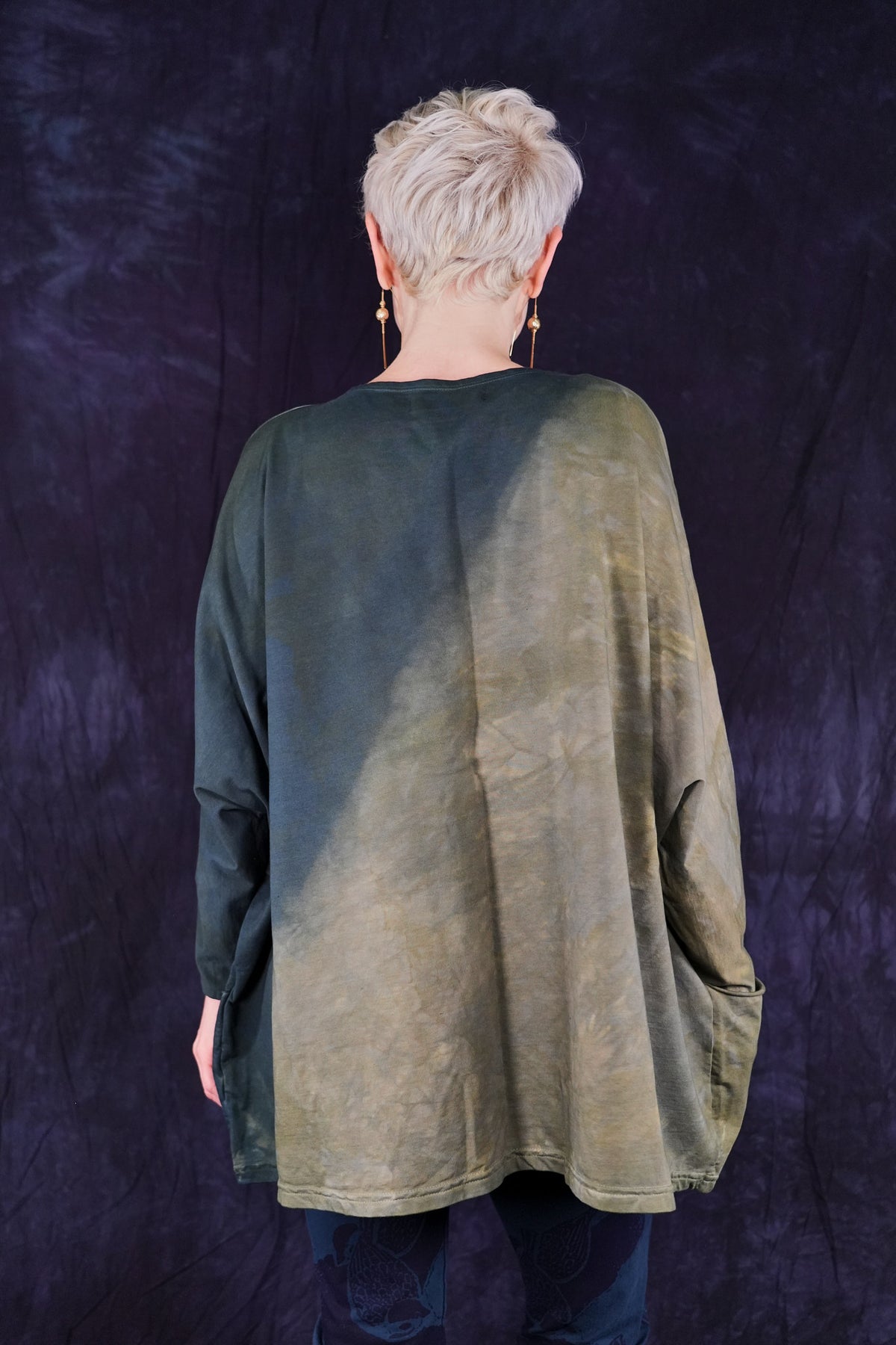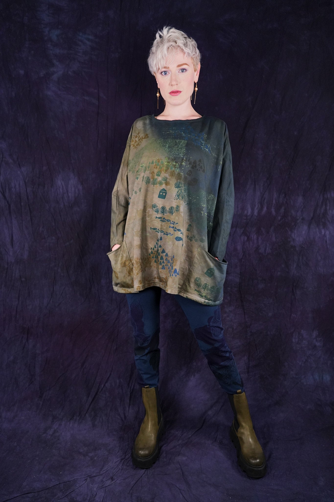Made of organic cotton french terry with just a bit of spandex stretch to give it shape. So, so versatile! Dress it up with a skirt or down with your favorite jeans... the possibilities are endless. Hand-dyed & hand printed artwork gives a pop of unique design.