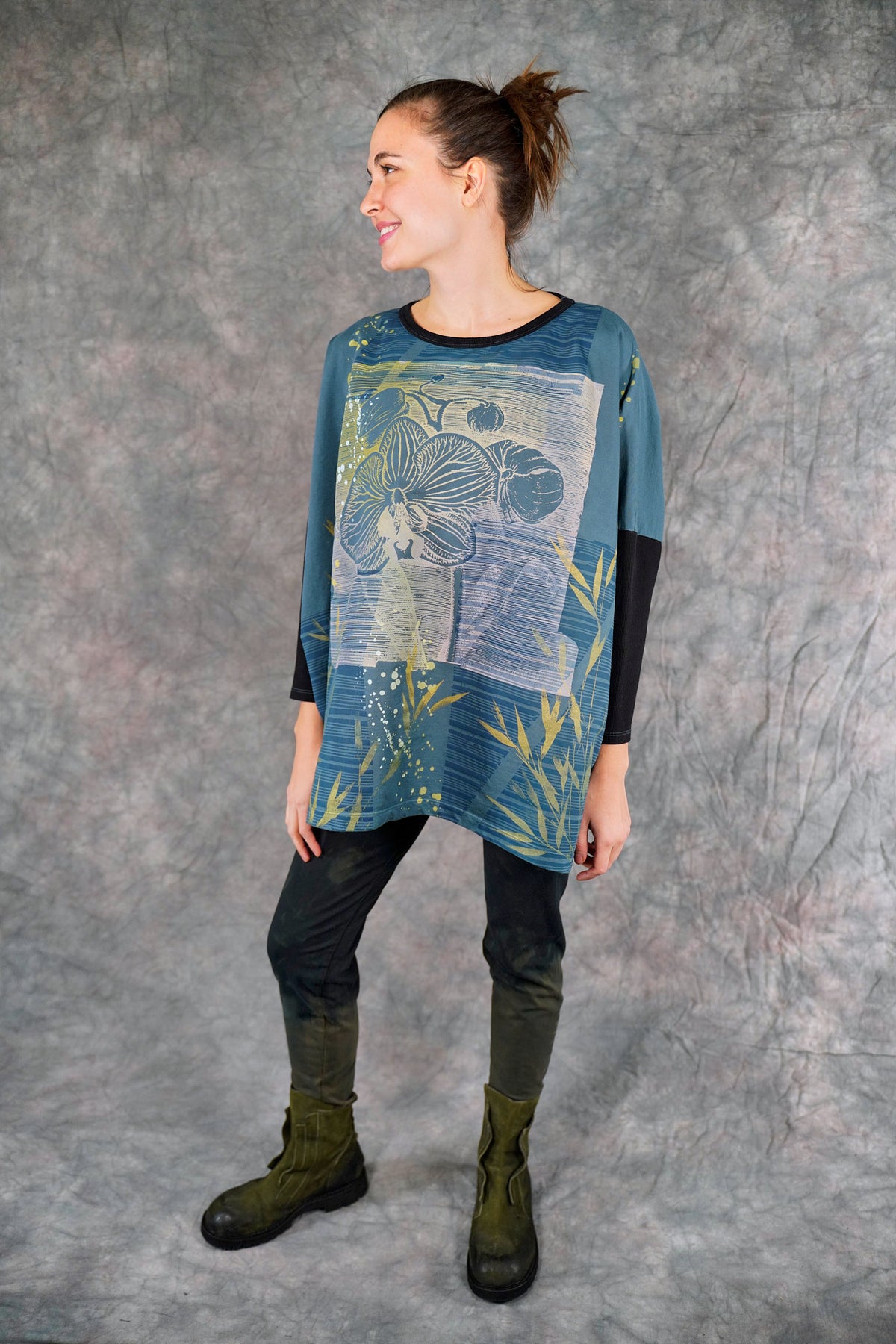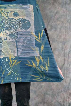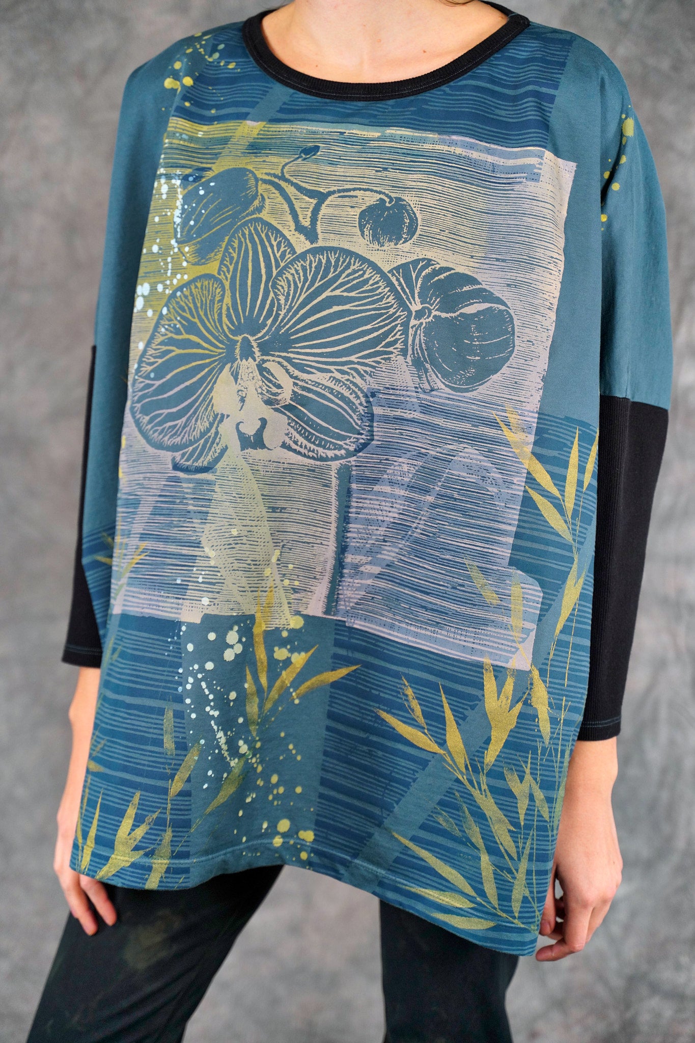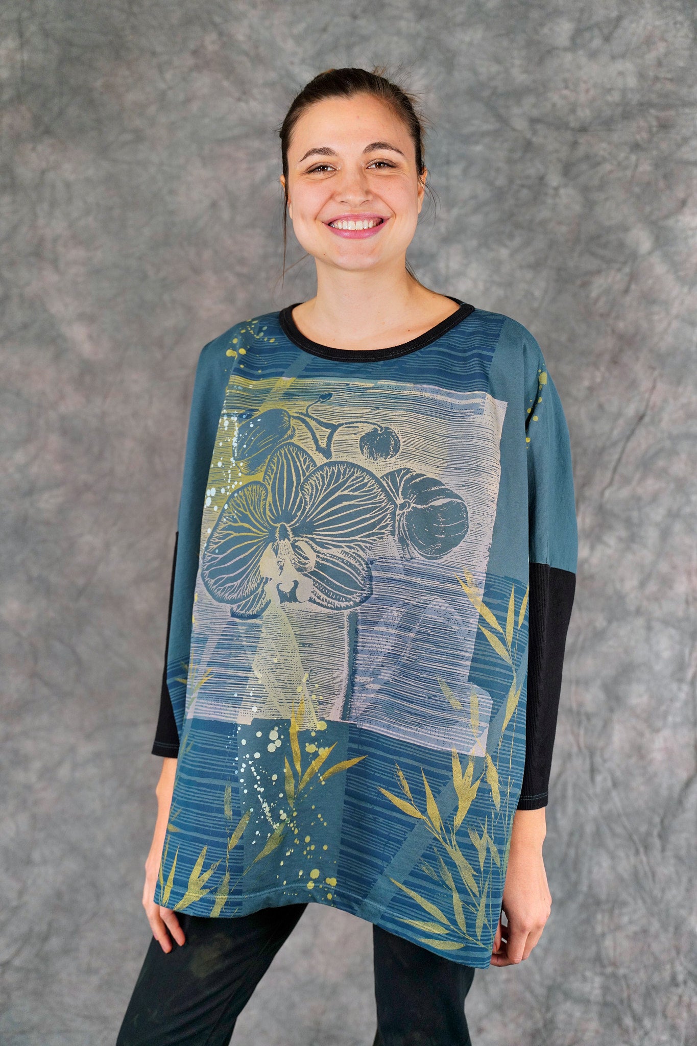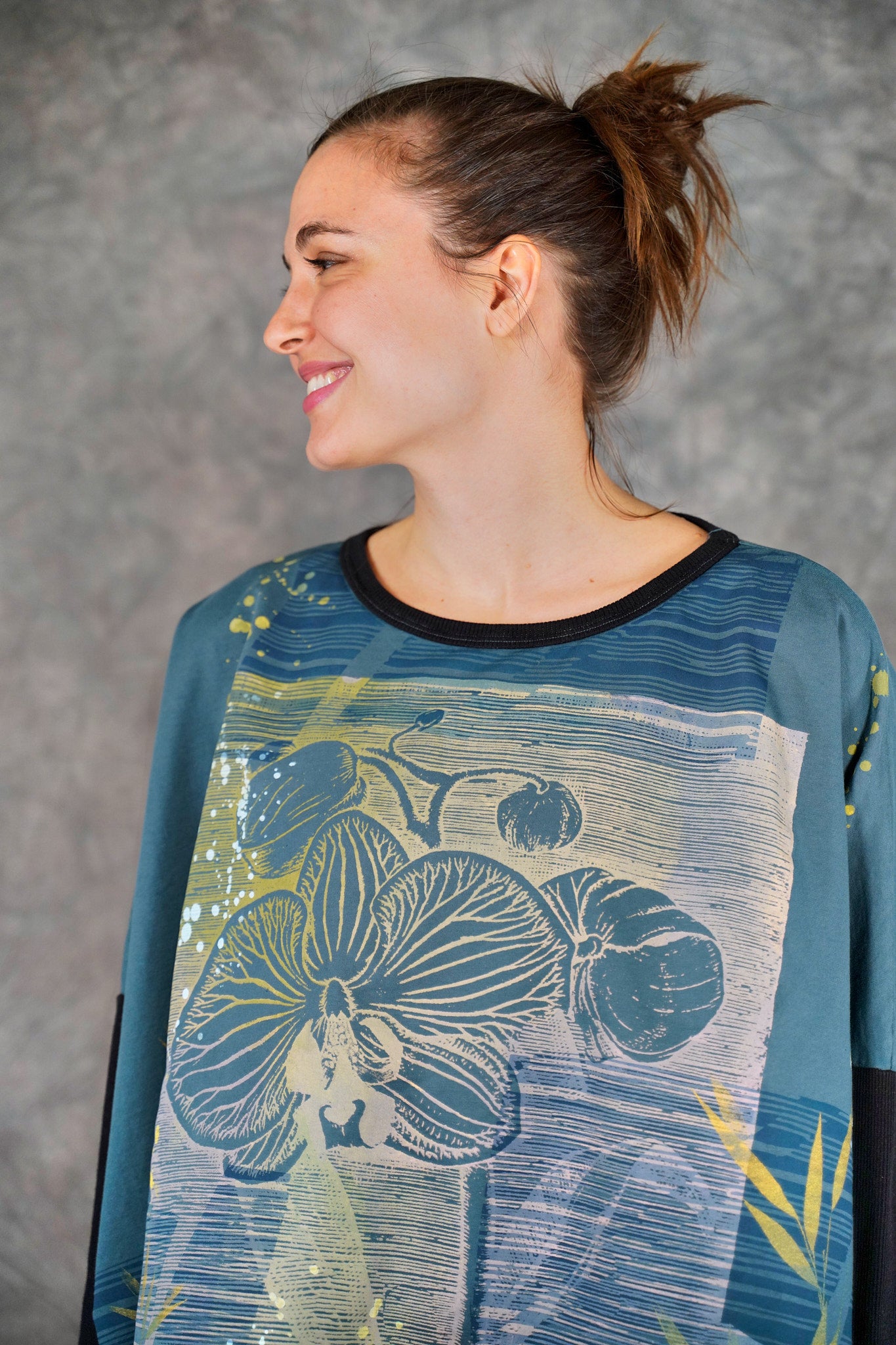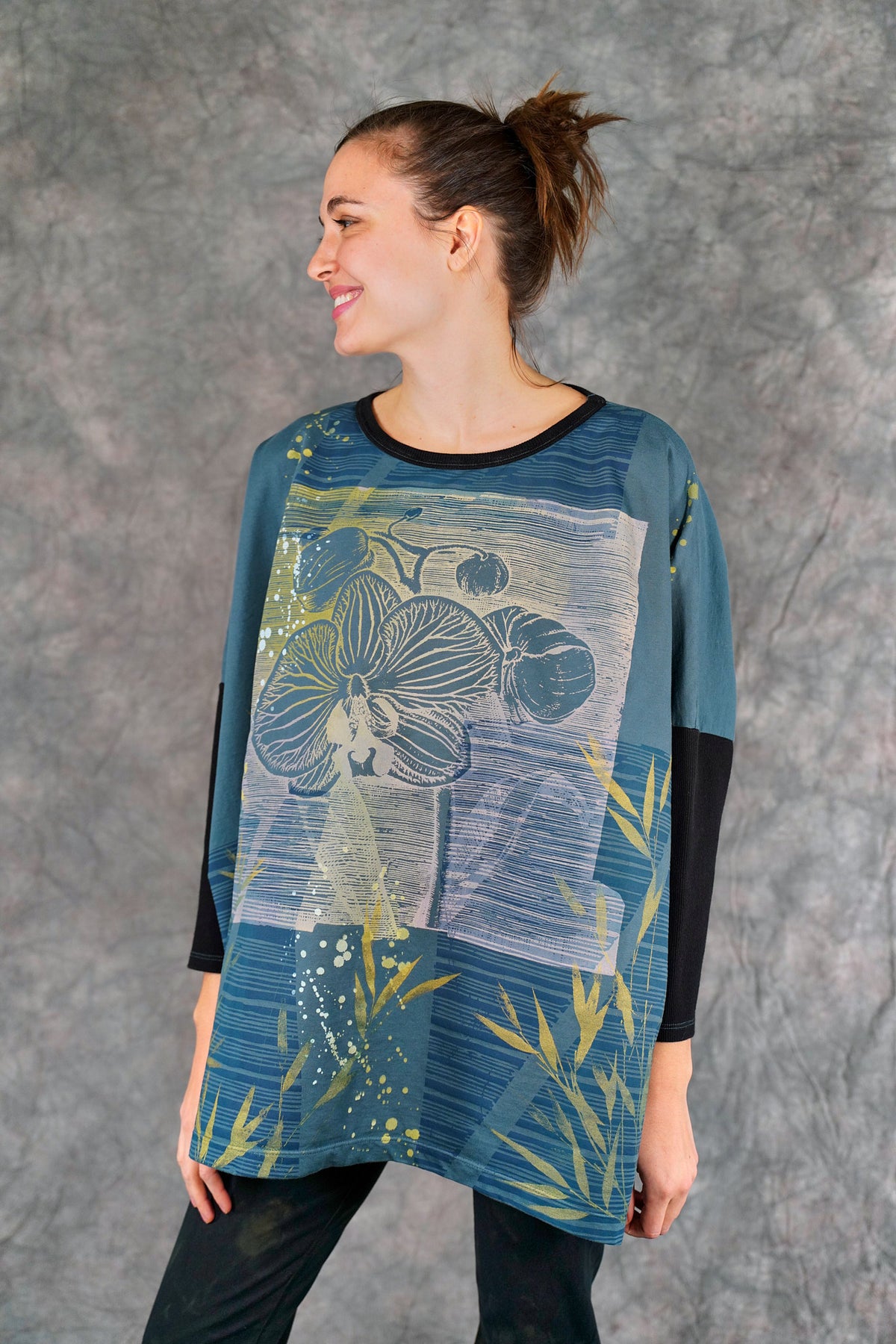 A transitional weight organic french terry cotton in a ONE SIZE boxy square cut can be layered easily or worn alone. Whimsical, finely detailed orchidea print in soft, vintage tones.