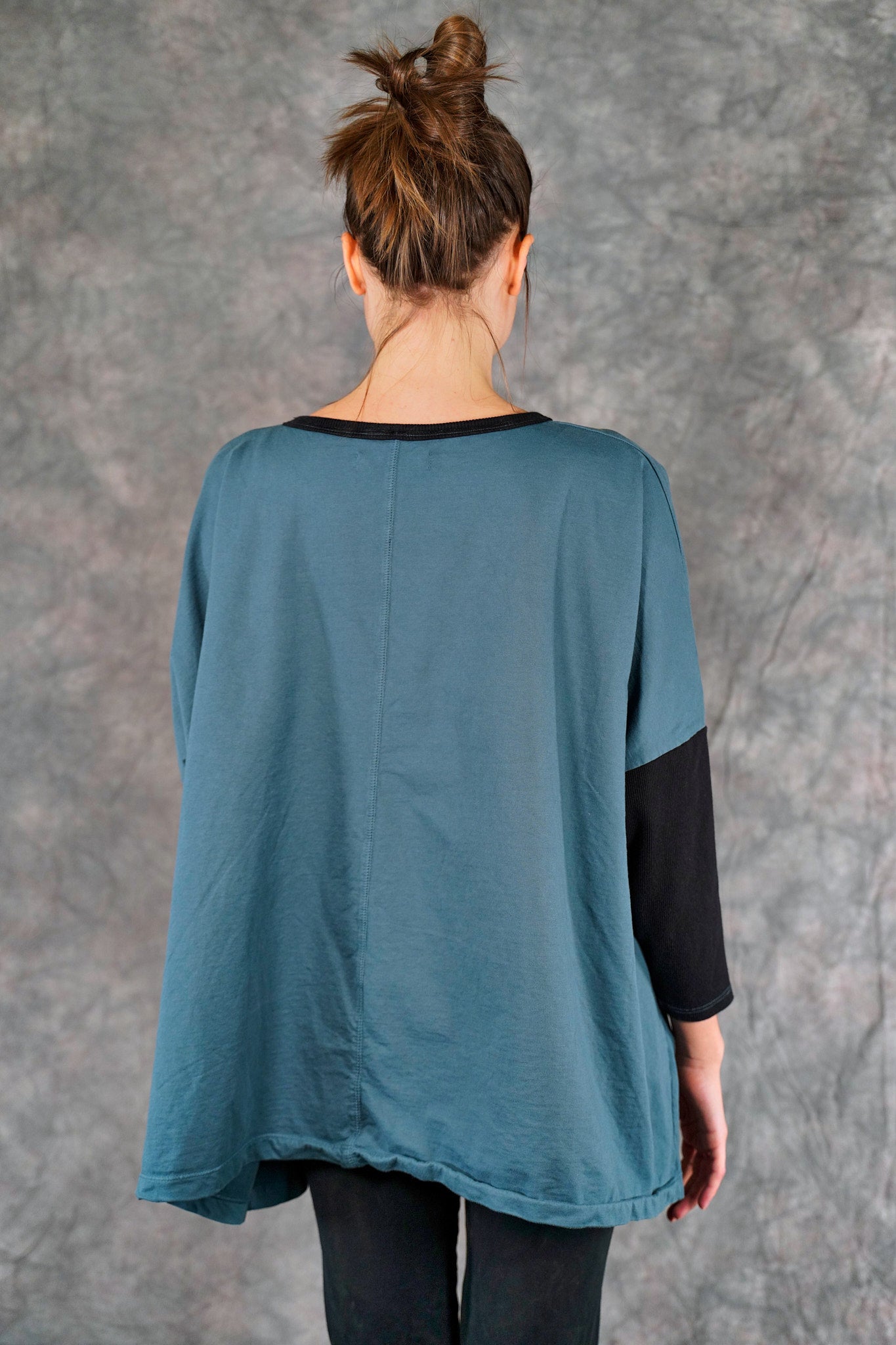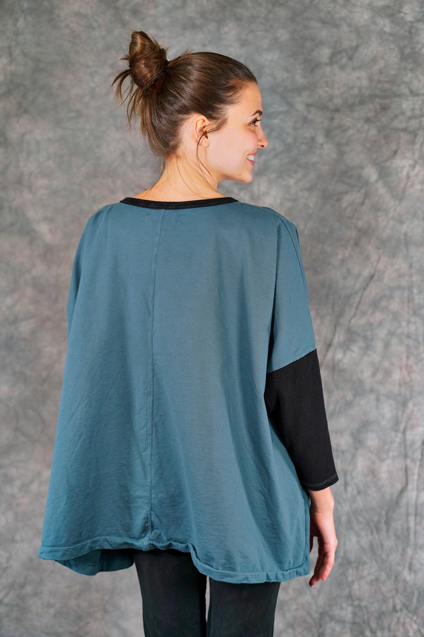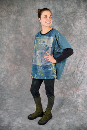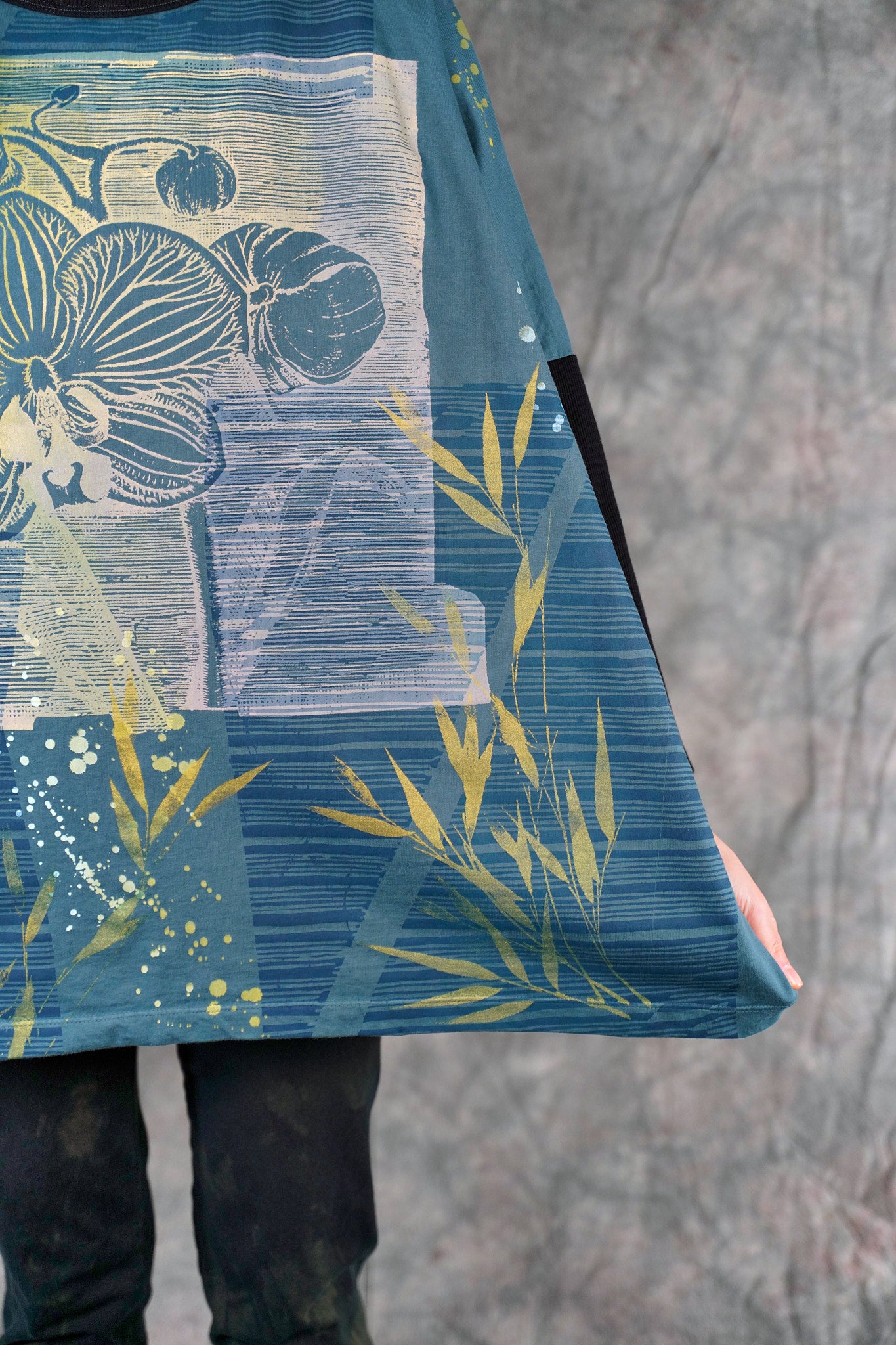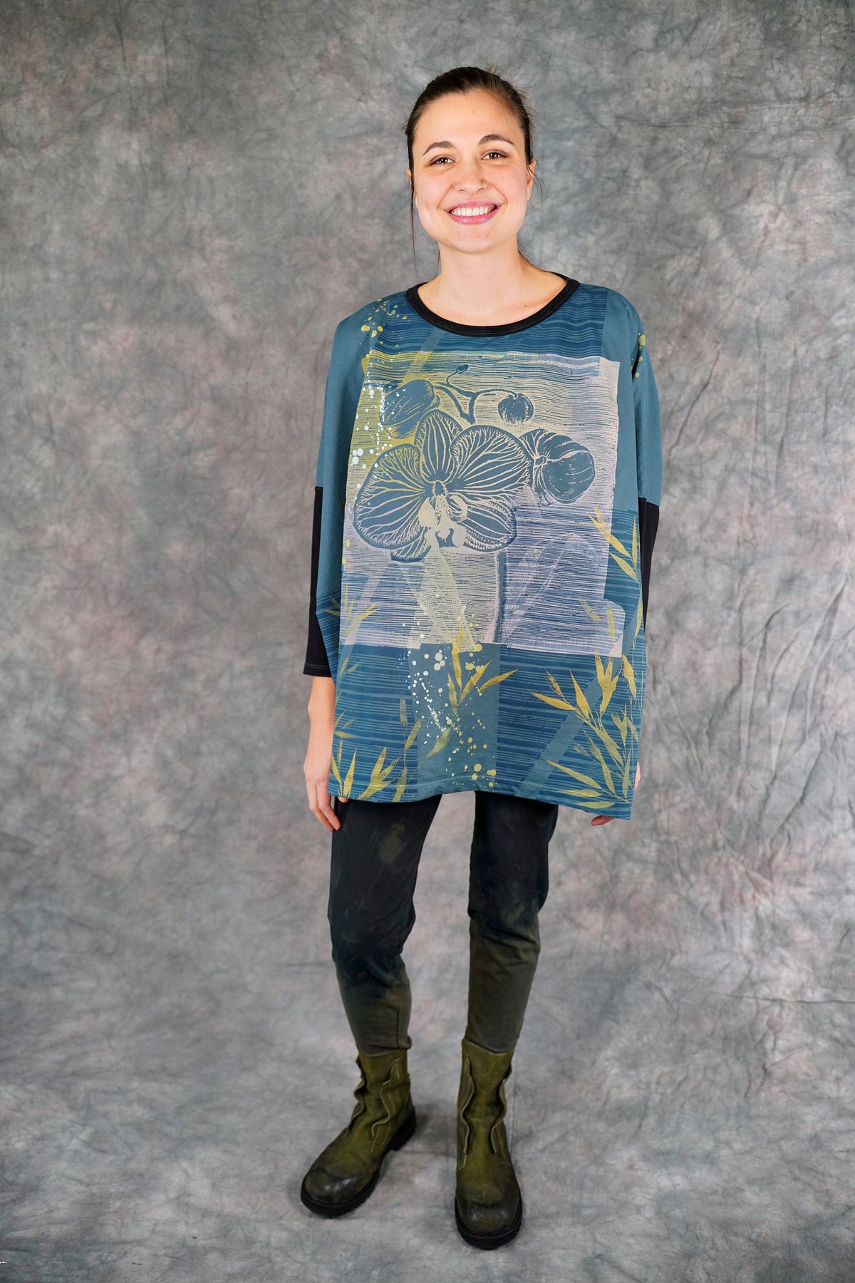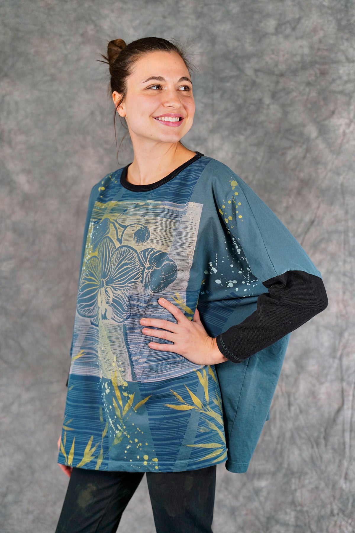 A transitional weight organic french terry cotton in a ONE SIZE boxy square cut can be layered easily or worn alone. Whimsical, finely detailed orchidea print in soft, vintage tones.