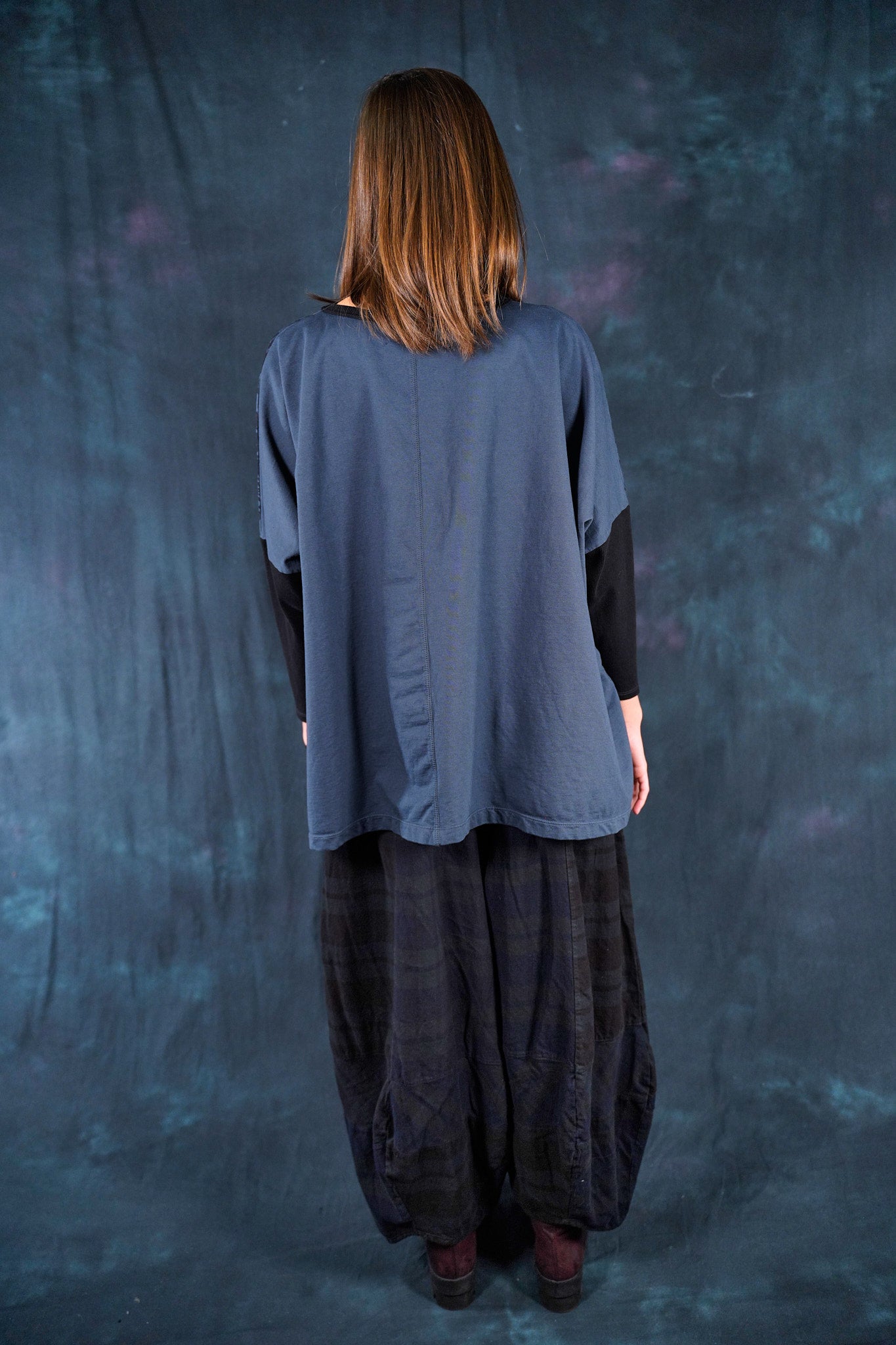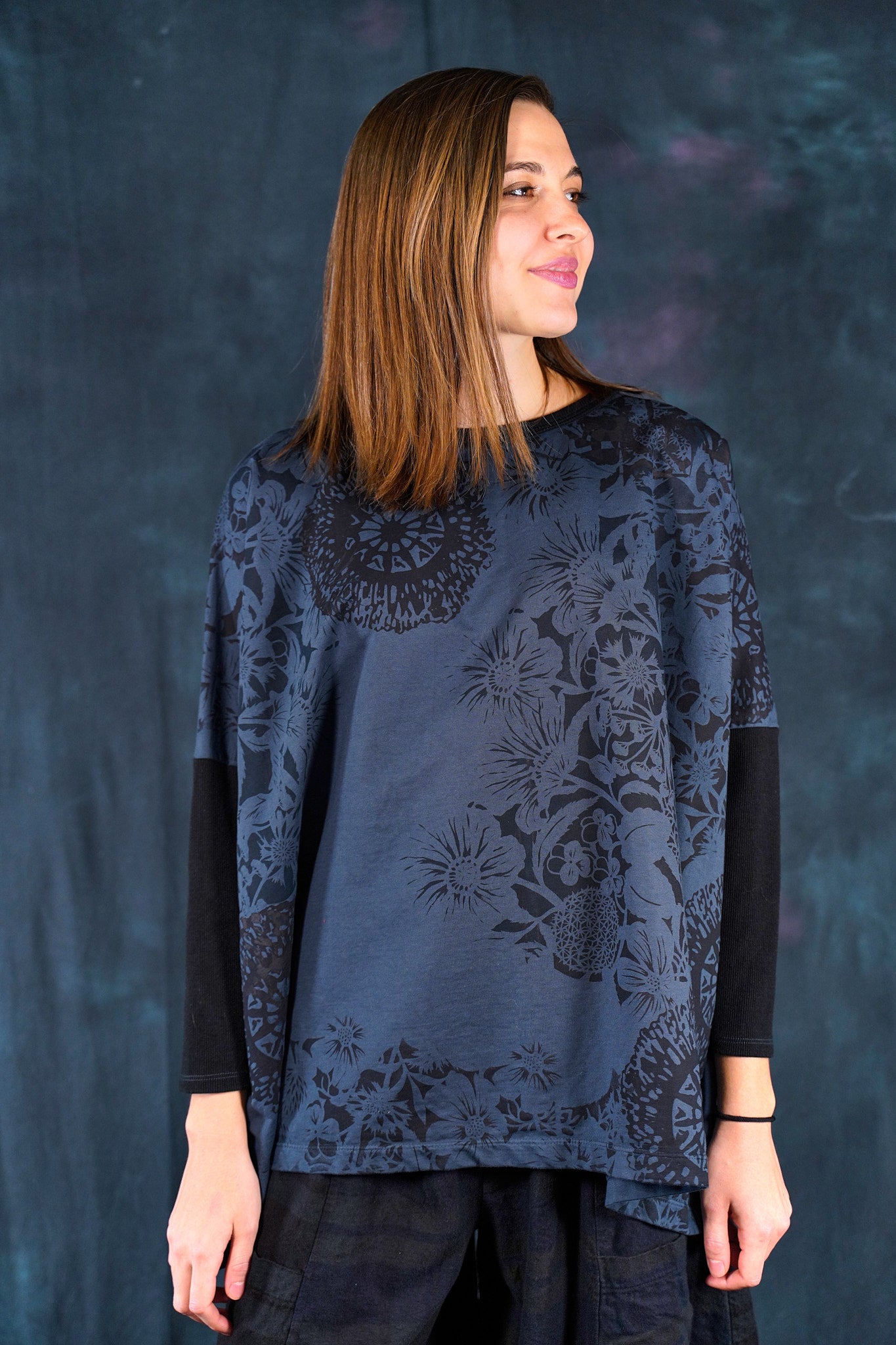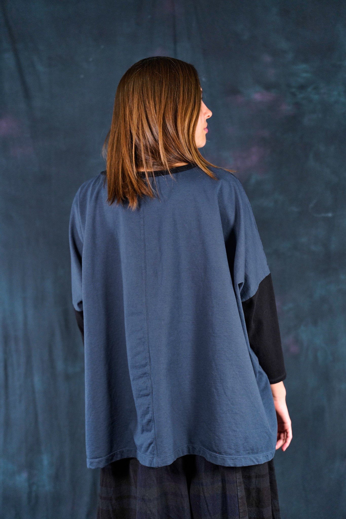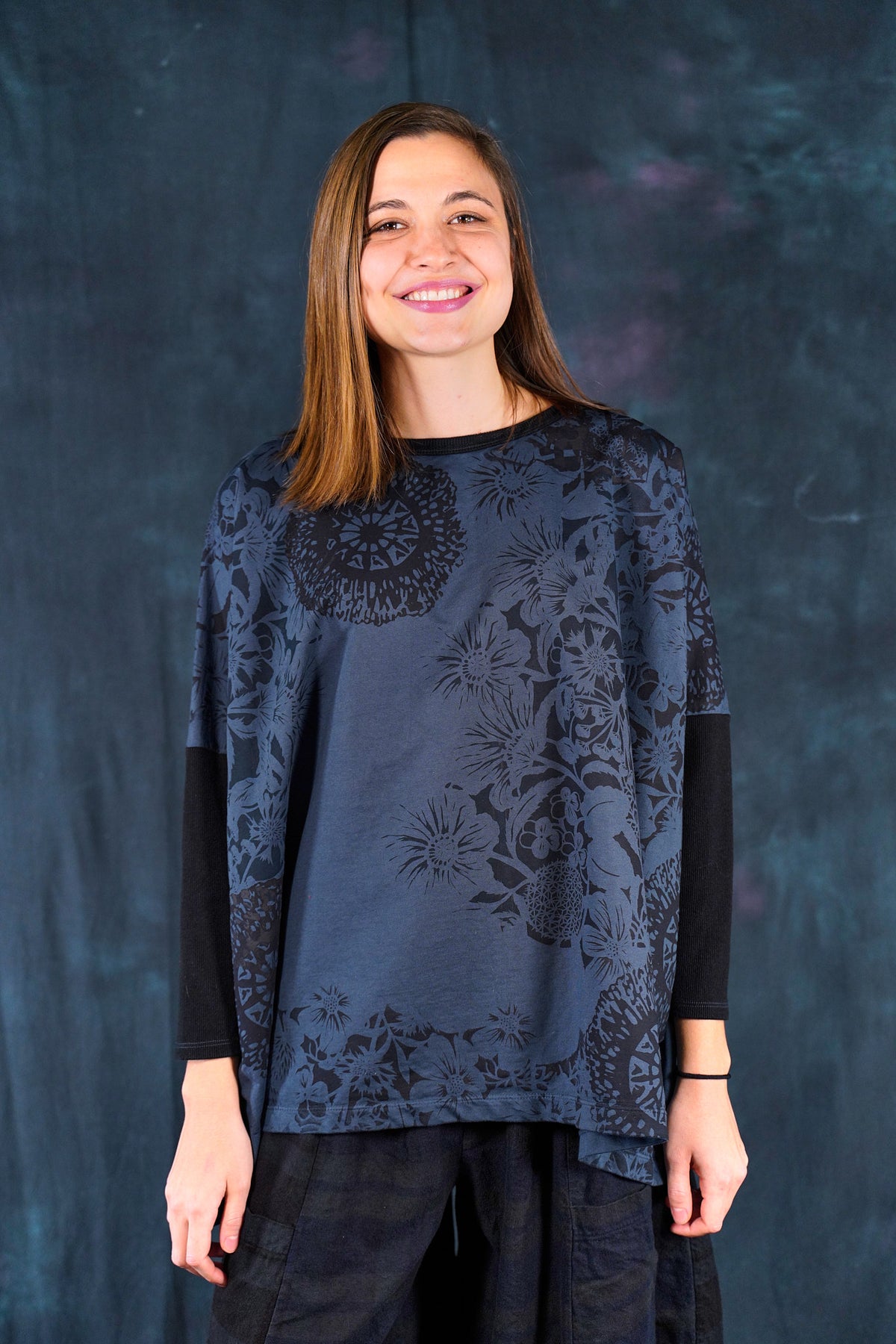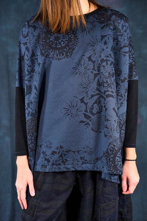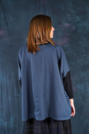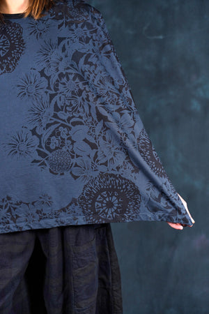 Ink blue color blocked with simpler black patterned botanical printing for maximum mix & match-ability. Organic weighty french terry cotton in a ONE SIZE boxy square cut layers over, or can be worn alone. Slimmer arms color-blocked in black.