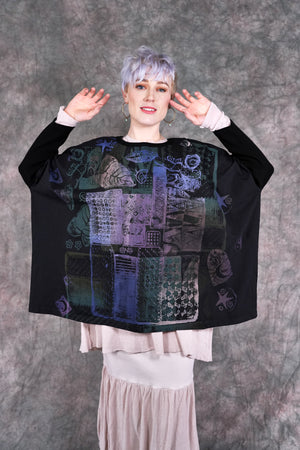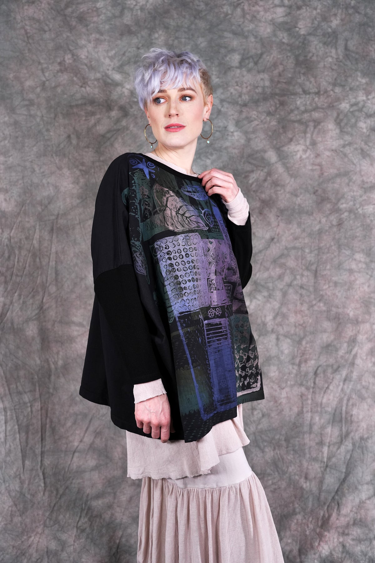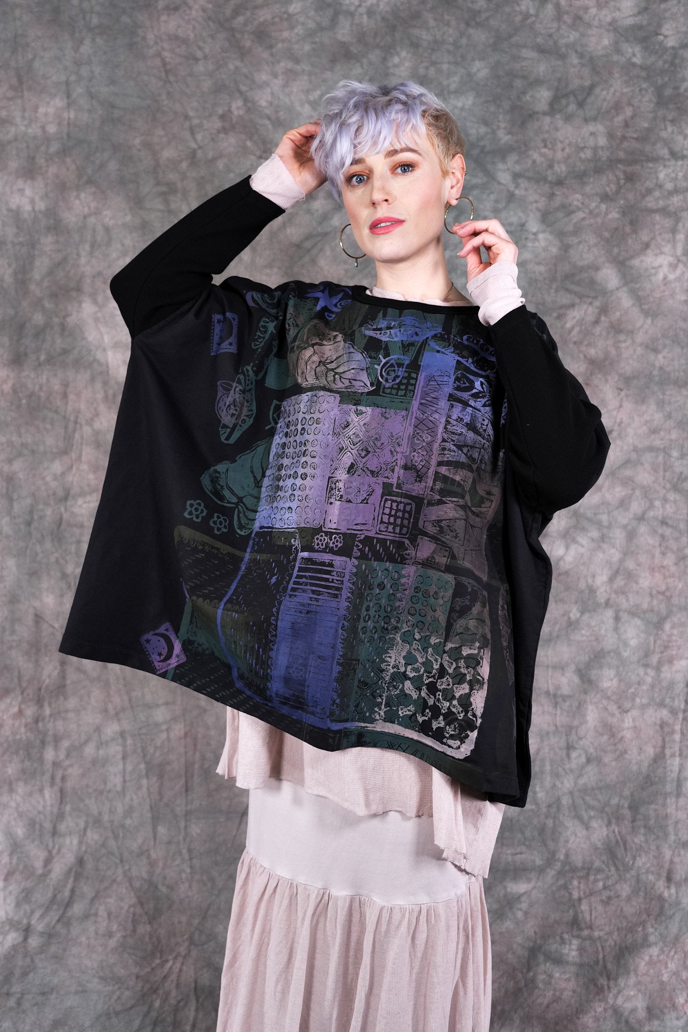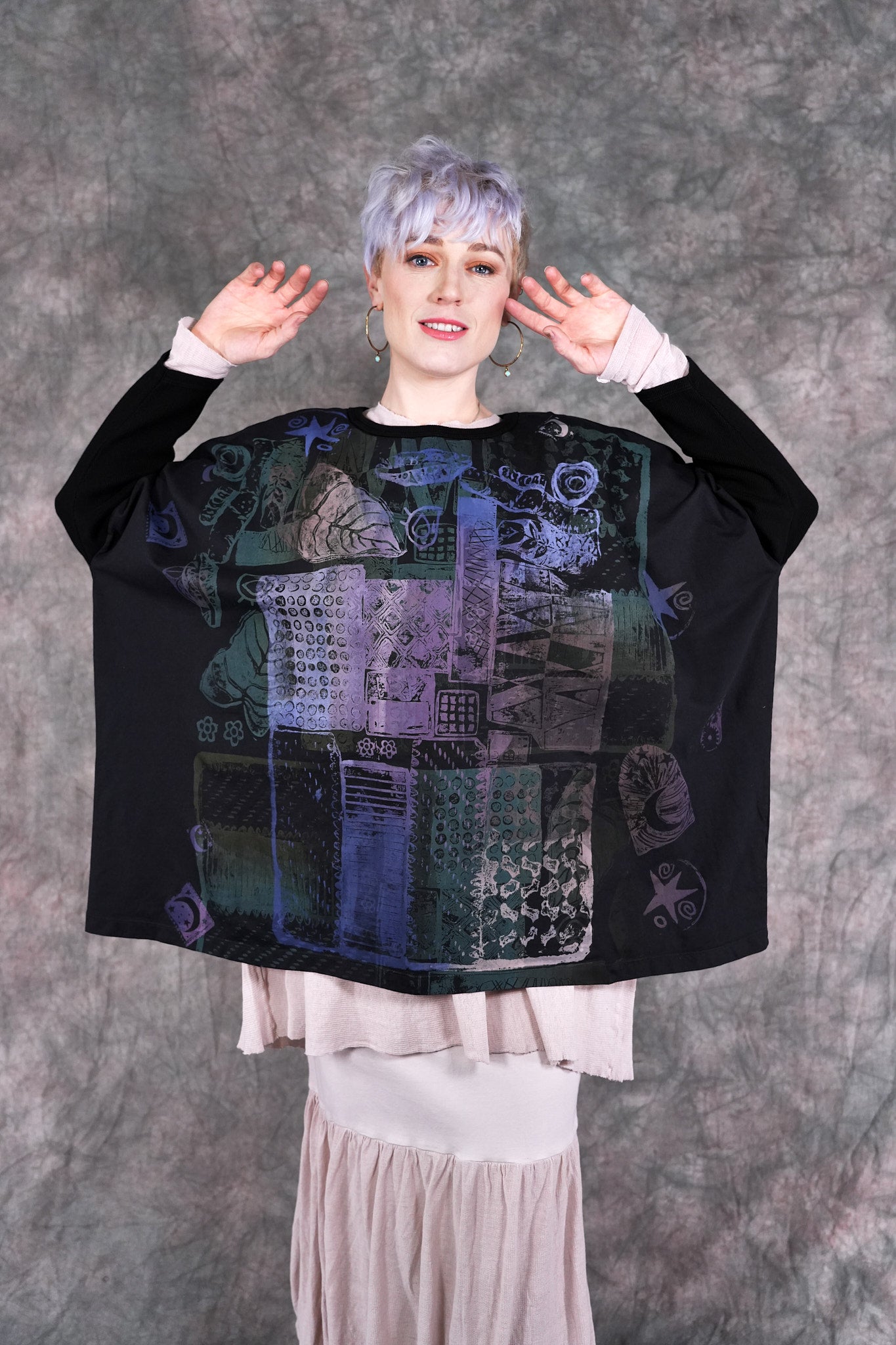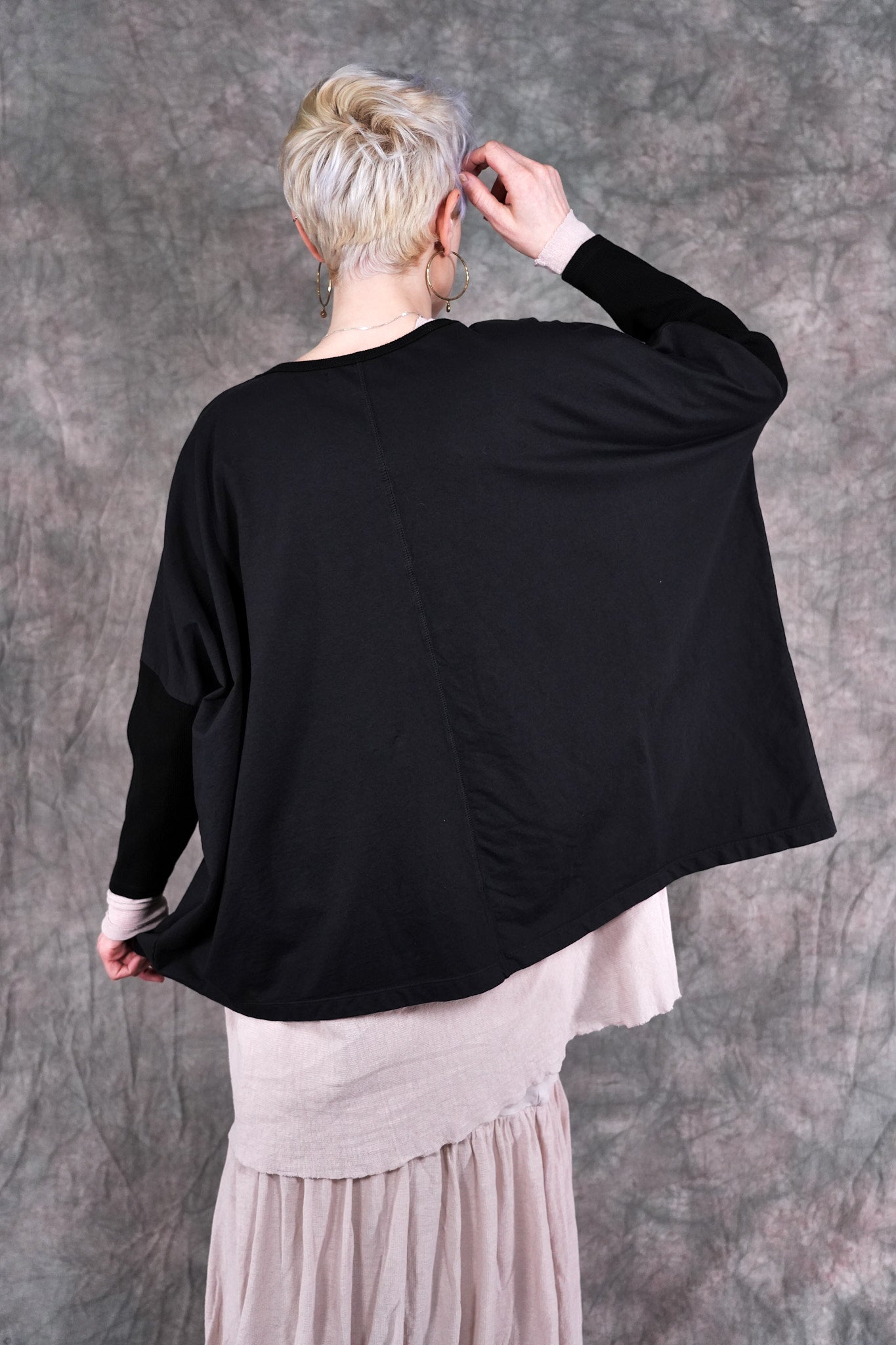 A transitional weight organic french terry cotton in a ONE SIZE boxy square cut can be layered easily or worn alone. In black; perfect for any time of the year.