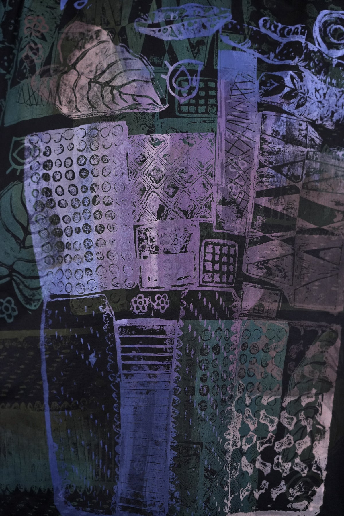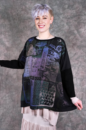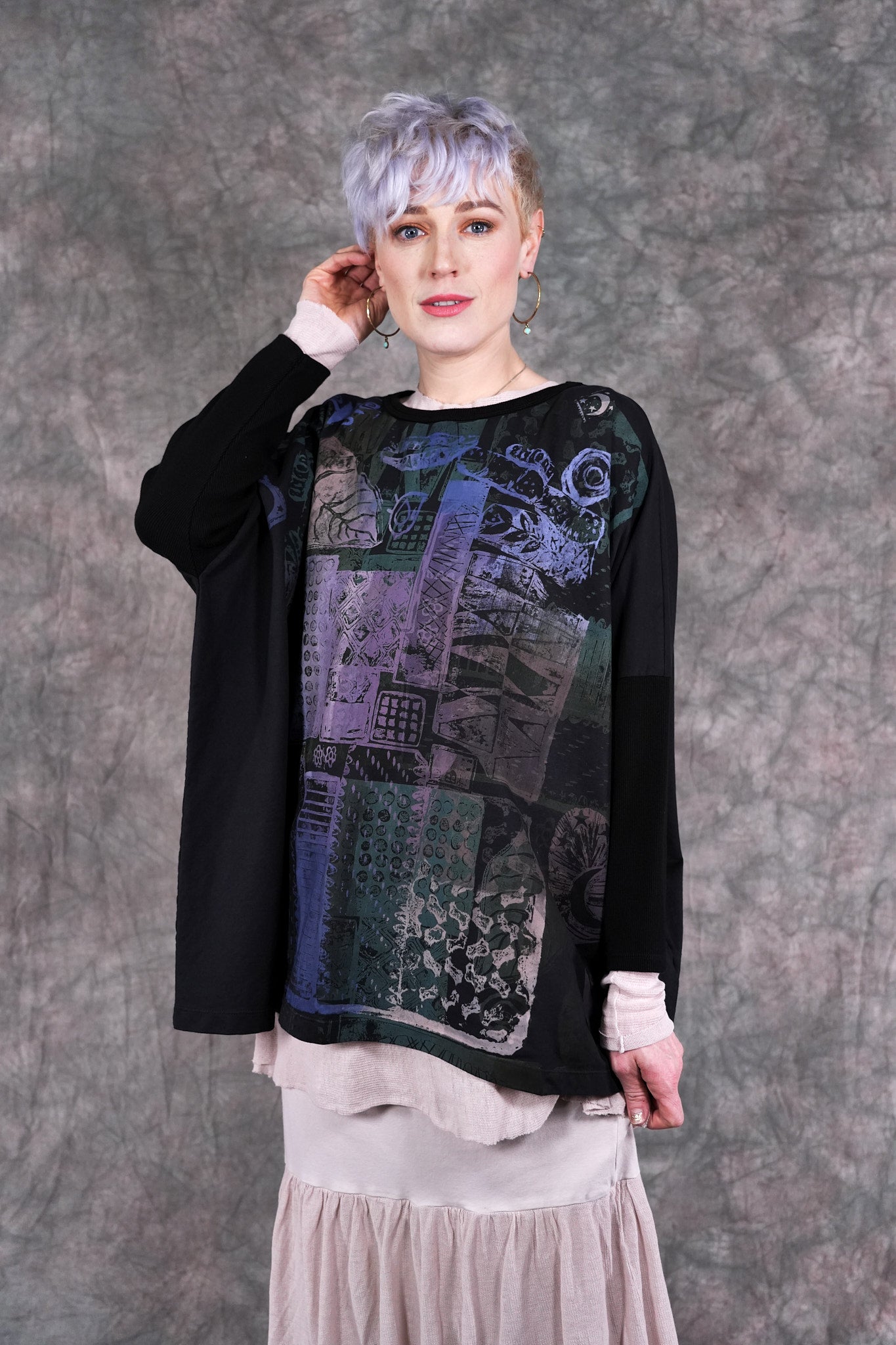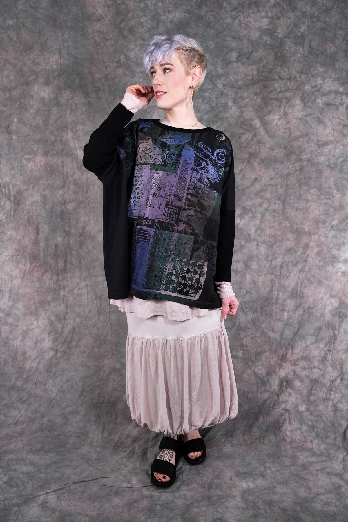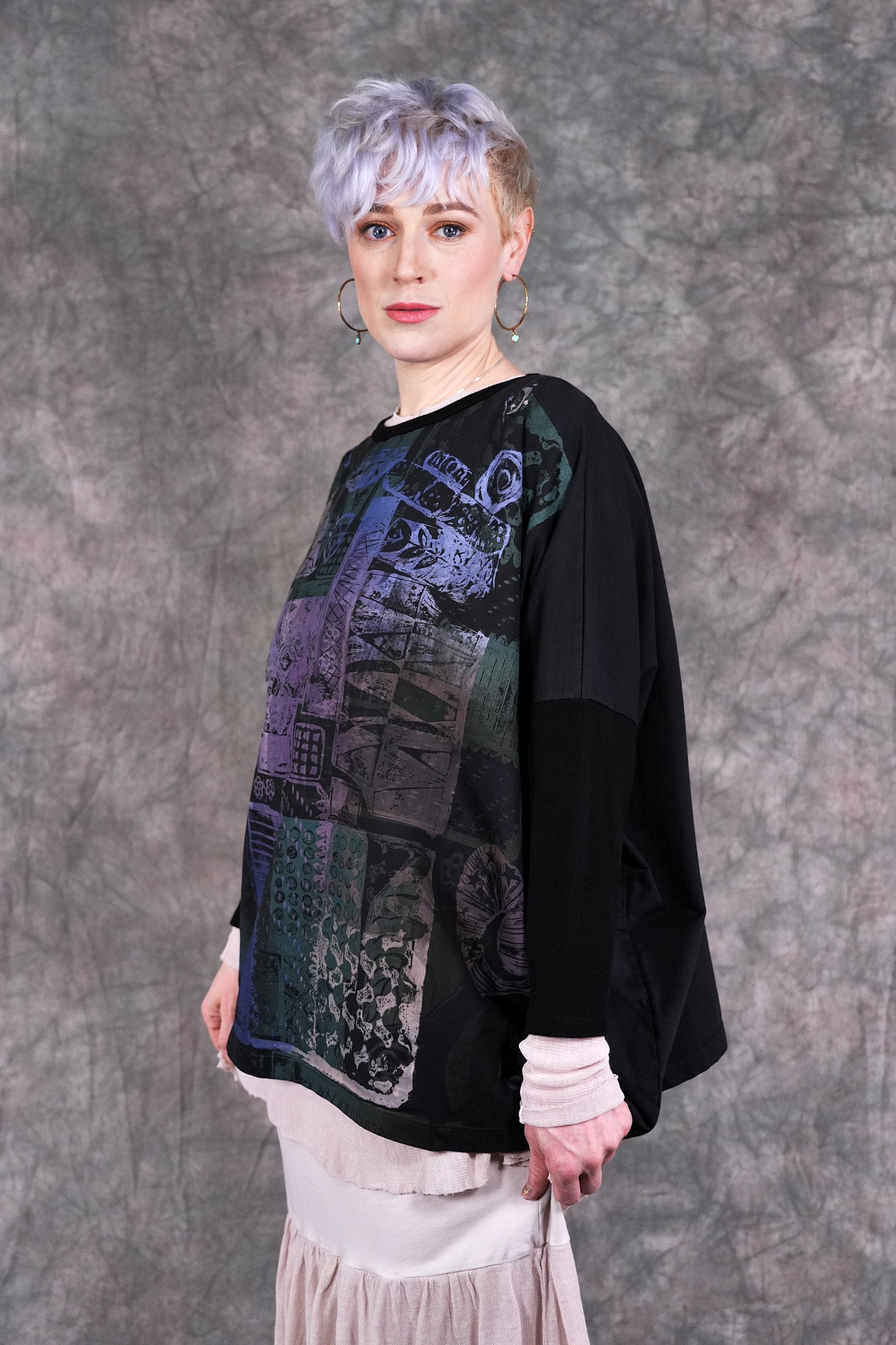 A transitional weight organic french terry cotton in a ONE SIZE boxy square cut can be layered easily or worn alone. In black; perfect for any time of the year.