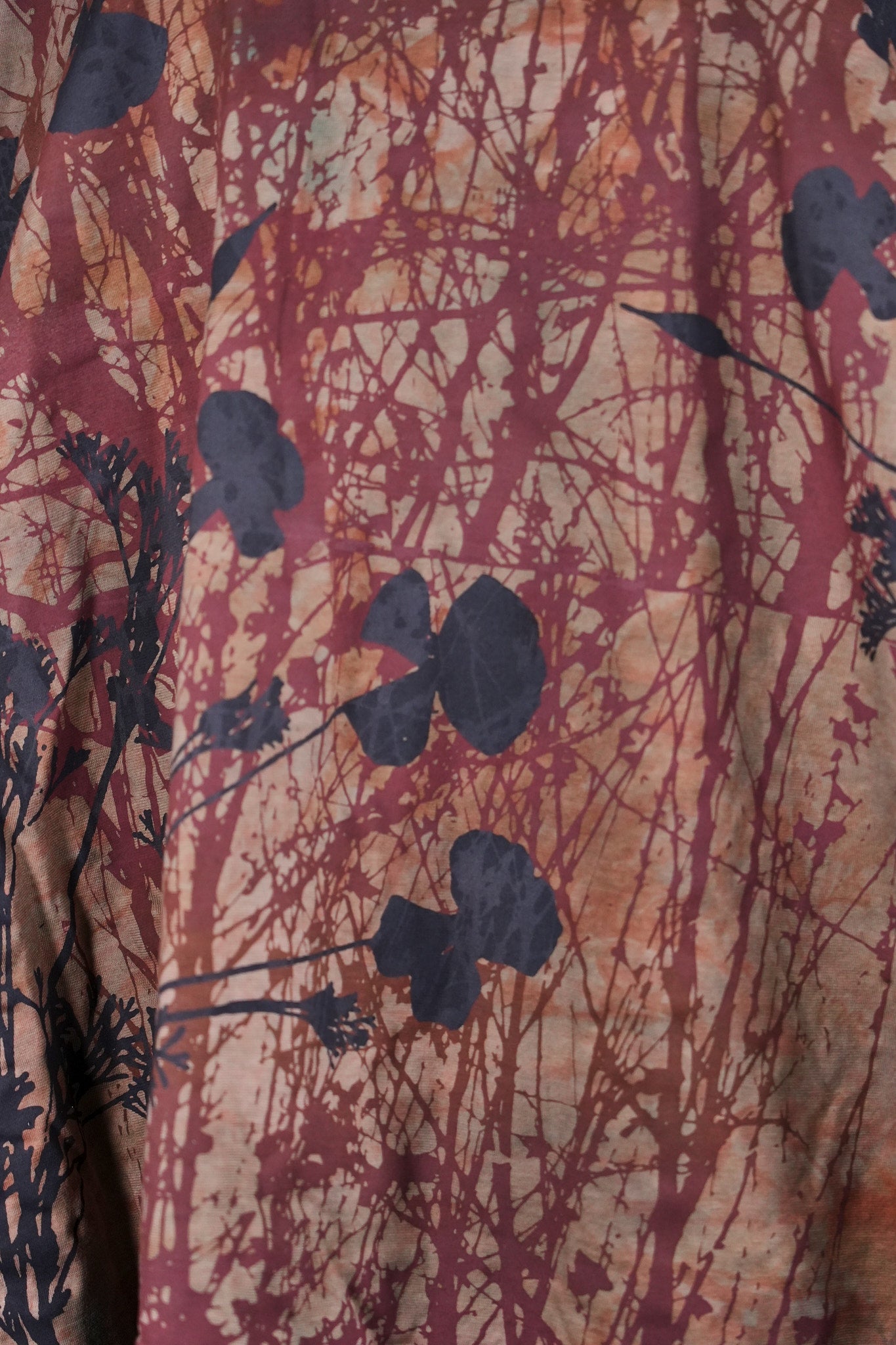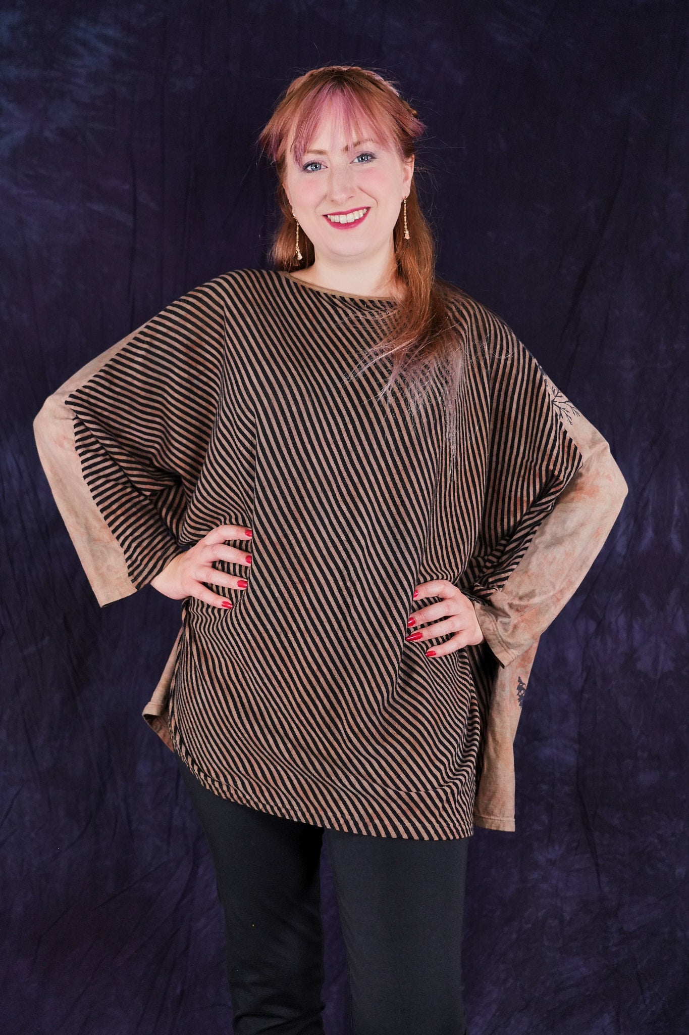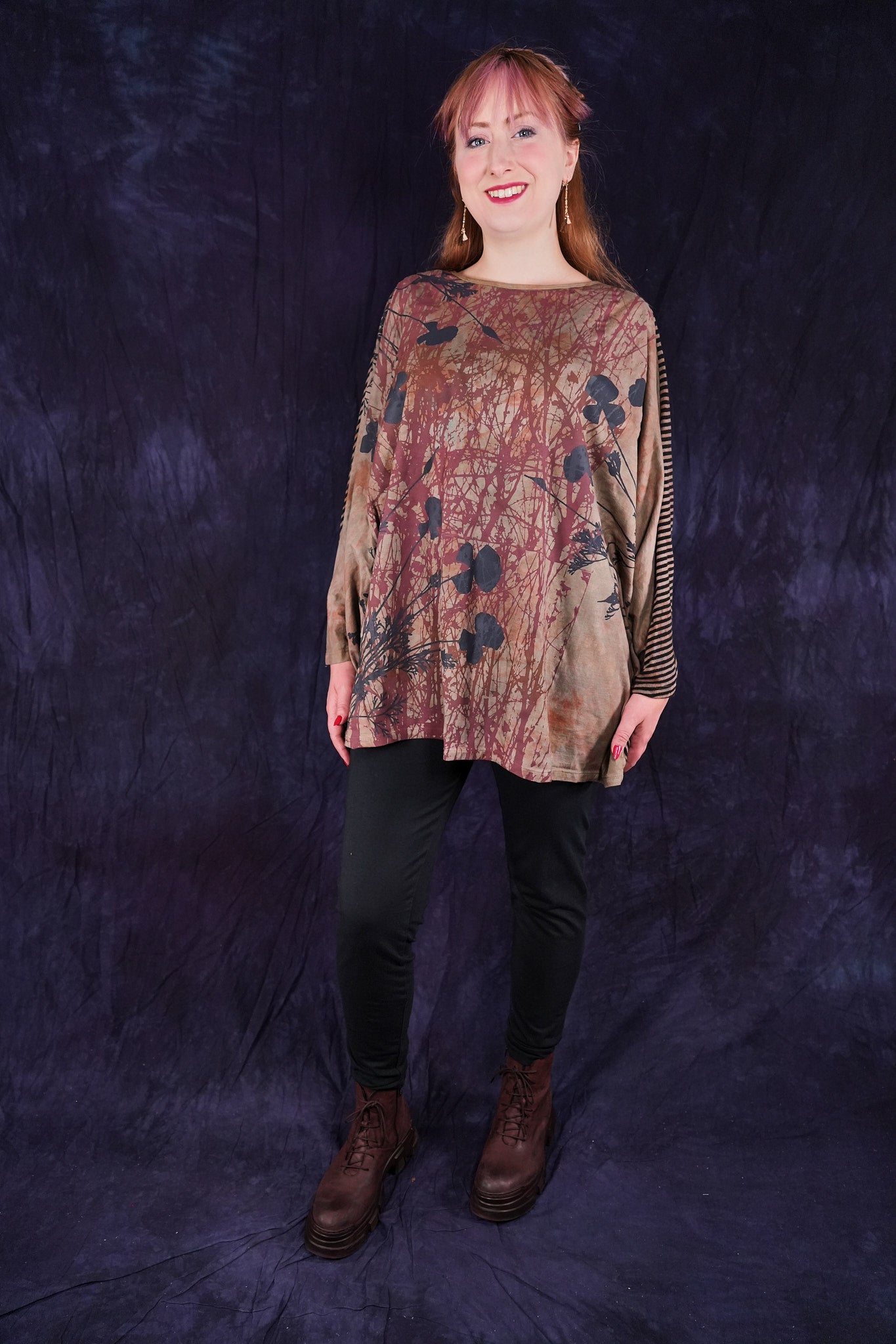 WEAR it FORWARD or BACKWARD. Hand Dyed boxy square top, dual sided/ different fabrics front and back. Organic cotton side is hand printed, the other side is a very lightweight striped cotton sweater knit. WE LOVE IT OVER THE STRIPED SLIM LAYER TOPS and worn over the #6204 Apron-Jumper as a light sweatshirt.