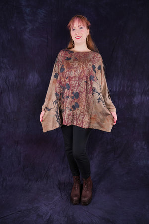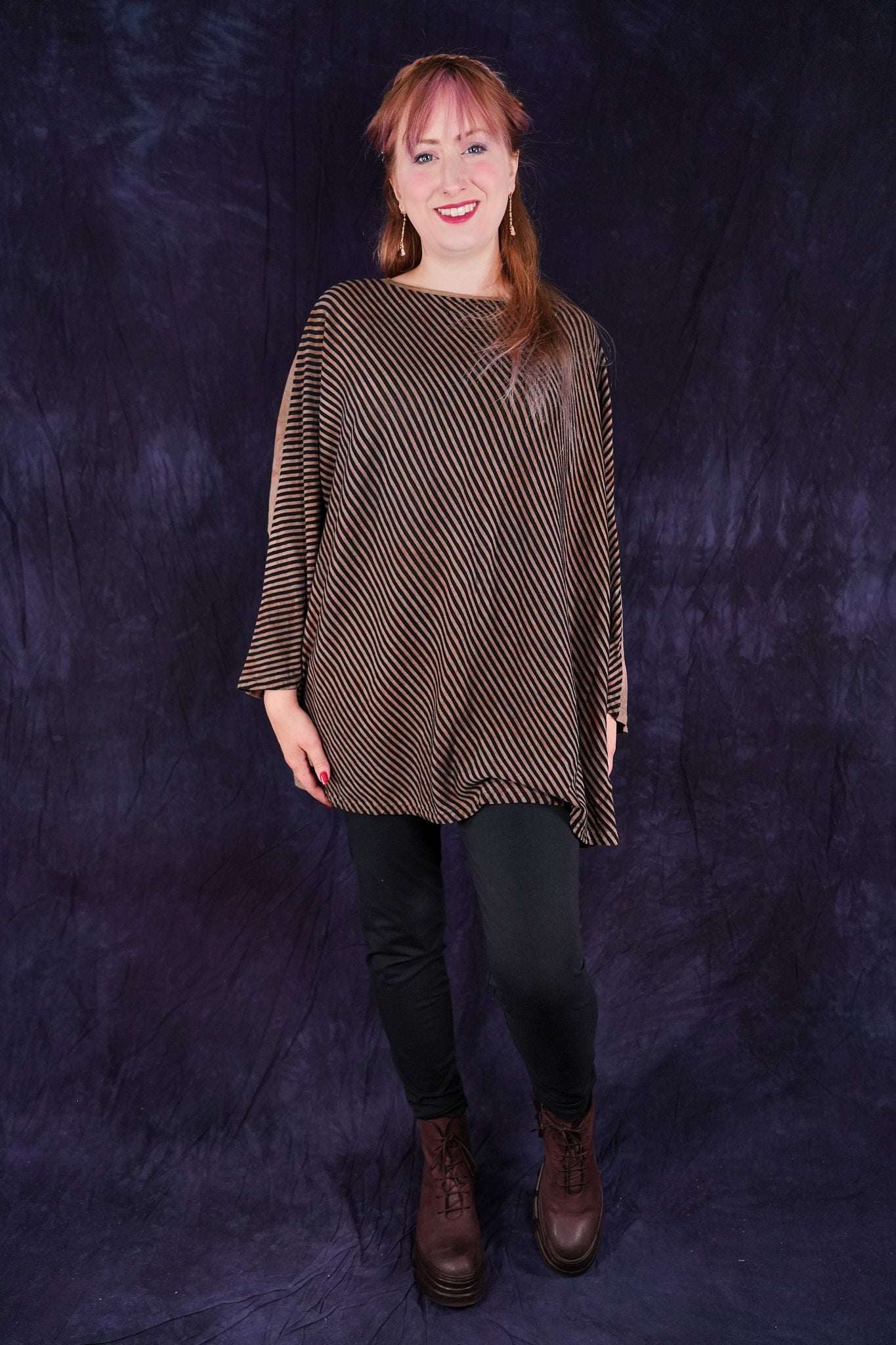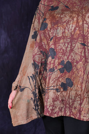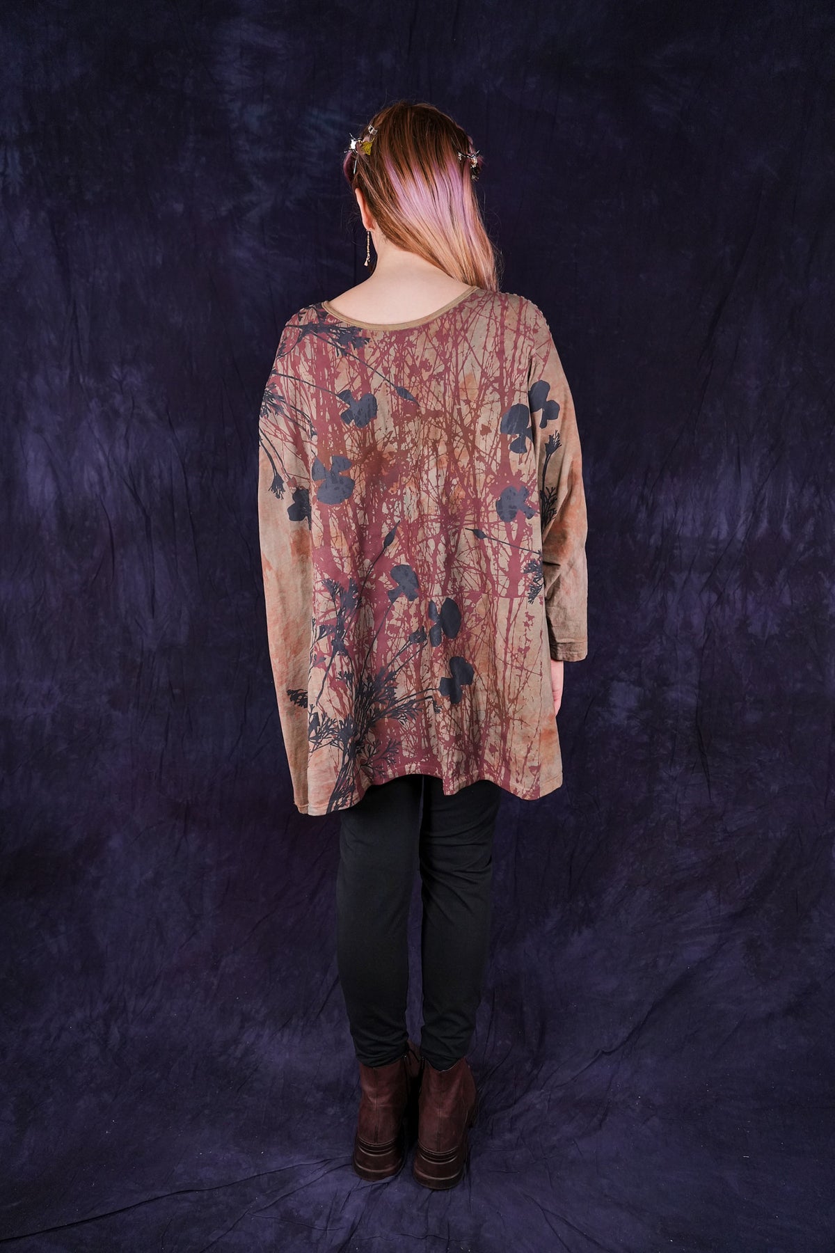 WEAR it FORWARD or BACKWARD. Hand Dyed boxy square top, dual sided/ different fabrics front and back. Organic cotton side is hand printed, the other side is a very lightweight striped cotton sweater knit. WE LOVE IT OVER THE STRIPED SLIM LAYER TOPS and worn over the #6204 Apron-Jumper as a light sweatshirt.