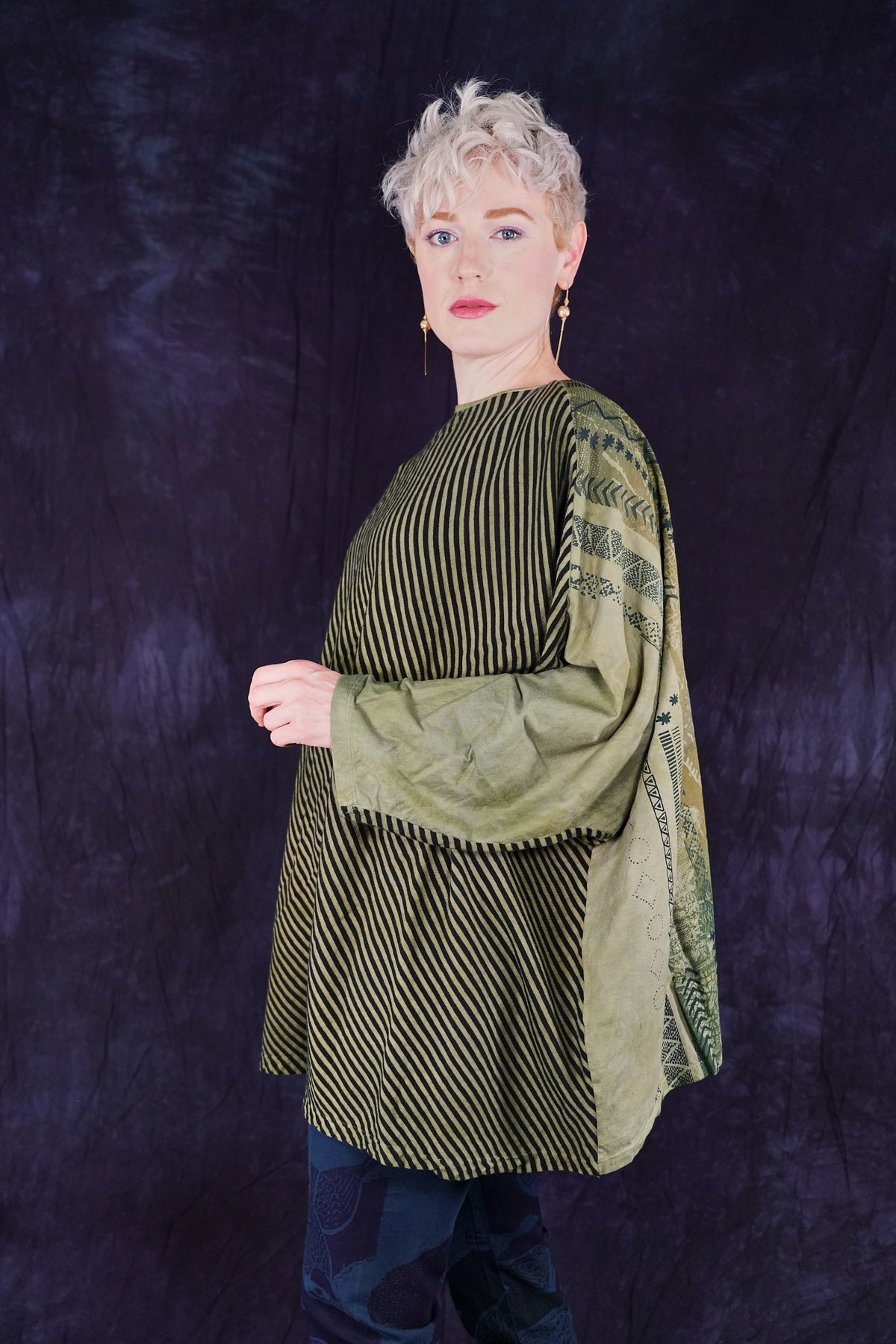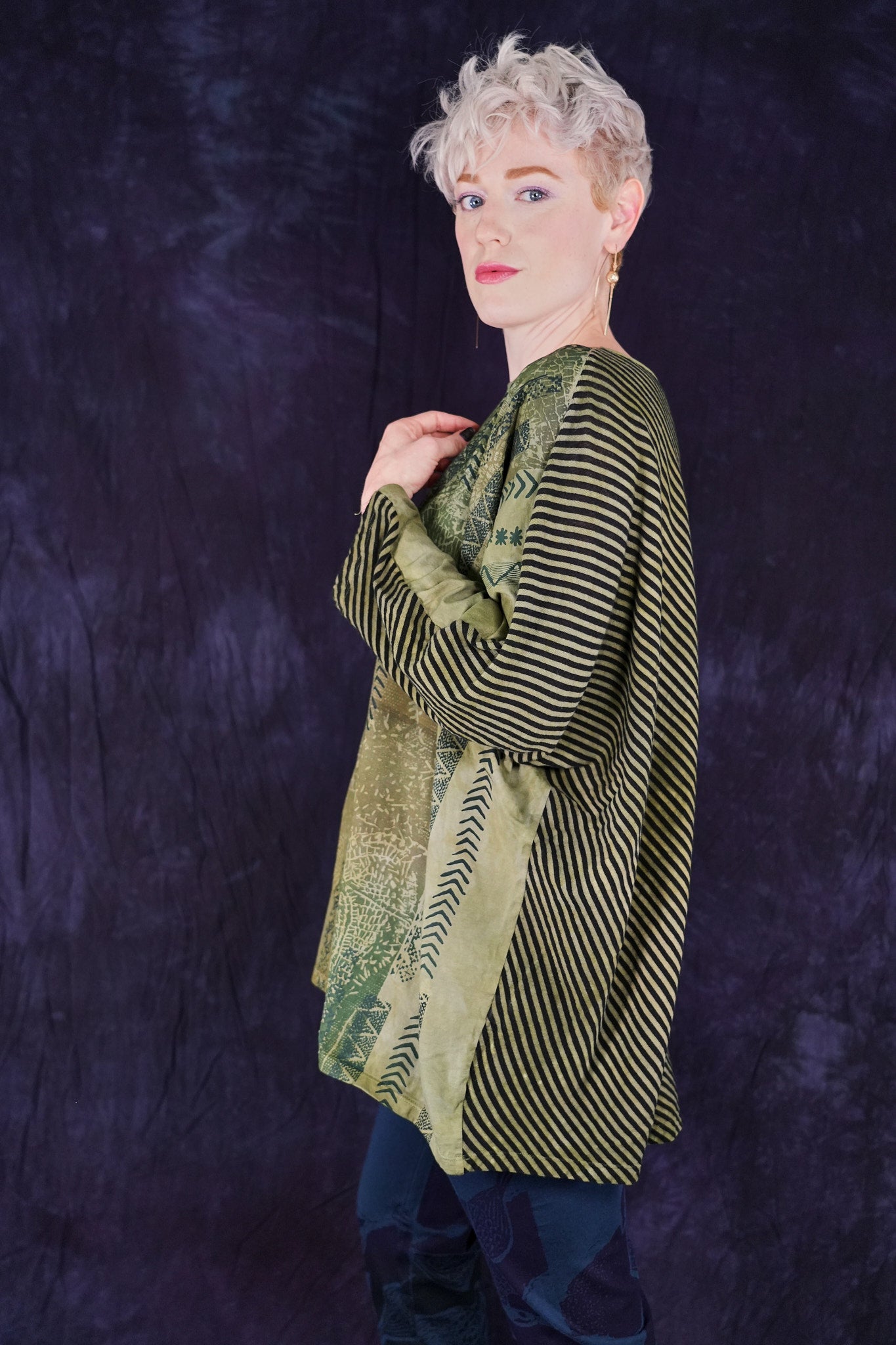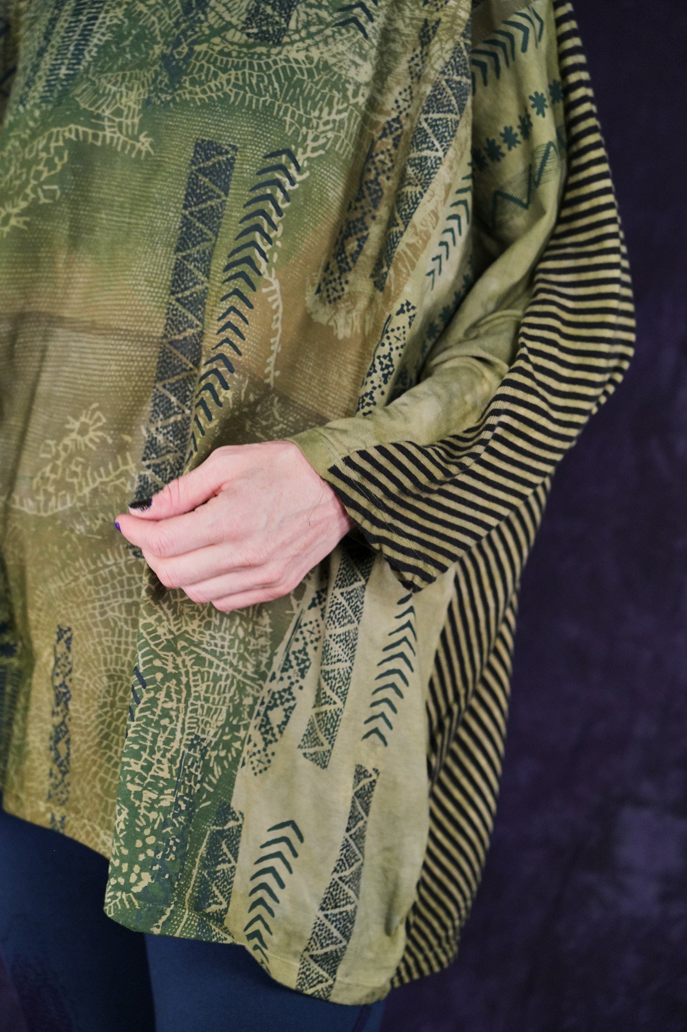 WEAR it FORWARD or BACKWARD. Hand Dyed boxy square top, dual sided/ different fabrics front and back. Organic cotton side is hand printed, the other side is a very lightweight striped cotton sweater knit. WE LOVE IT OVER THE STRIPED SLIM LAYER TOPS and worn over the #6204 Apron-Jumper as a light sweatshirt.