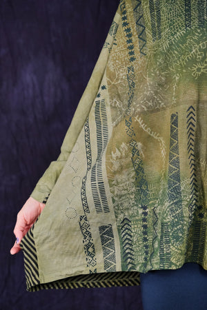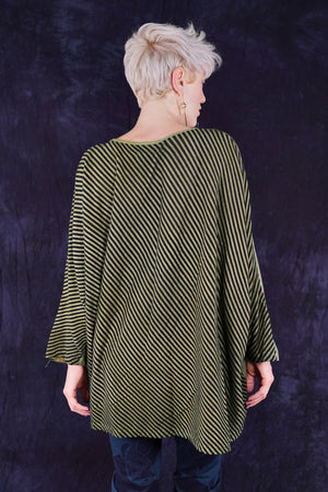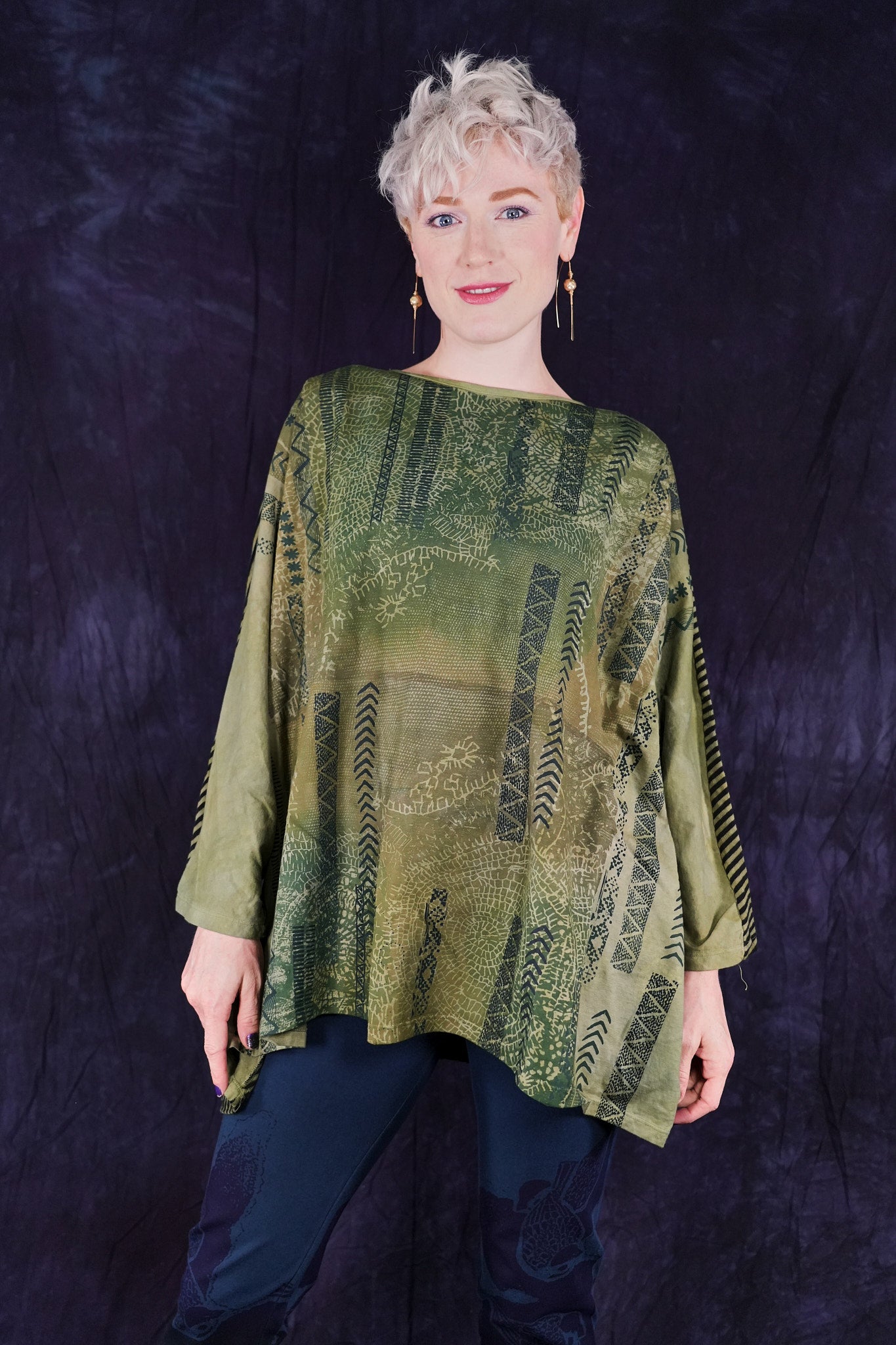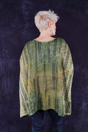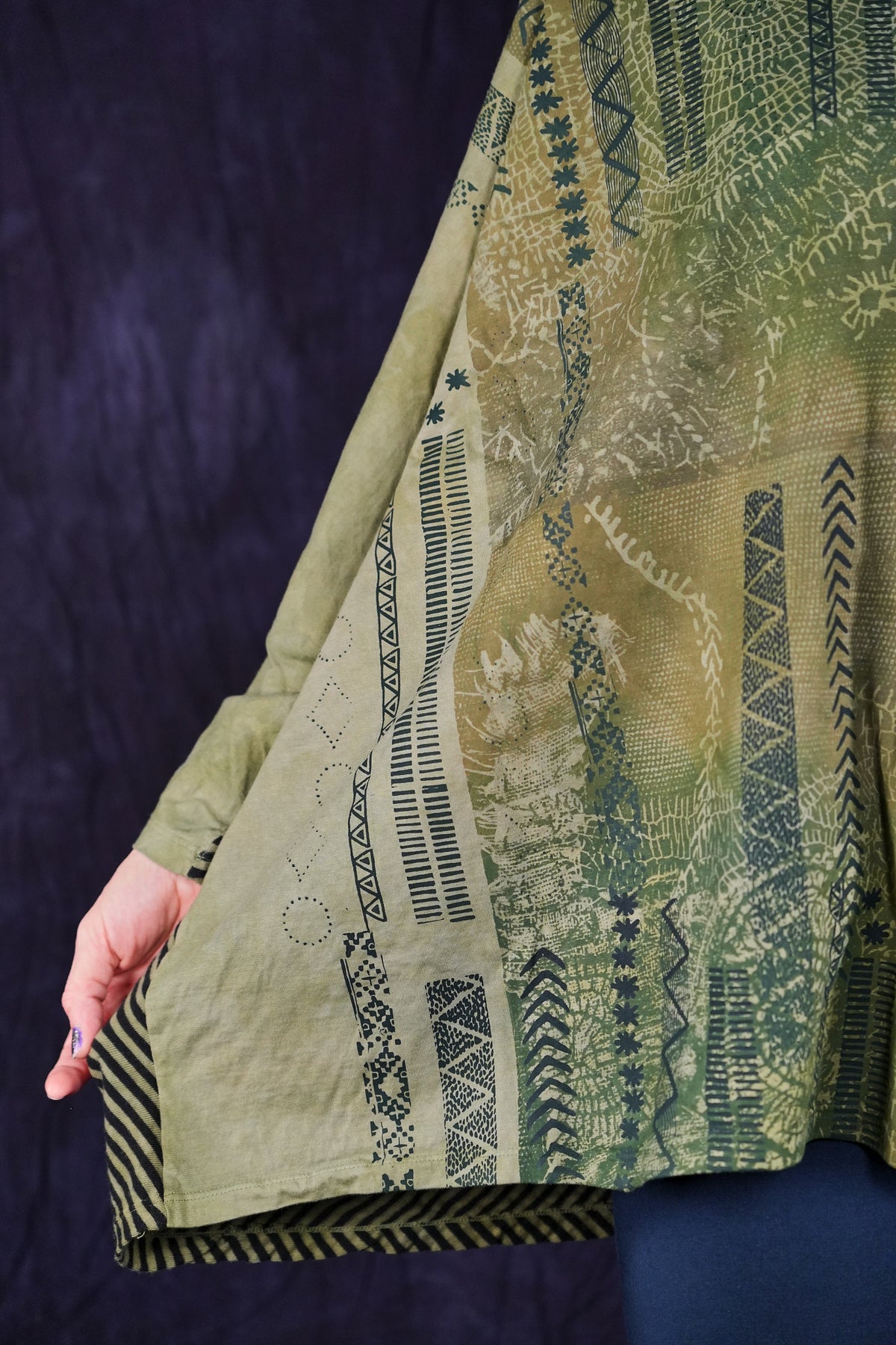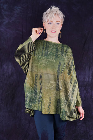 WEAR it FORWARD or BACKWARD. Hand Dyed boxy square top, dual sided/ different fabrics front and back. Organic cotton side is hand printed, the other side is a very lightweight striped cotton sweater knit. WE LOVE IT OVER THE STRIPED SLIM LAYER TOPS and worn over the #6204 Apron-Jumper as a light sweatshirt.