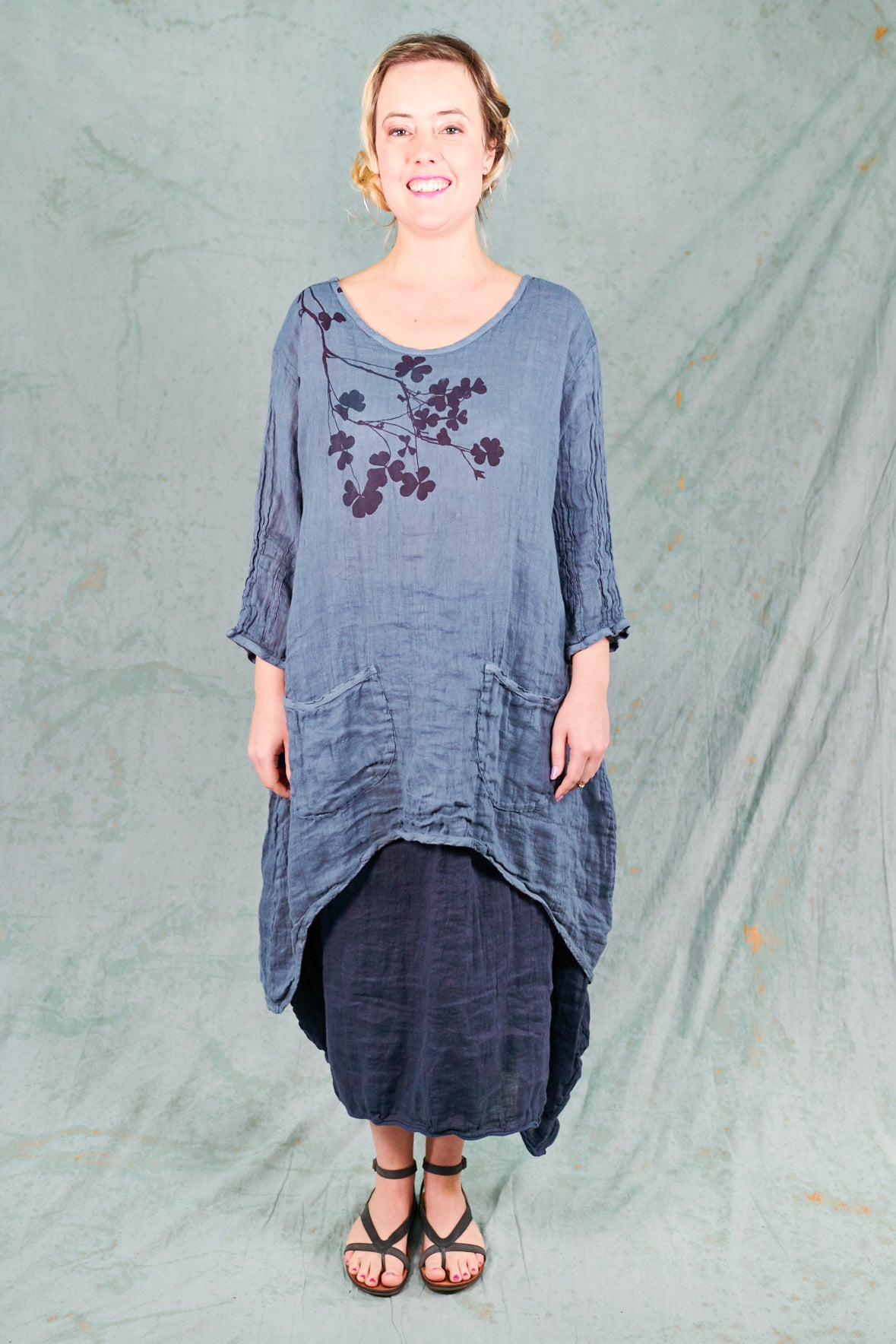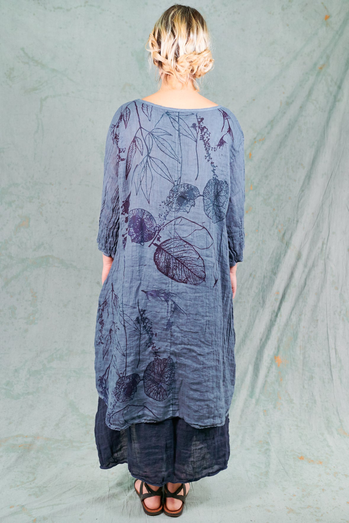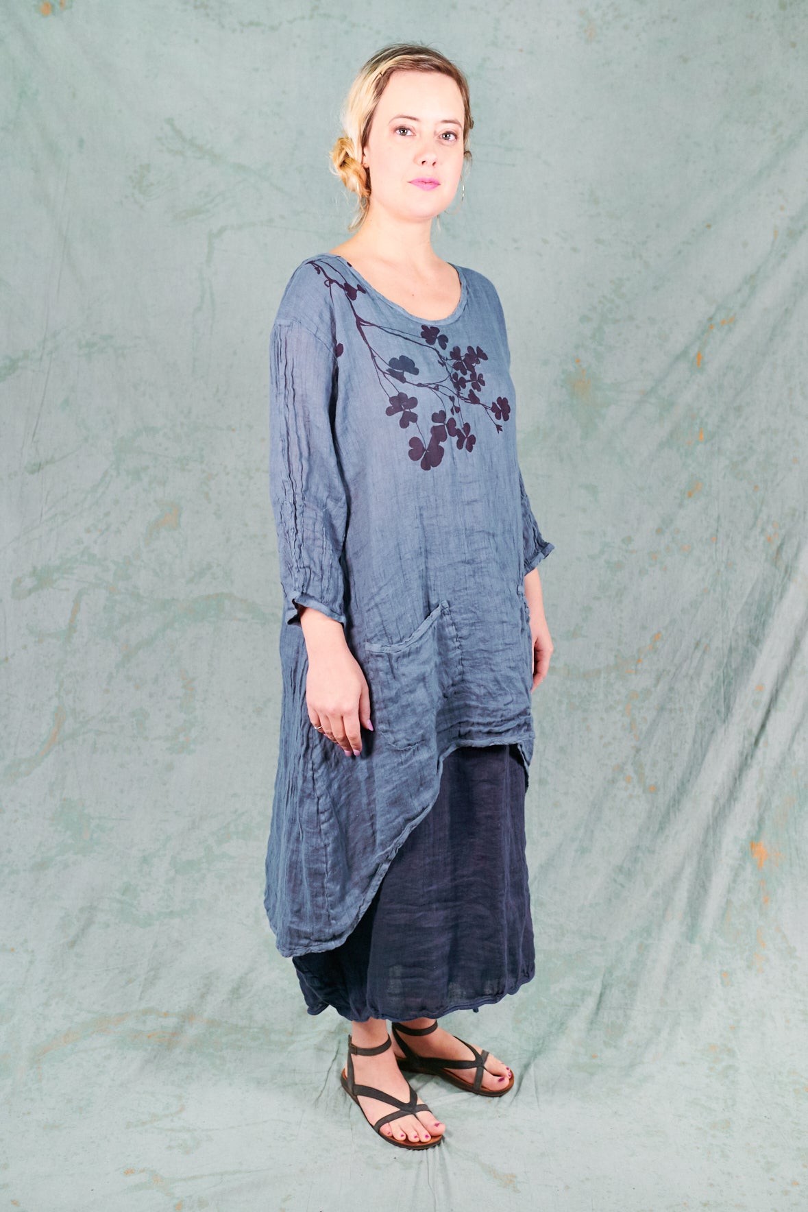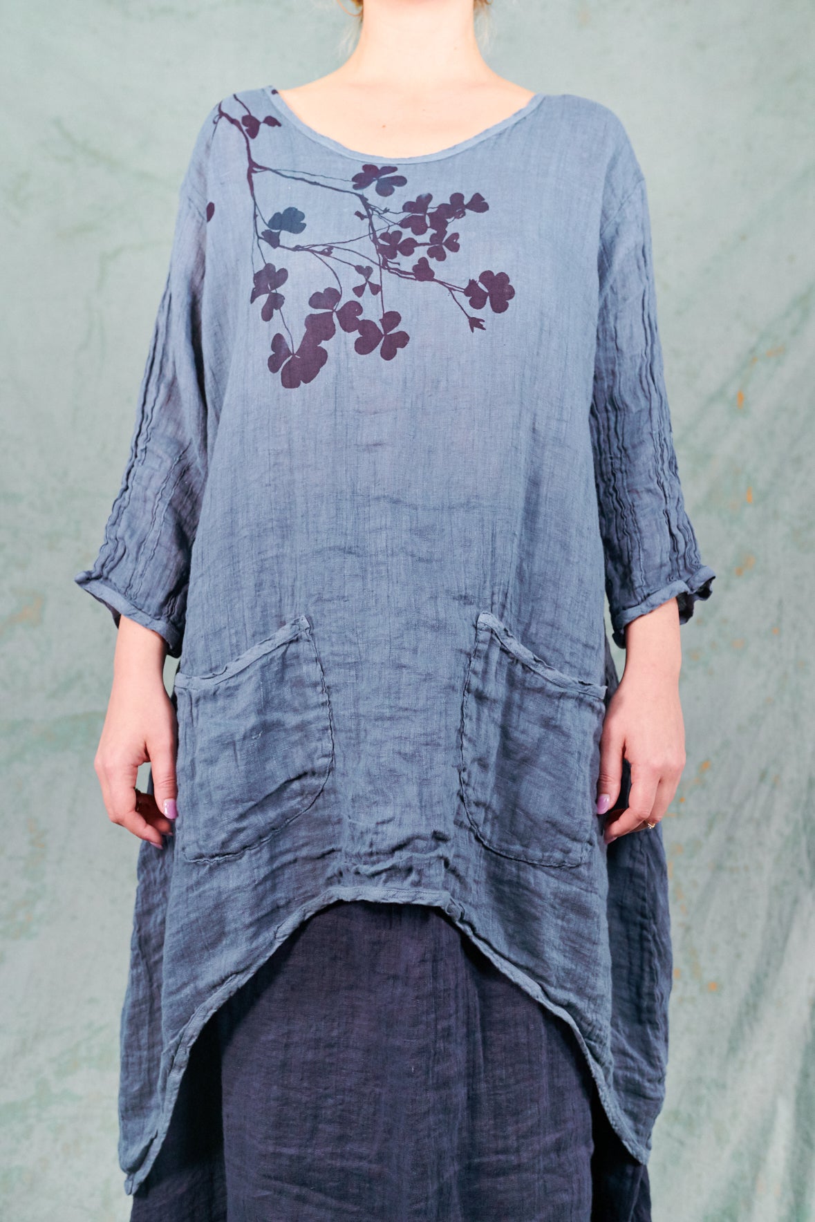 NEW Ease, calm and simple. This style made from our lightweight summertime linen has ease and flow. Longer in back, this beautifully shaped tunic features two small pockets, flows gracefully, and features handprinting all over the back with a small print on the front as well. Pairs best with #4181 Sylph Skirt or the Mojo Pants.