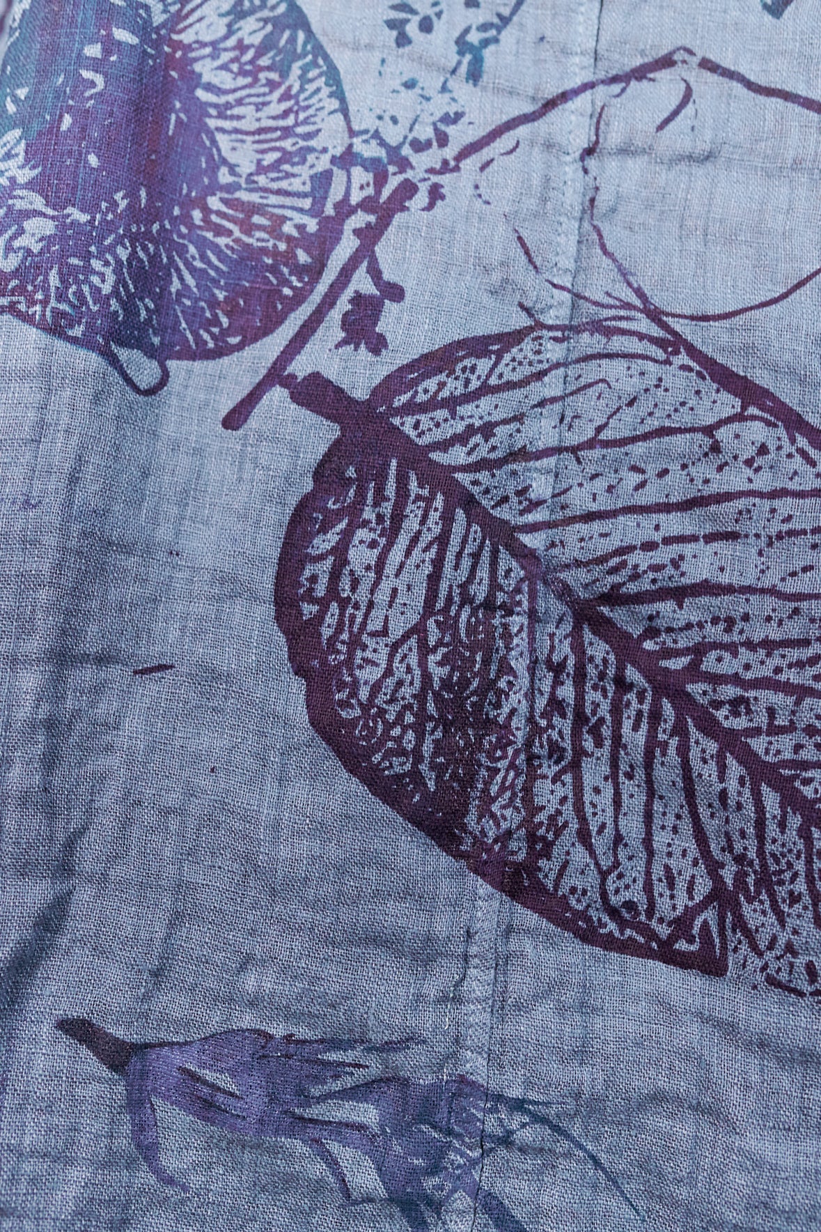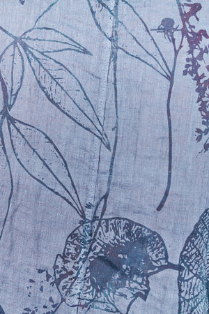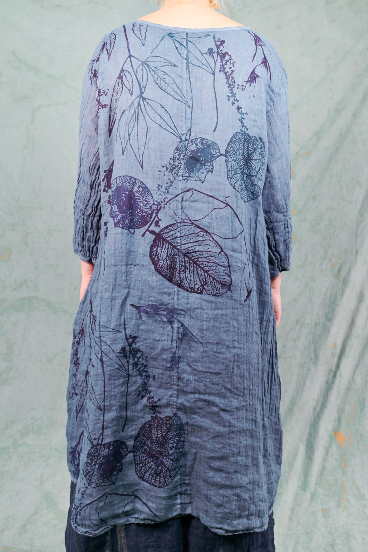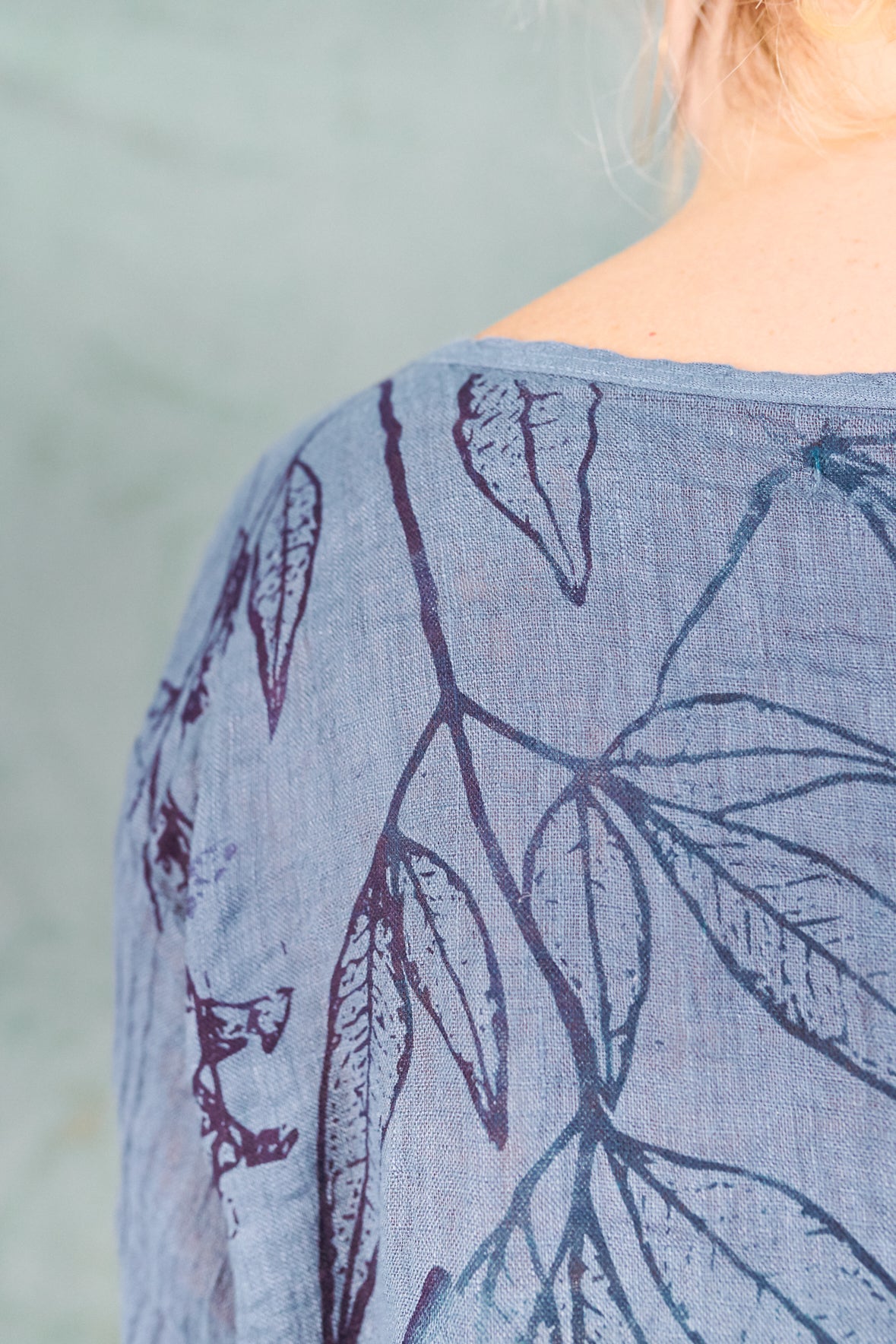 NEW Ease, calm and simple. This style made from our lightweight summertime linen has ease and flow. Longer in back, this beautifully shaped tunic features two small pockets, flows gracefully, and features handprinting all over the back with a small print on the front as well. Pairs best with #4181 Sylph Skirt or the Mojo Pants.
