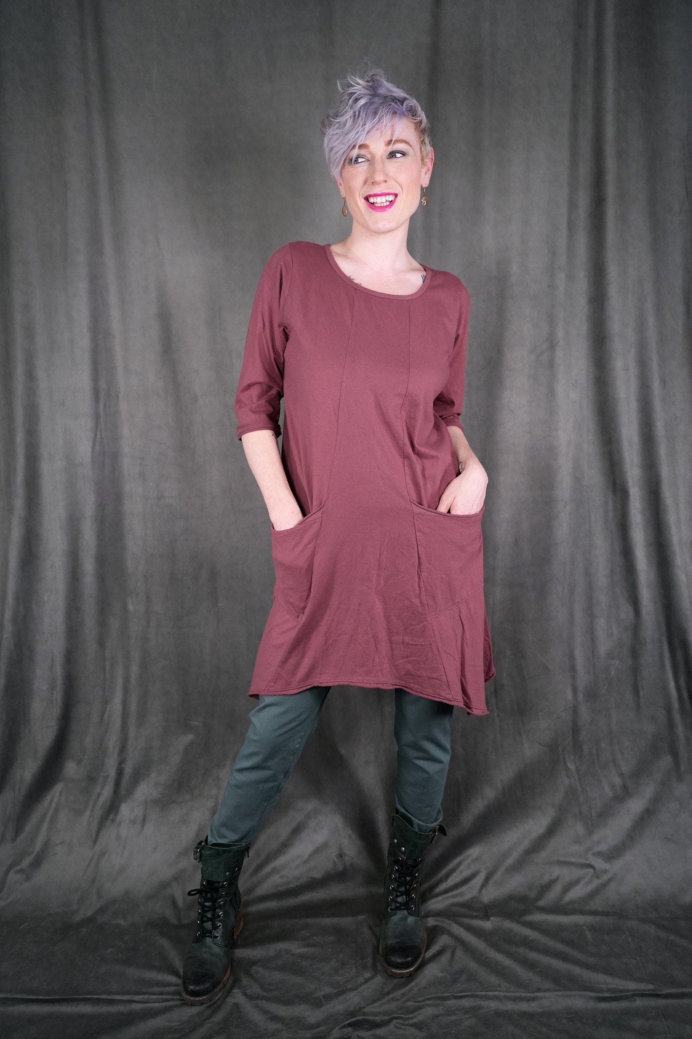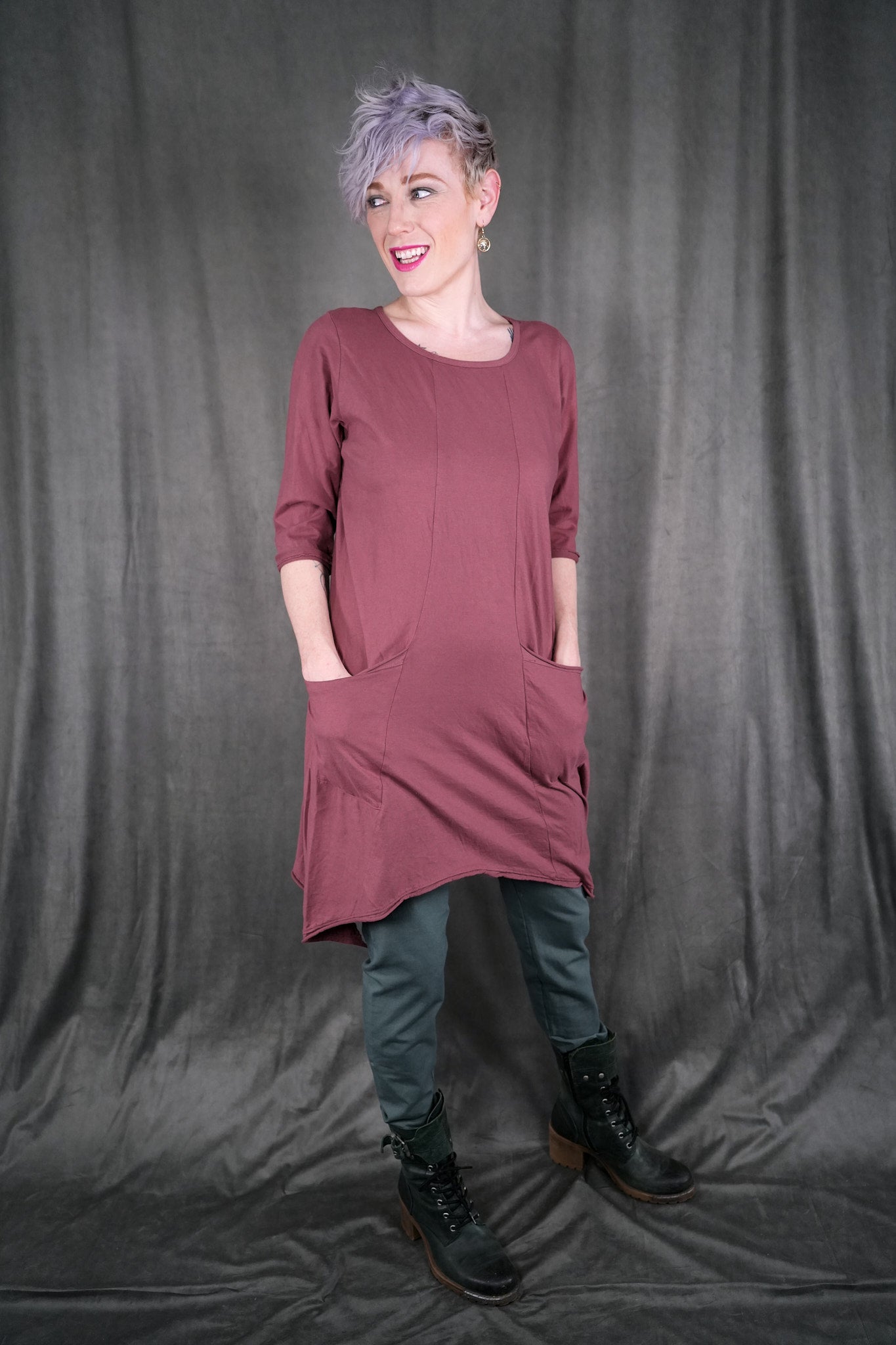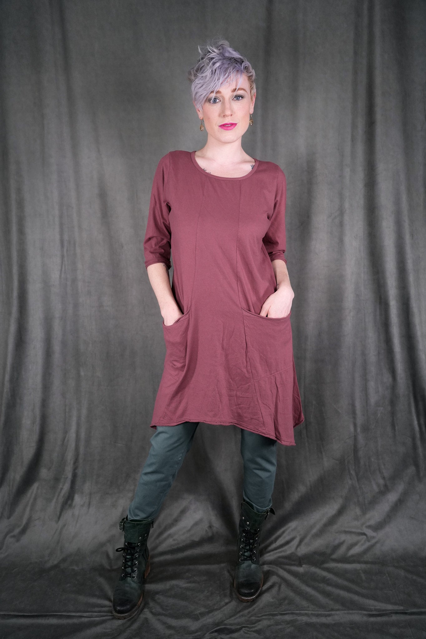 Based on our A-line Sunny Day Top, a tunic with not too much extra fabric in our comfortable organic cotton jersey features pockets and vertical seaming. Has slightly curved hem. A tunic that stands alone and is perfect under an apron or vest, the possibilities are endless with this versatile tunic.