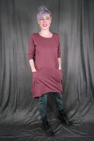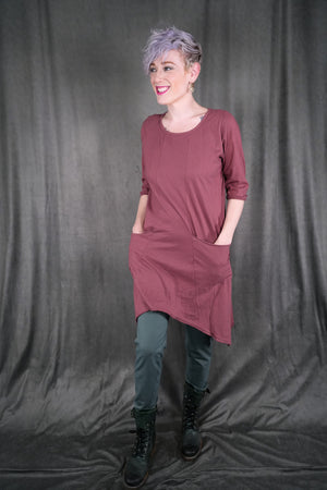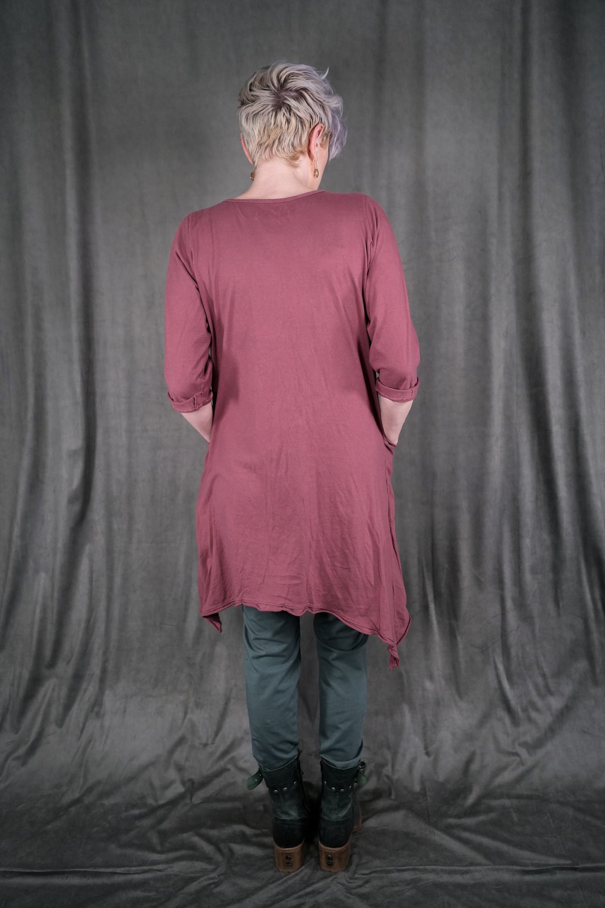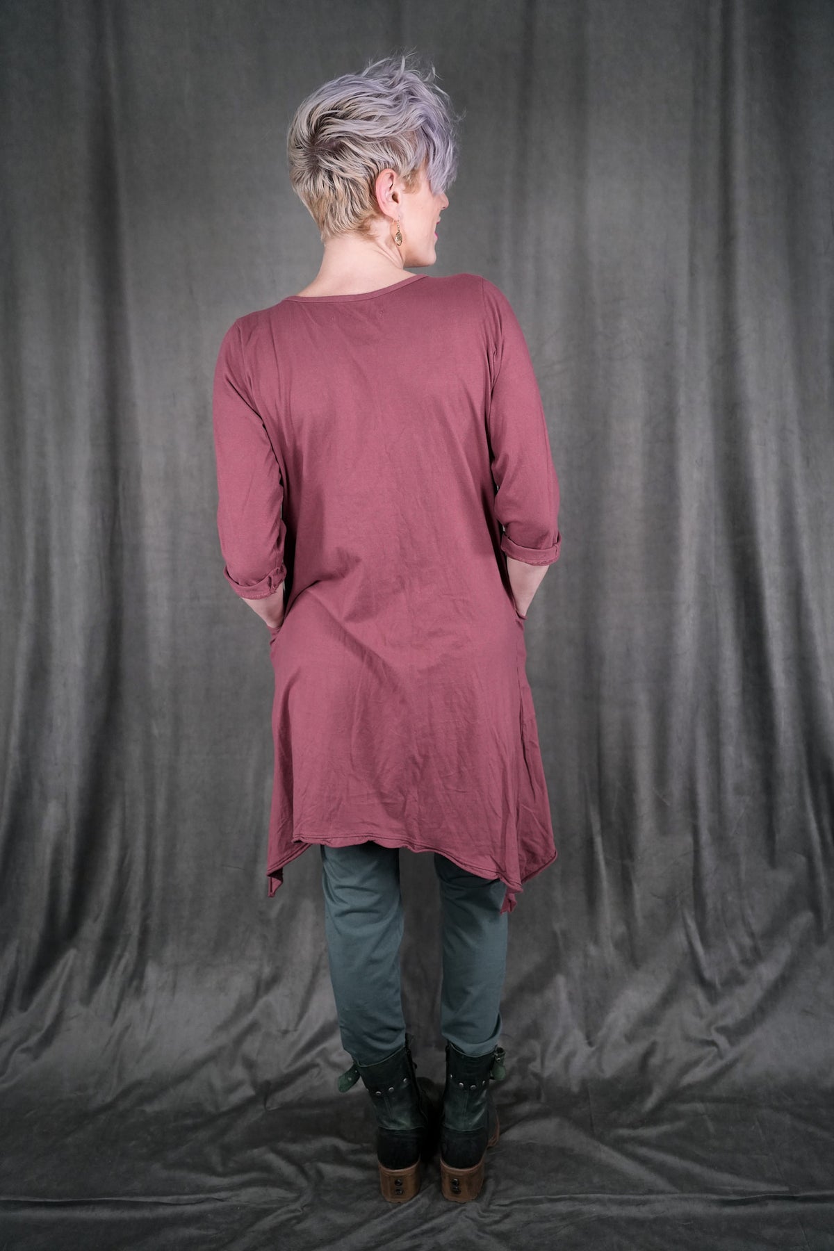 Based on our A-line Sunny Day Top, a tunic with not too much extra fabric in our comfortable organic cotton jersey features pockets and vertical seaming. Has slightly curved hem. A tunic that stands alone and is perfect under an apron or vest, the possibilities are endless with this versatile tunic.