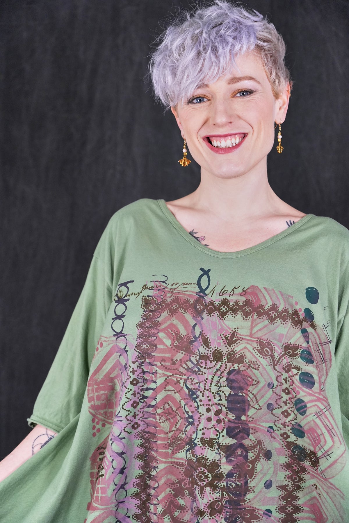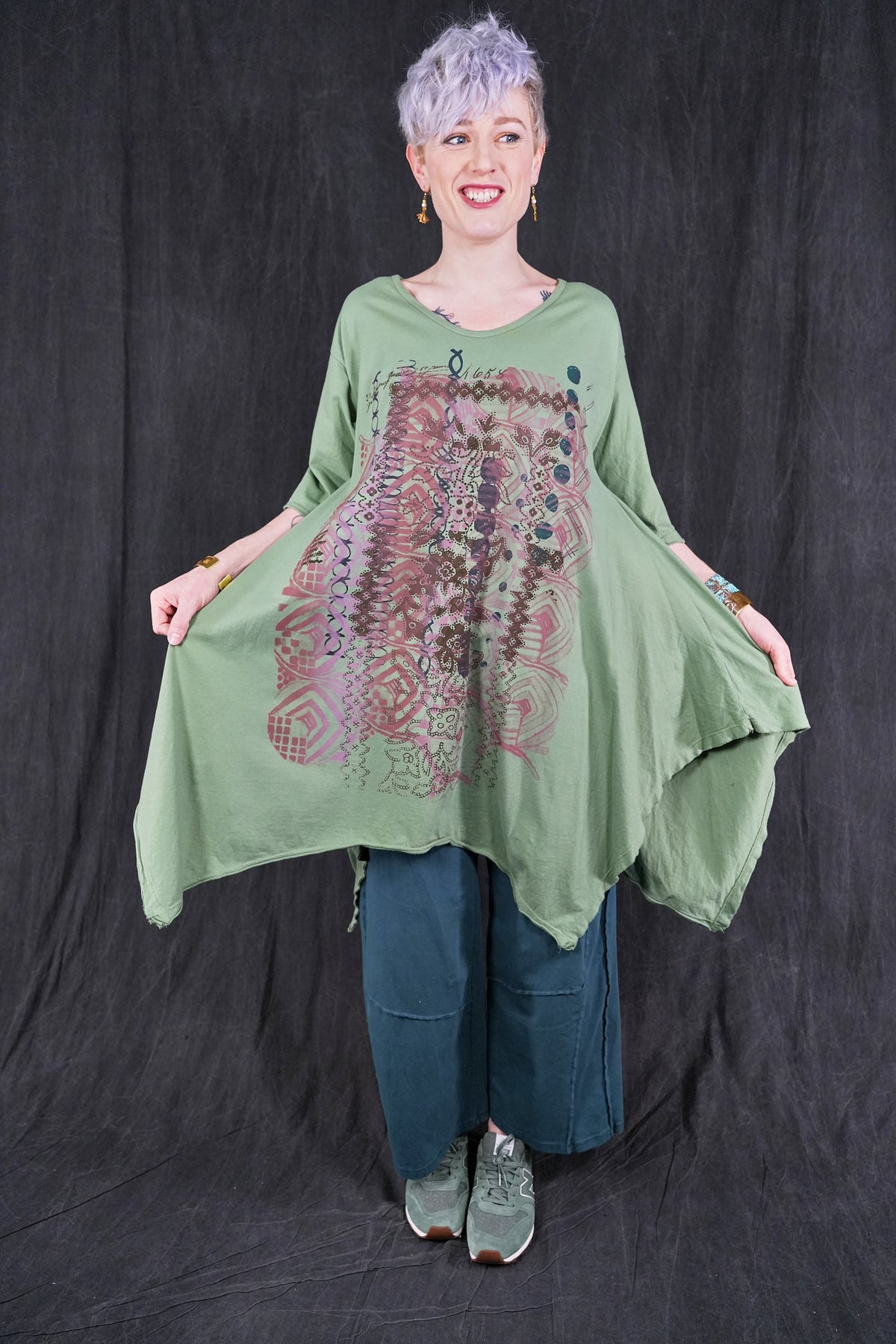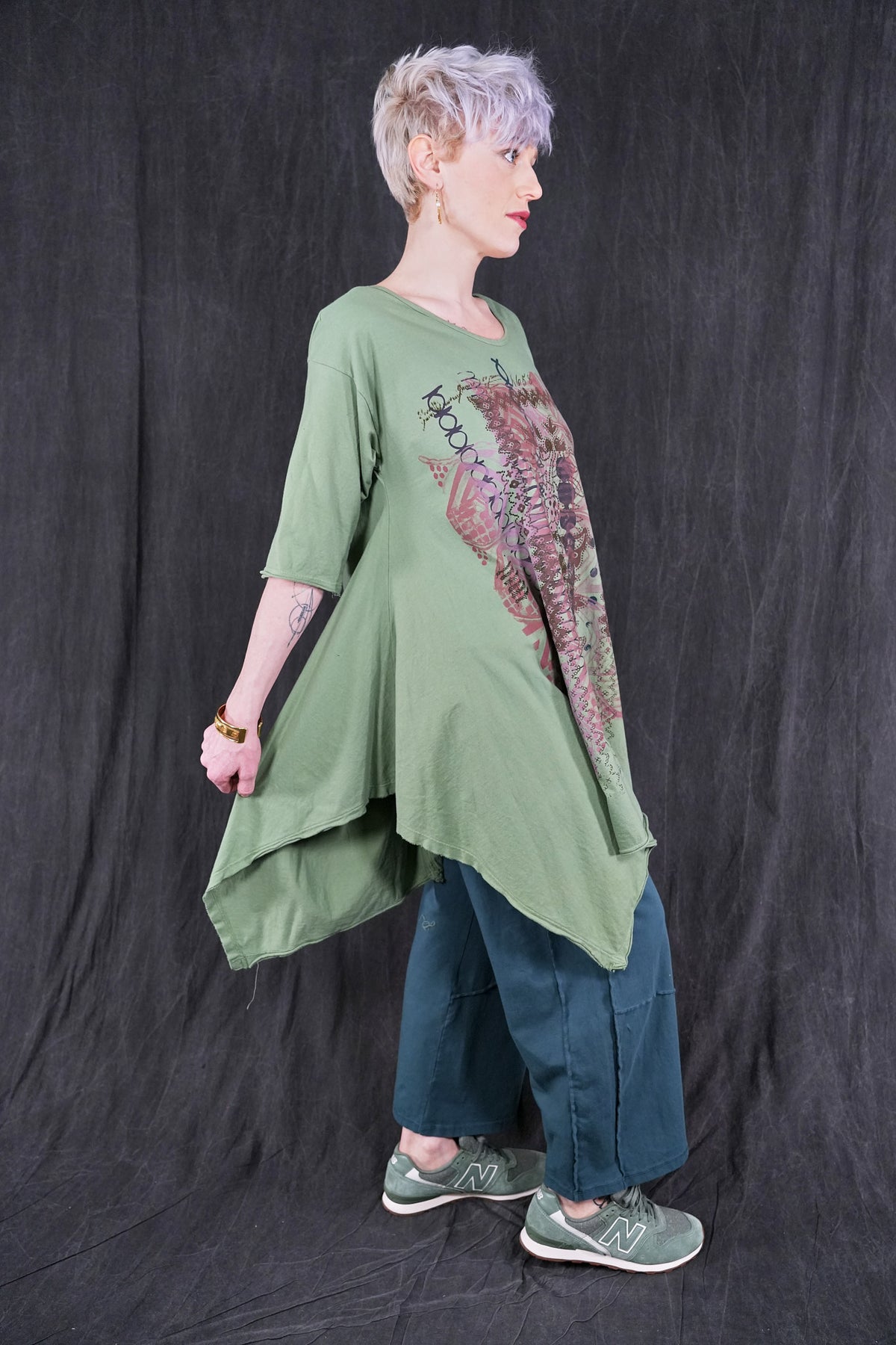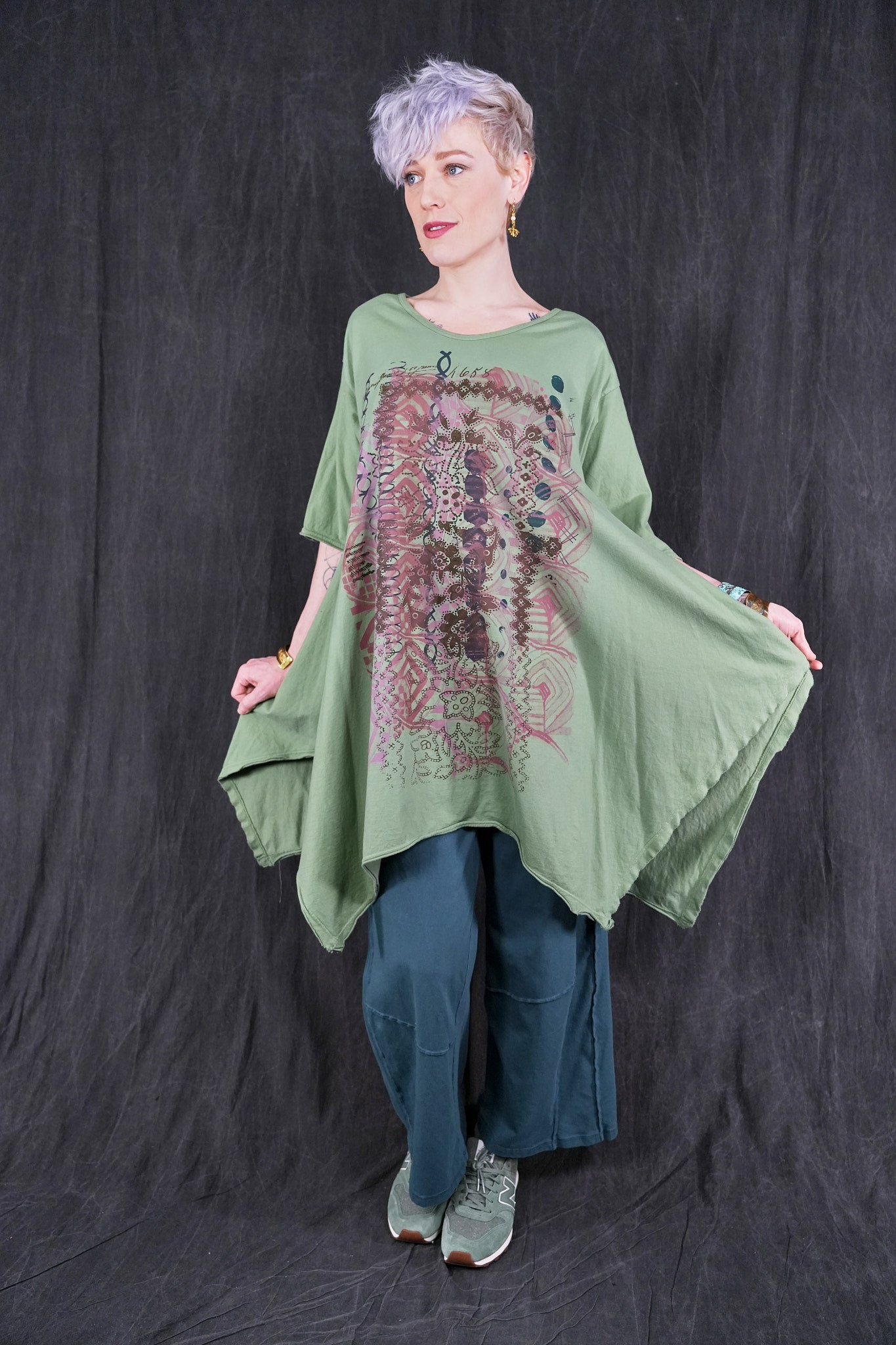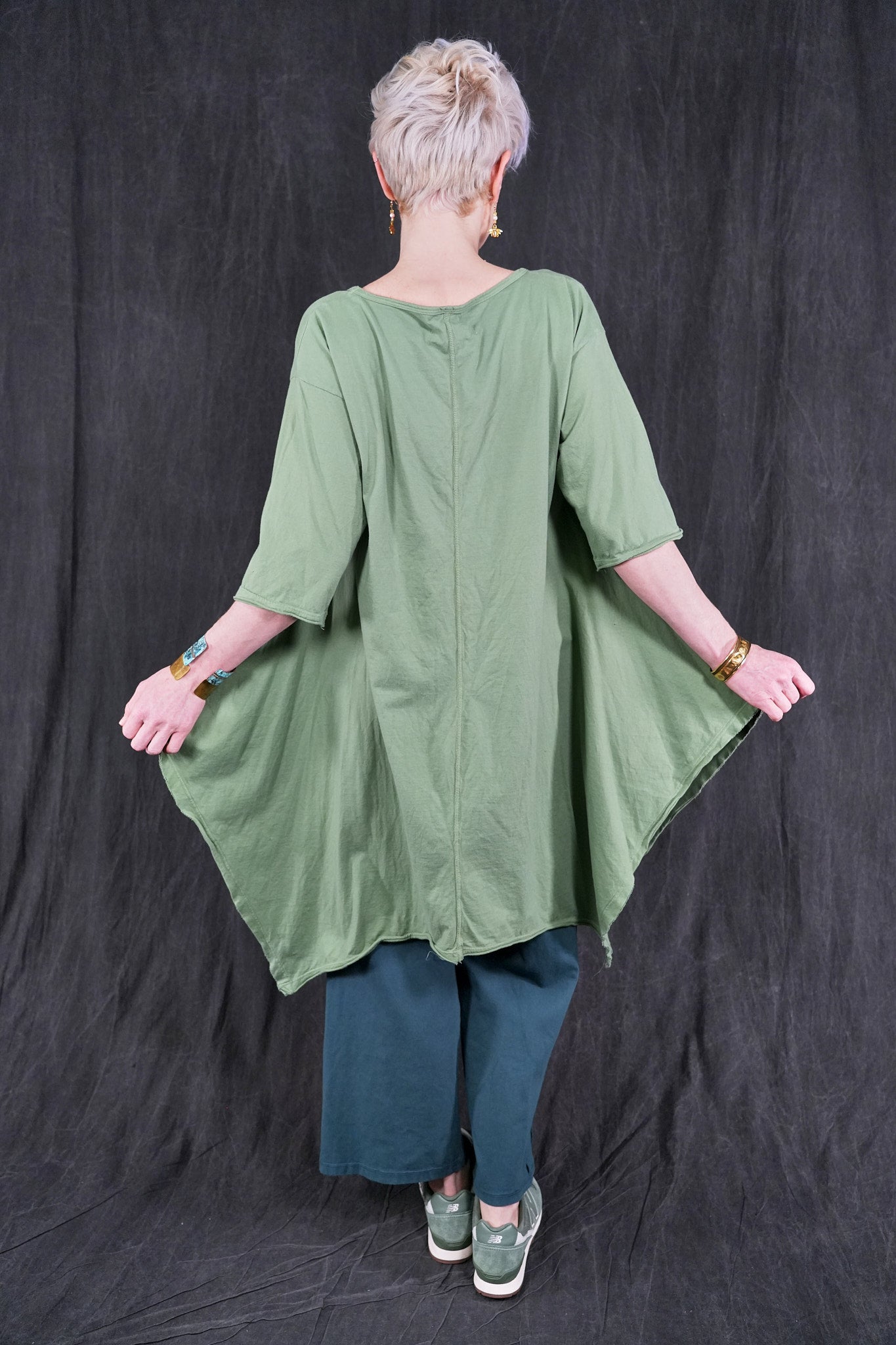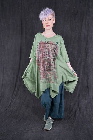 Made from 100% organic cotton , and as all of our items, sewn in the USA . Hand printed with botanicals that make it easy to mix with other pieces. Hemline is wide and draped; comes to points front & back, a softly V'd neckline and elbow length sleeves create a feminine appeal. Layers well with wide linen pants, leggings, or our tiered petaloons. Layers perfectly with our #5289 Basque Linen Cardigan.