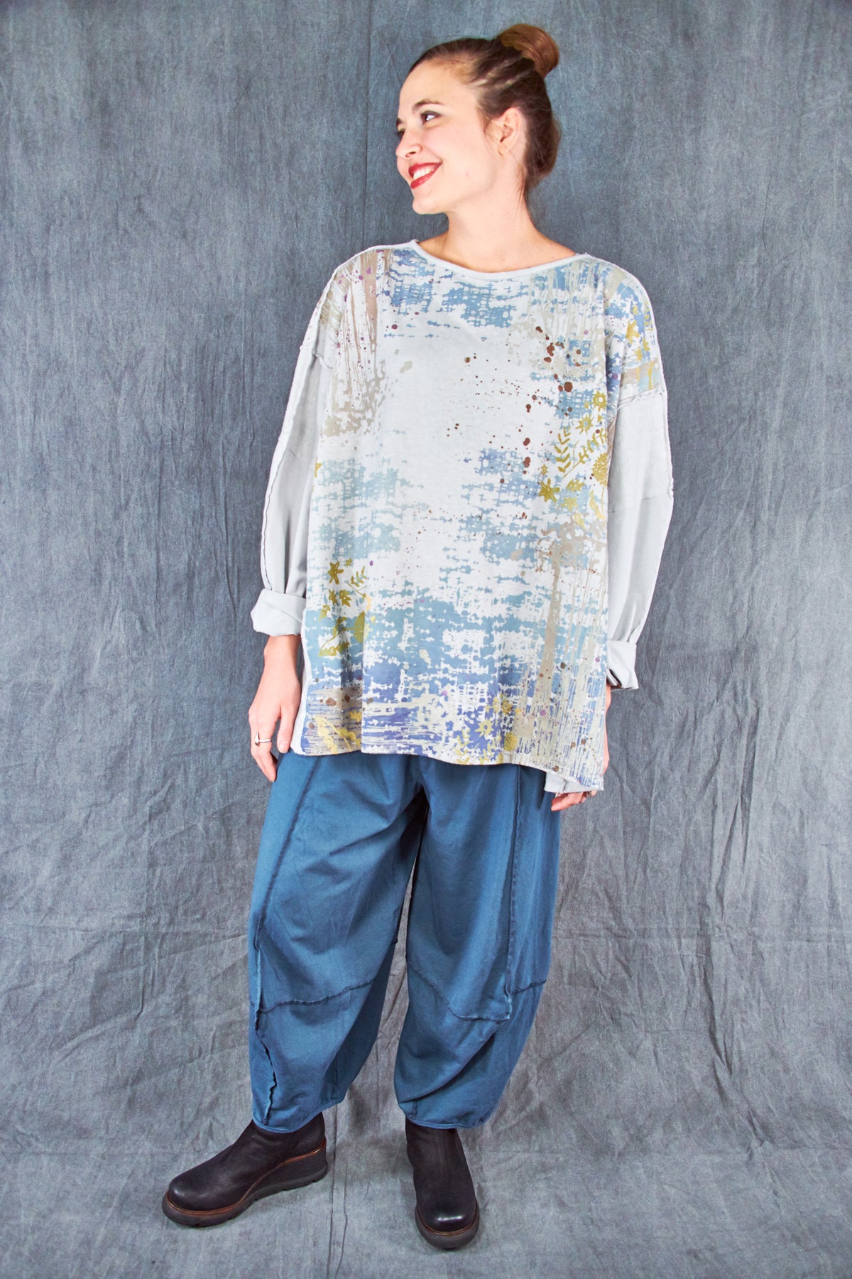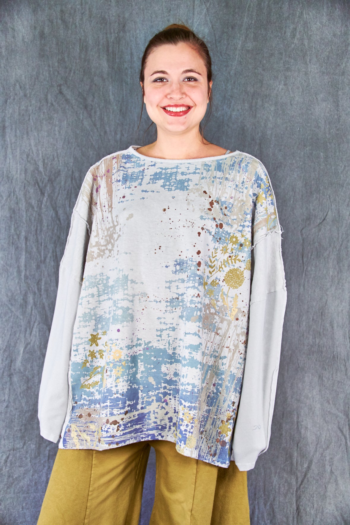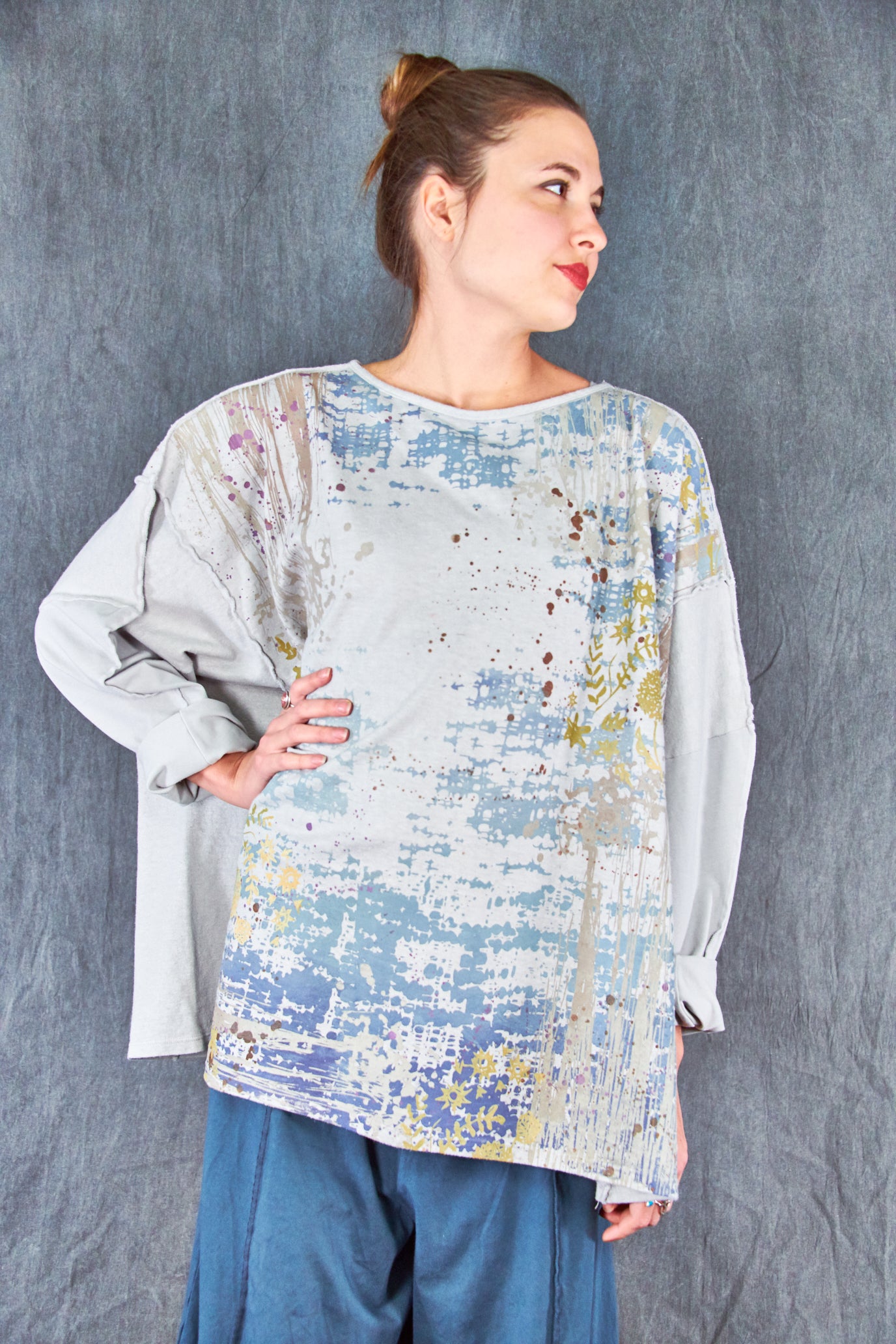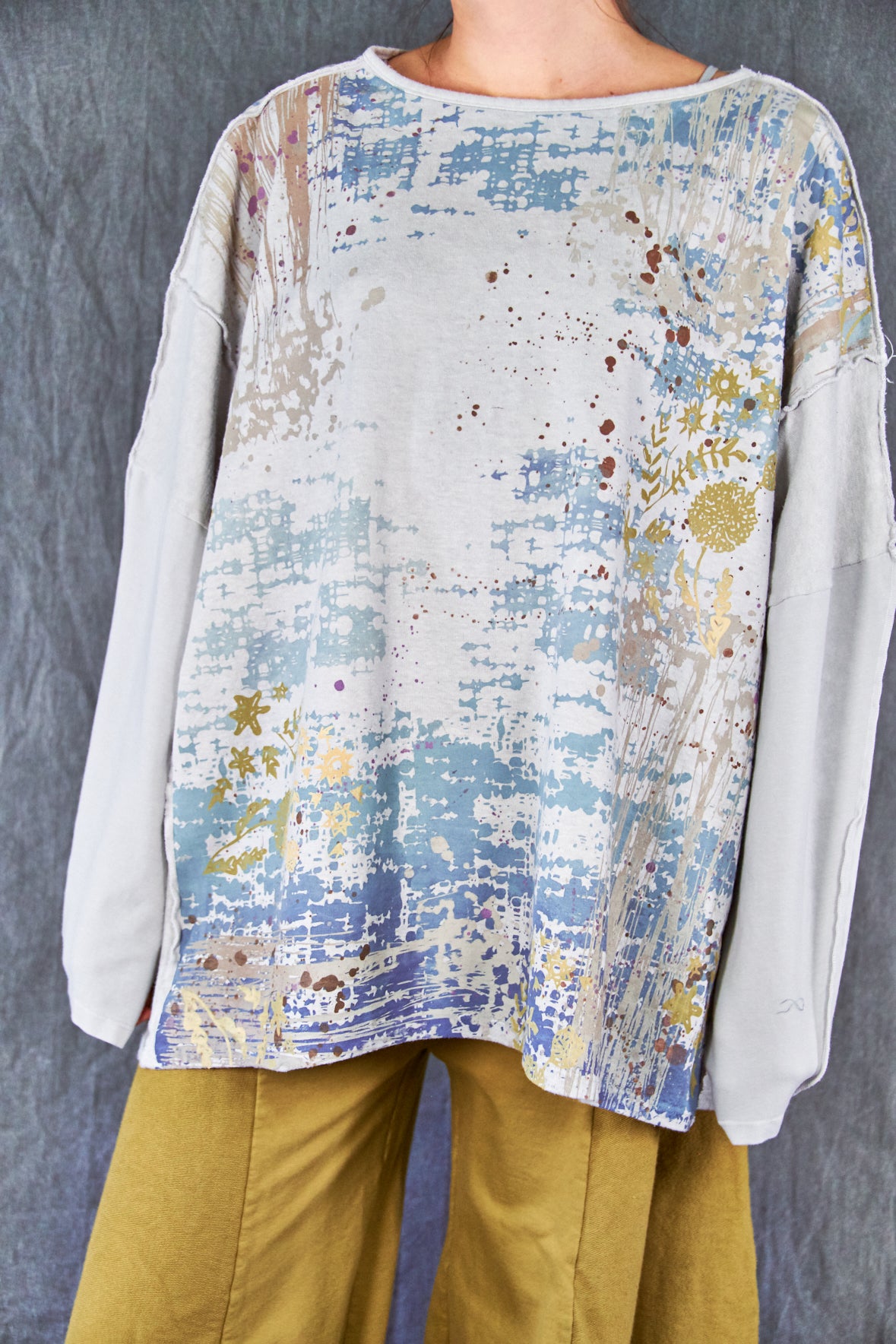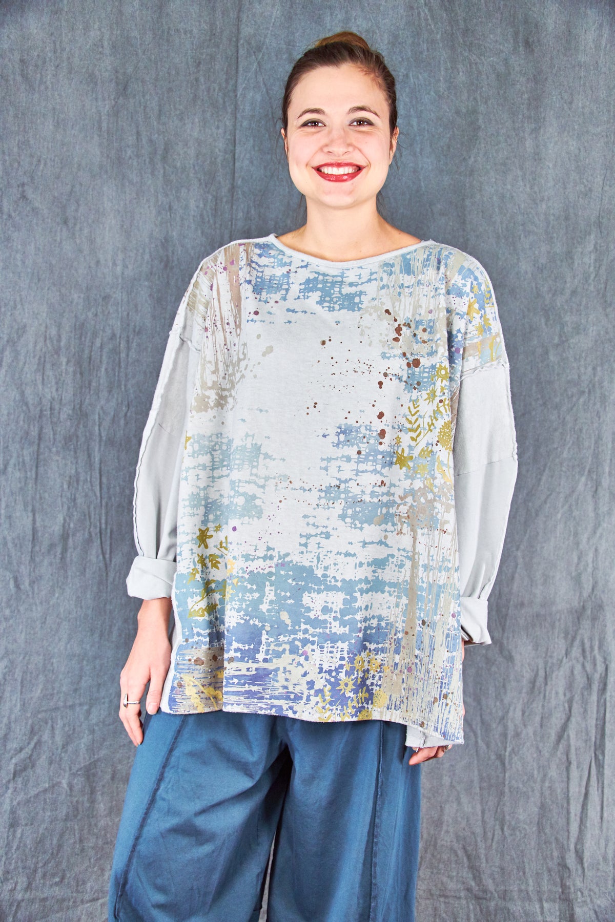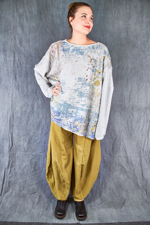 A new style to love ! Organic cotton/hemp mariposa. The sleeves are cotton jersey with outside seam panels in the body to give form to this new twist mariposa- fabric meets art from our studio to create a piece you'll reach for again & again!