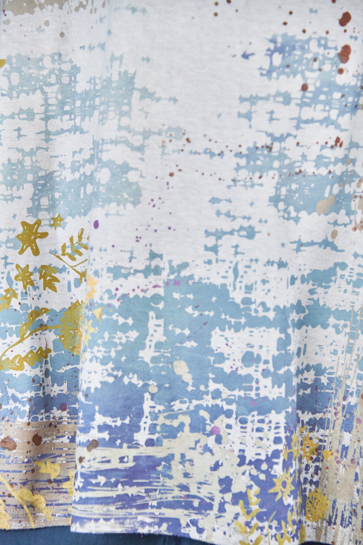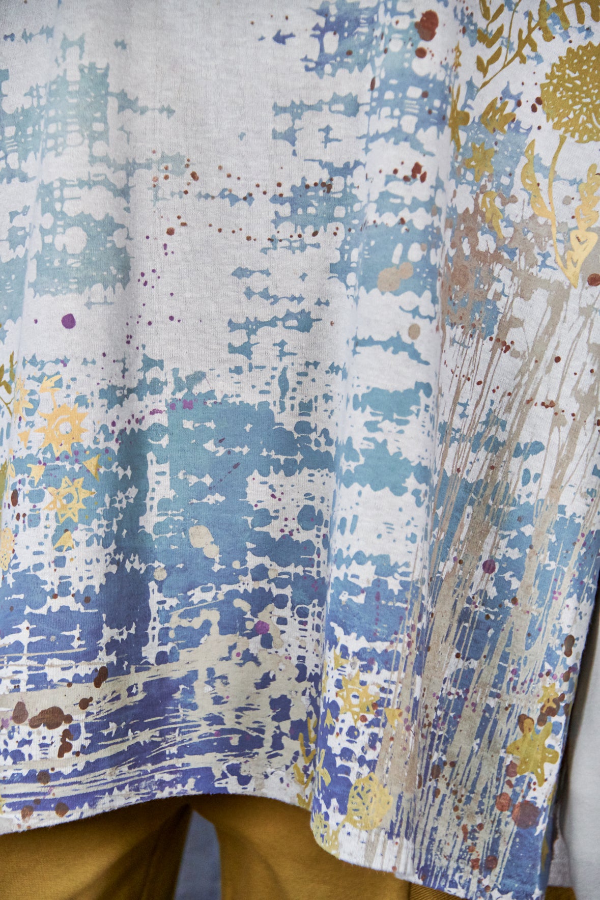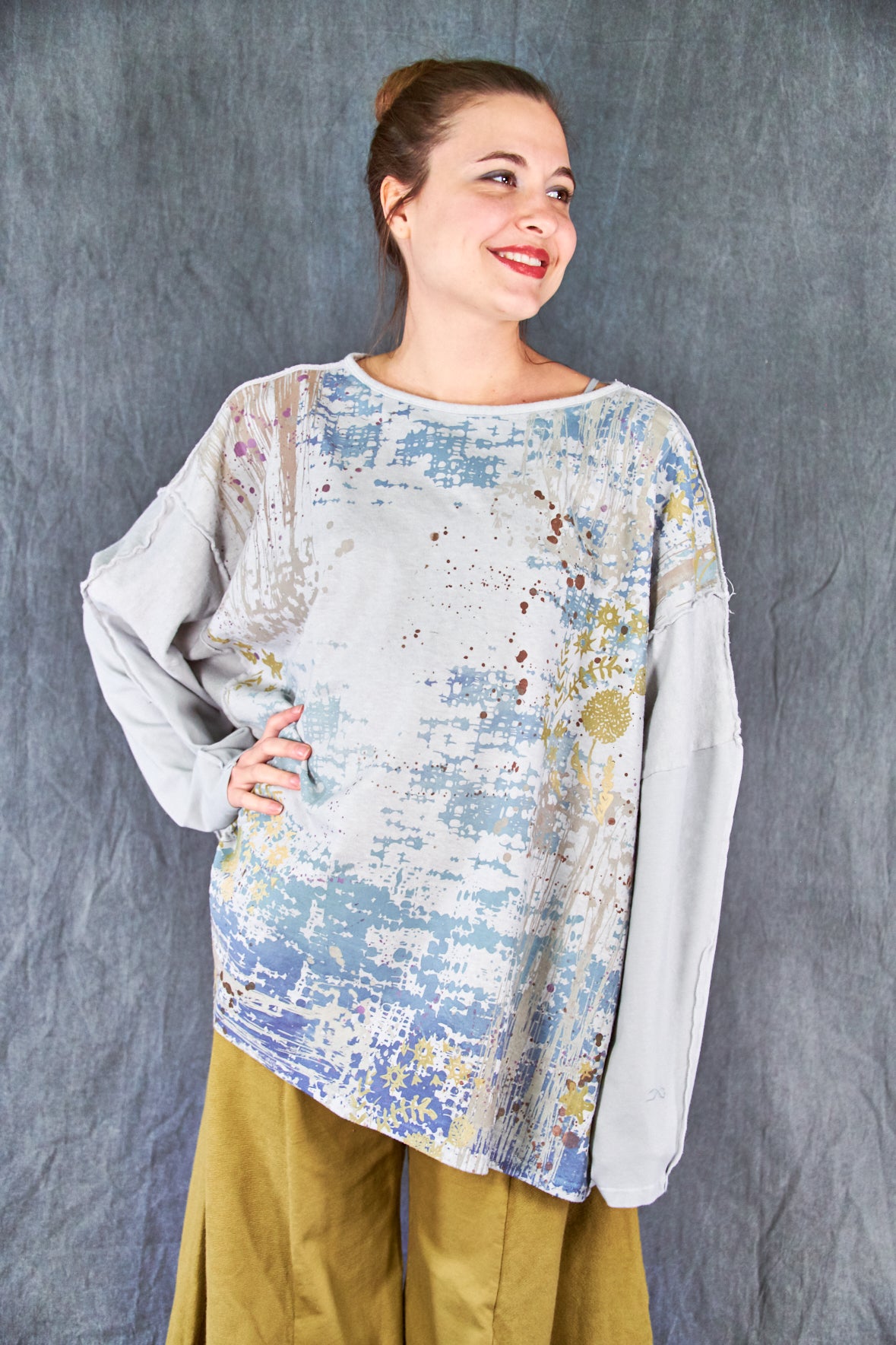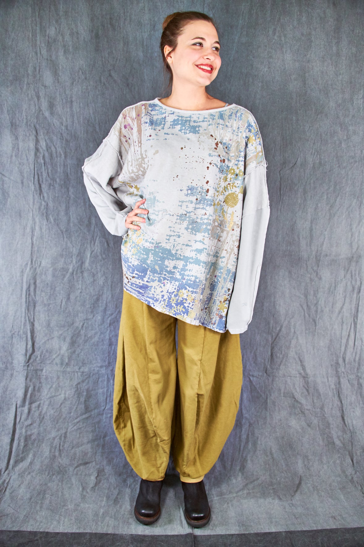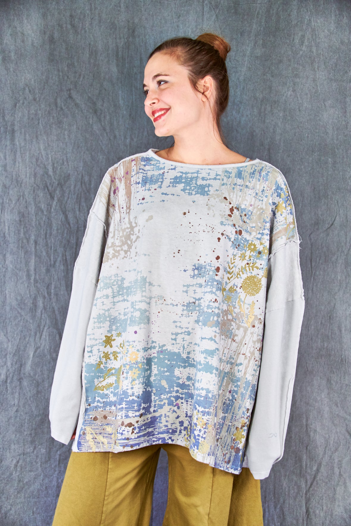 A new style to love ! Organic cotton/hemp mariposa. The sleeves are cotton jersey with outside seam panels in the body to give form to this new twist mariposa- fabric meets art from our studio to create a piece you'll reach for again & again!