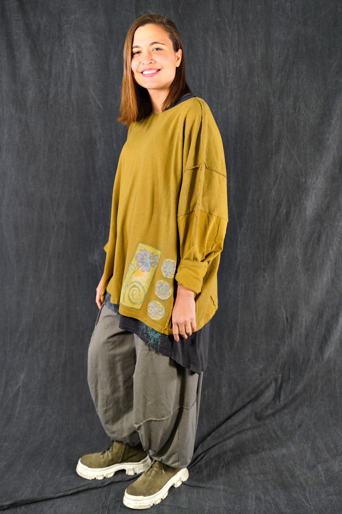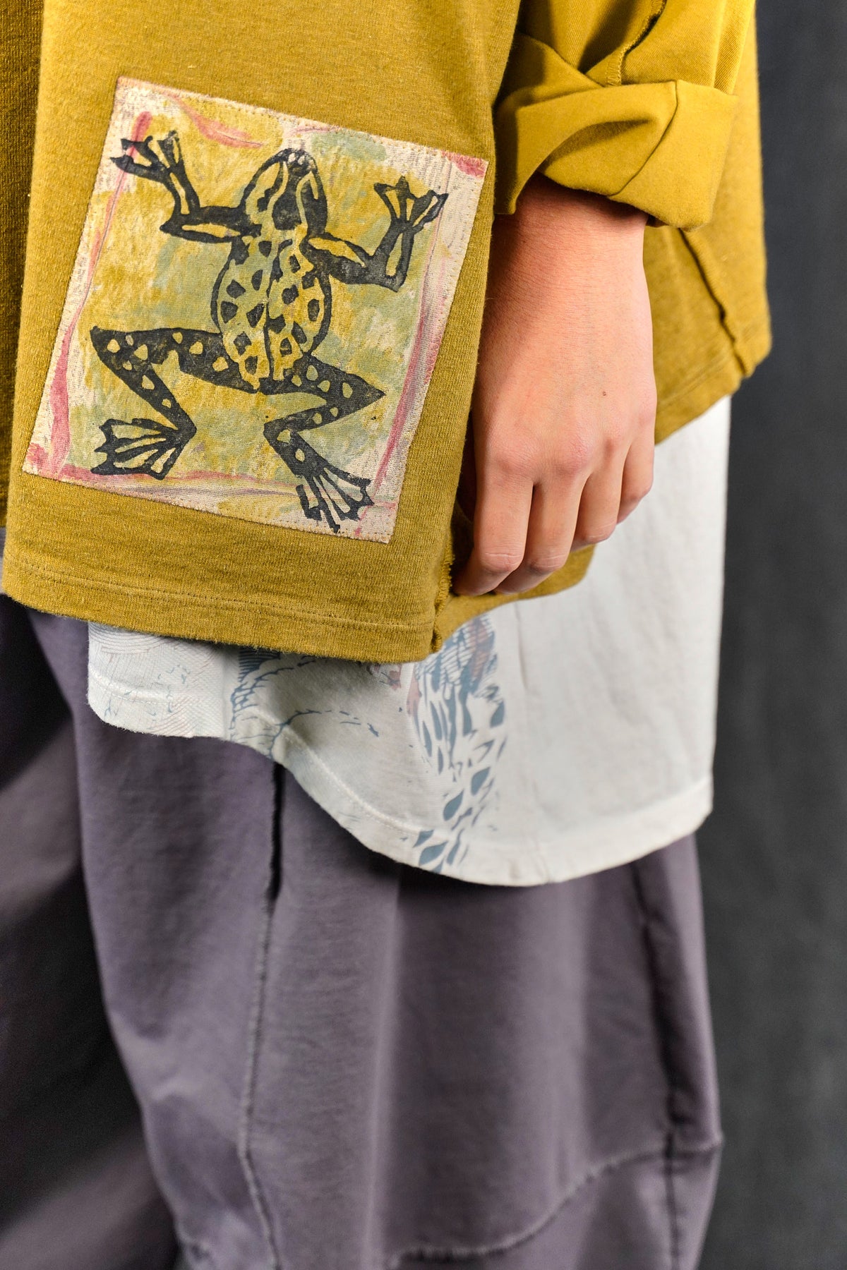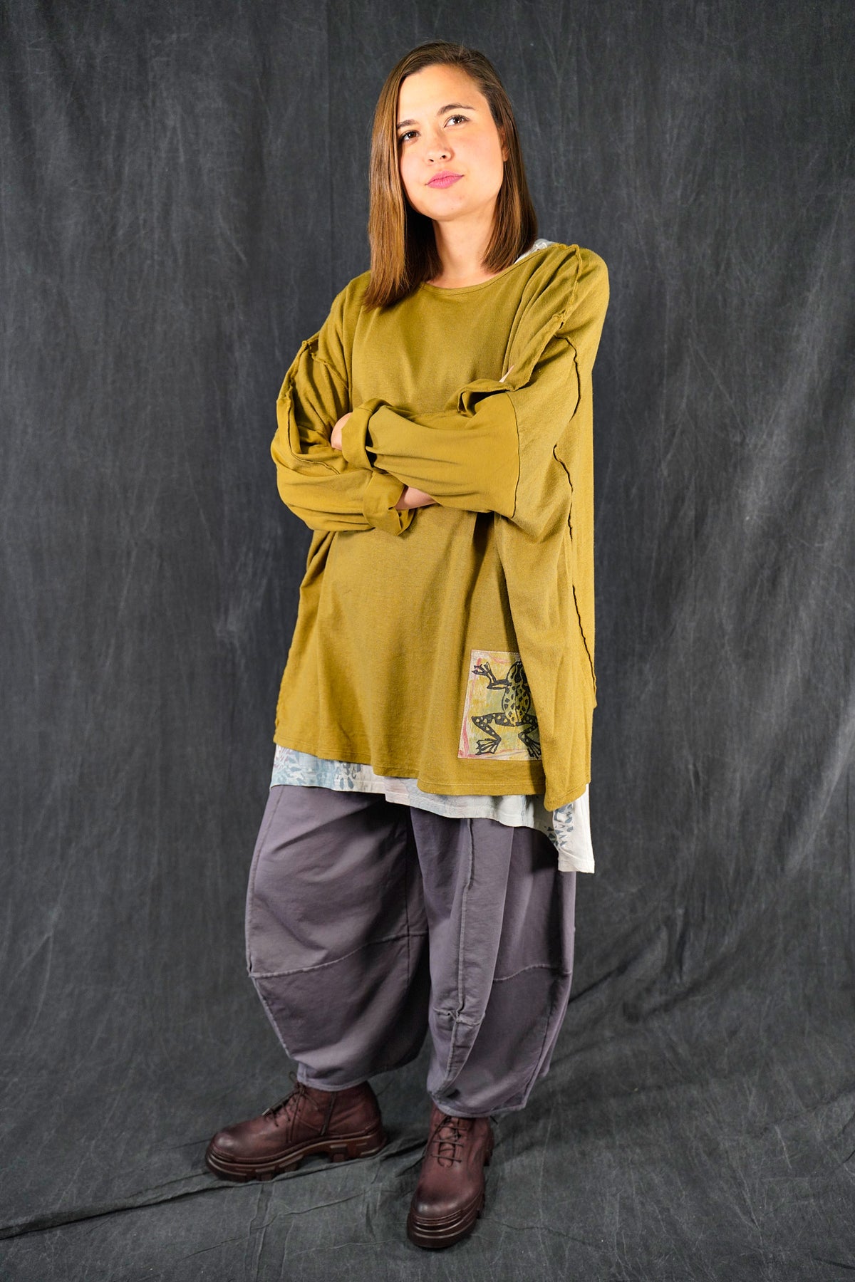 Organic cotton/hemp mariposa. The sleeves are cotton jersey with outside seam panels in the body to give form to this new twist mariposa- fabric meets art from our studio to create a piece you'll reach for again & again!