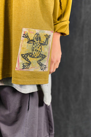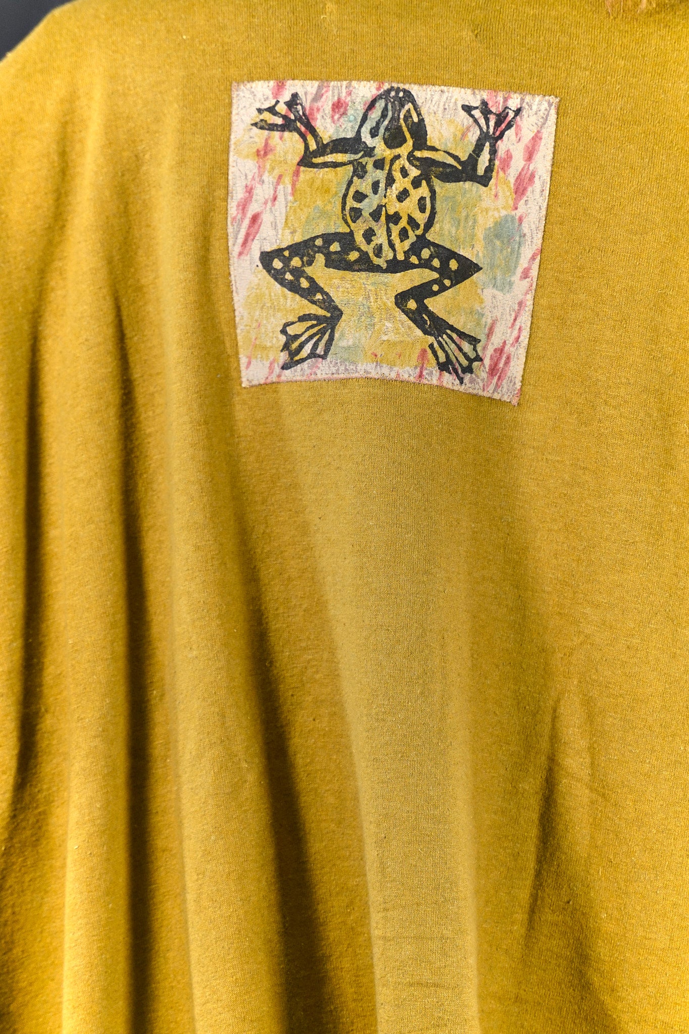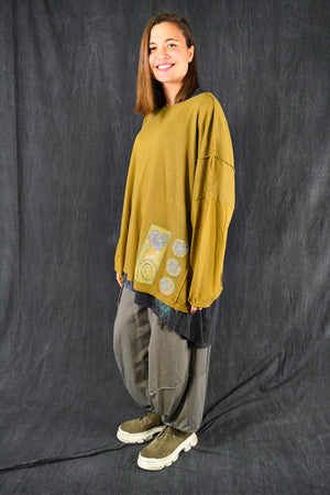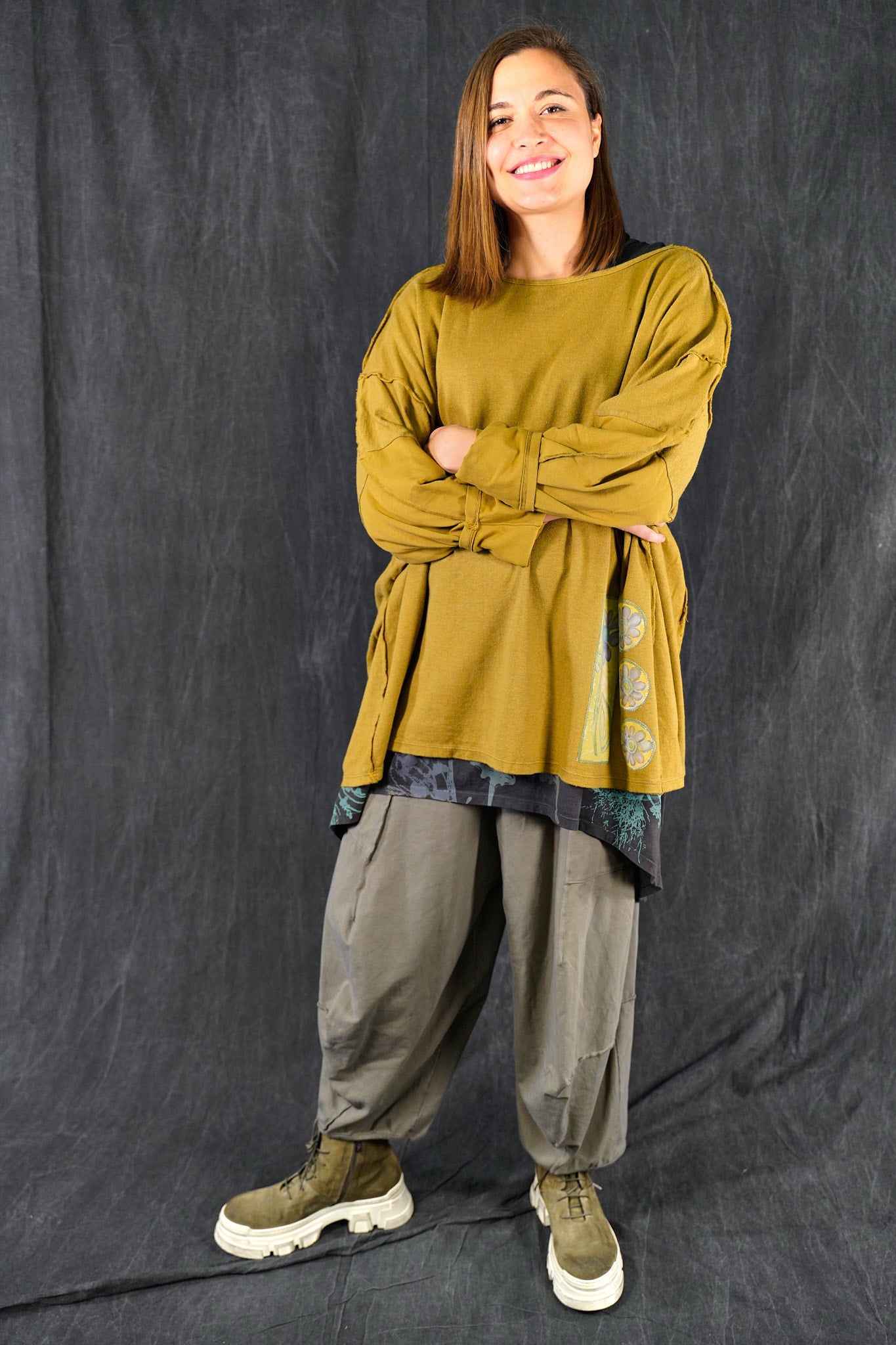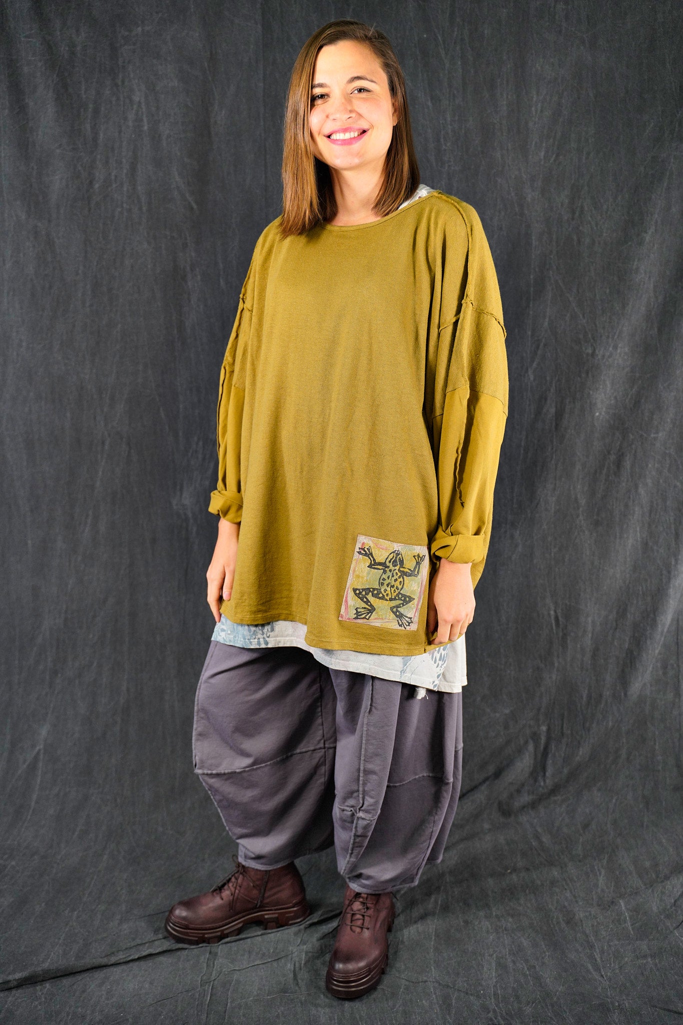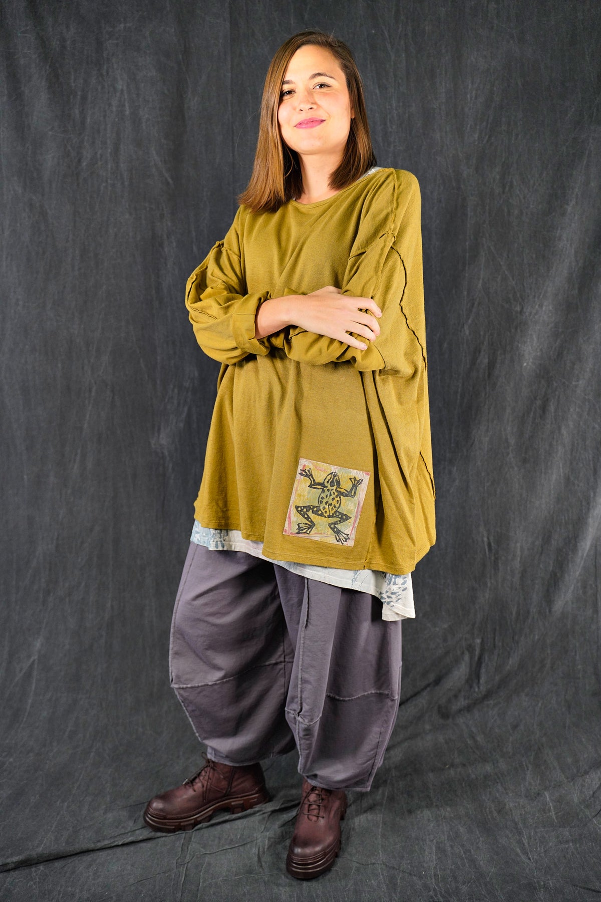 Organic cotton/hemp mariposa. The sleeves are cotton jersey with outside seam panels in the body to give form to this new twist mariposa- fabric meets art from our studio to create a piece you'll reach for again & again!