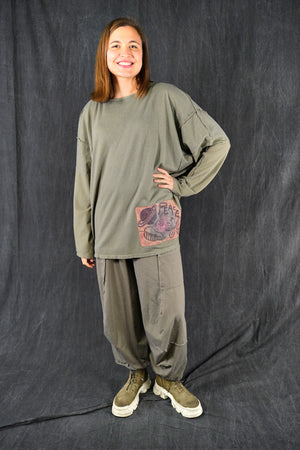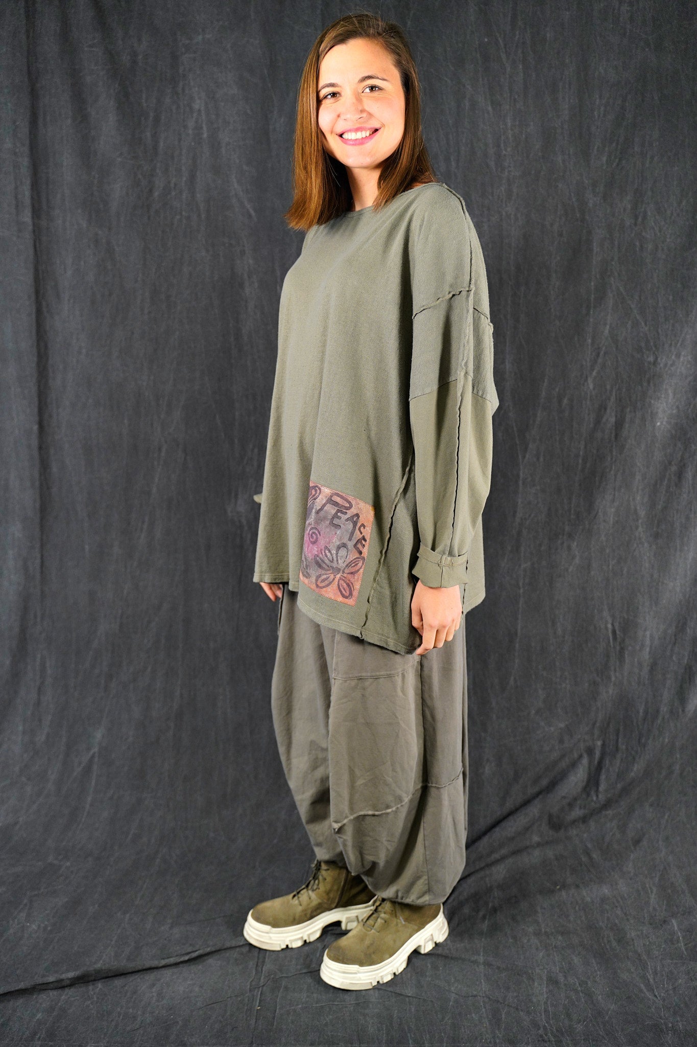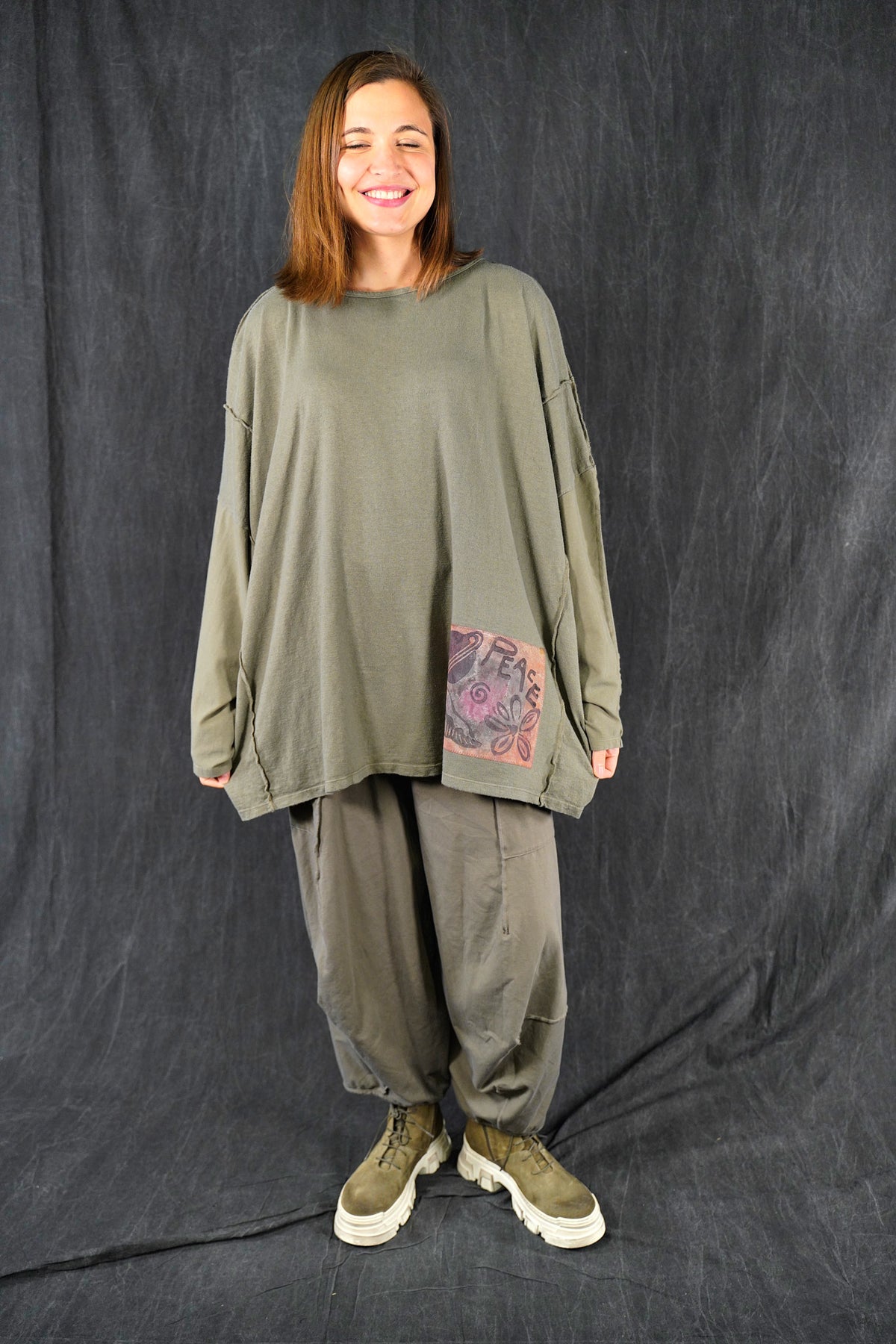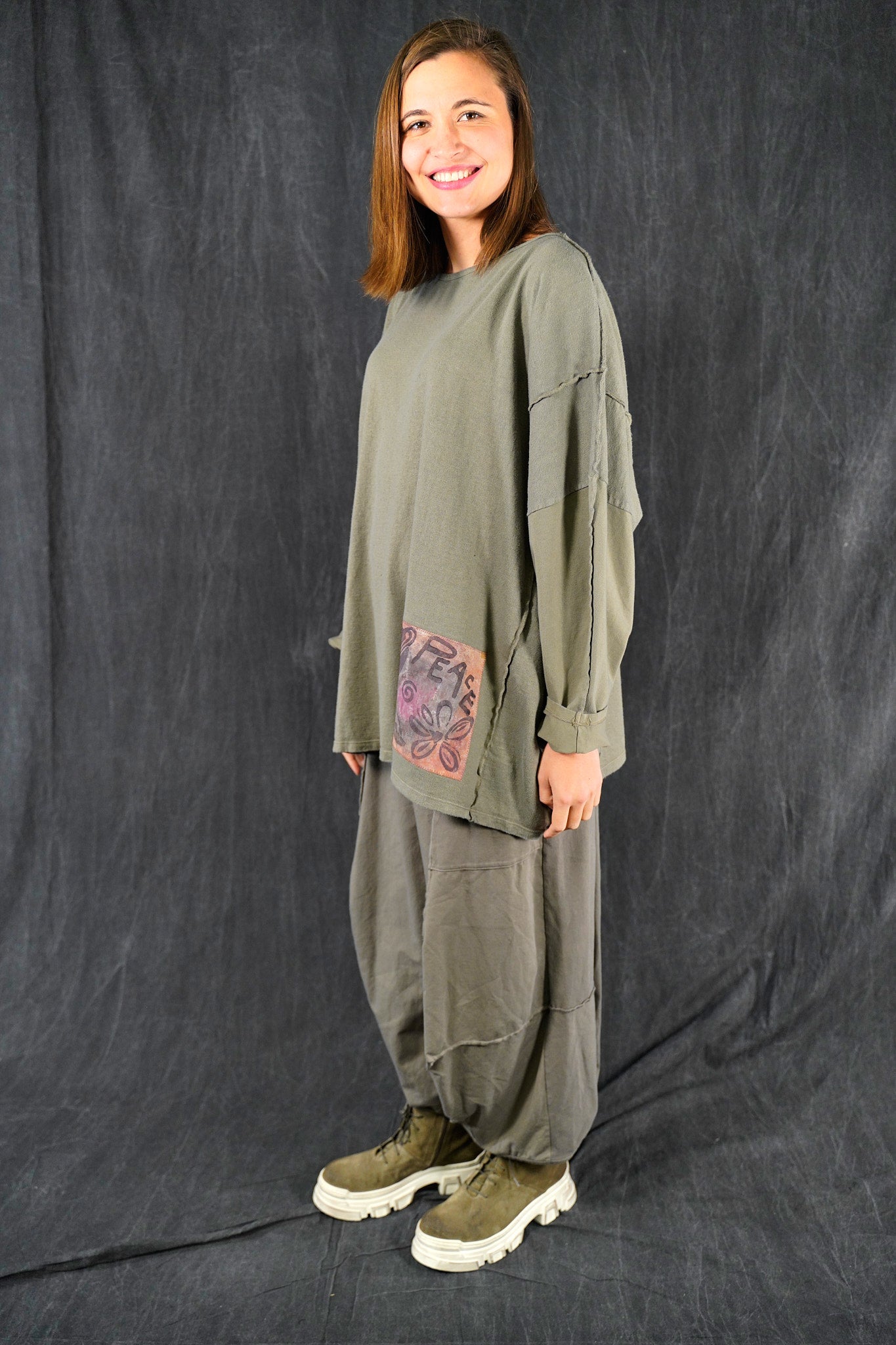 A new style to love with a hand block printed, vintage PEACE patch made in our original Frenchtown studio. Organic cotton/hemp mariposa. The sleeves are cotton jersey with outside seam panels in the body to give form to this new twist mariposa- fabric meets art from our studio to create a piece you'll reach for again & again! Great as a layer over a longer tee.