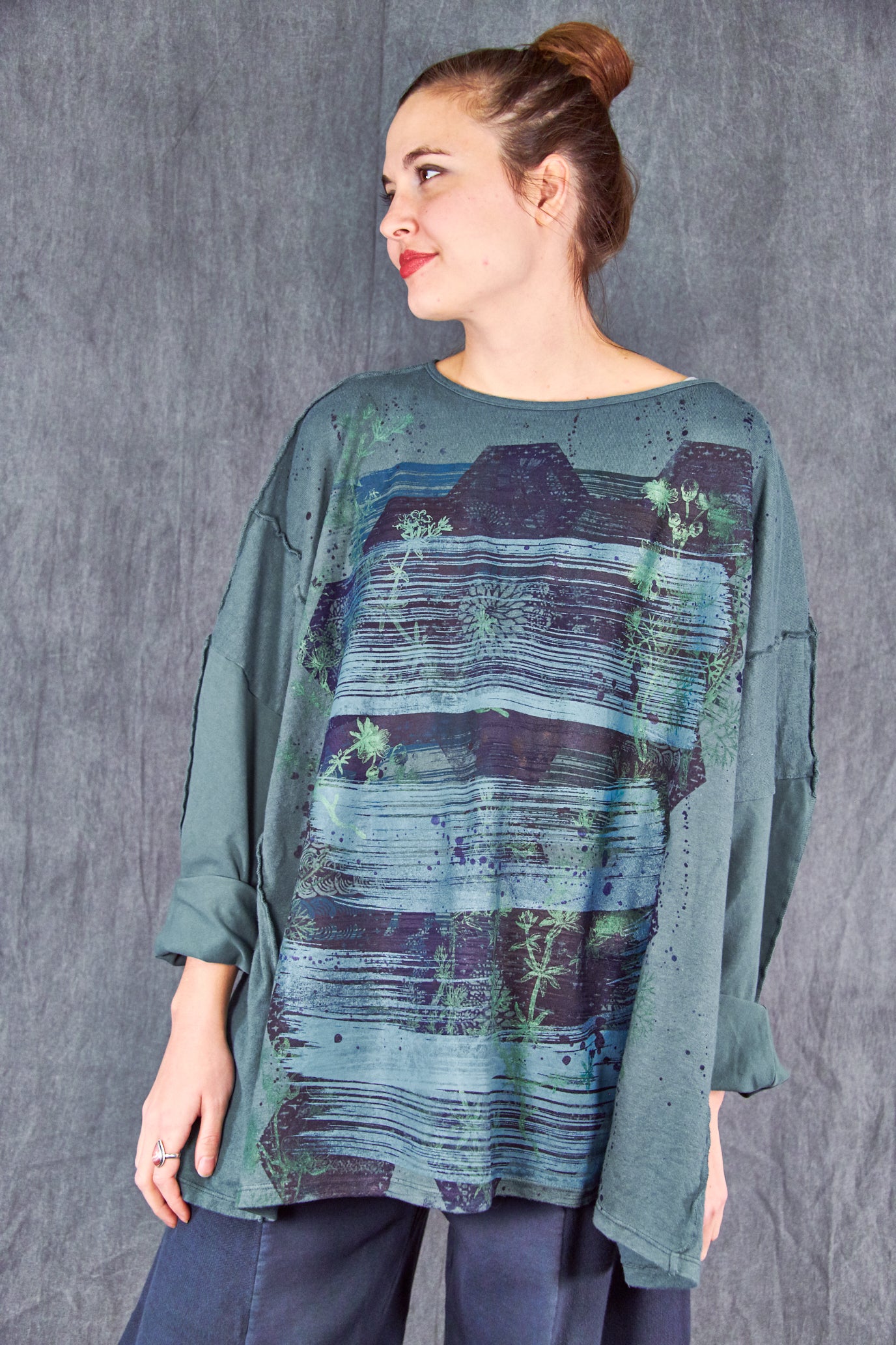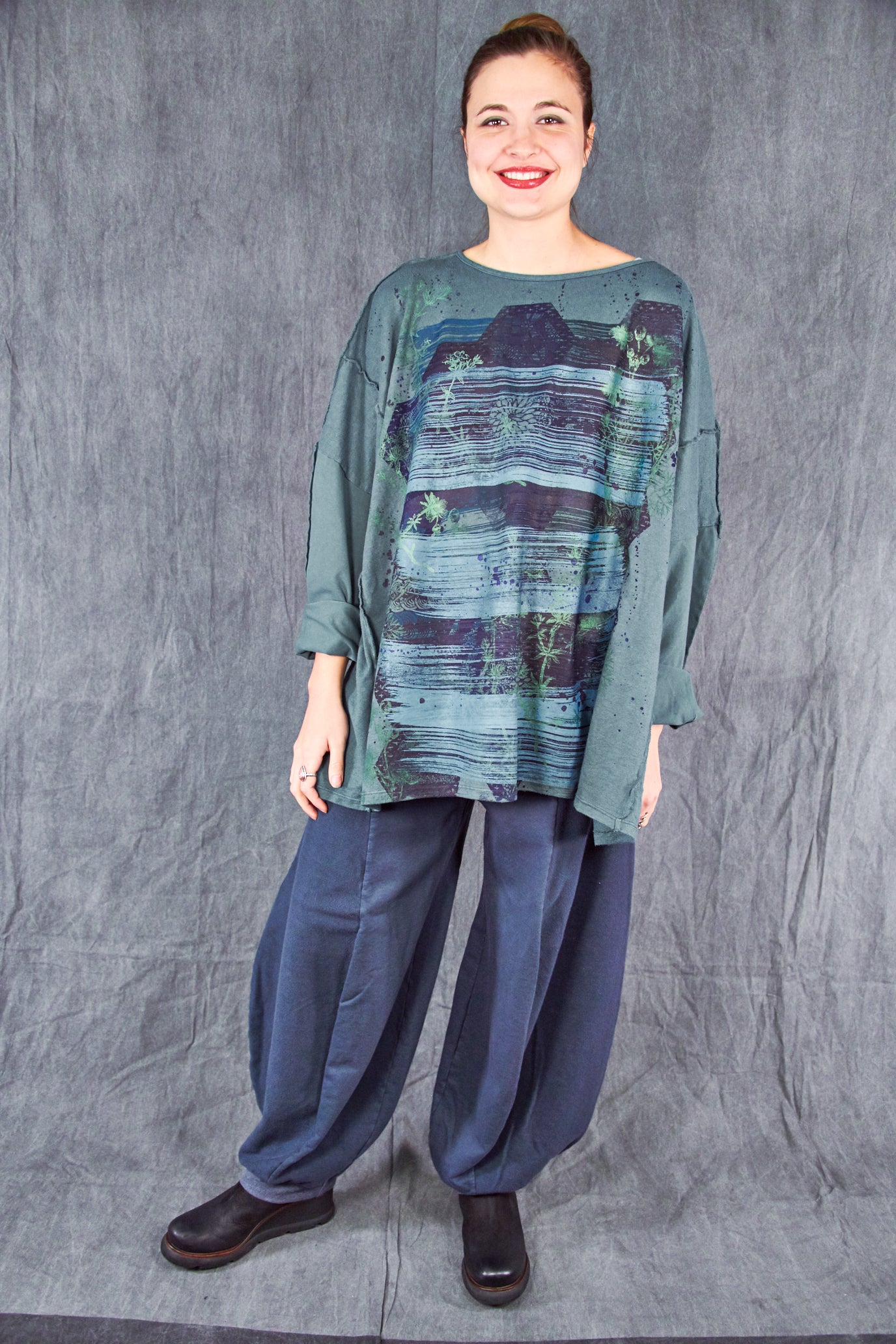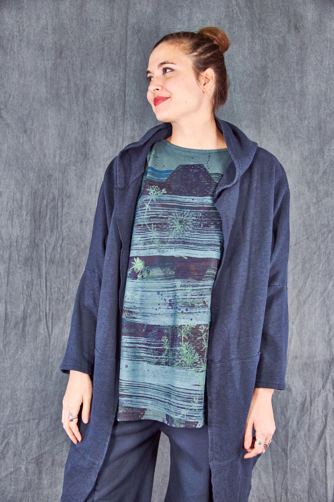 A new style to love ! Organic cotton/hemp mariposa. The sleeves are cotton jersey with outside seam panels in the body to give form to this new twist mariposa- fabric meets art from our studio to create a piece you'll reach for again & again!