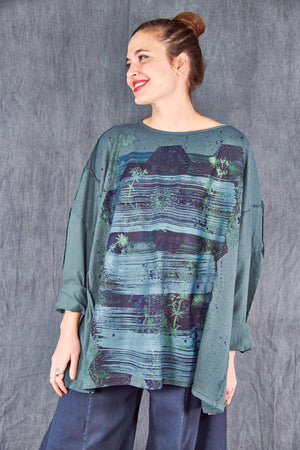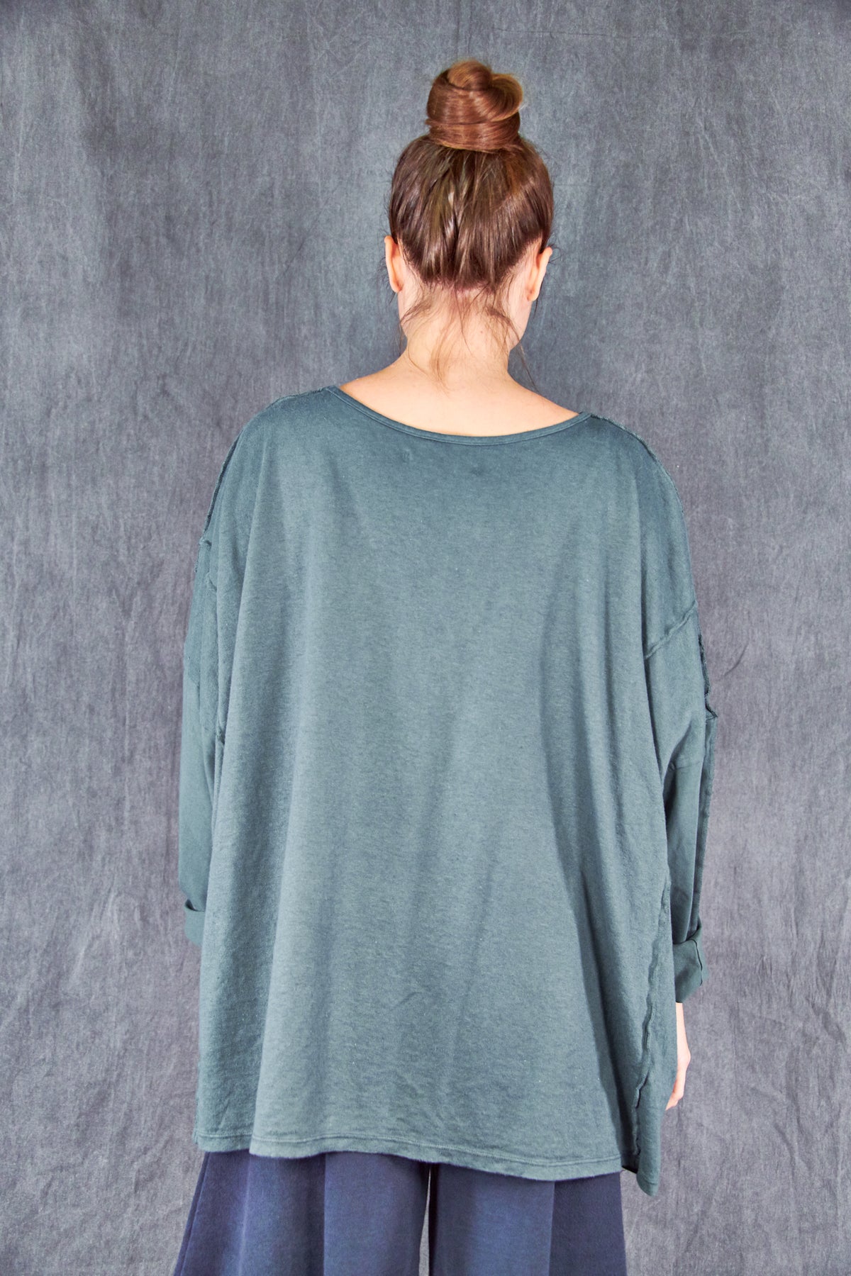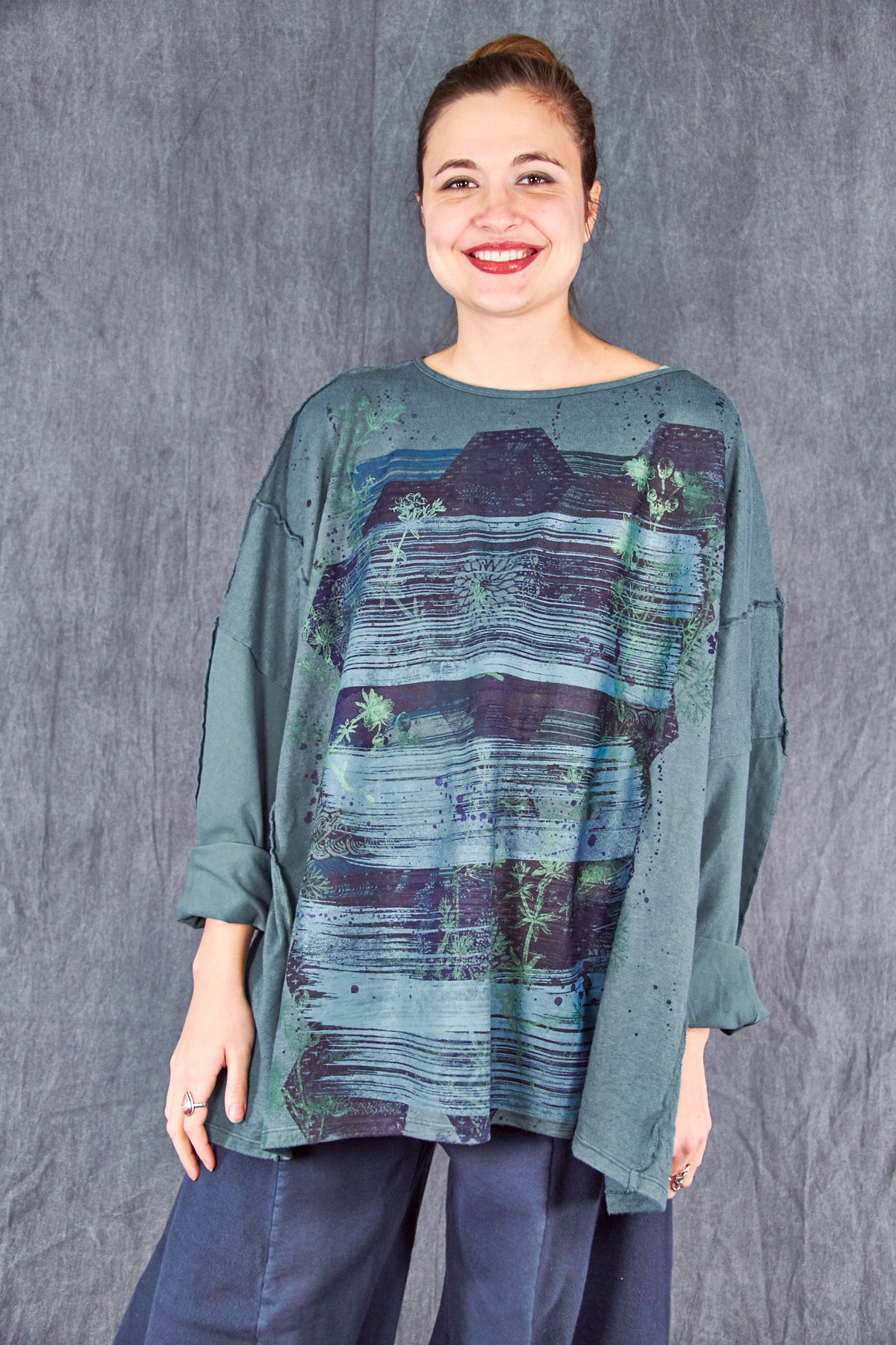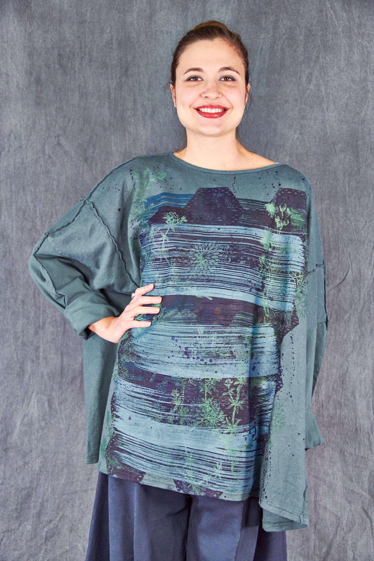 A new style to love ! Organic cotton/hemp mariposa. The sleeves are cotton jersey with outside seam panels in the body to give form to this new twist mariposa- fabric meets art from our studio to create a piece you'll reach for again & again!