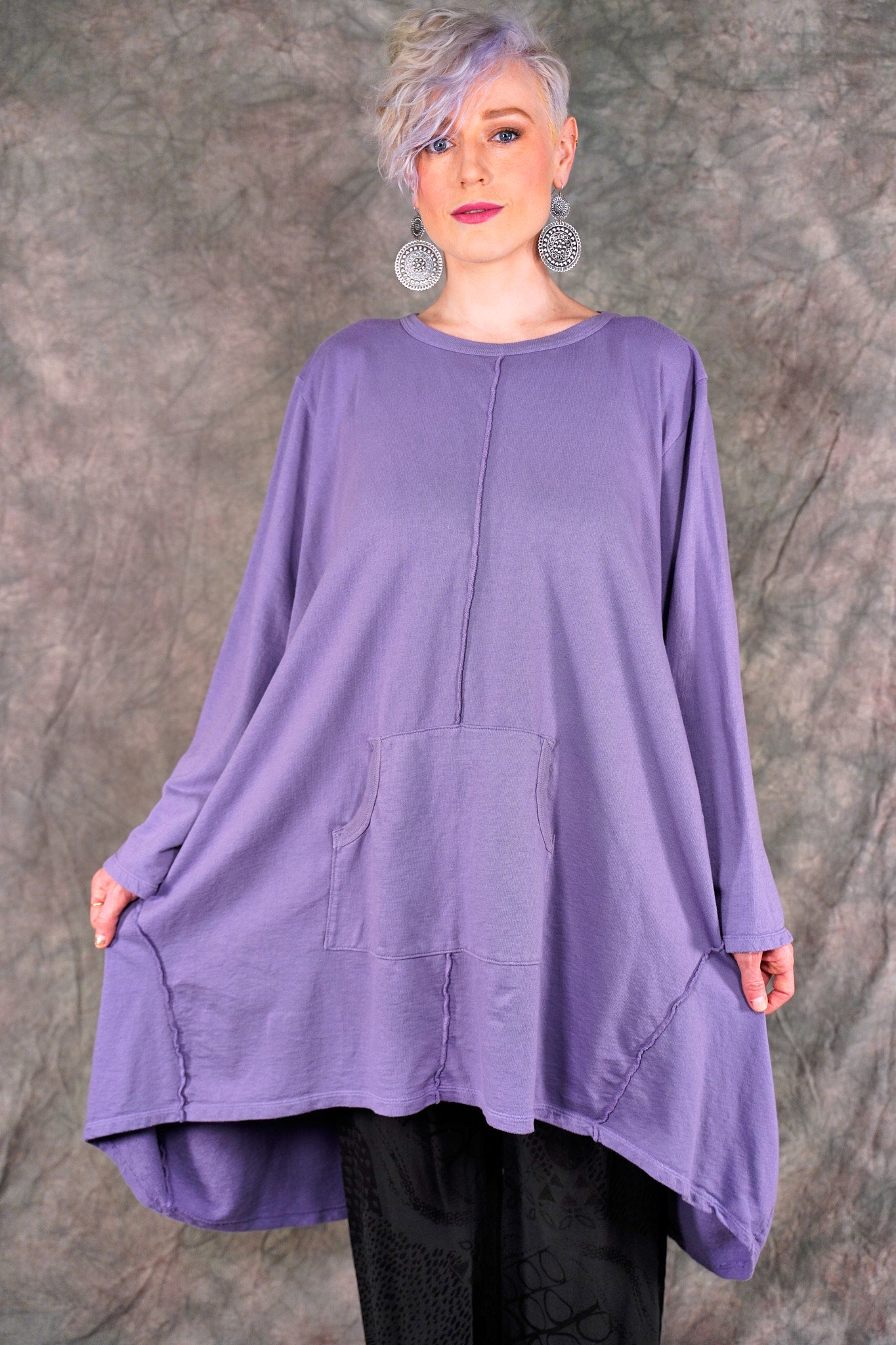 ONLY 1 LEFT super spring piece Oversized, ONE SIZE throw-on sweatshirt with side half moon seaming, cut longer in the back... pocket, A-lined shape, generous and wonderful to layer.