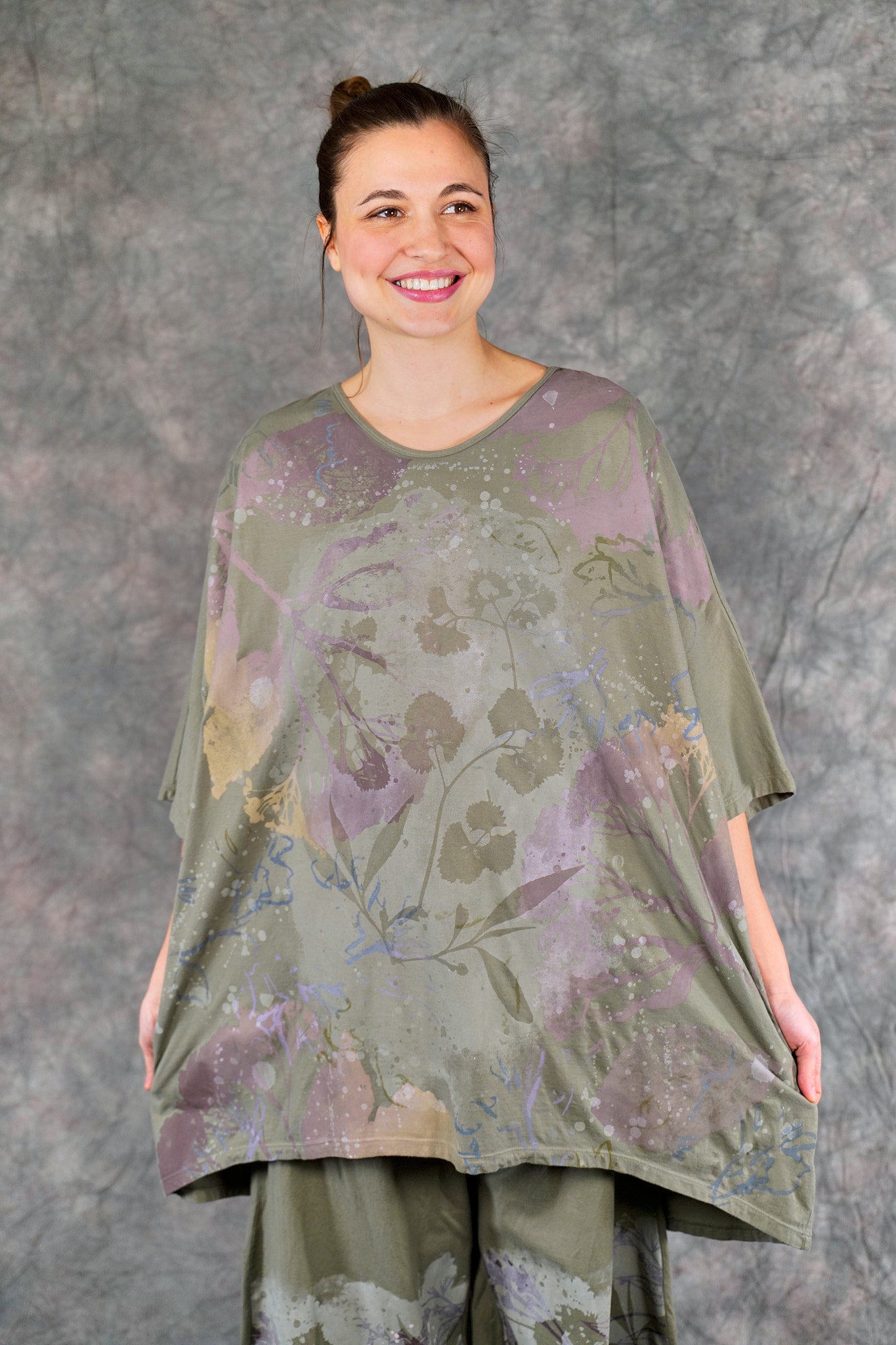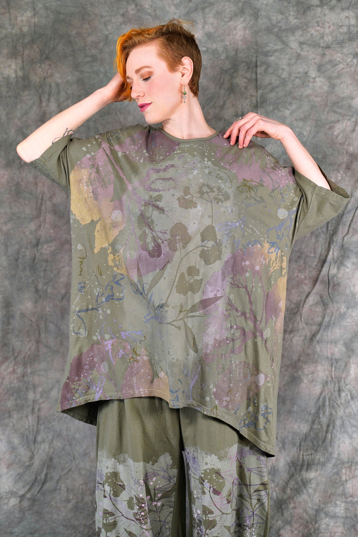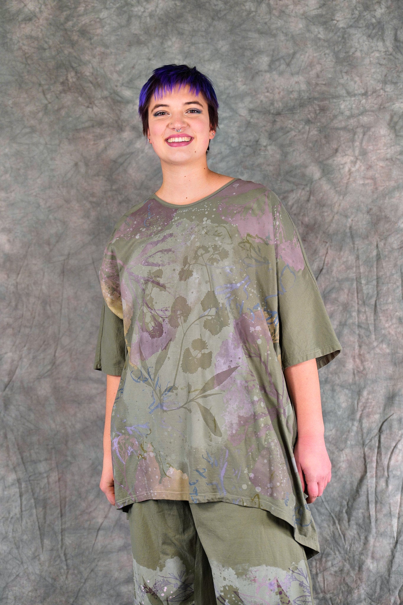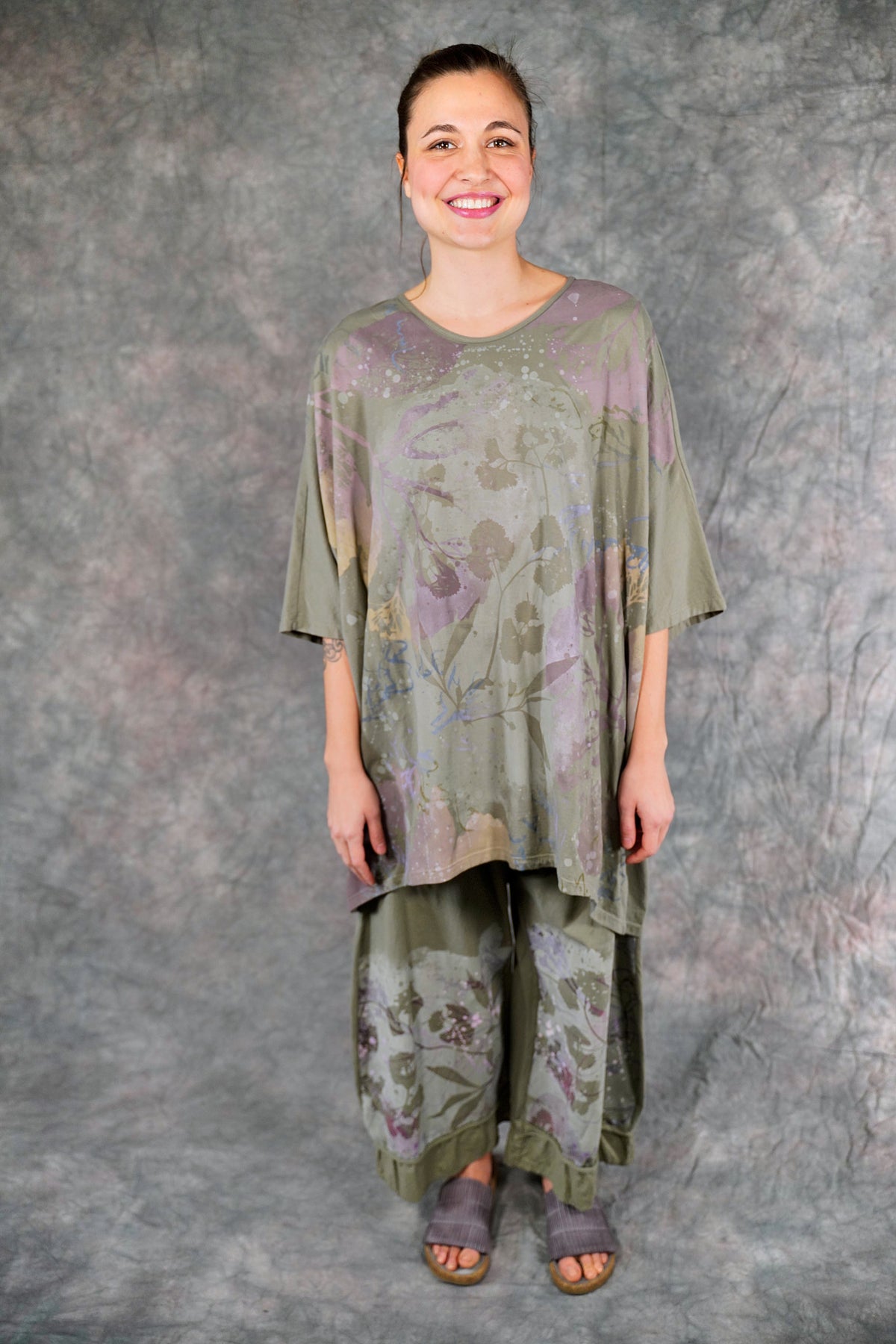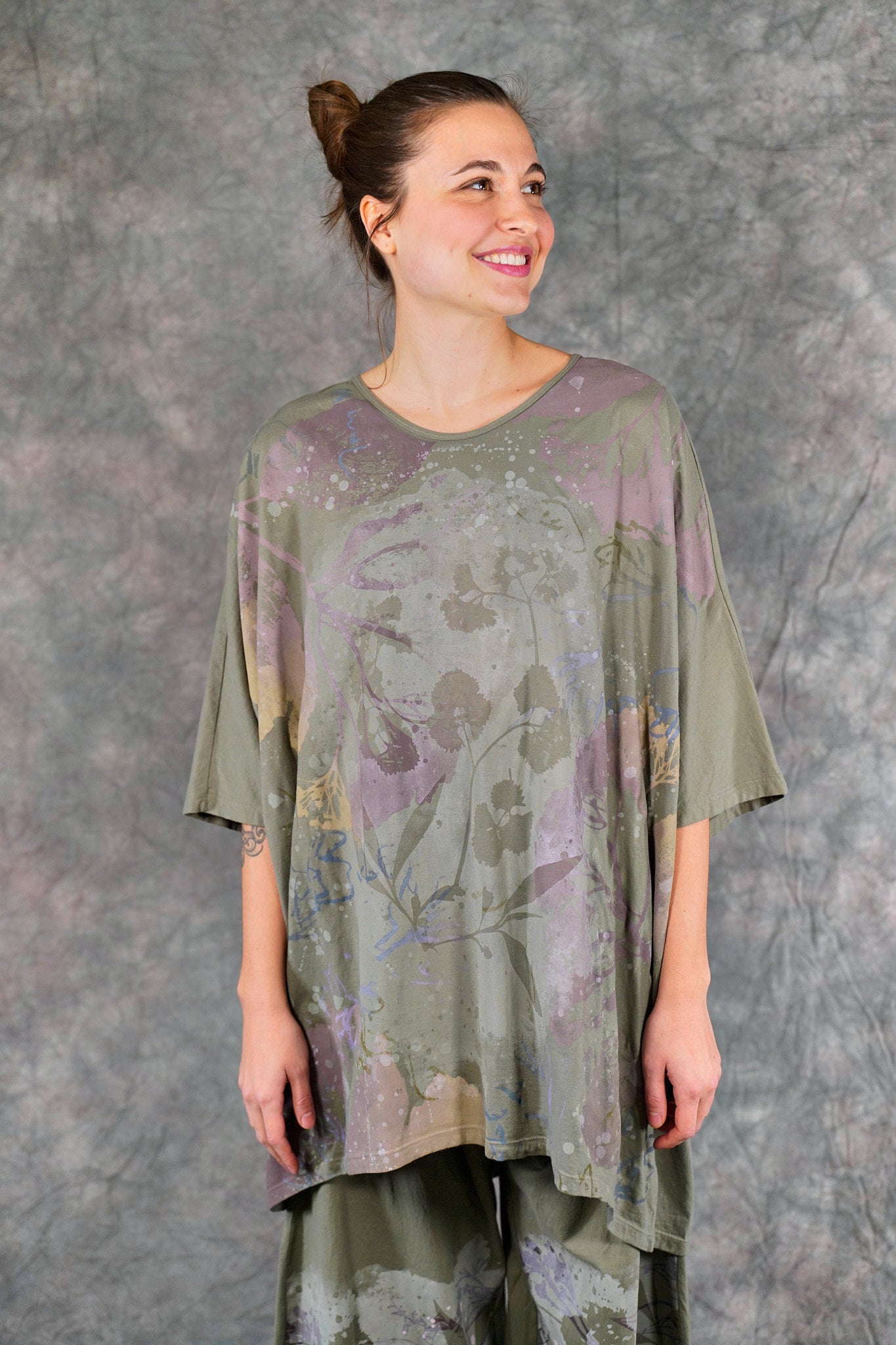 Slightly less wide than our Art Tee, but still generously sized. We think this will become a favorite for many of you! Higher in front, slightly longer in the back. Beautiful, multi layered botanical printing all over the front. This everyday tee is sewn in the USA from our 100% organically grown cotton and it will last and last for years through countless washings!