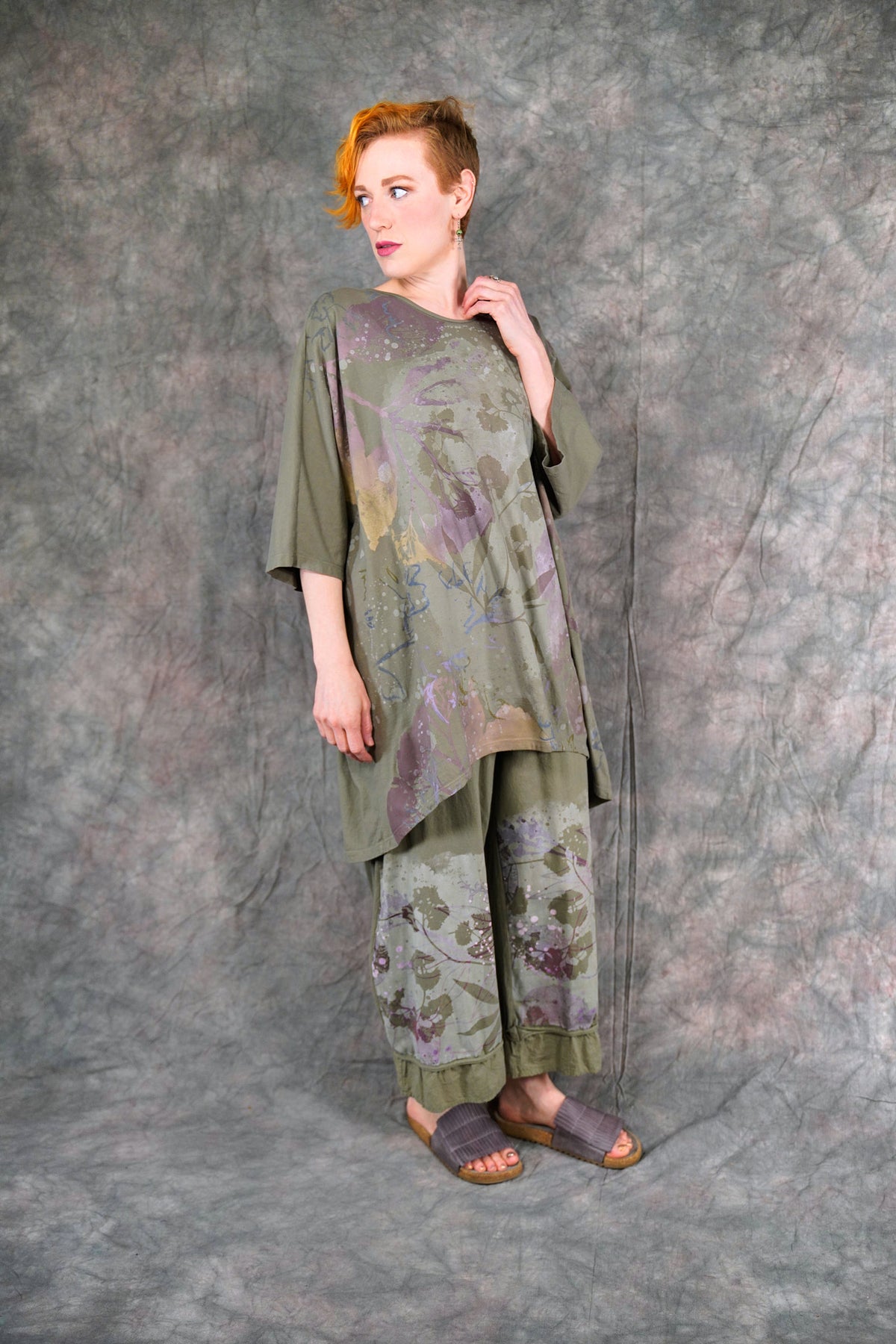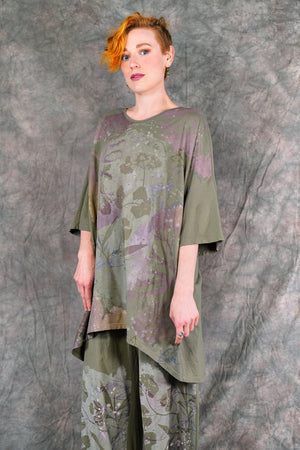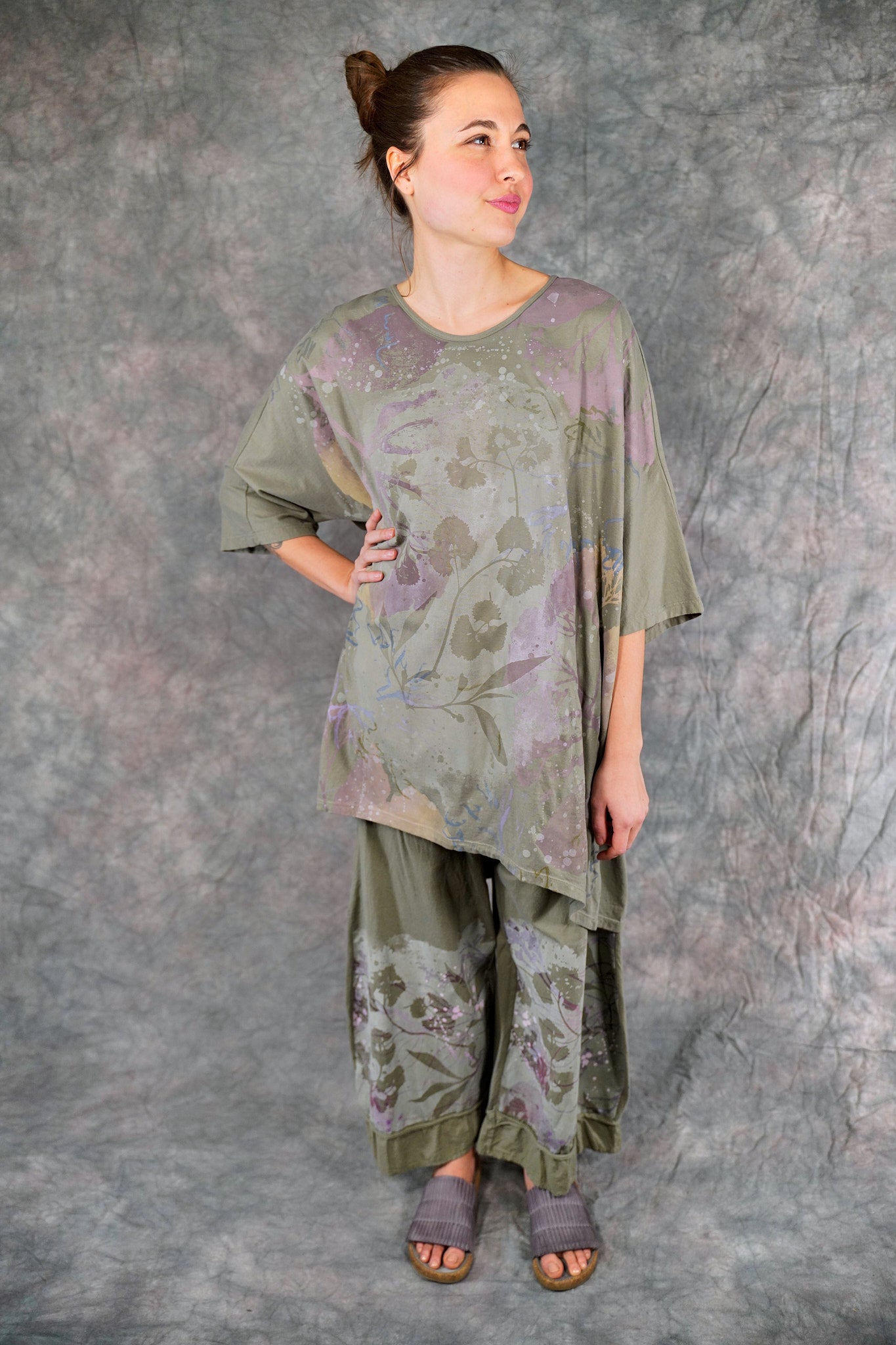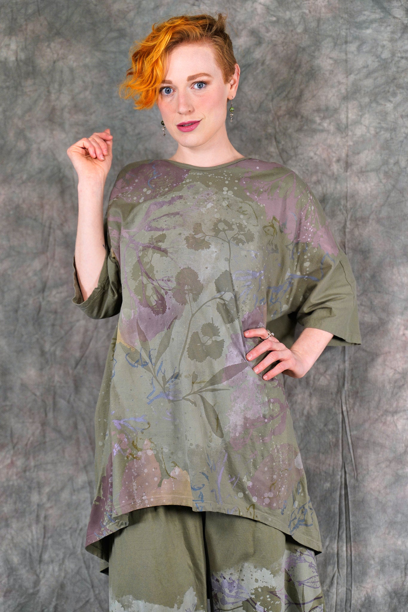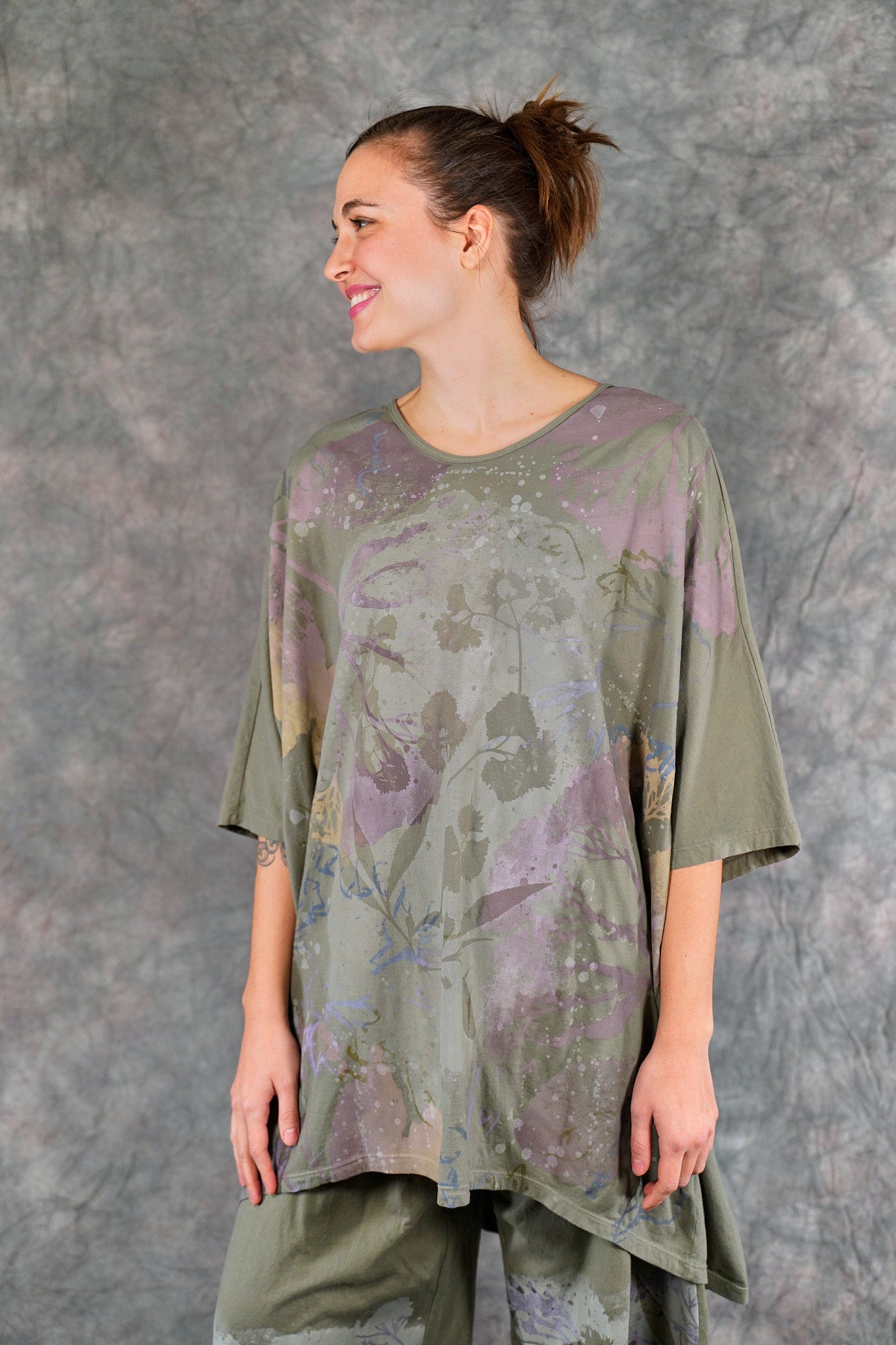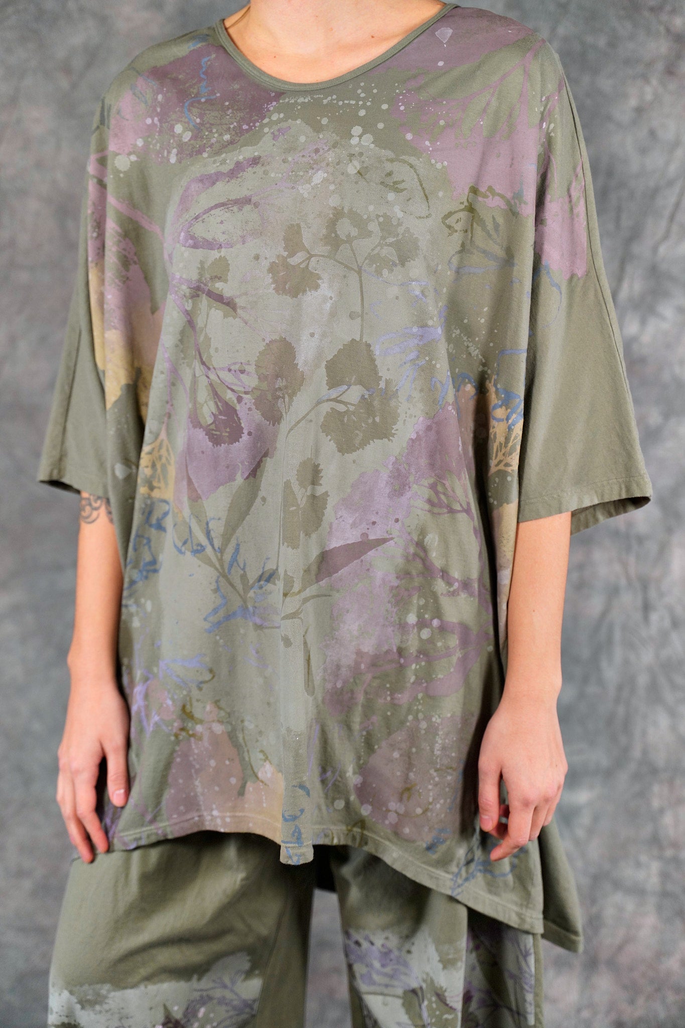 Slightly less wide than our Art Tee, but still generously sized. We think this will become a favorite for many of you! Higher in front, slightly longer in the back. Beautiful, multi layered botanical printing all over the front. This everyday tee is sewn in the USA from our 100% organically grown cotton and it will last and last for years through countless washings!