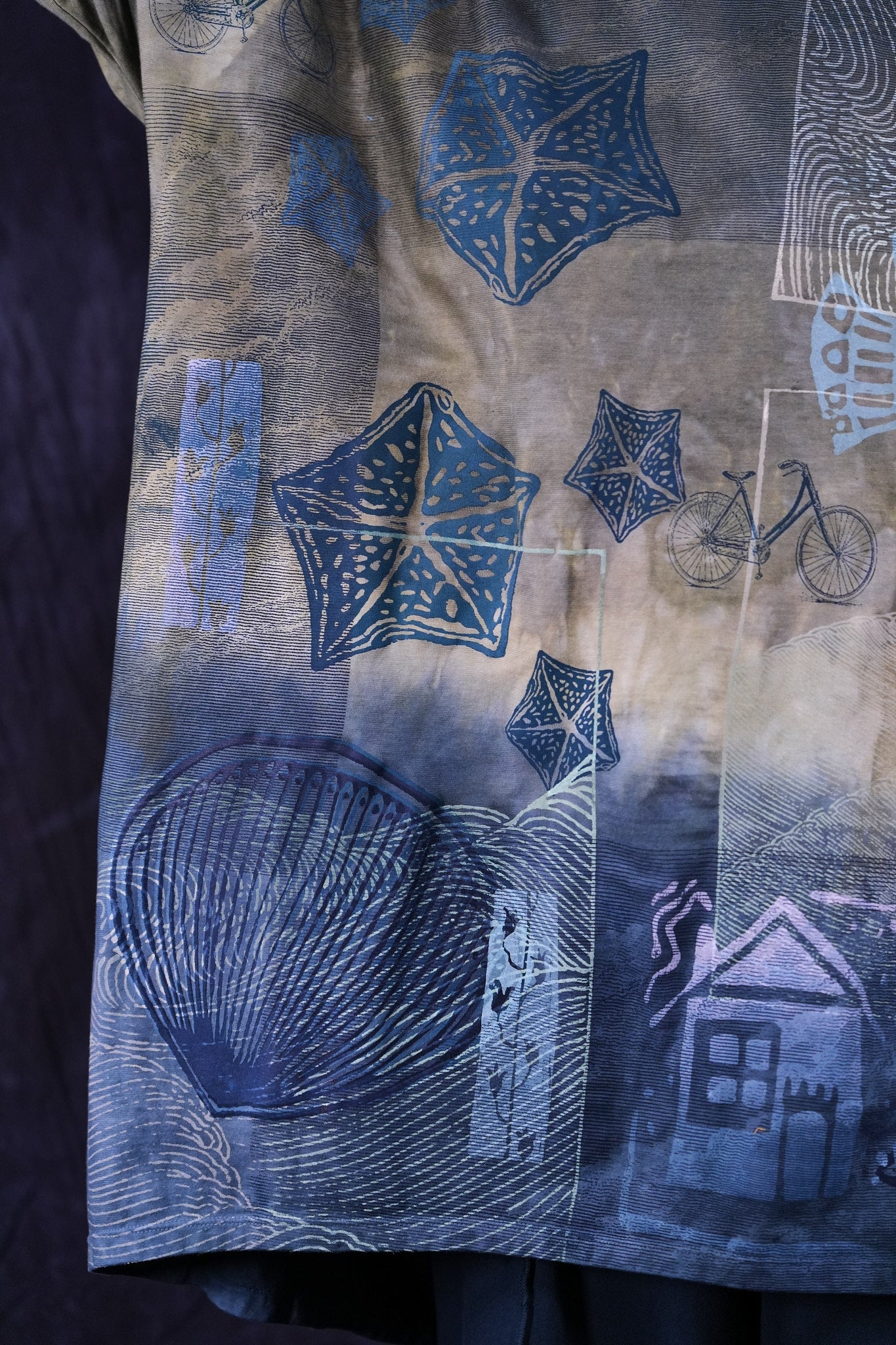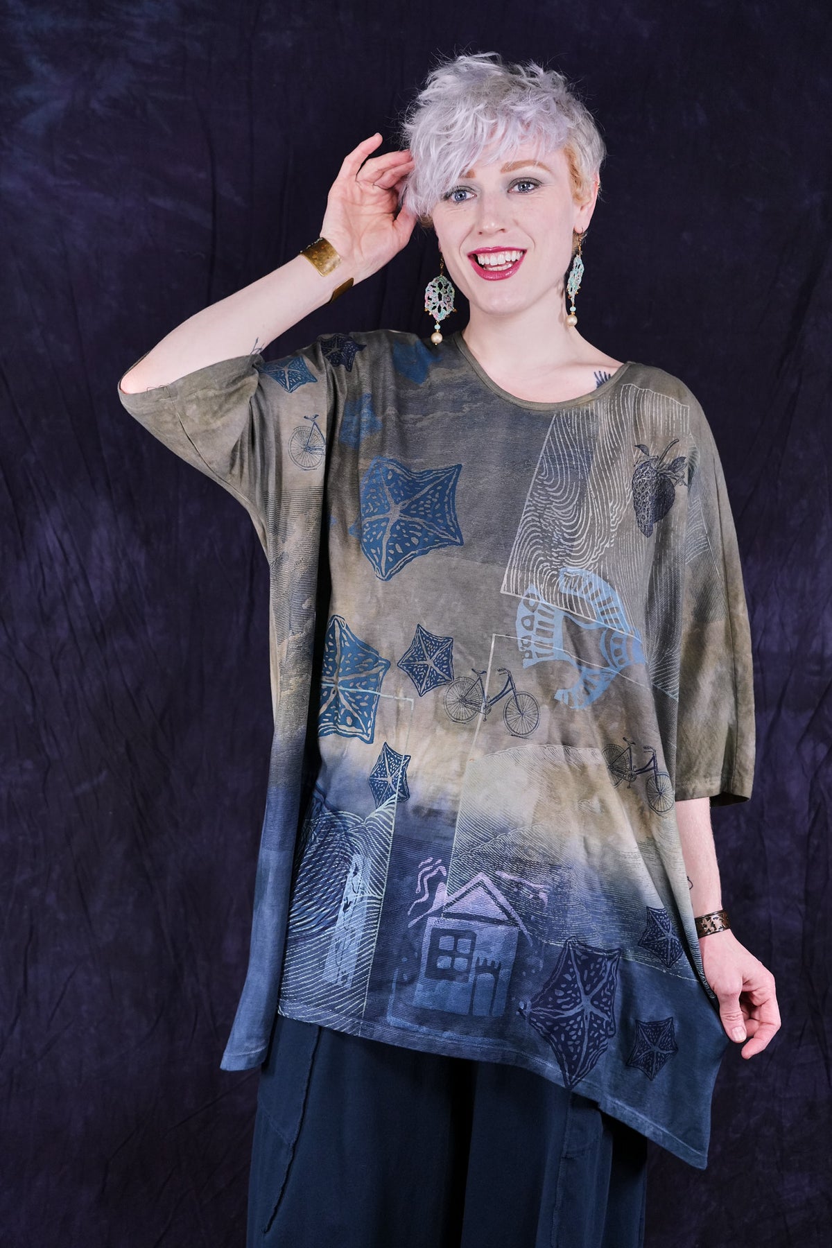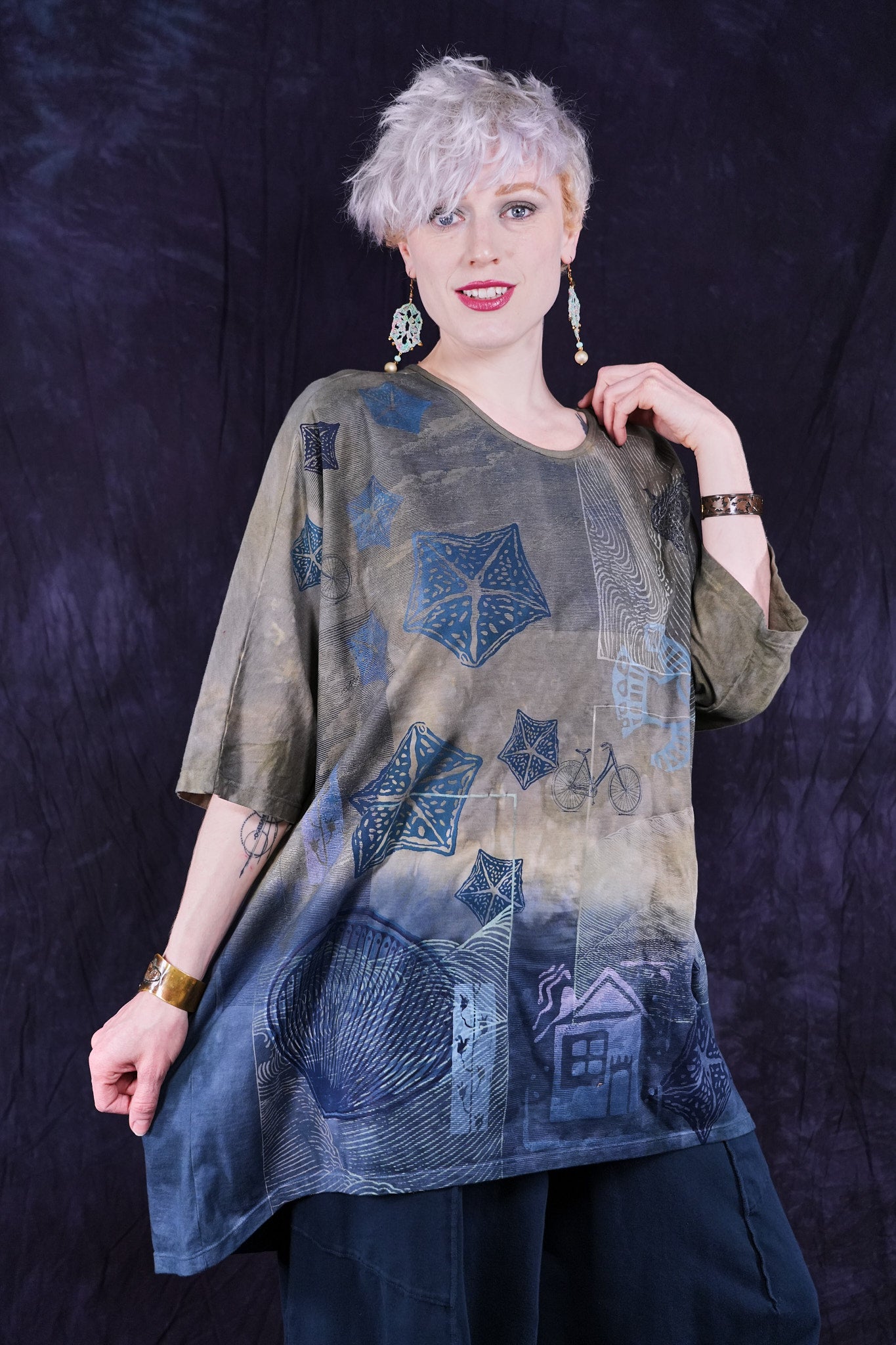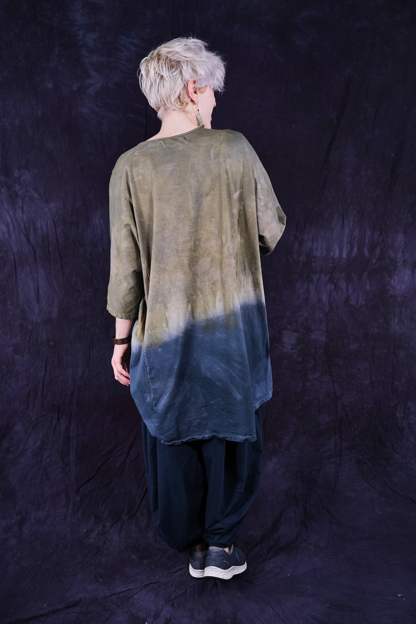 Amazing hand dyed and printed- look closely, and at the back as well. Slightly less wide than our Art Tee, but still generously sized. We think this will become a favorite for many of you! Higher in front, slightly longer in the back. This everyday tee is sewn in the USA from our 100% organically grown cotton and it will last and last for years through countless washings!