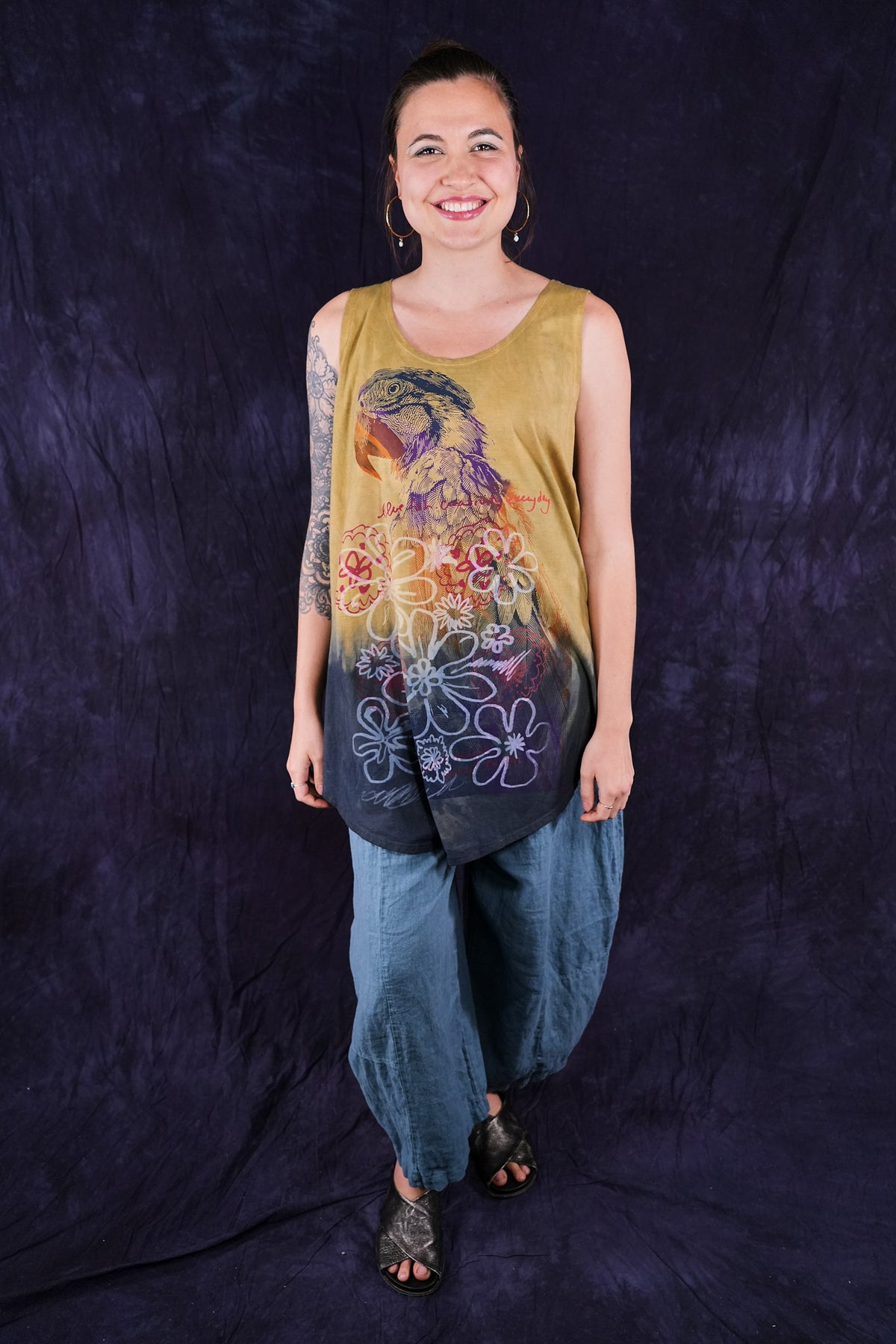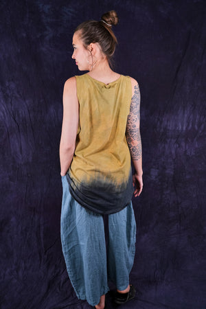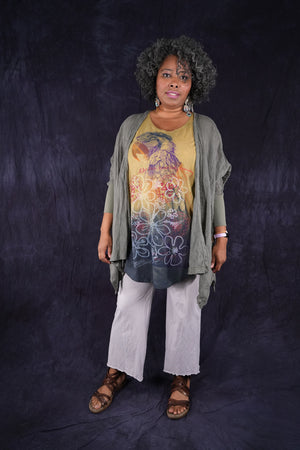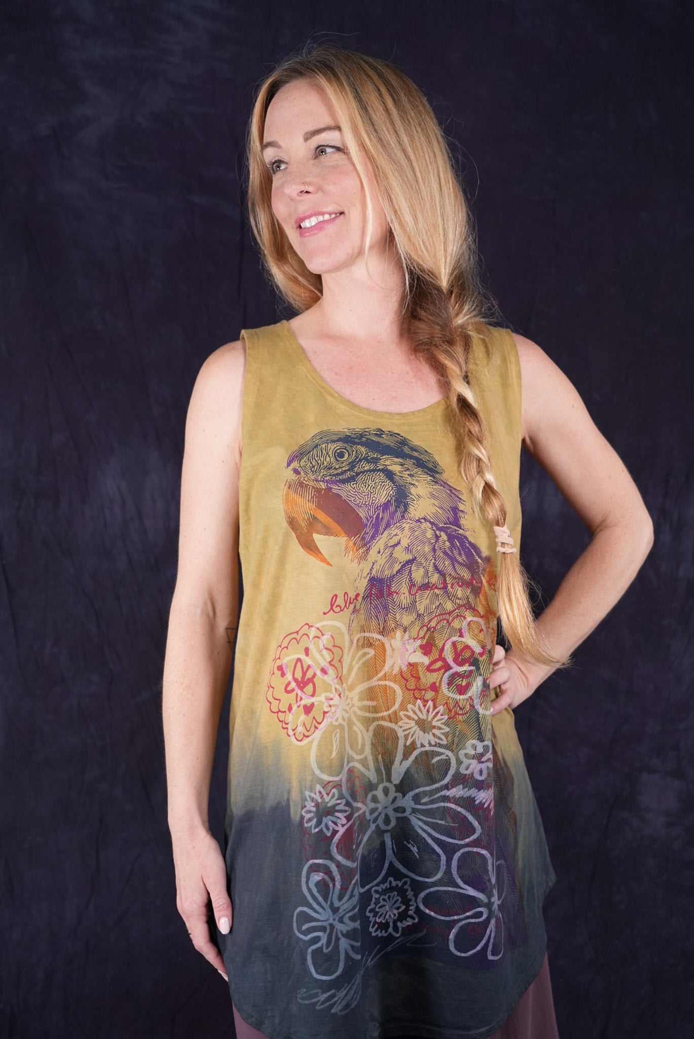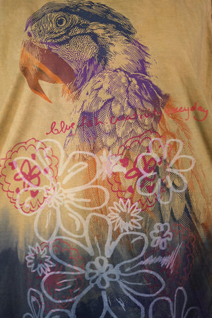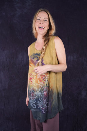Macaw; blue fish creativity every day. You will never again find anything like this! Hand printed layers overprint double hand dyed, ombre dip over a long organic cotton sleeveless tunic top. True ART by hand made in the USA by creative, positive people. Many hands made this super-special piece.
