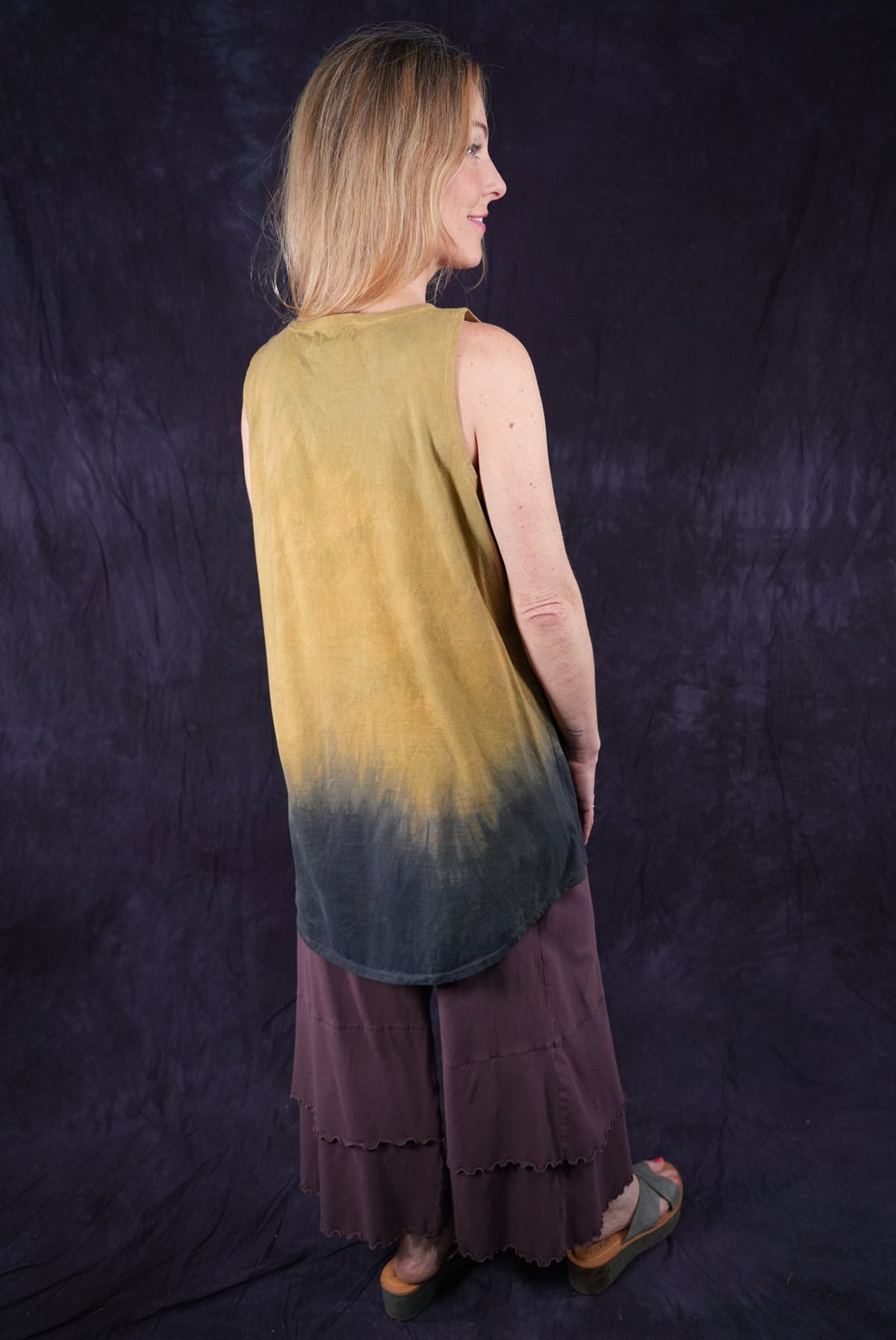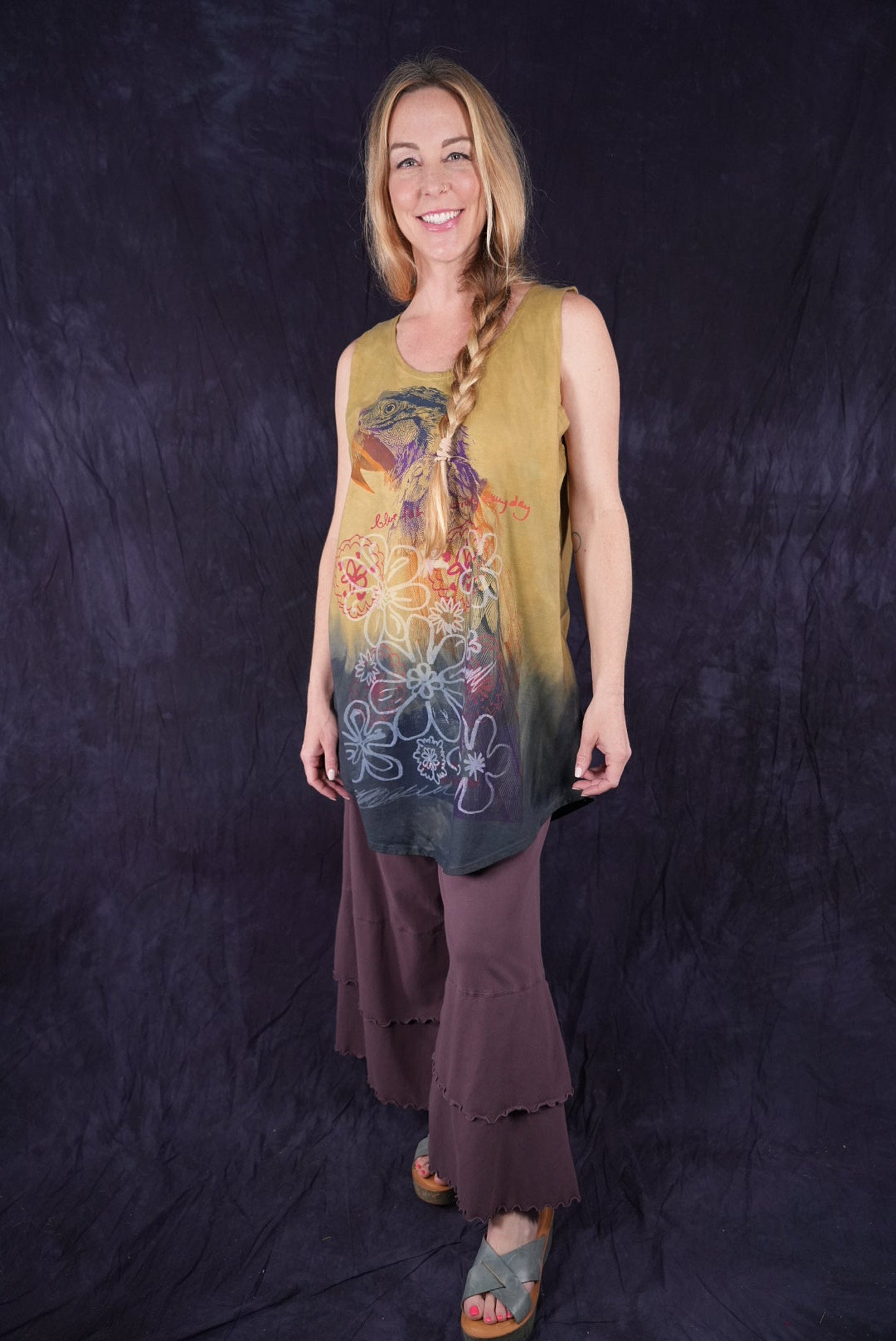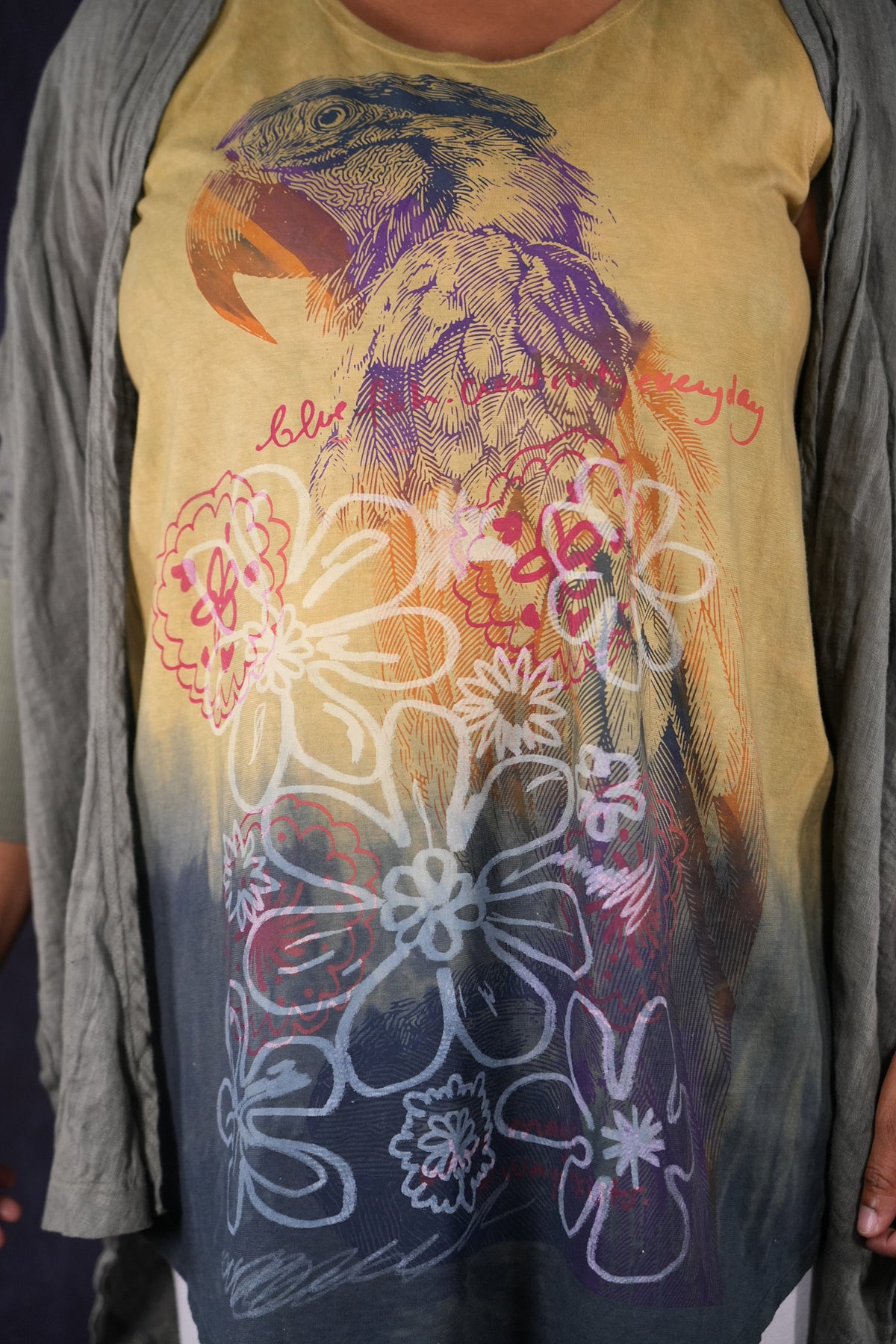 Macaw; blue fish creativity every day. You will never again find anything like this! Hand printed layers overprint double hand dyed, ombre dip over a long organic cotton sleeveless tunic top. True ART by hand made in the USA by creative, positive people. Many hands made this super-special piece.
