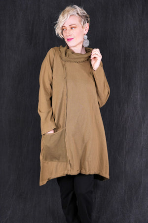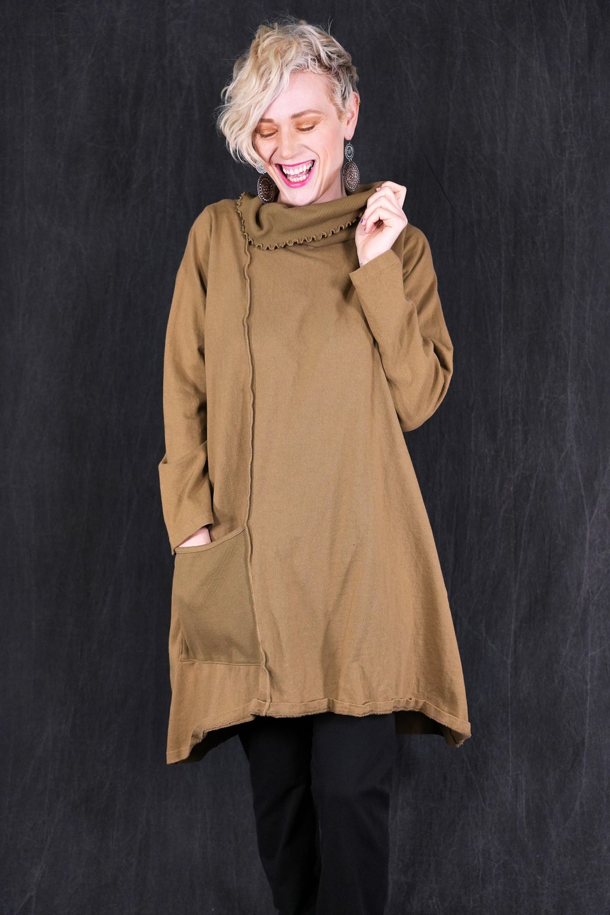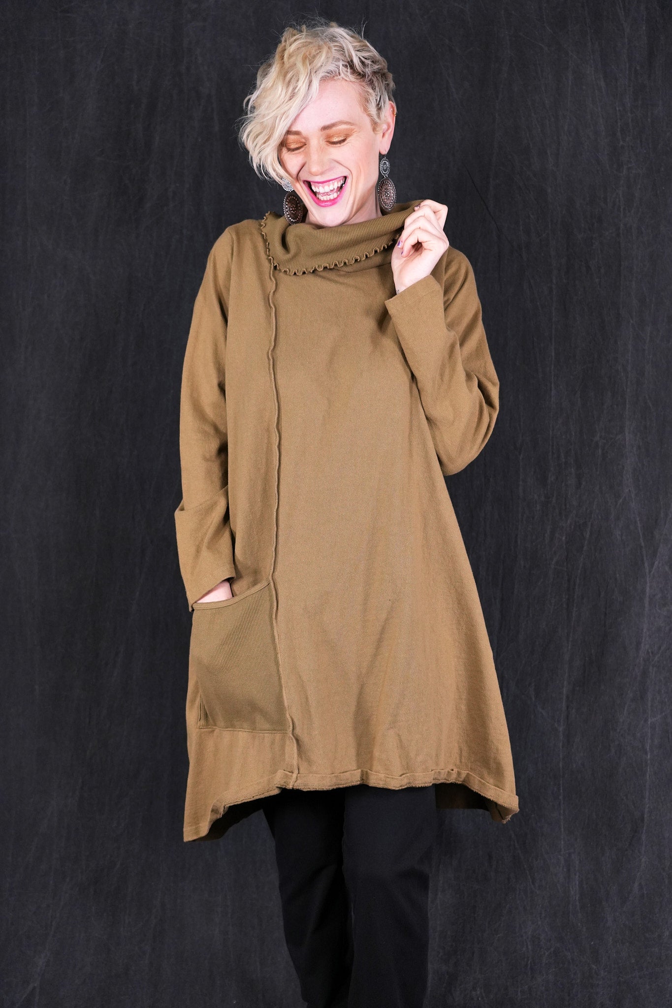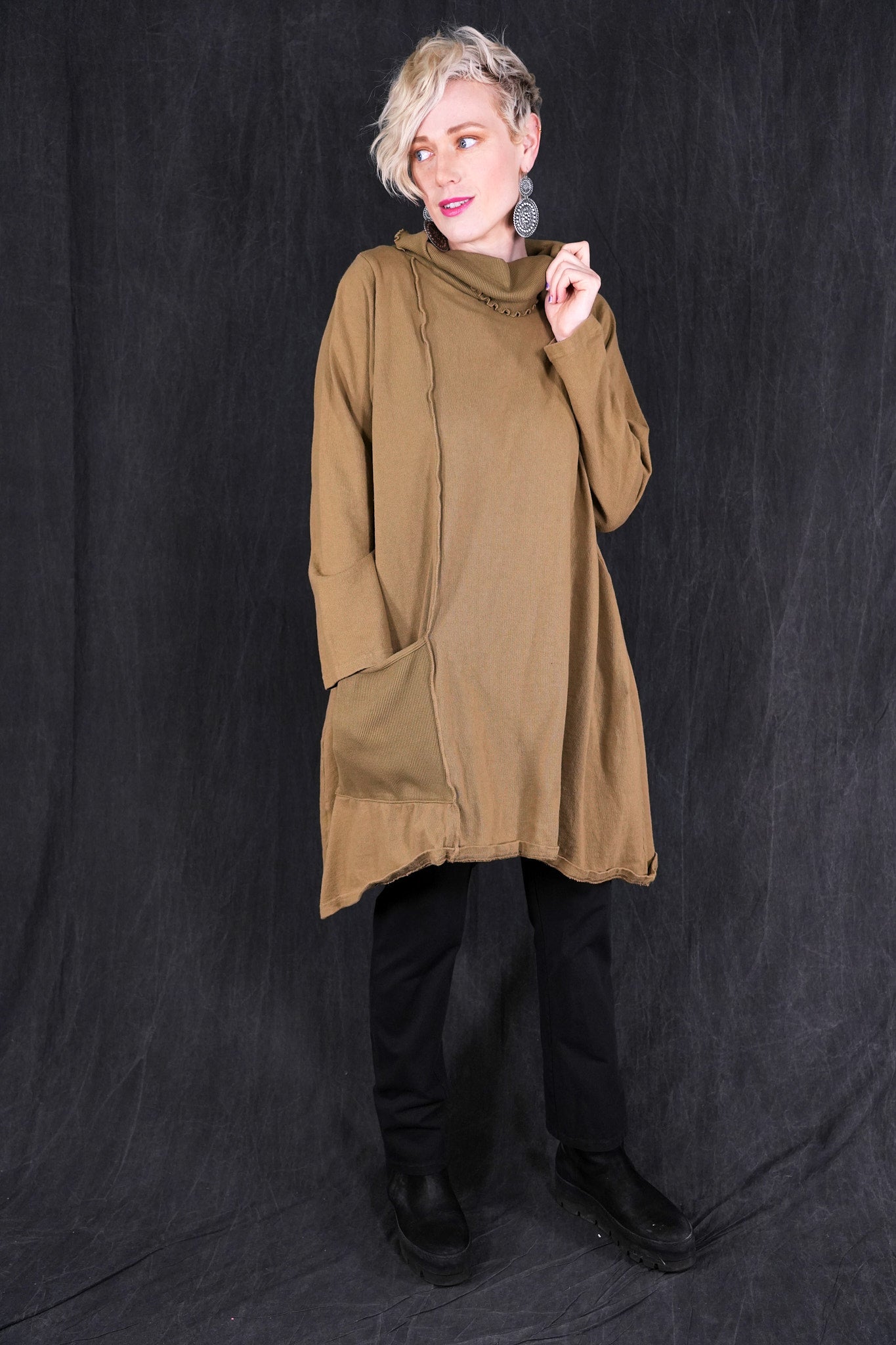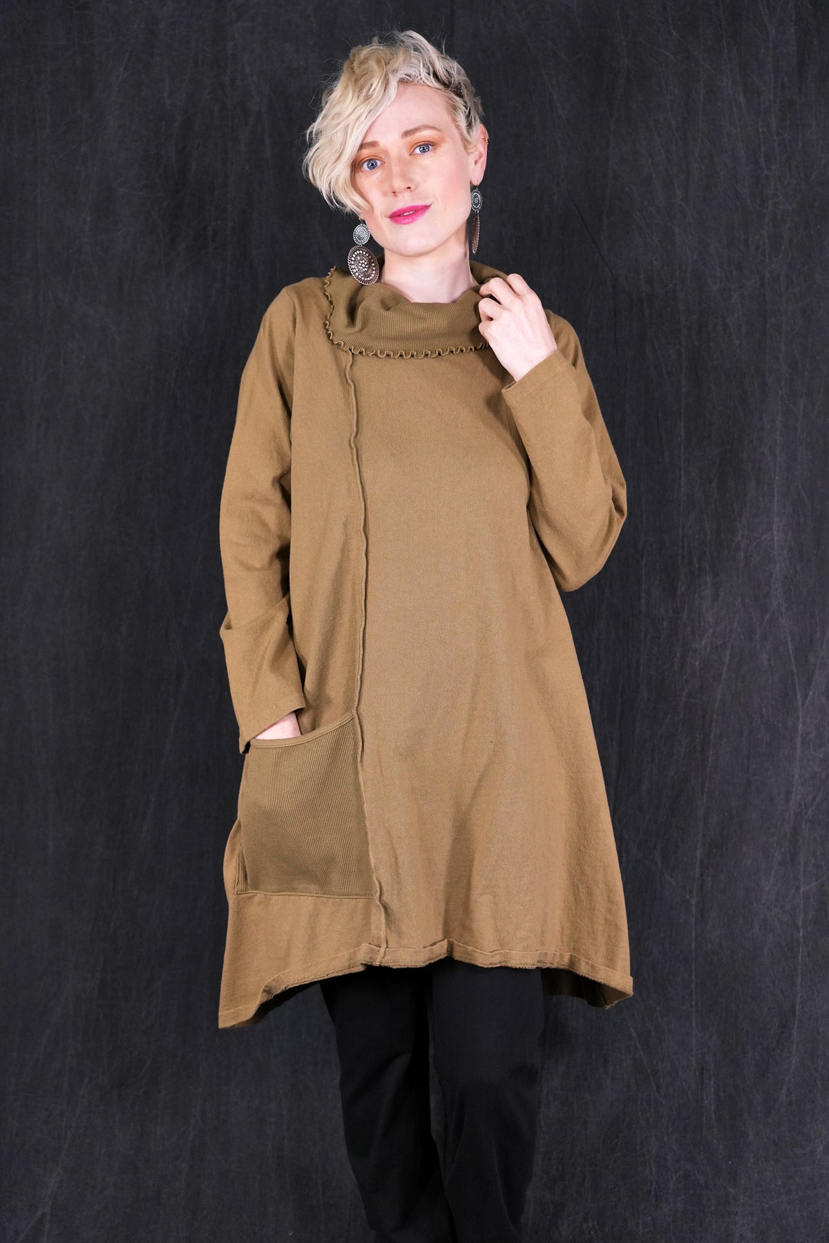 This new tunic is made of heavier, slightly textured reprocessed cotton knit, with details made of organic thermal. offset seaming in front and back, asymmetrical pocket. An easy tunic to wear on colder days.