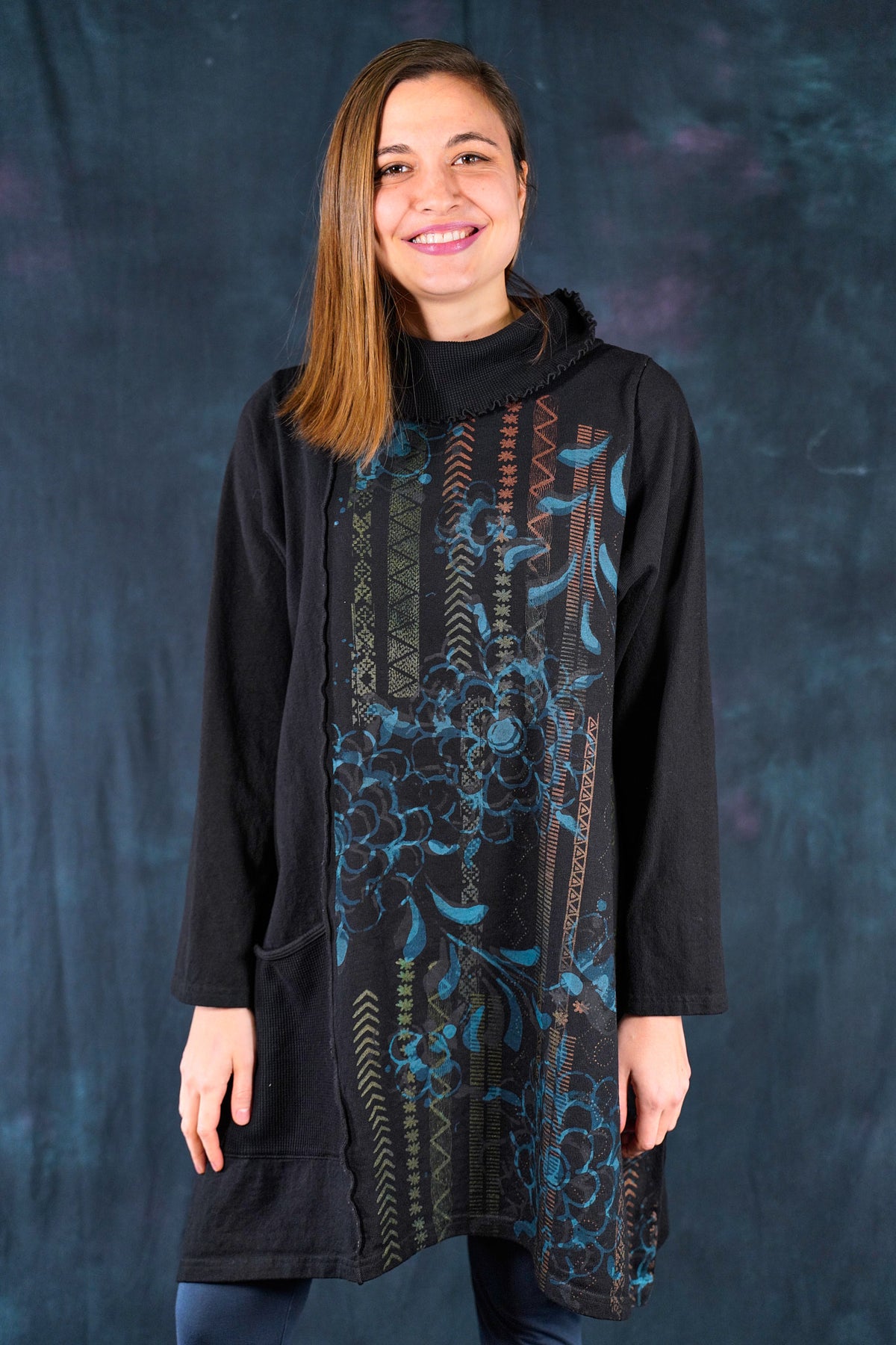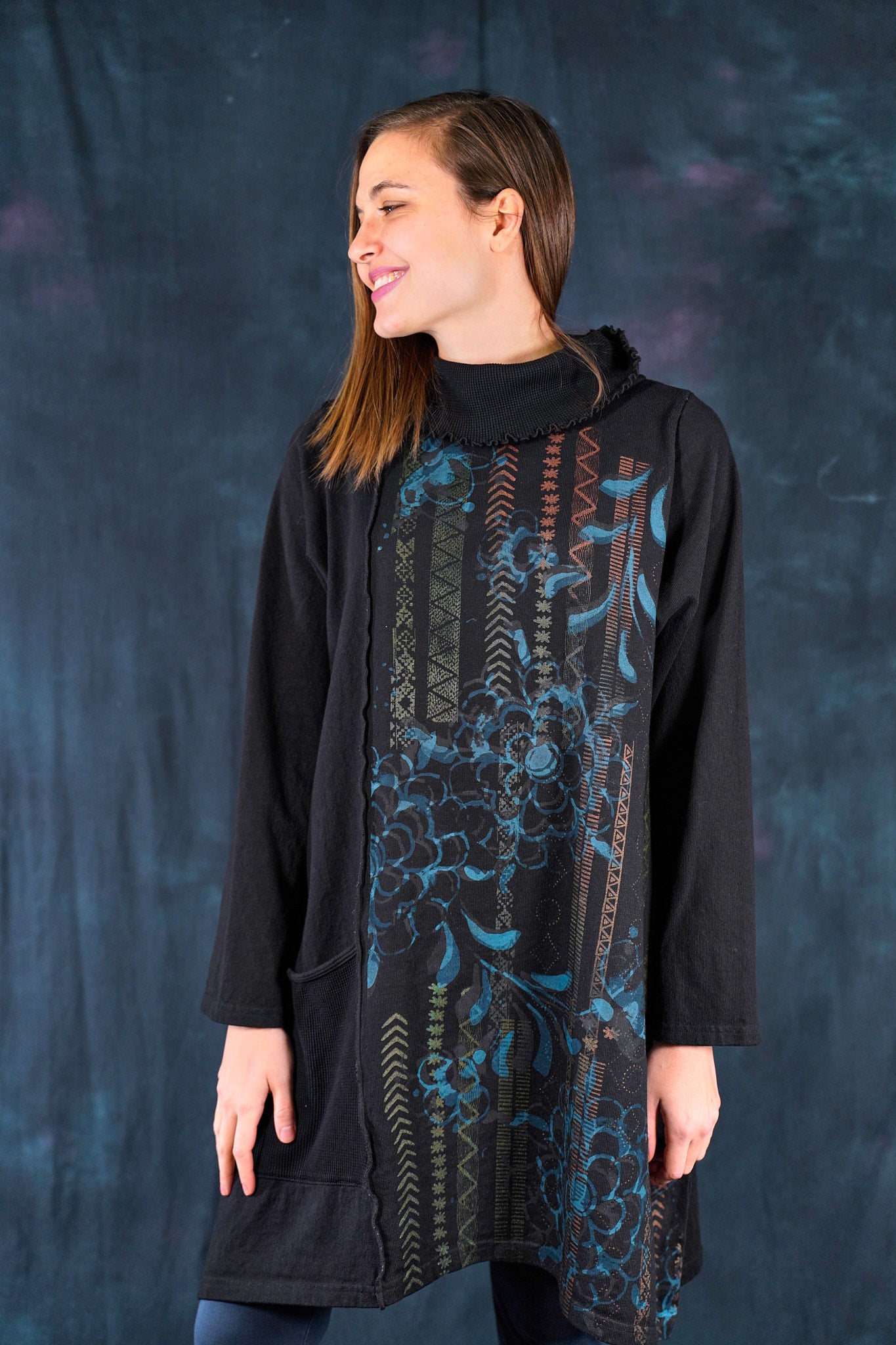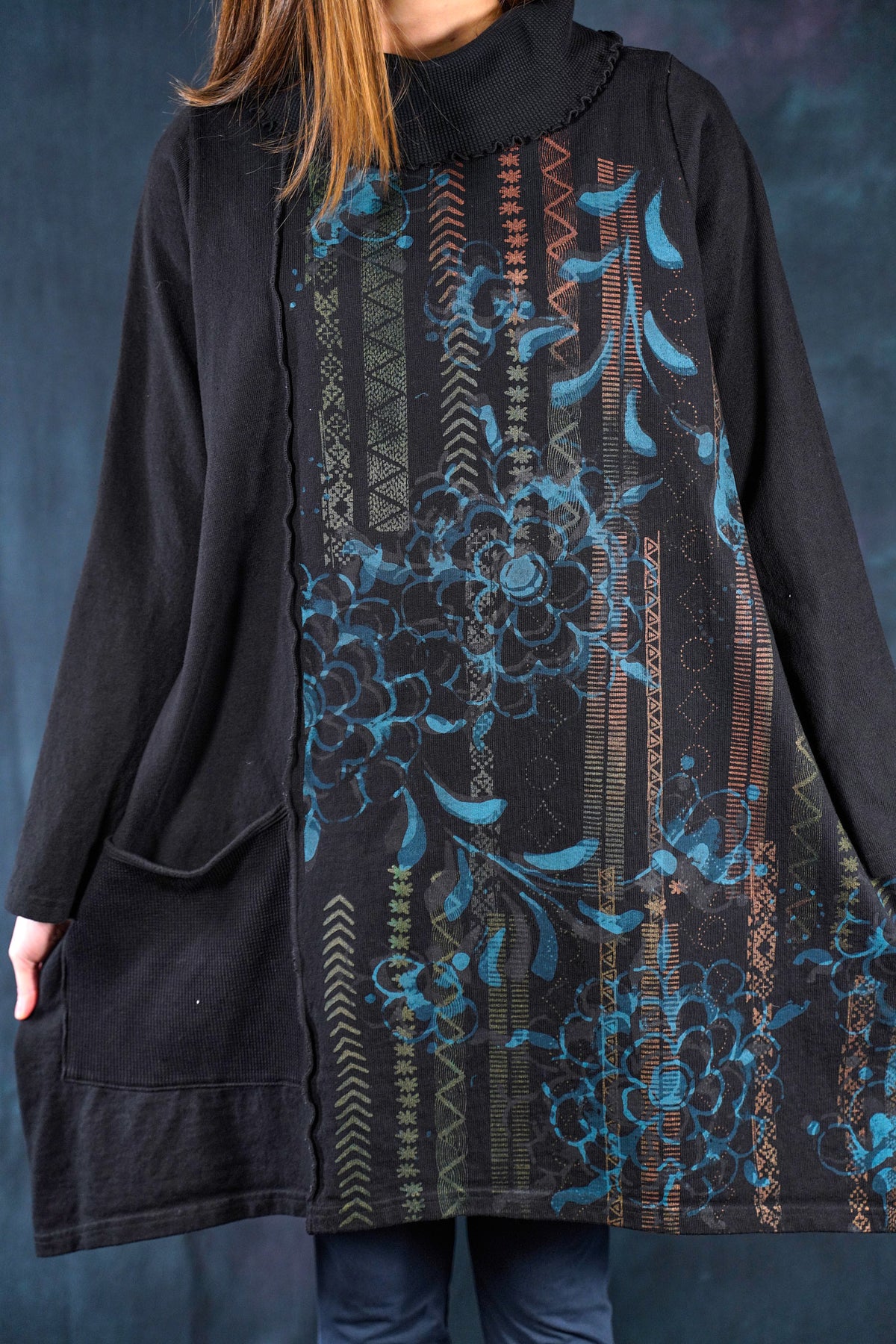 This new tunic is made of heavier, slightly textured reprocessed cotton knit, with details made of organic thermal. offset seaming in front and back, asymmetrical pocket. An easy tunic to wear on colder days. Hand printed with layered textures and vines... wears easily with simple black or any other pieces you have that pick up the colors in the print.