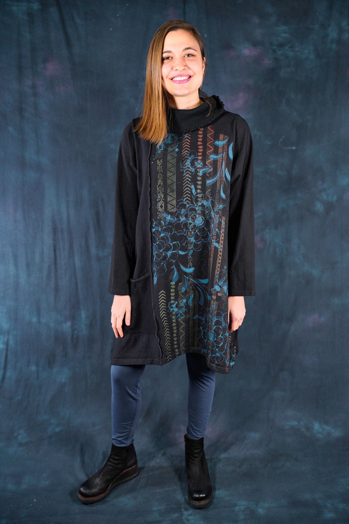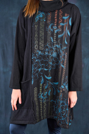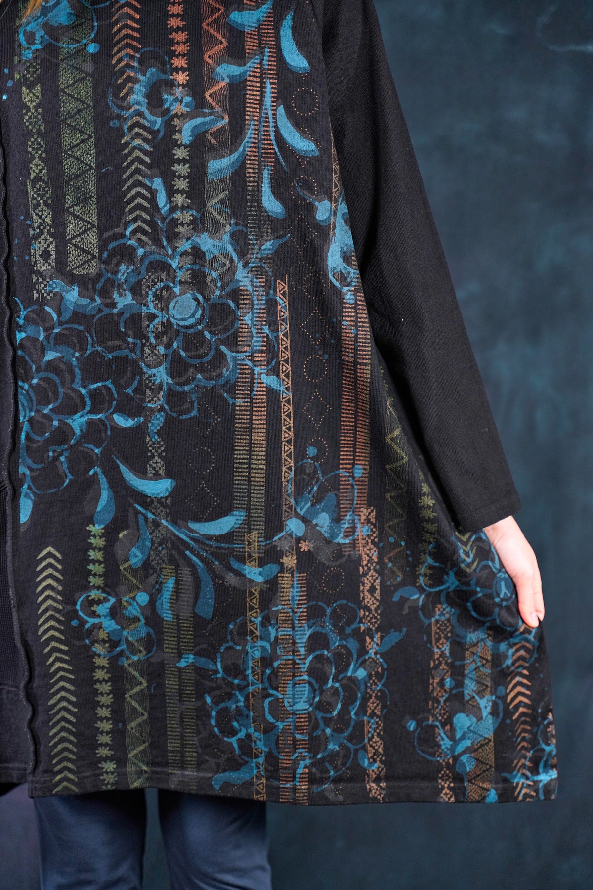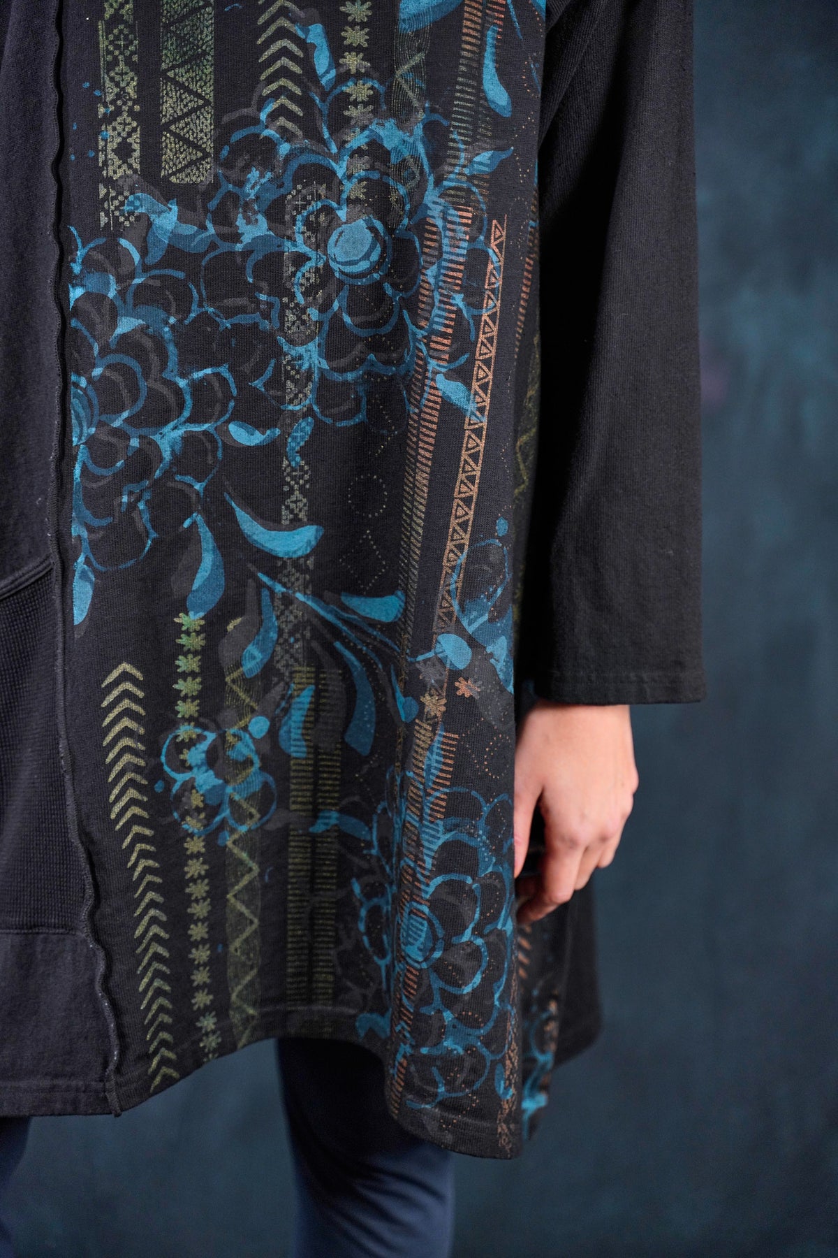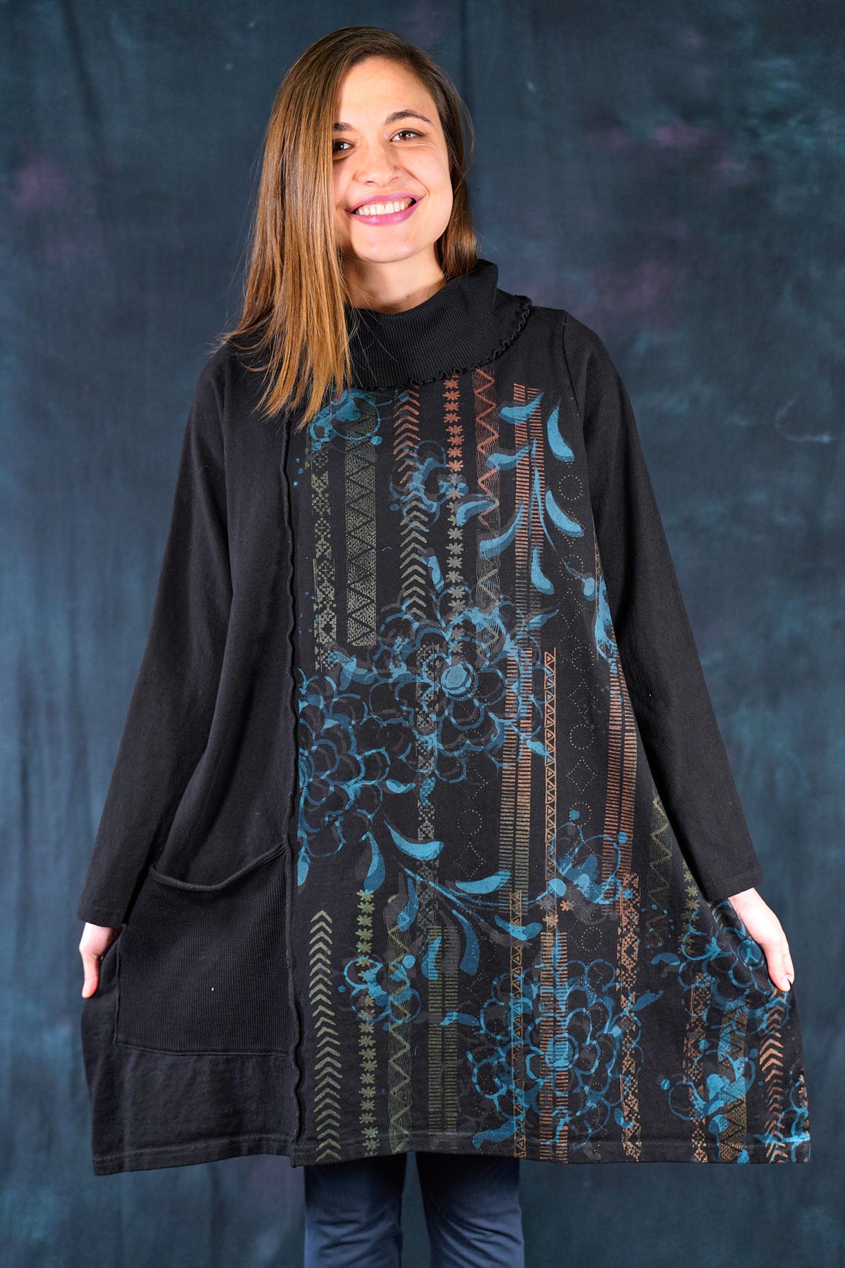 This new tunic is made of heavier, slightly textured reprocessed cotton knit, with details made of organic thermal. offset seaming in front and back, asymmetrical pocket. An easy tunic to wear on colder days. Hand printed with layered textures and vines... wears easily with simple black or any other pieces you have that pick up the colors in the print.