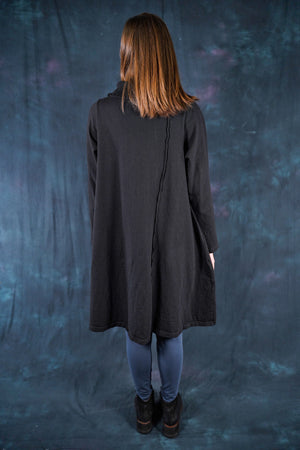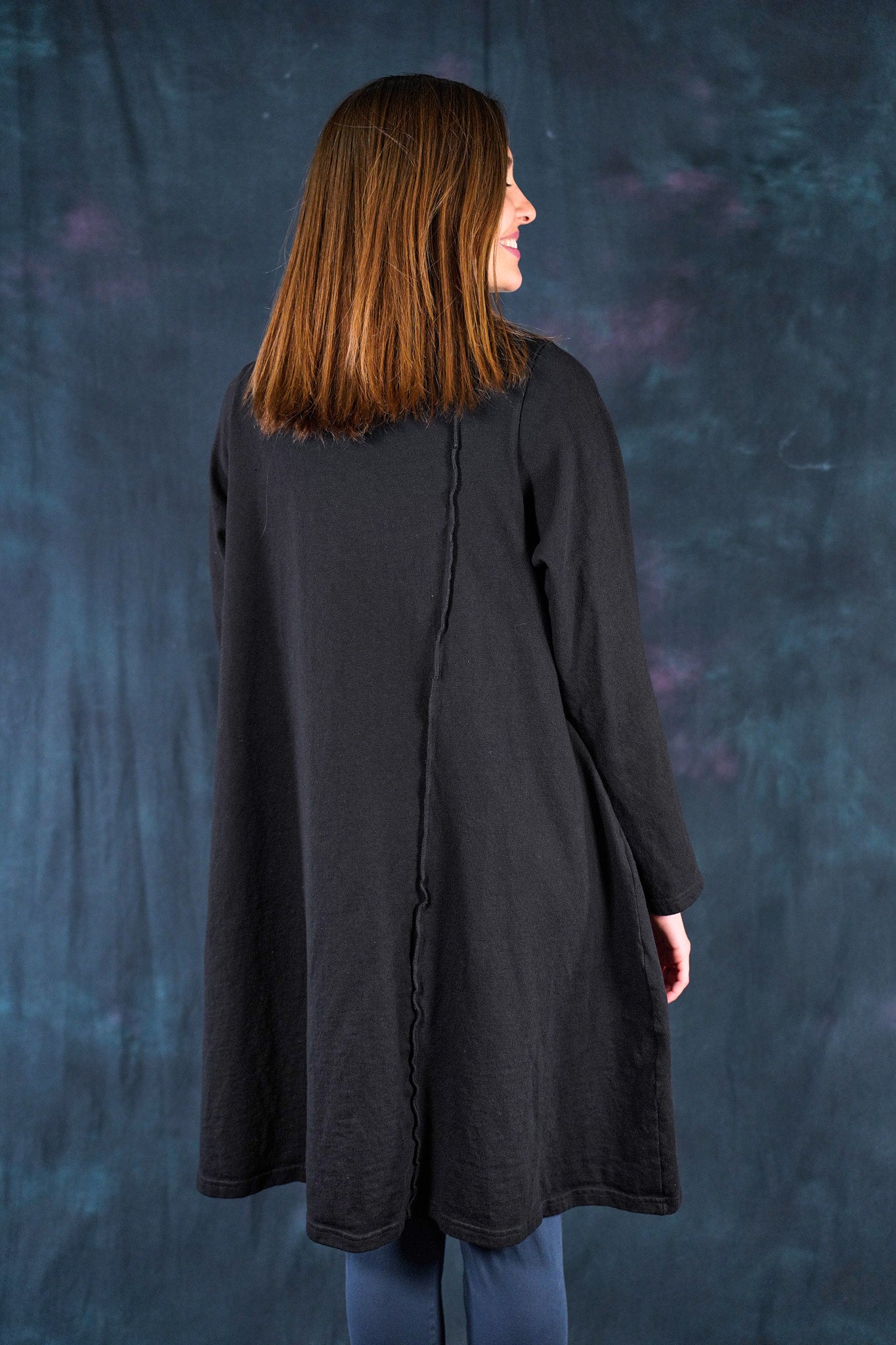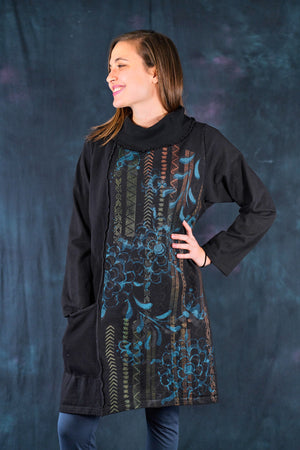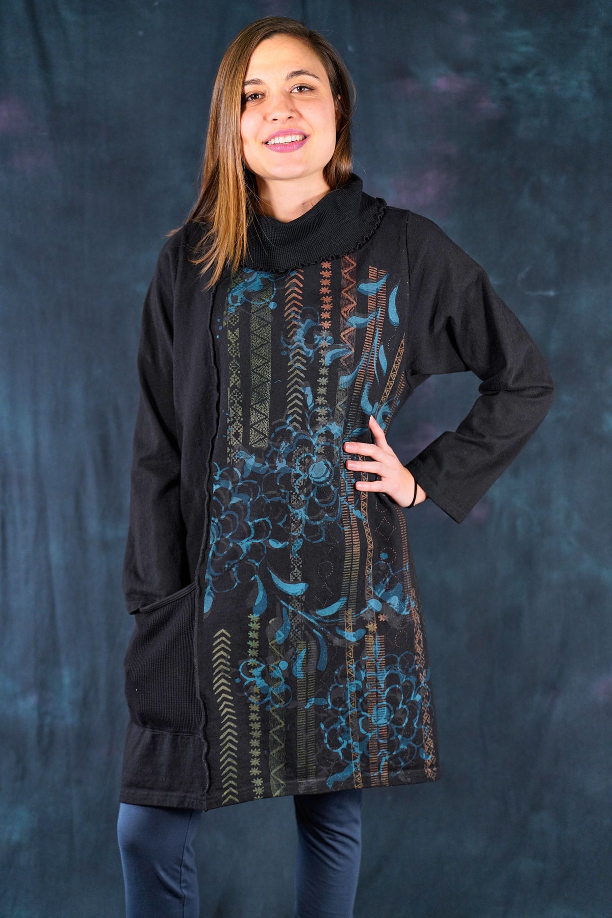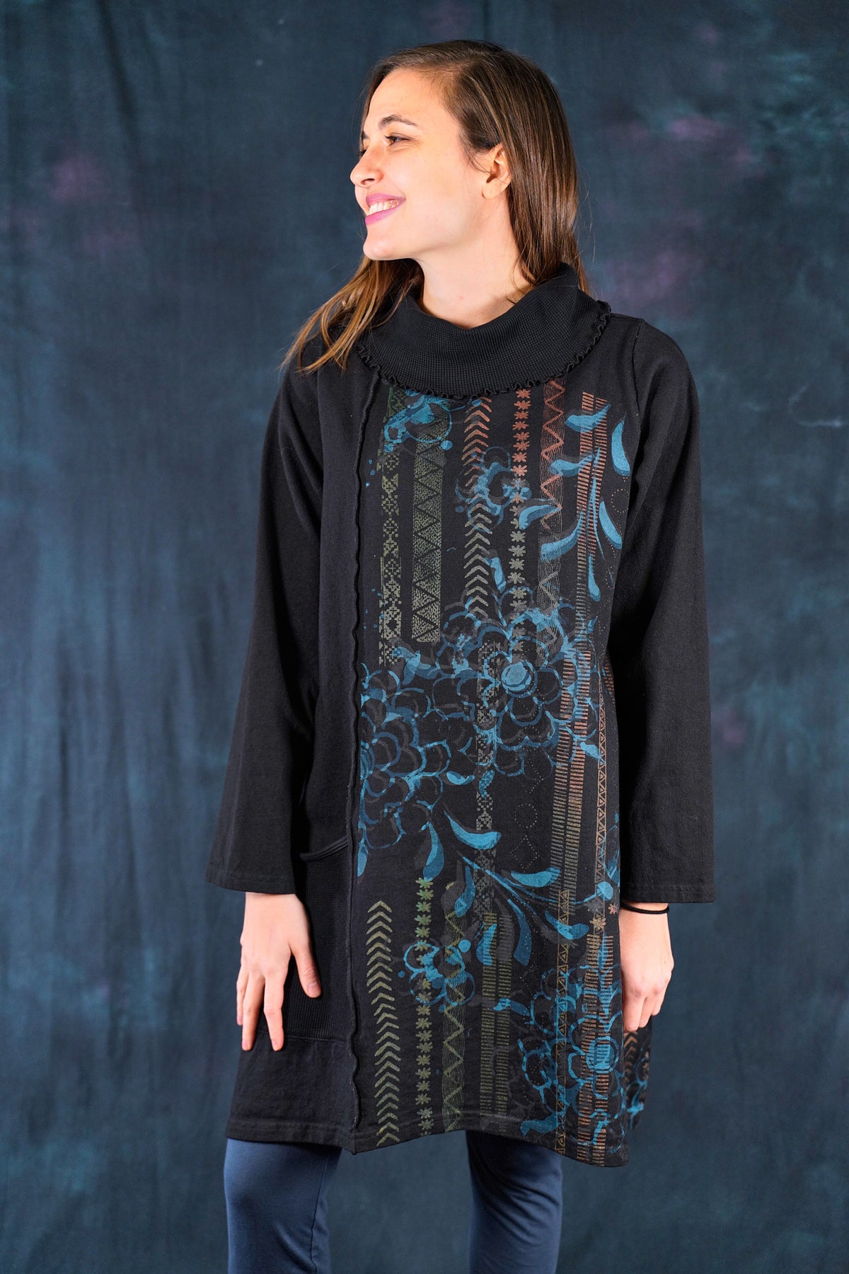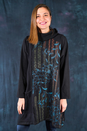 This new tunic is made of heavier, slightly textured reprocessed cotton knit, with details made of organic thermal. offset seaming in front and back, asymmetrical pocket. An easy tunic to wear on colder days. Hand printed with layered textures and vines... wears easily with simple black or any other pieces you have that pick up the colors in the print.