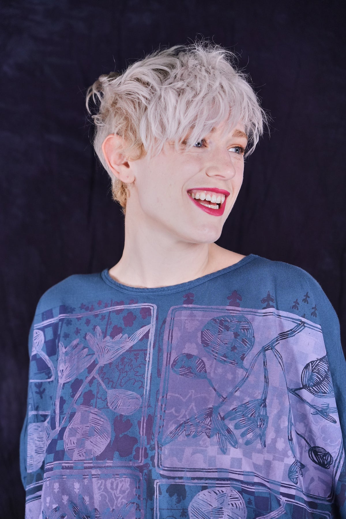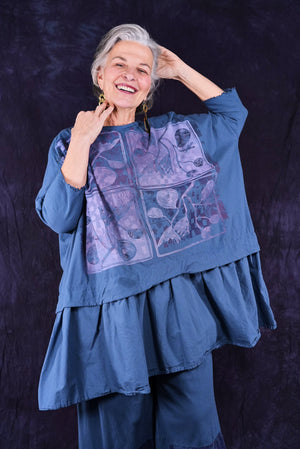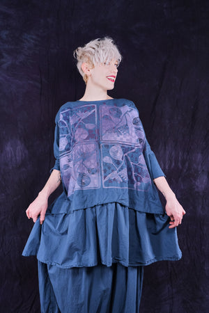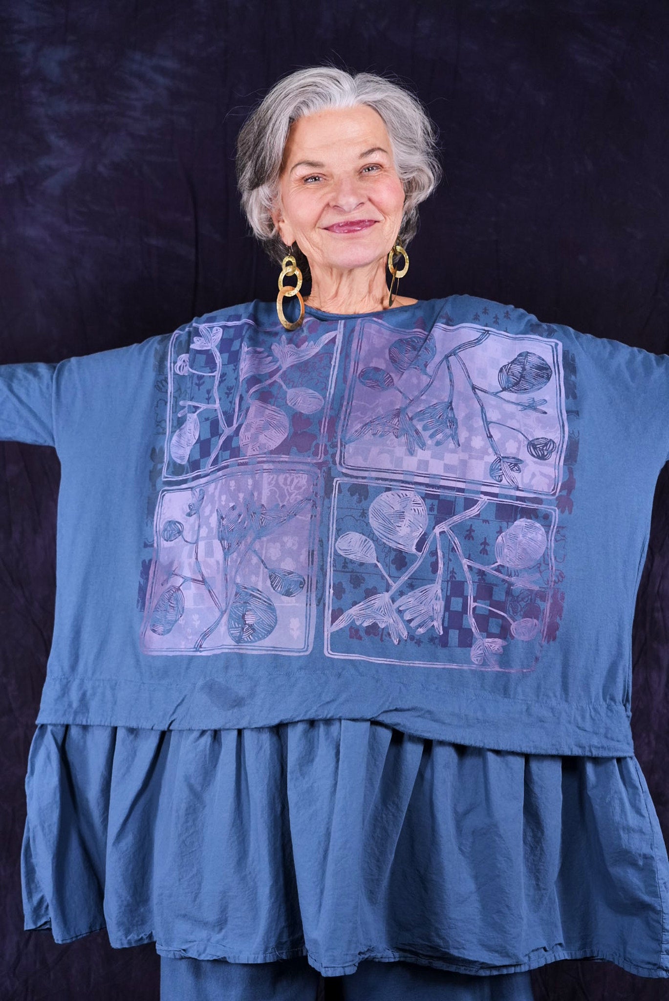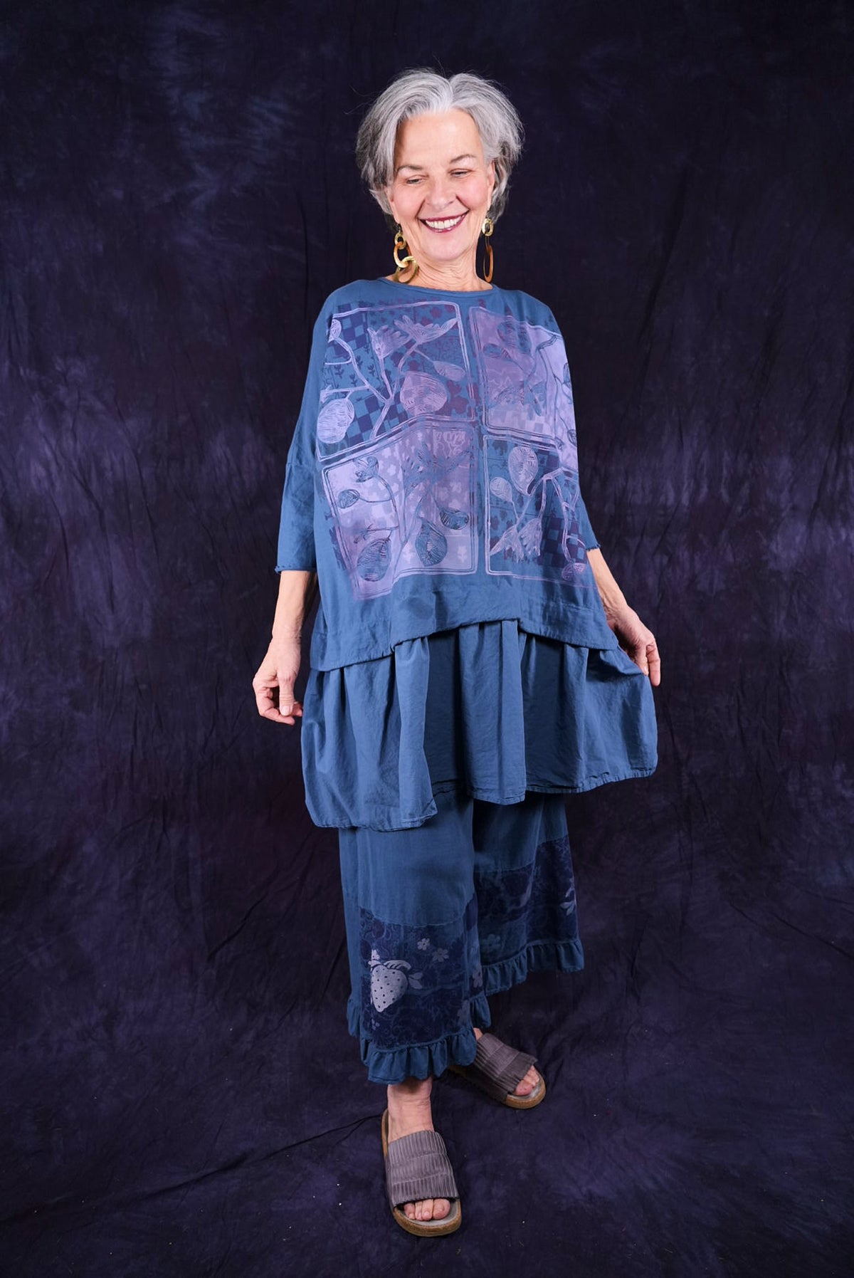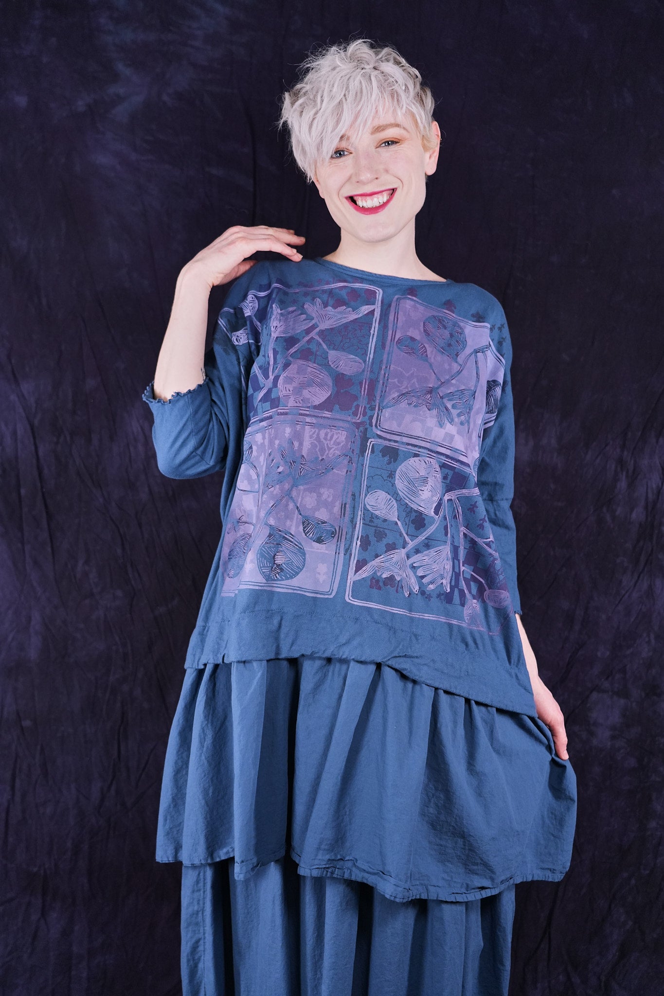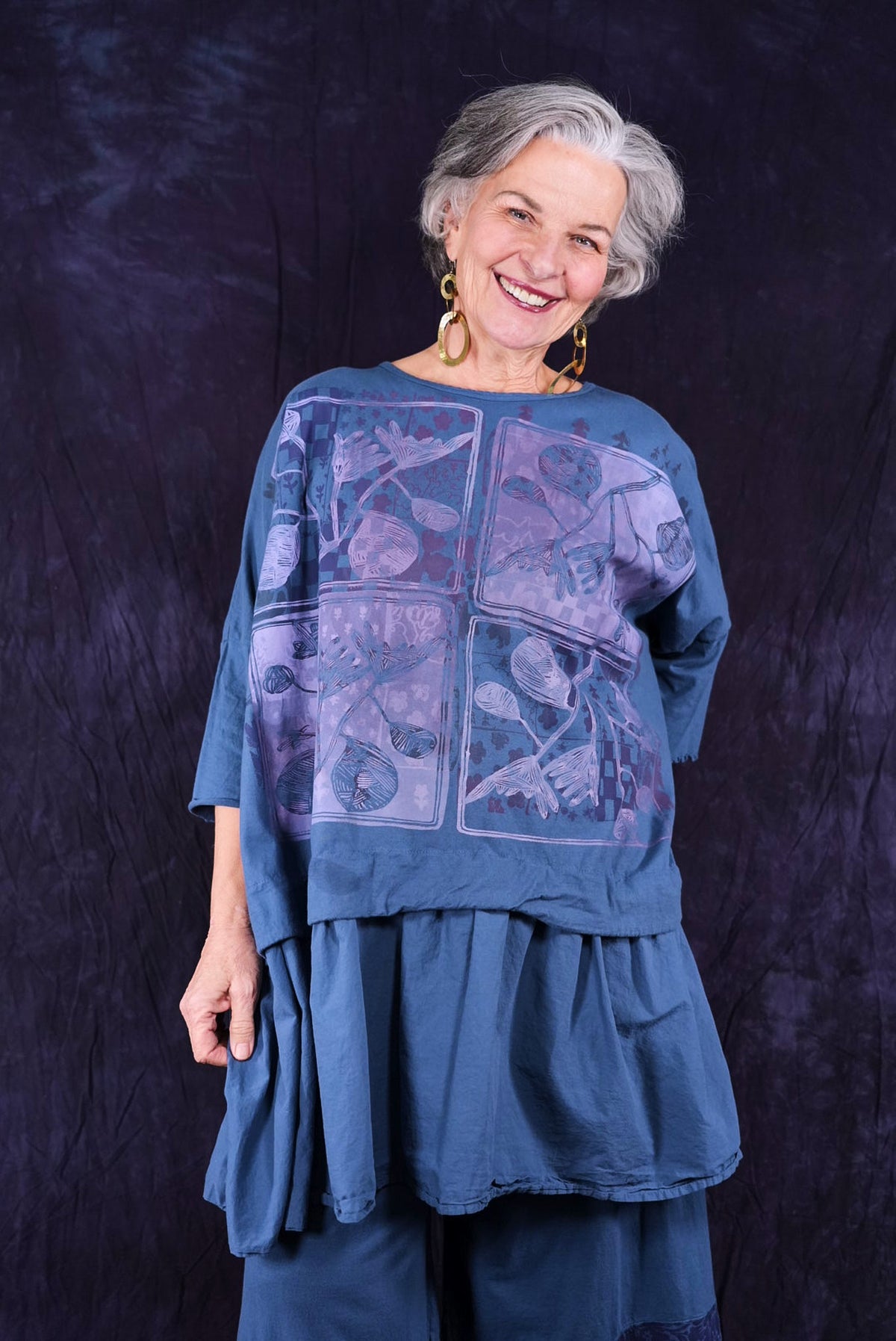 Sweet! A wide square top paired with a gathered lightweight floaty lawn skirt. Wear it as a dress. Pair with pants, pair with a skirt- it is a new favorite and we have only made a small amount in each color. Organic & hand printed, 100% blue fish magic.