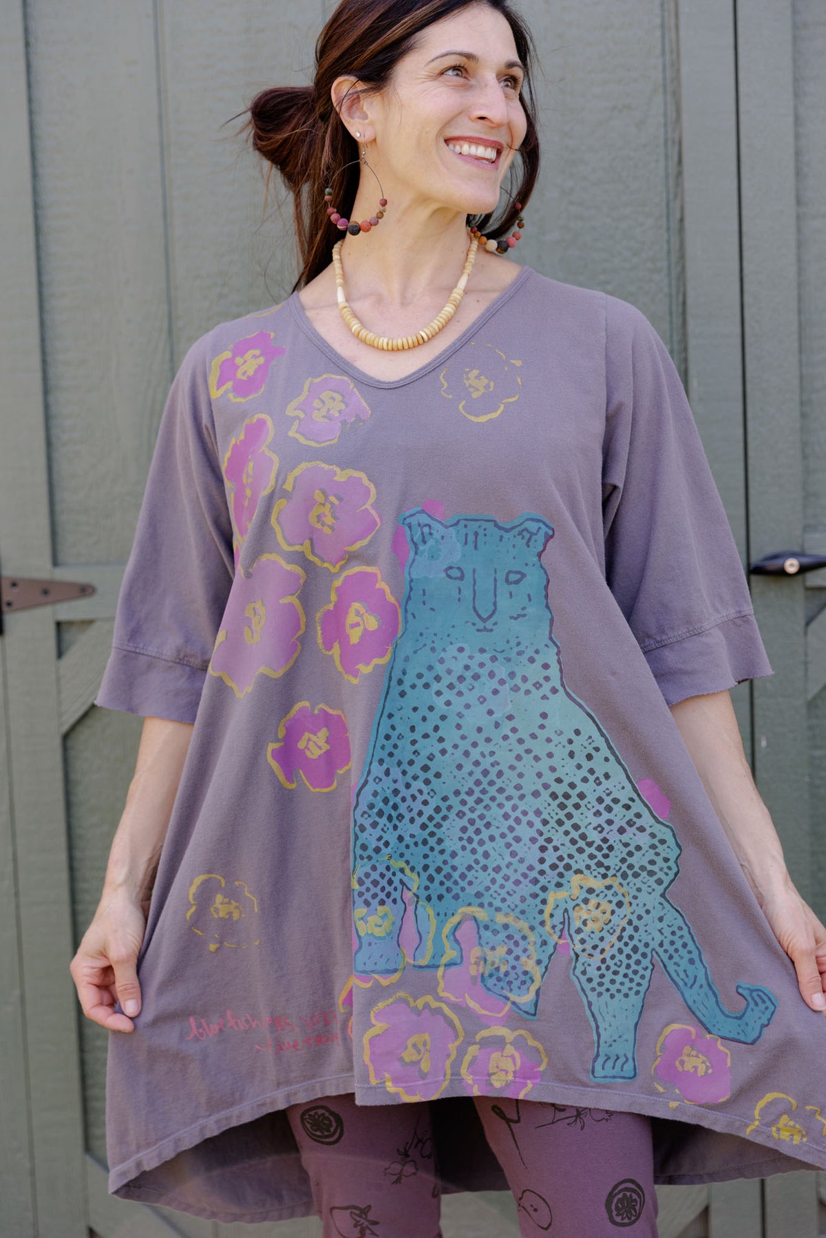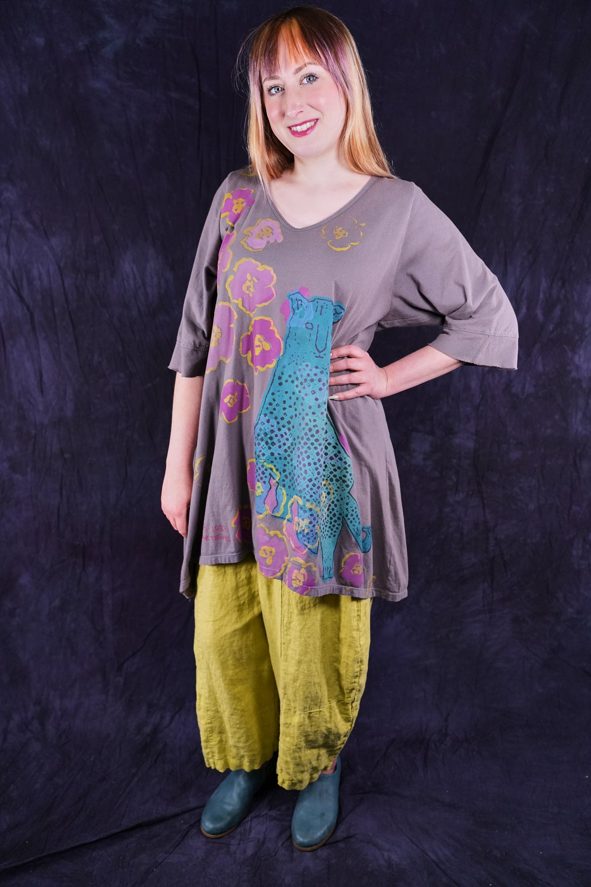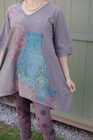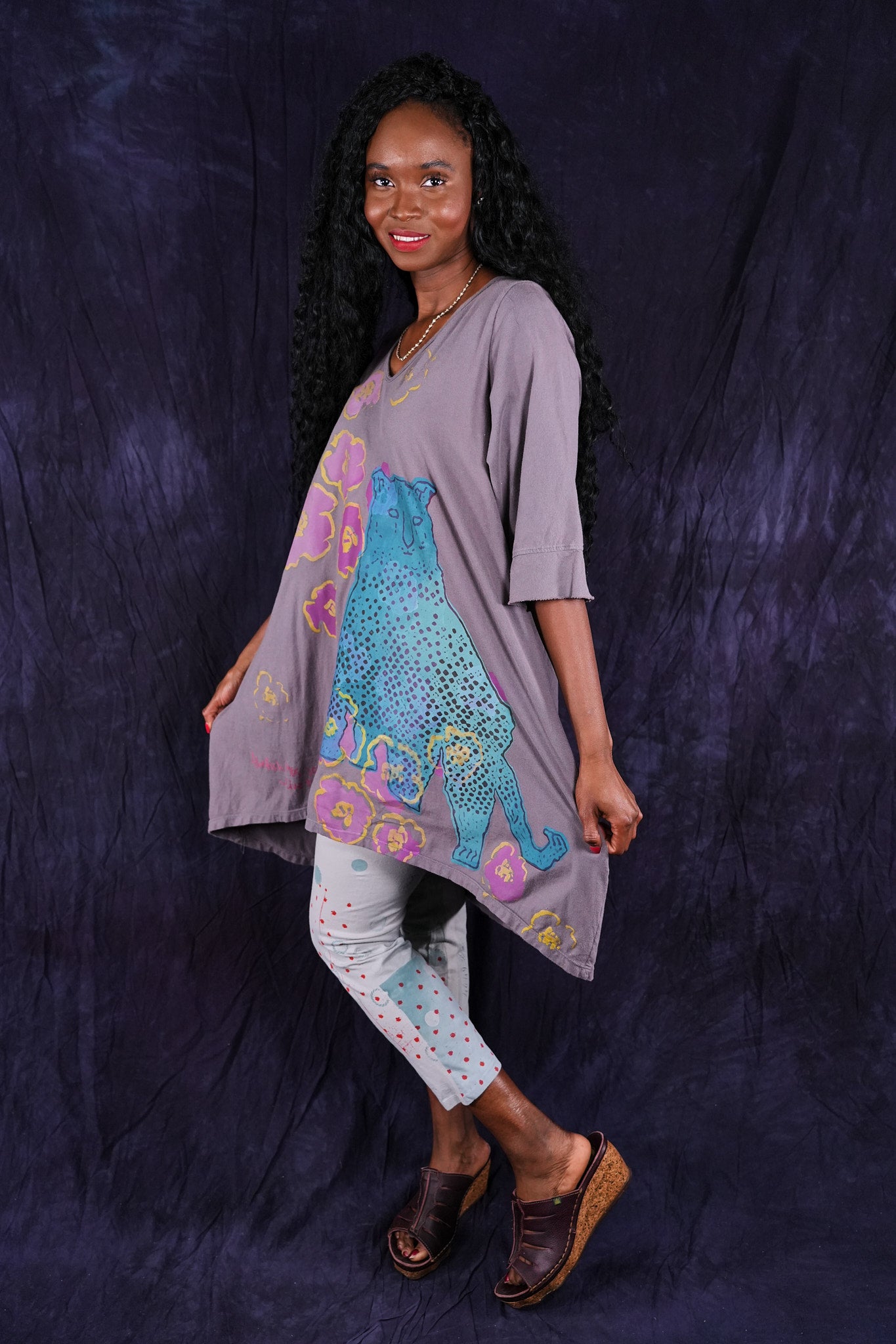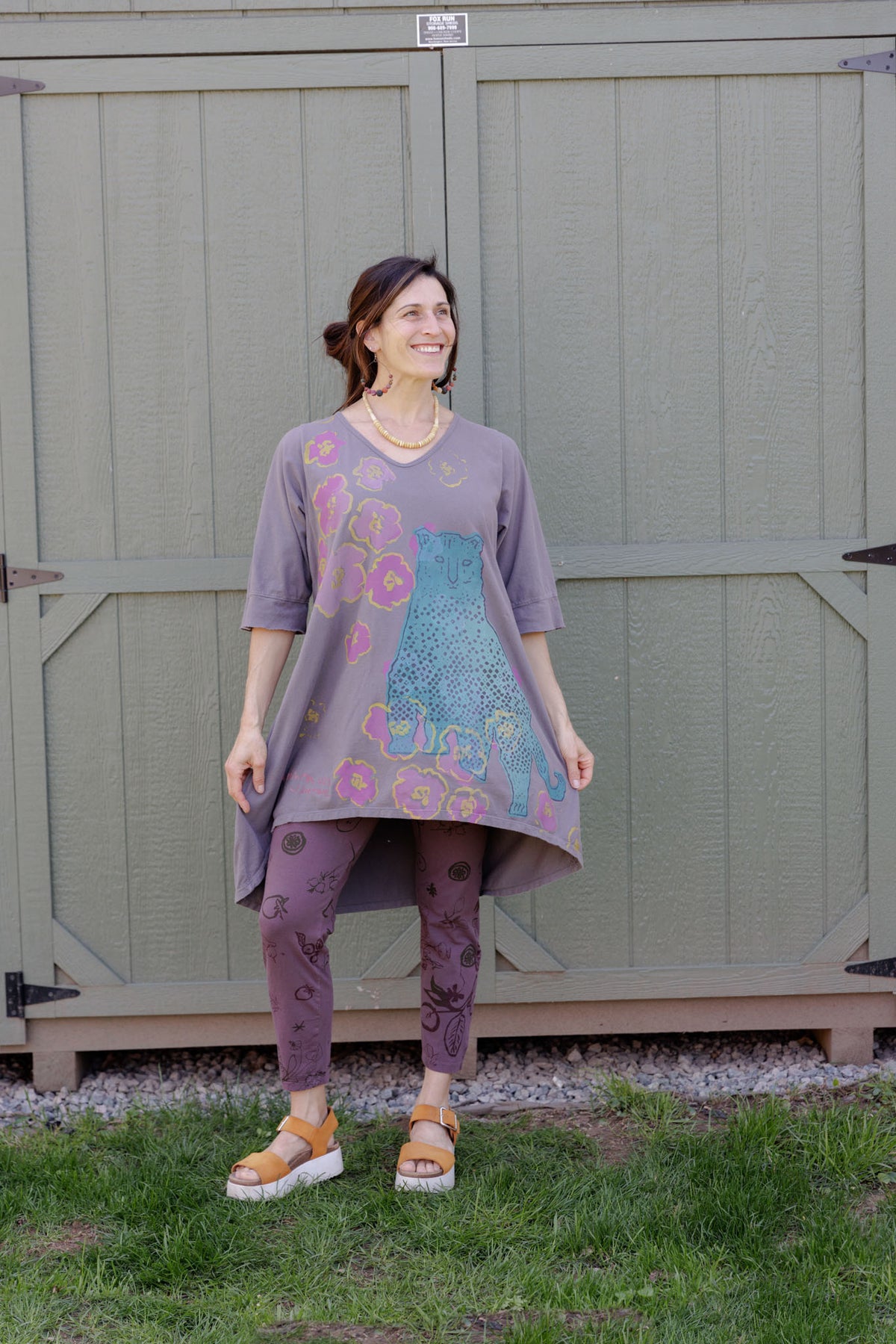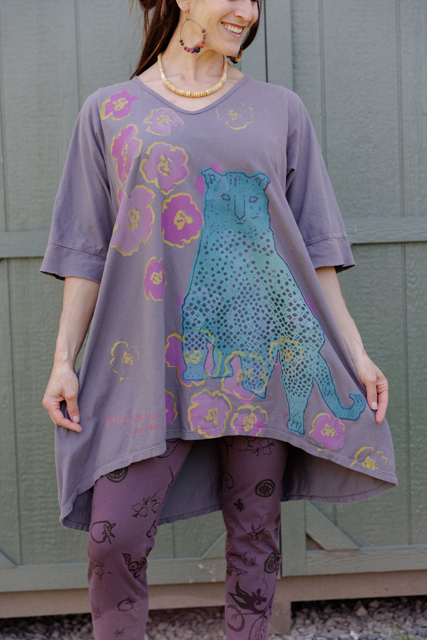 Tunic length, with a high low hemline and draw-cord back, this a a springtime and summer wardrobe staple! Soft organic cotton with a flattering slight V at the neckline the fit is versatile and fits most.  Looks great with leggings and all style pants as well as skirts... Gorgeous prints too!