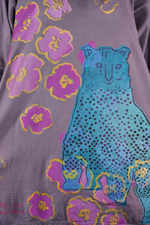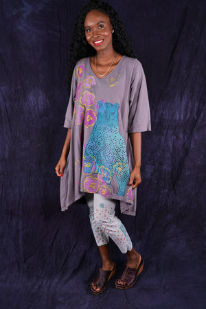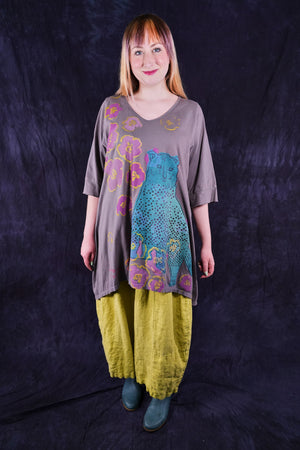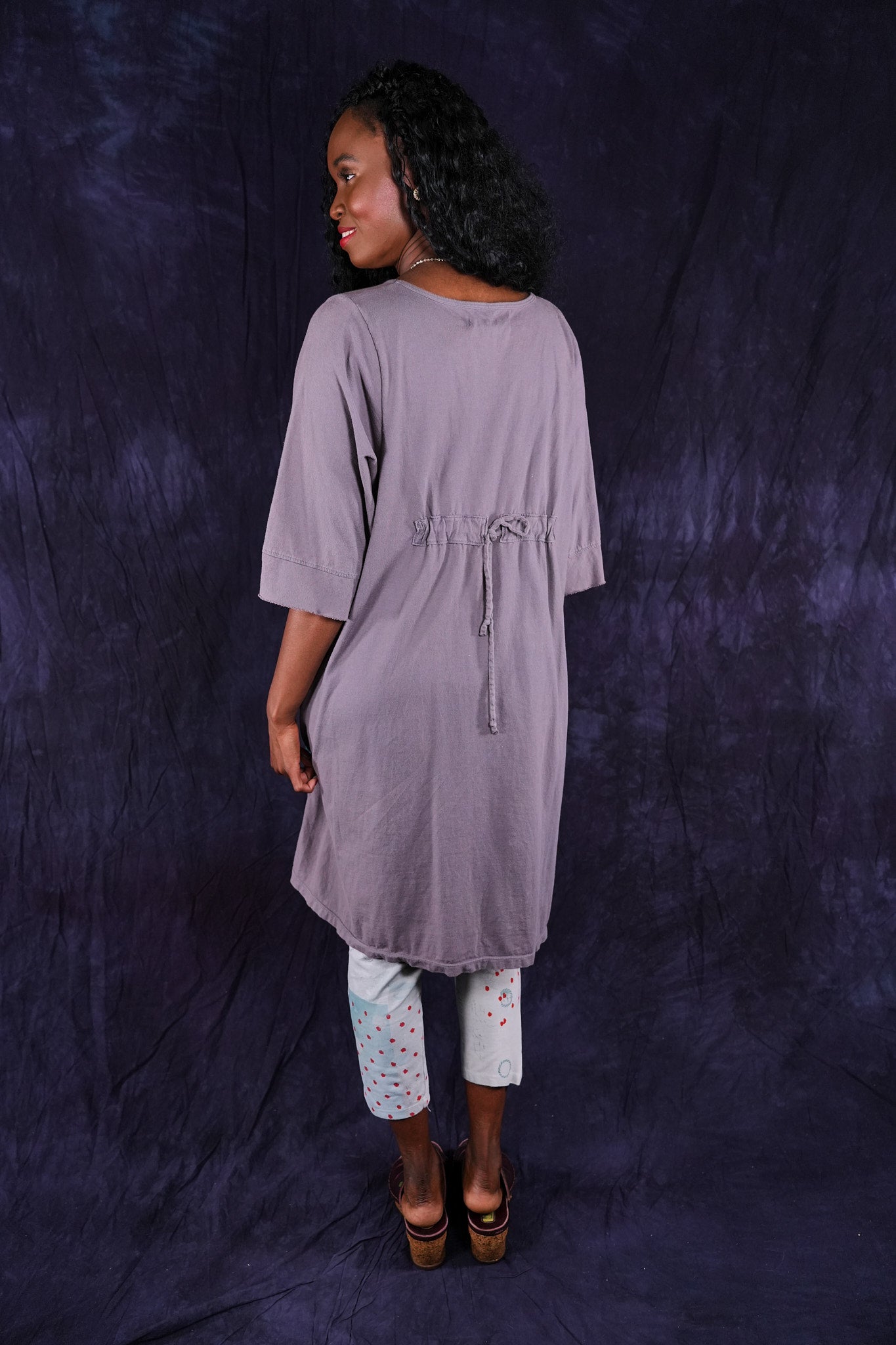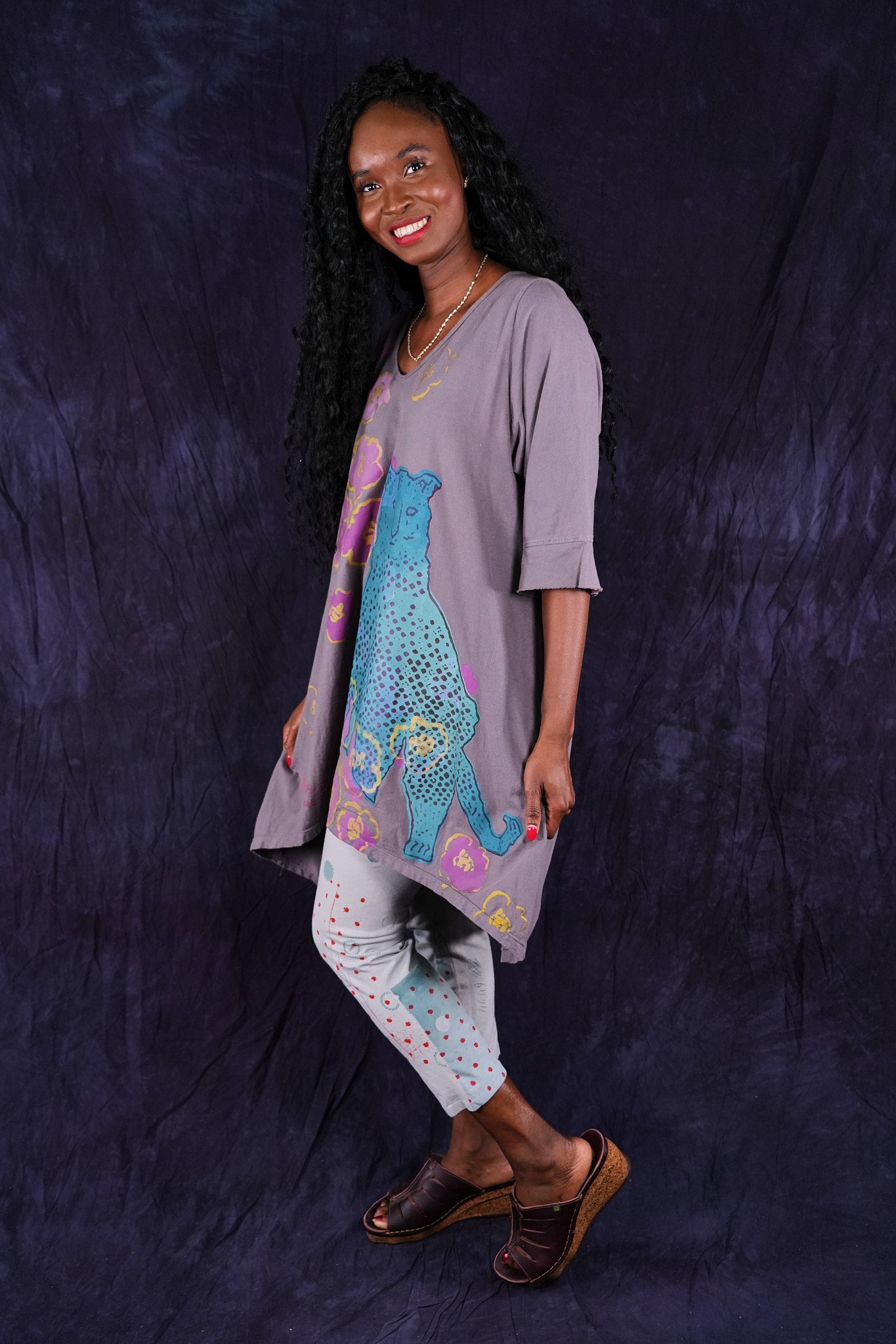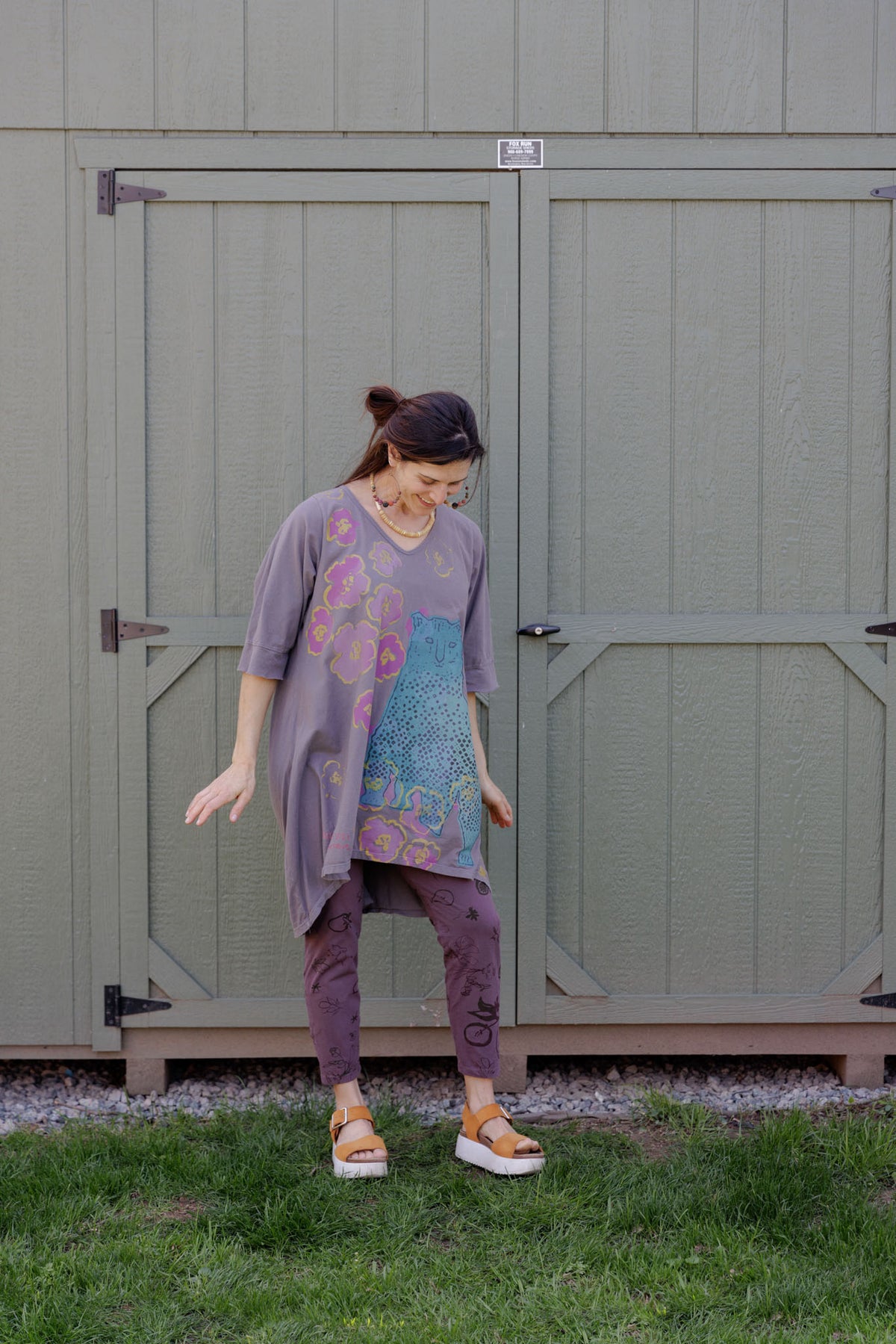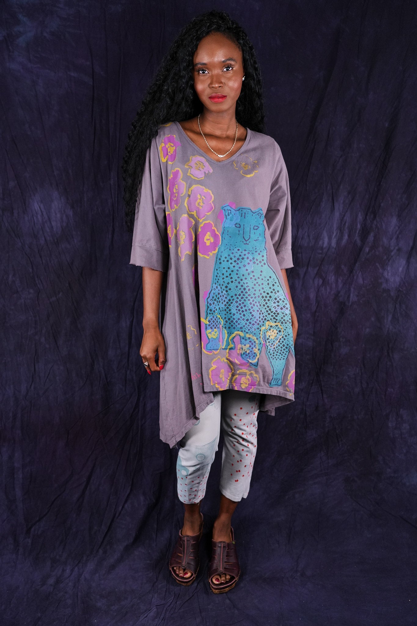 Tunic length, with a high low hemline and draw-cord back, this a a springtime and summer wardrobe staple! Soft organic cotton with a flattering slight V at the neckline the fit is versatile and fits most.  Looks great with leggings and all style pants as well as skirts... Gorgeous prints too!