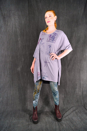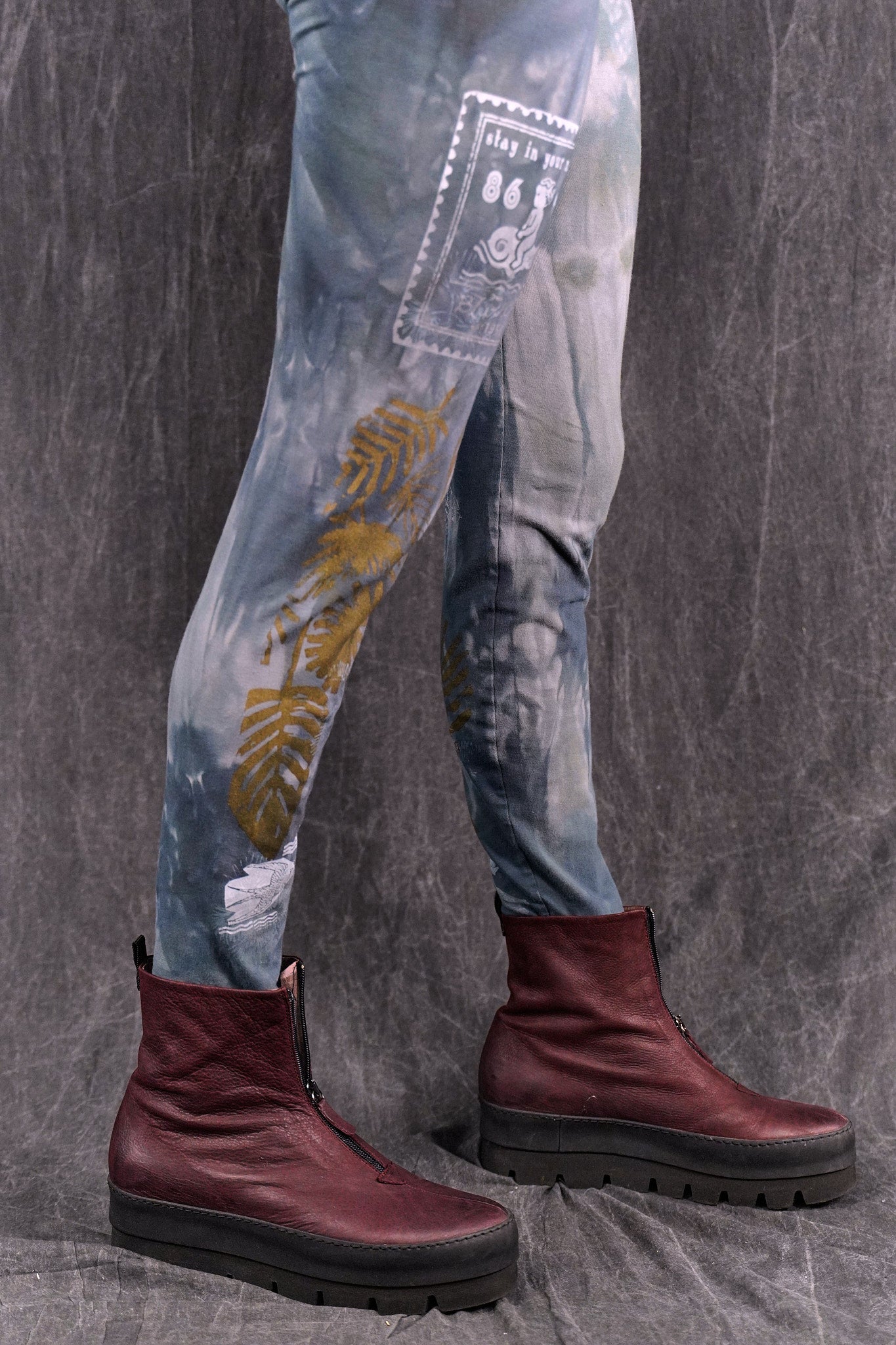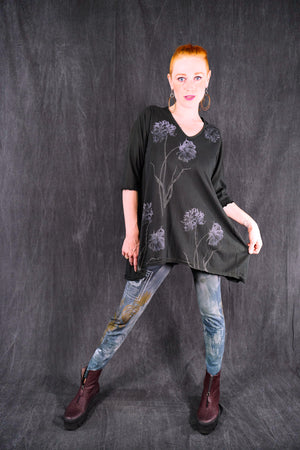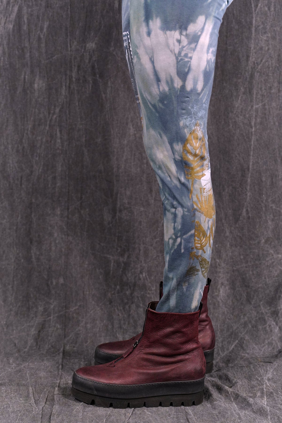 LOOK closely, see the wonderful vintage Blue Fish print and botanicals printed on the front and back of these hand dyed leggings. Email soon if you want these unprinted!